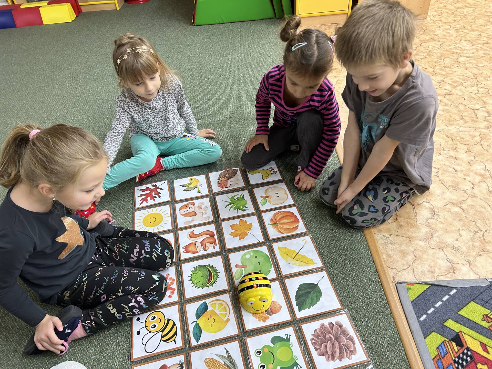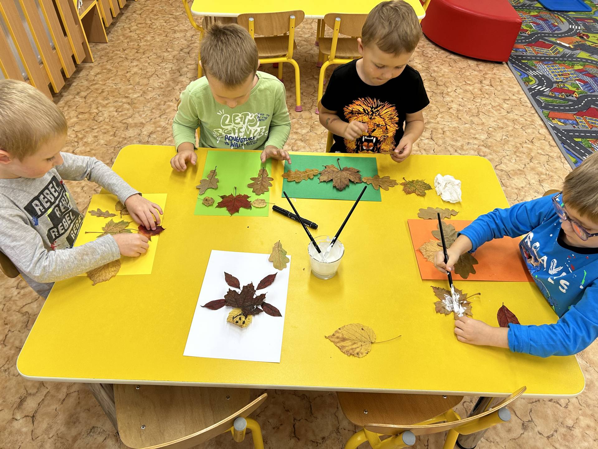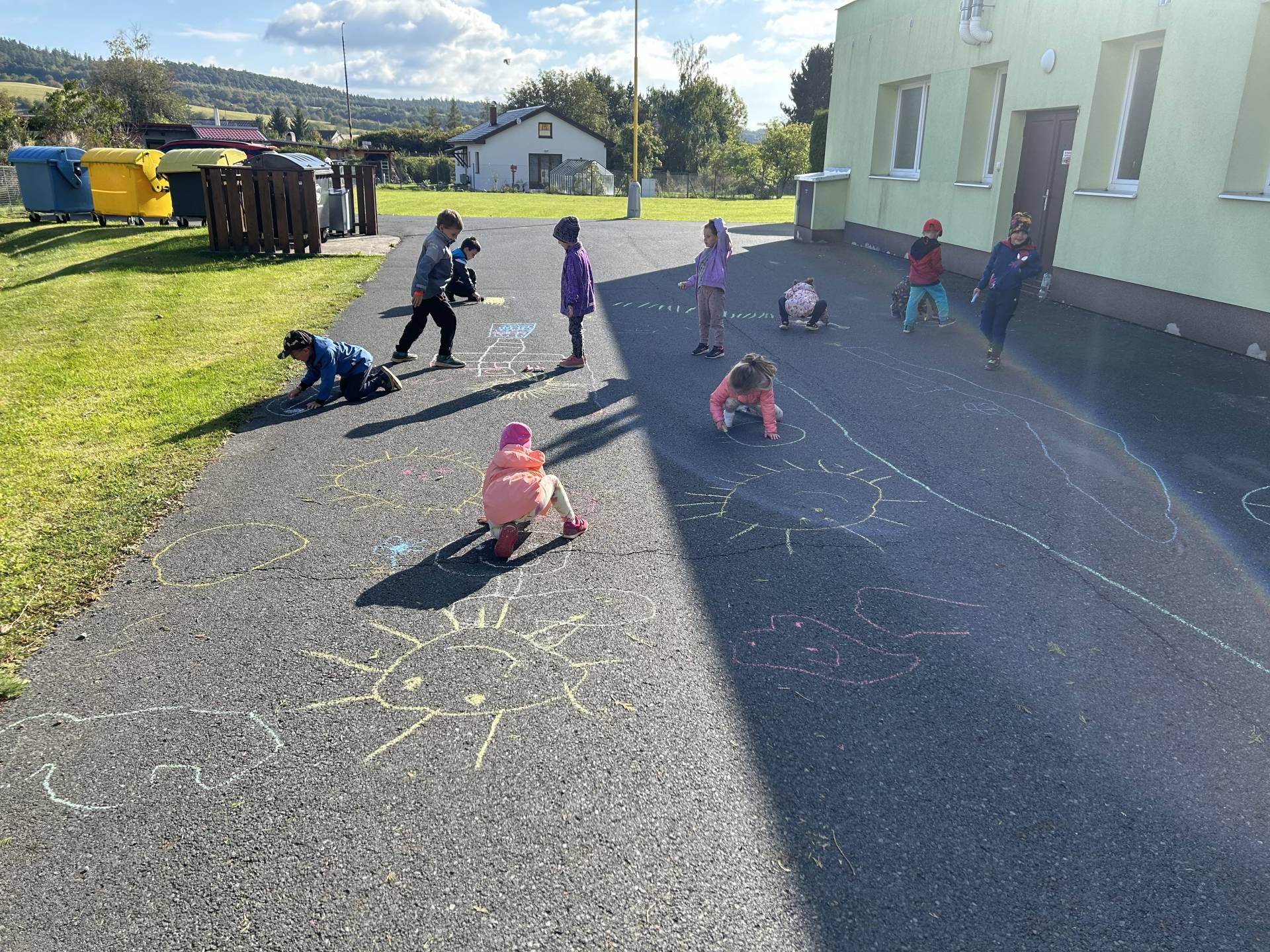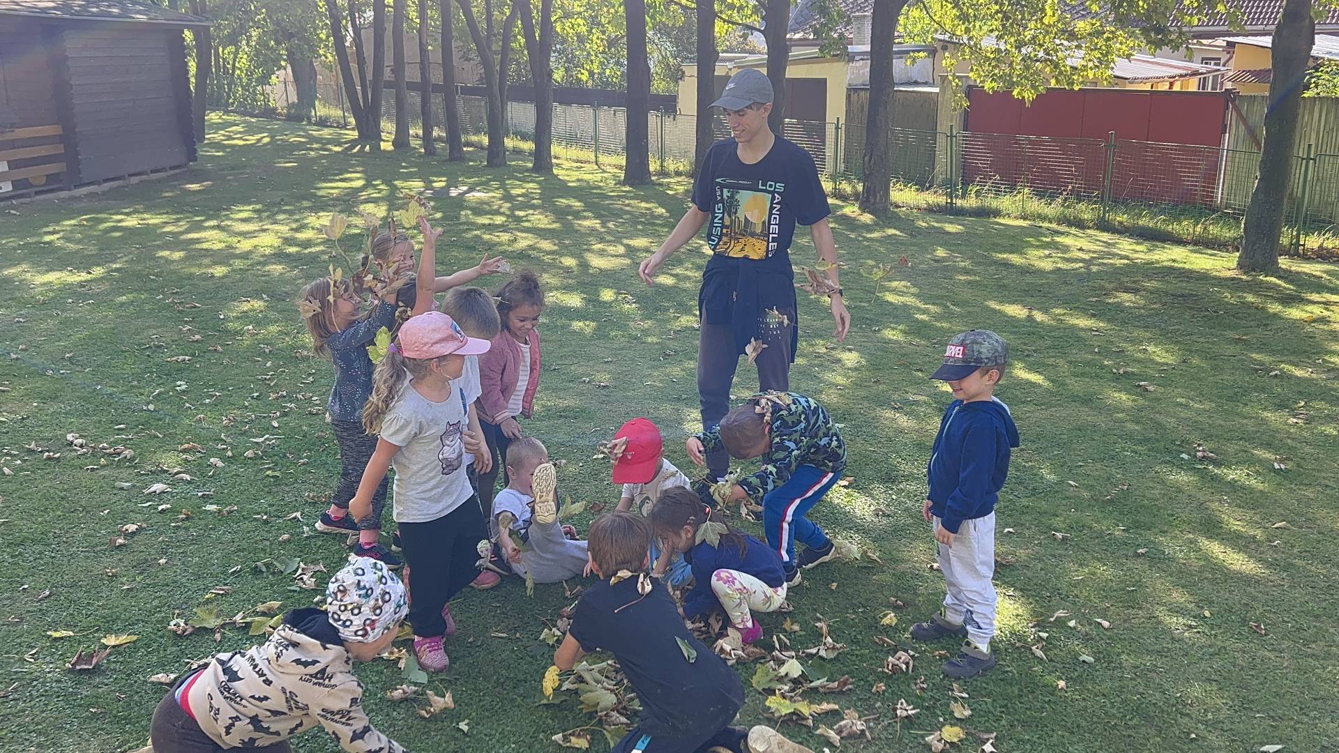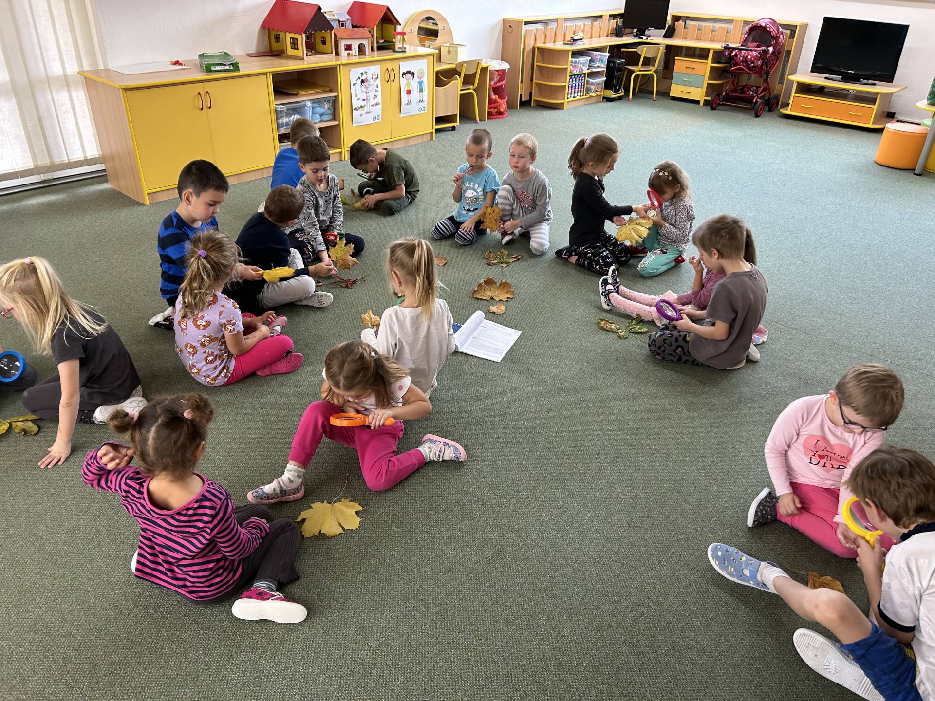 V říjnu jsme se seznámili s tím, co je potřeba udělat na zahradě a na poli před zimou. Sklidit ovoce a zeleninu? Víme jak chutná, voní, jakou má barvu. Vnímali jsme ji všemi smysly. Společně s paní Petrekovou jsme si uvařili výbornou dýňovou polévku. Pohrabat listí? Žádný problém, ovšem my jsme v něm dováděli, stavěli domečky pro zvířátka a vytvořili si podzimníčky. Poorat pole a nakypřit půdu před zimním spánkem? Práci na poli, jsme pozorovali při vycházkách a následně ji výtvarně ztvárnili. Při pobytu venku pozorujeme změny v přírodě, a protože je letošní podzim krásný užíváme si každou procházku barevnou přírodou.