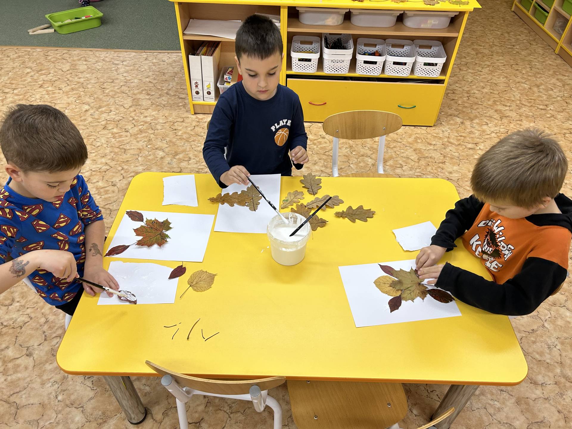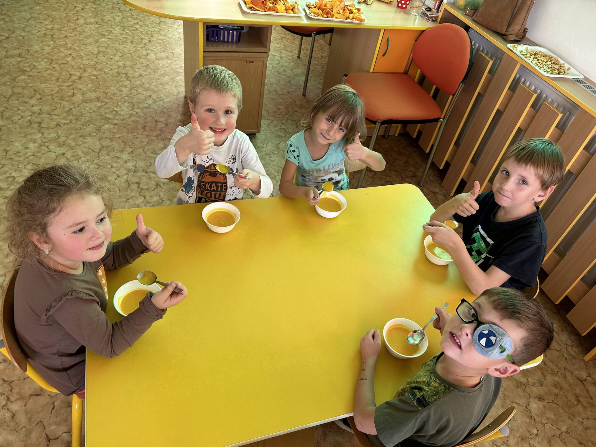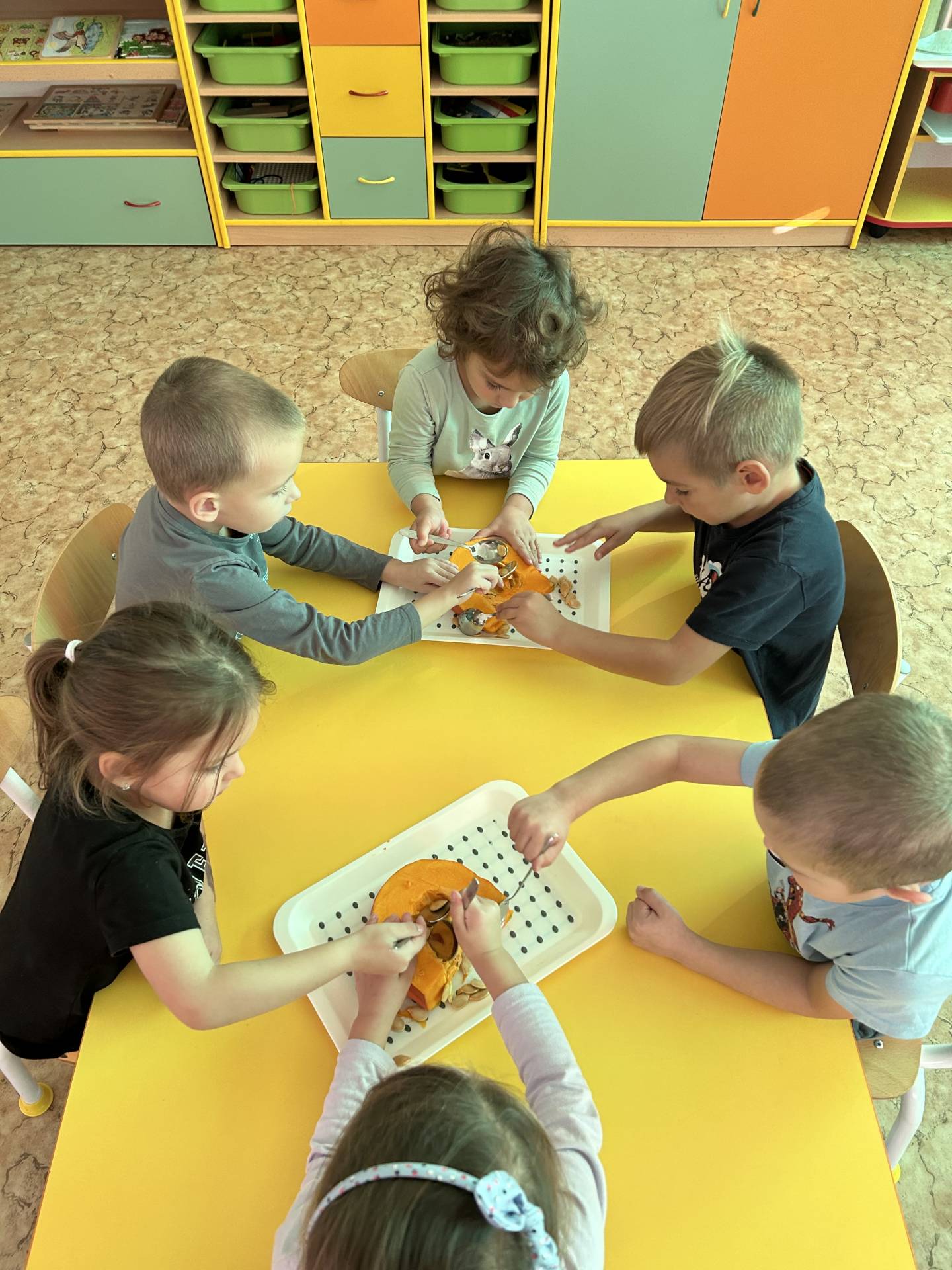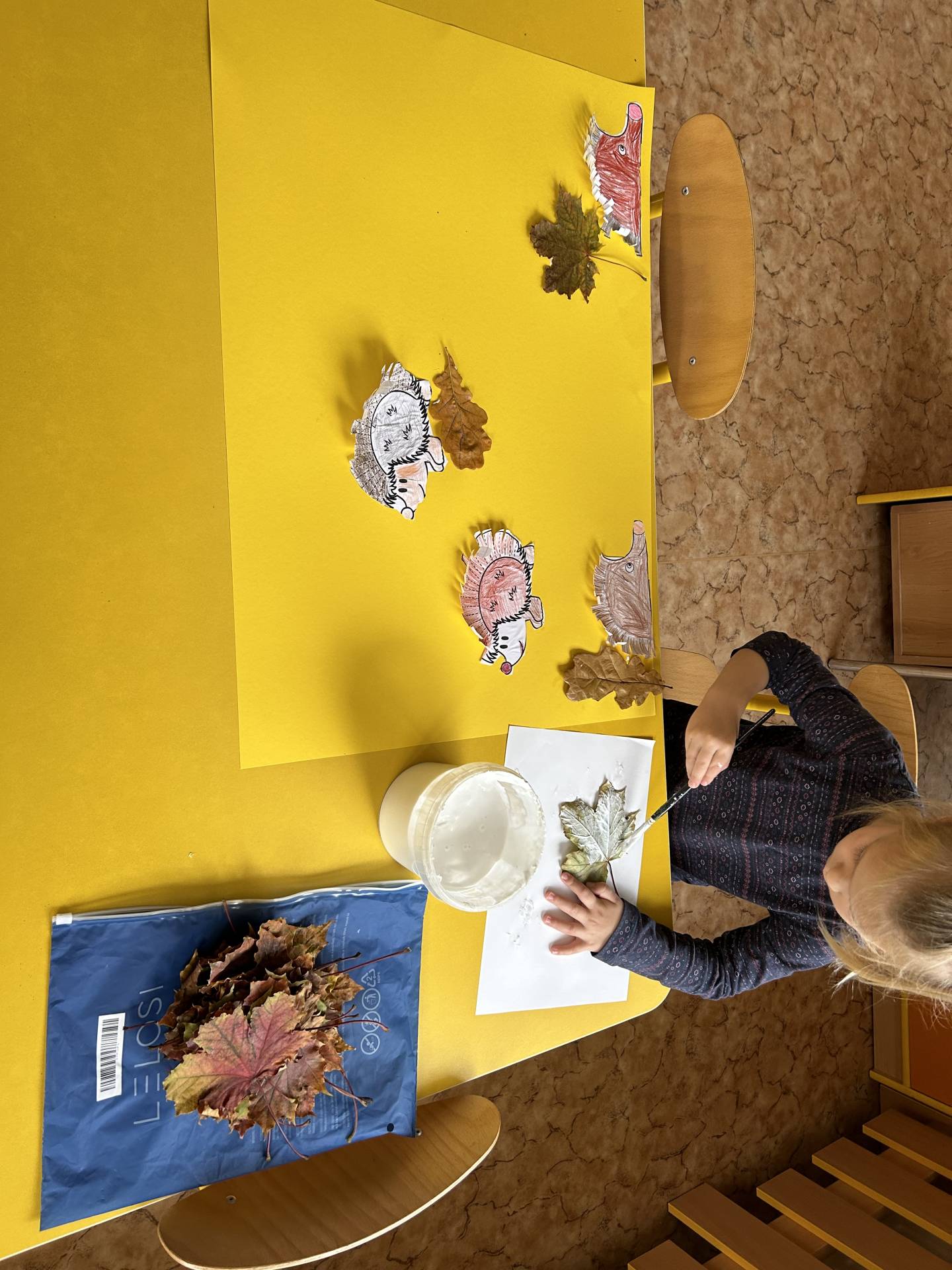 V říjnu jsme se seznámili s tím, co je potřeba udělat na zahradě a na poli před zimou. Sklidit ovoce a zeleninu? Víme jak chutná, voní, jakou má barvu. Vnímali jsme ji všemi smysly. Společně s paní Petrekovou jsme si uvařili výbornou dýňovou polévku. Pohrabat listí? Žádný problém, ovšem my jsme v něm dováděli, stavěli domečky pro zvířátka a vytvořili si podzimníčky. Poorat pole a nakypřit půdu před zimním spánkem? Práci na poli, jsme pozorovali při vycházkách a následně ji výtvarně ztvárnili. Při pobytu venku pozorujeme změny v přírodě, a protože je letošní podzim krásný užíváme si každou procházku barevnou přírodou.