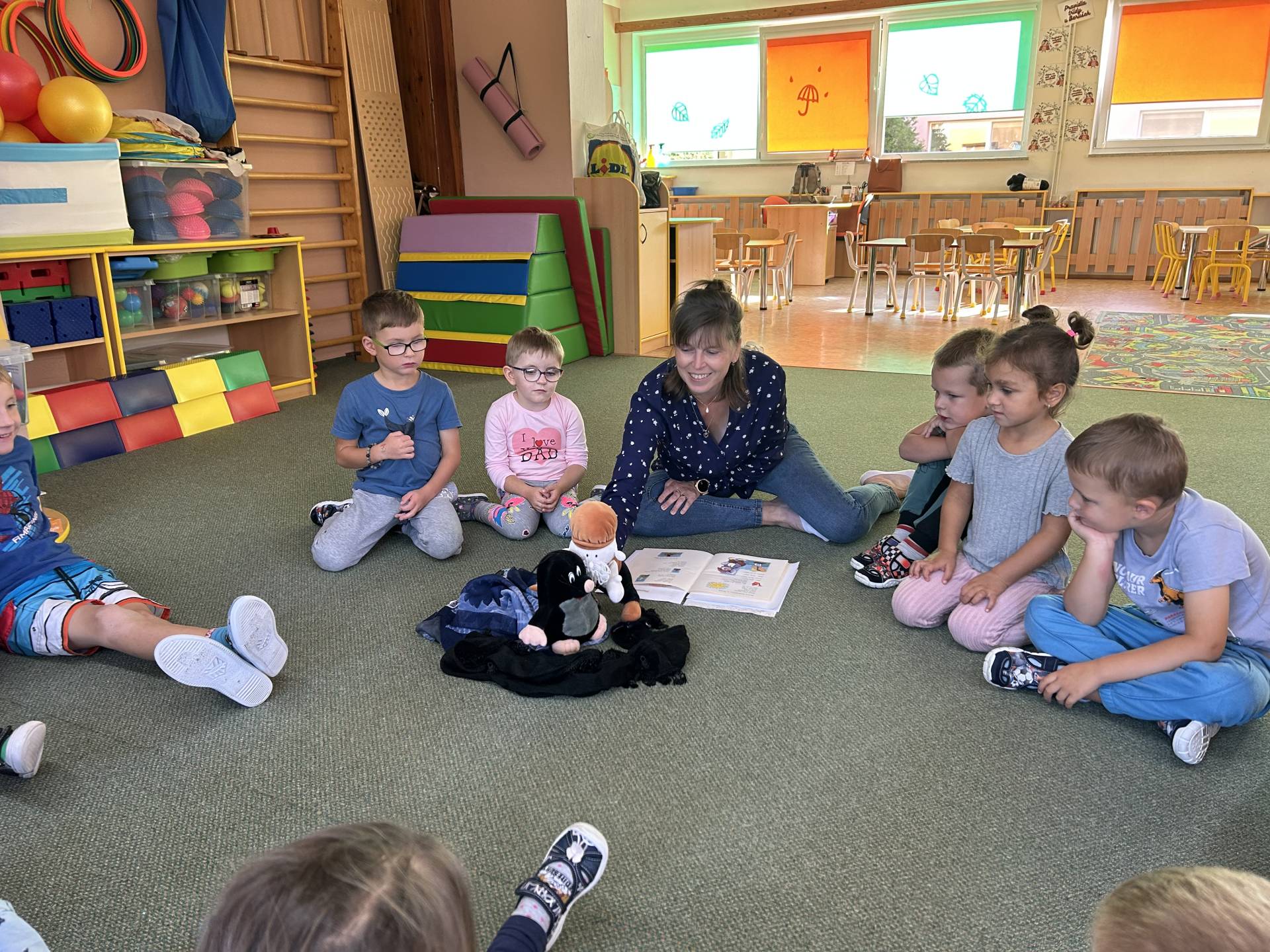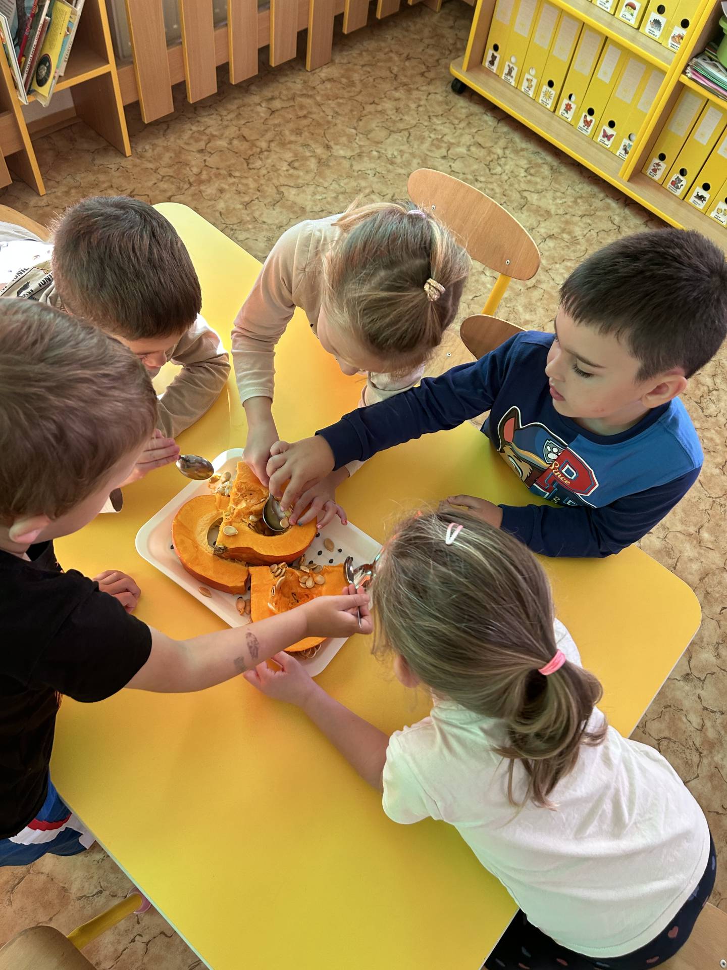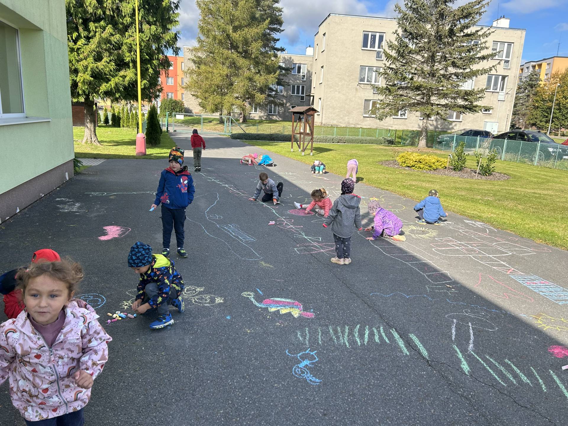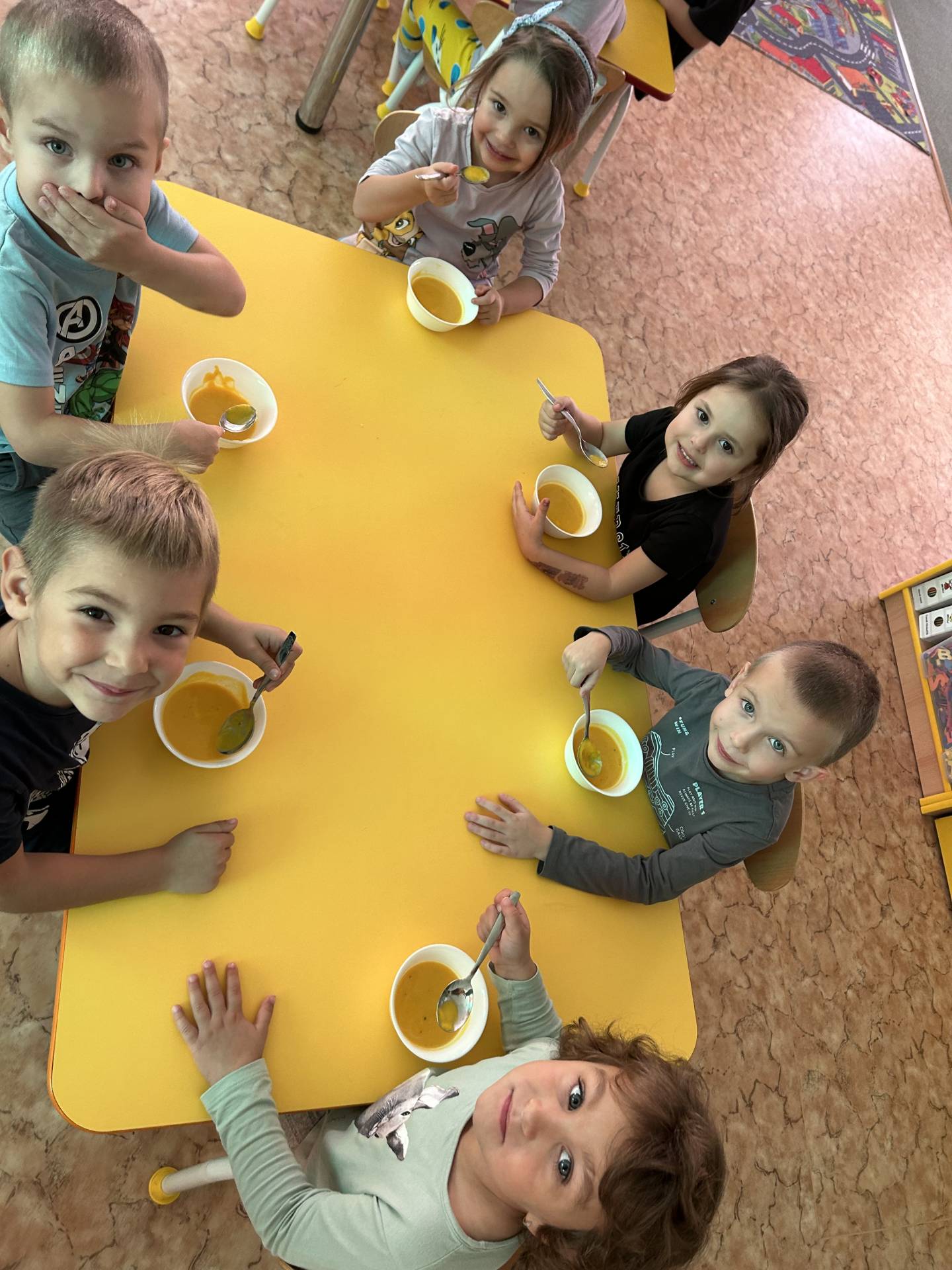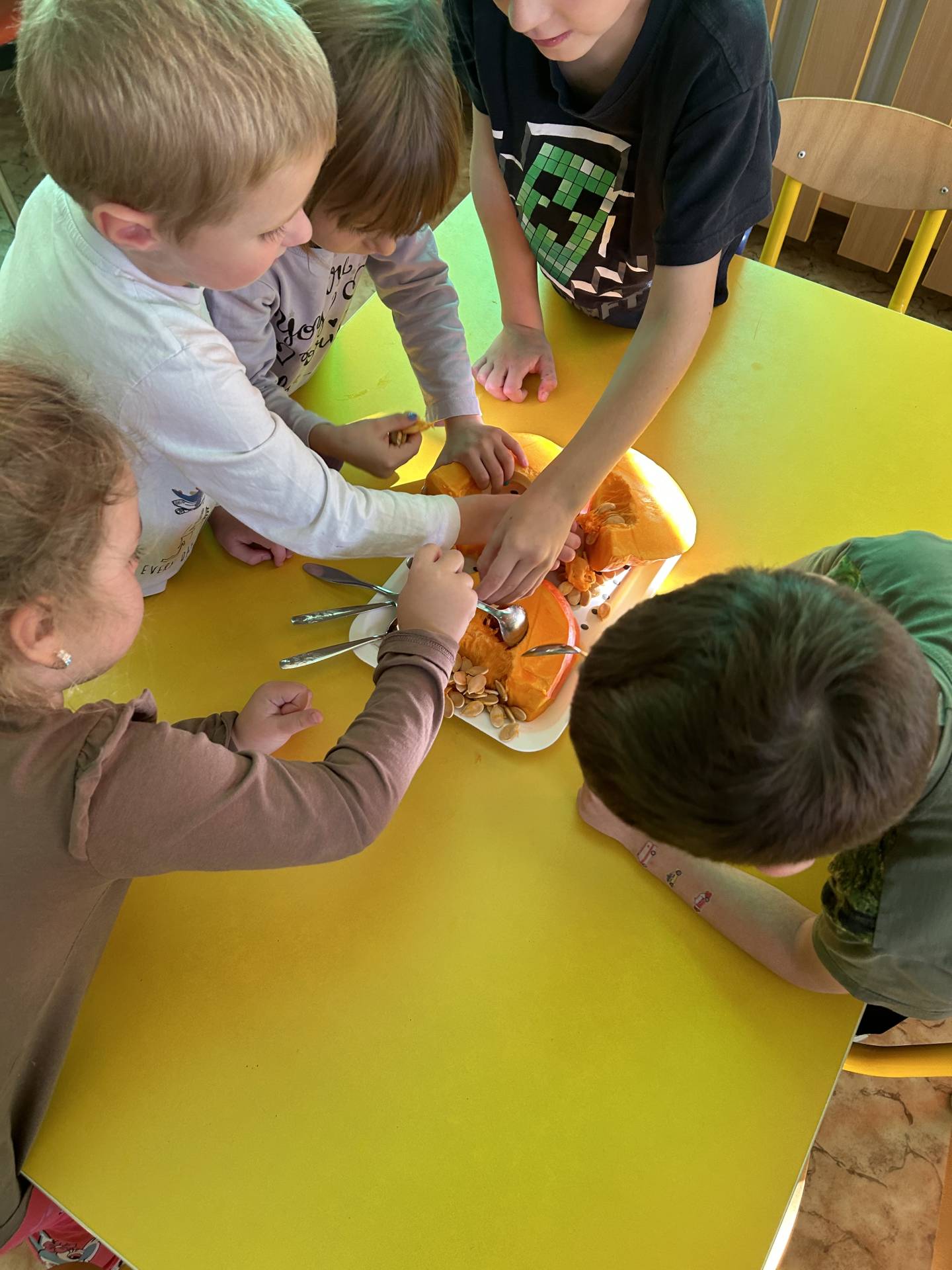 V říjnu jsme se seznámili s tím, co je potřeba udělat na zahradě a na poli před zimou. Sklidit ovoce a zeleninu? Víme jak chutná, voní, jakou má barvu. Vnímali jsme ji všemi smysly. Společně s paní Petrekovou jsme si uvařili výbornou dýňovou polévku. Pohrabat listí? Žádný problém, ovšem my jsme v něm dováděli, stavěli domečky pro zvířátka a vytvořili si podzimníčky. Poorat pole a nakypřit půdu před zimním spánkem? Práci na poli, jsme pozorovali při vycházkách a následně ji výtvarně ztvárnili. Při pobytu venku pozorujeme změny v přírodě, a protože je letošní podzim krásný užíváme si každou procházku barevnou přírodou.