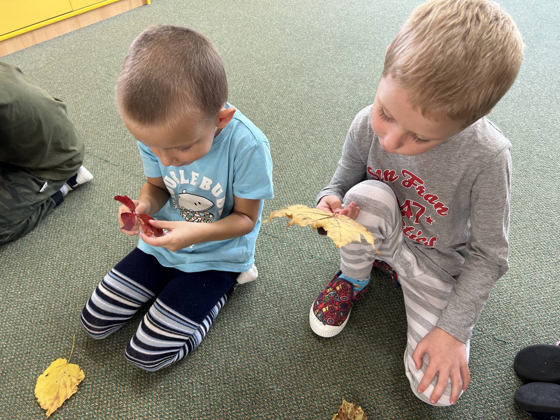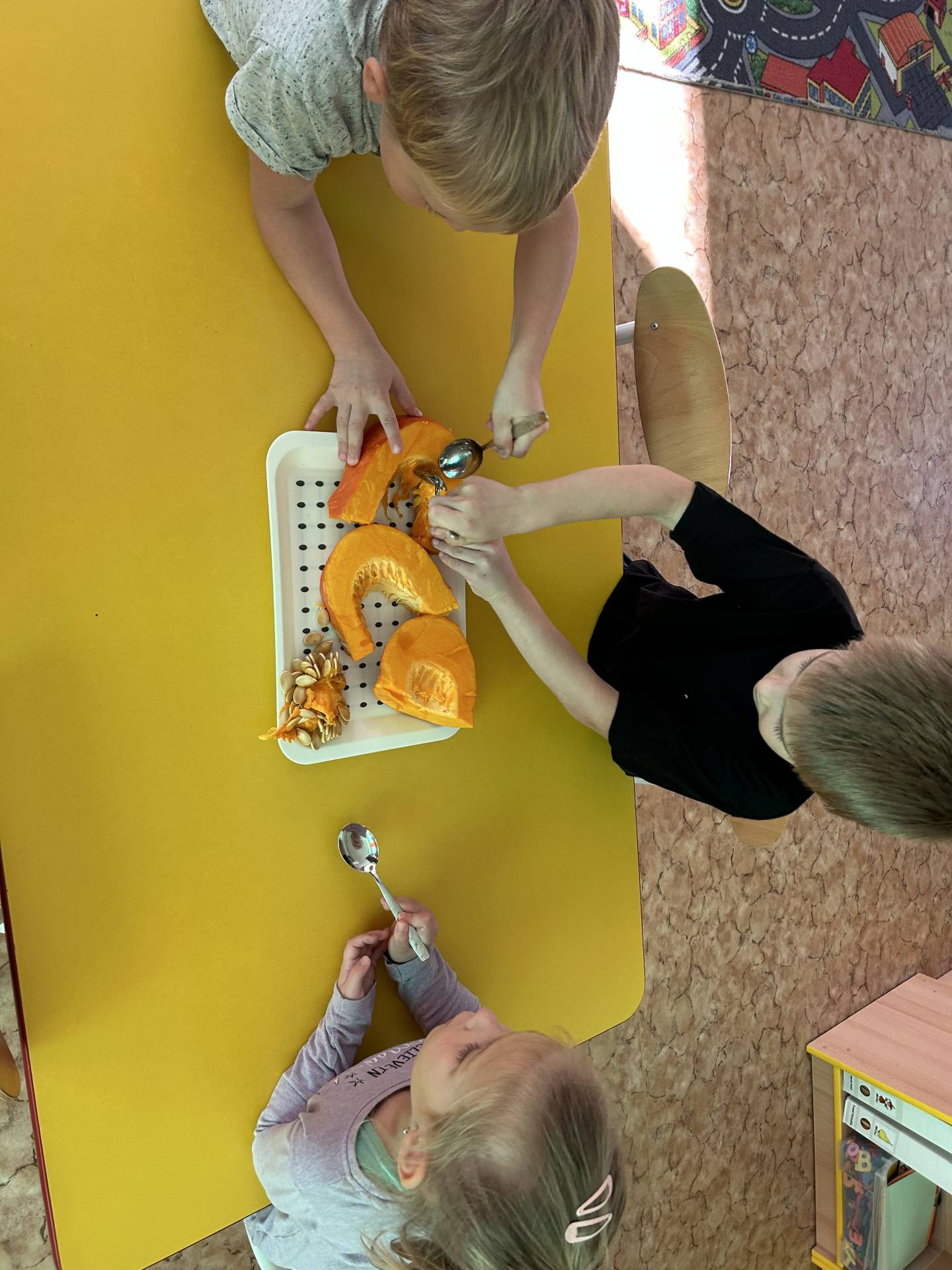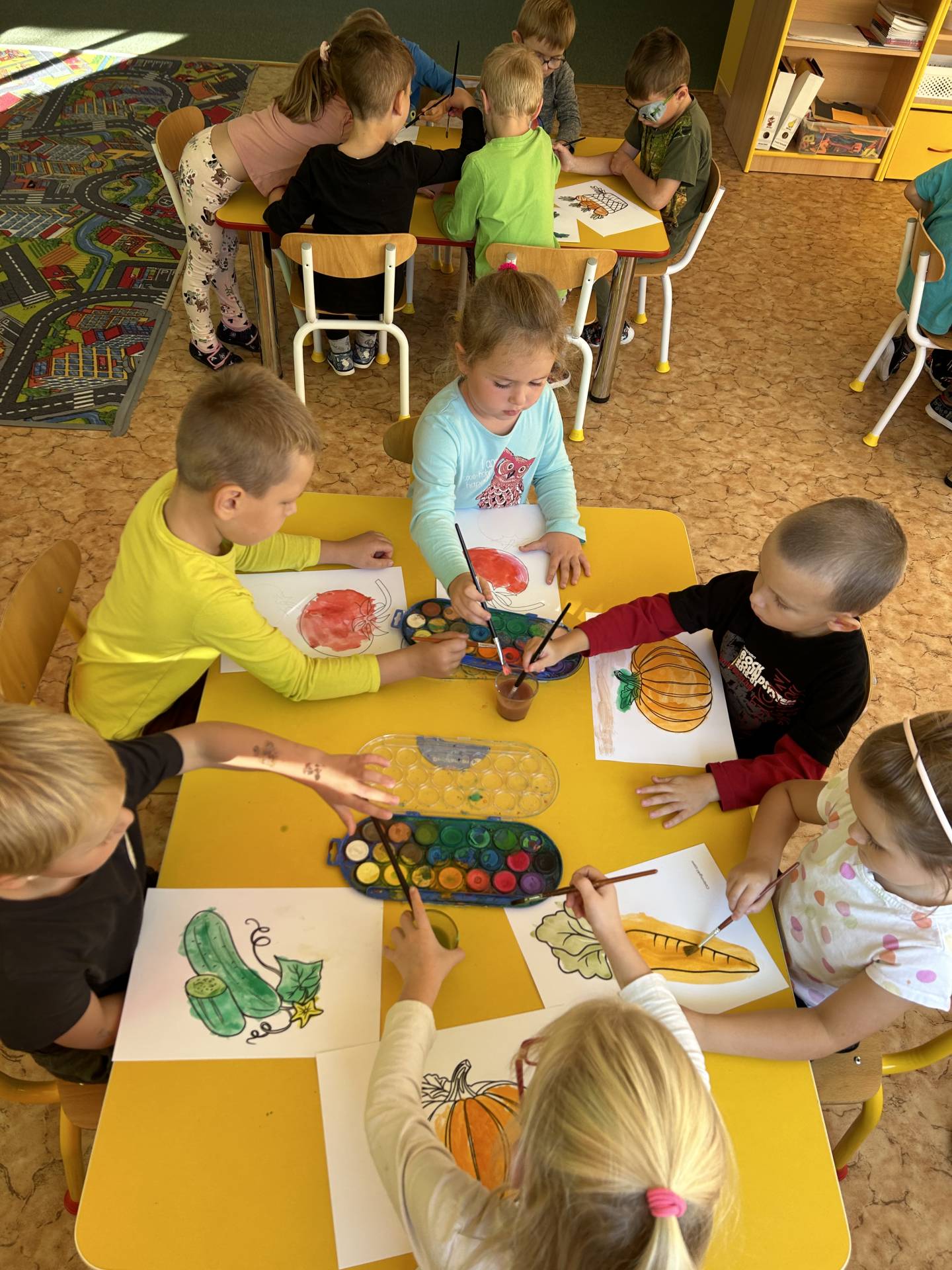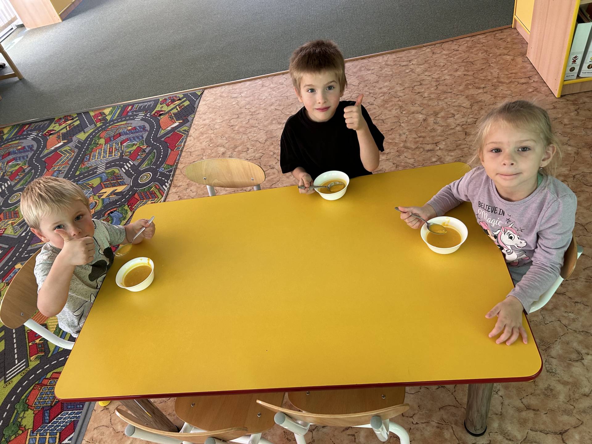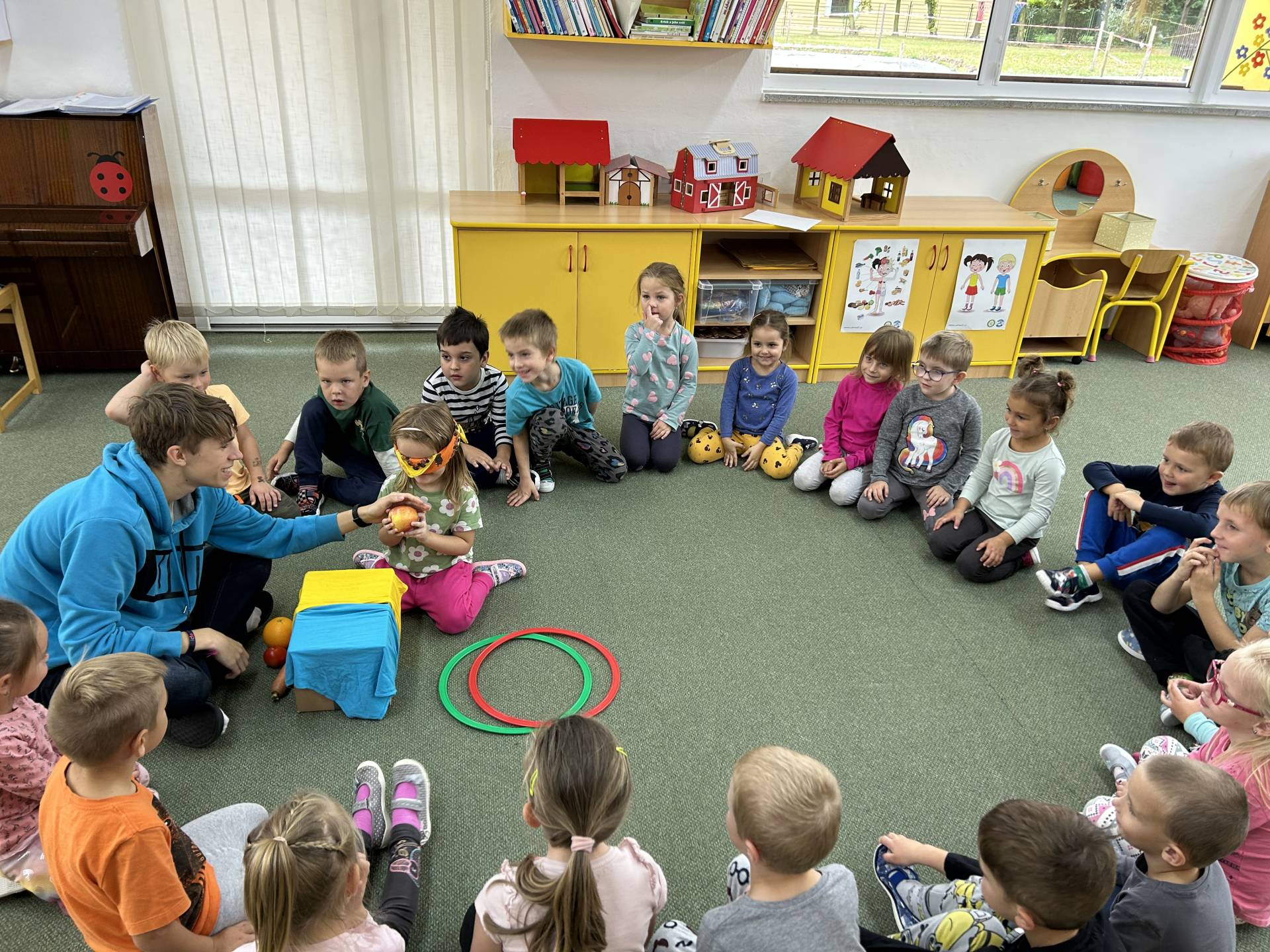V říjnu jsme se seznámili s tím, co je potřeba udělat na zahradě a na poli před zimou. Sklidit ovoce a zeleninu? Víme jak chutná, voní, jakou má barvu. Vnímali jsme ji všemi smysly. Společně s paní Petrekovou jsme si uvařili výbornou dýňovou polévku. Pohrabat listí? Žádný problém, ovšem my jsme v něm dováděli, stavěli domečky pro zvířátka a vytvořili si podzimníčky. Poorat pole a nakypřit půdu před zimním spánkem? Práci na poli, jsme pozorovali při vycházkách a následně ji výtvarně ztvárnili. Při pobytu venku pozorujeme změny v přírodě, a protože je letošní podzim krásný užíváme si každou procházku barevnou přírodou.