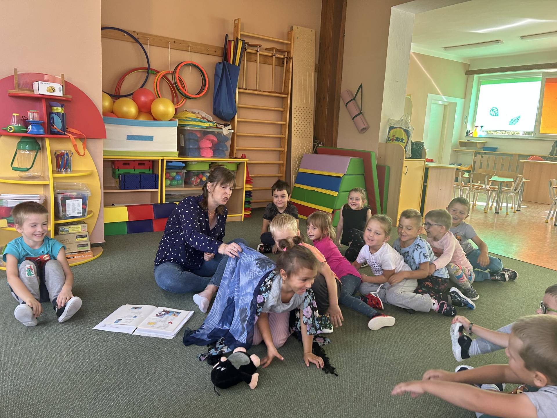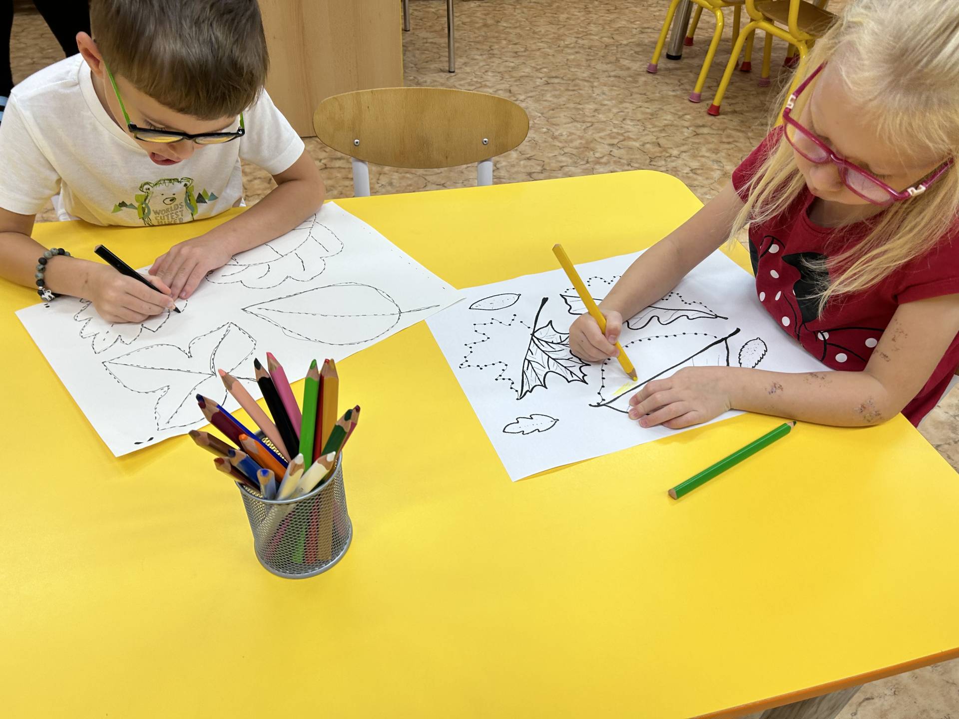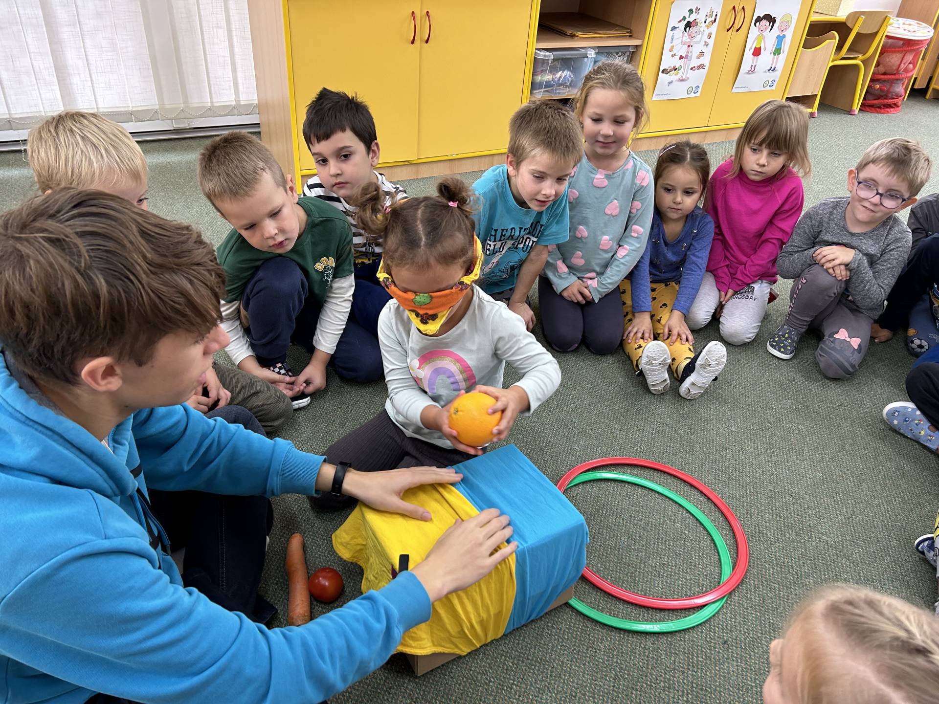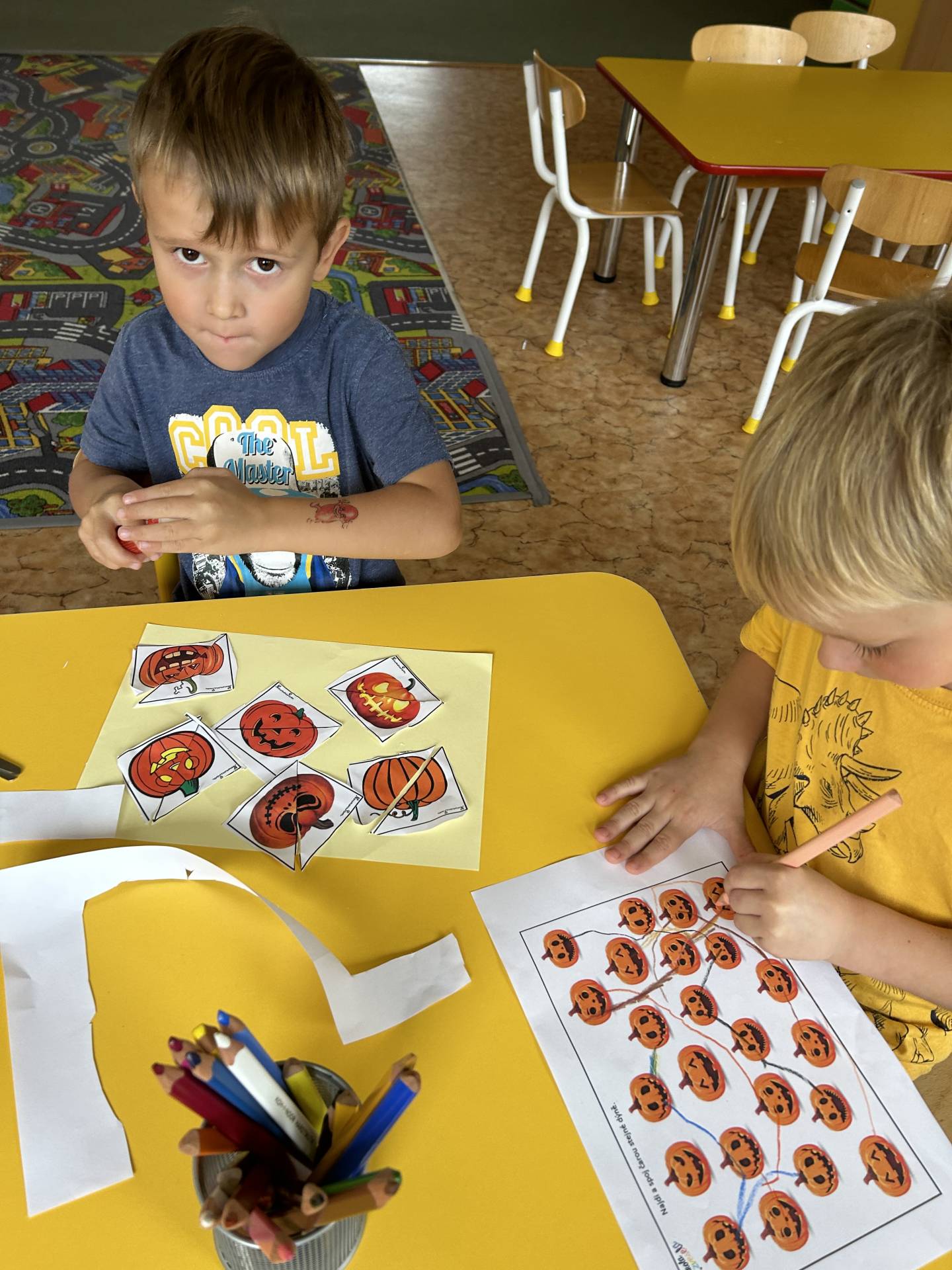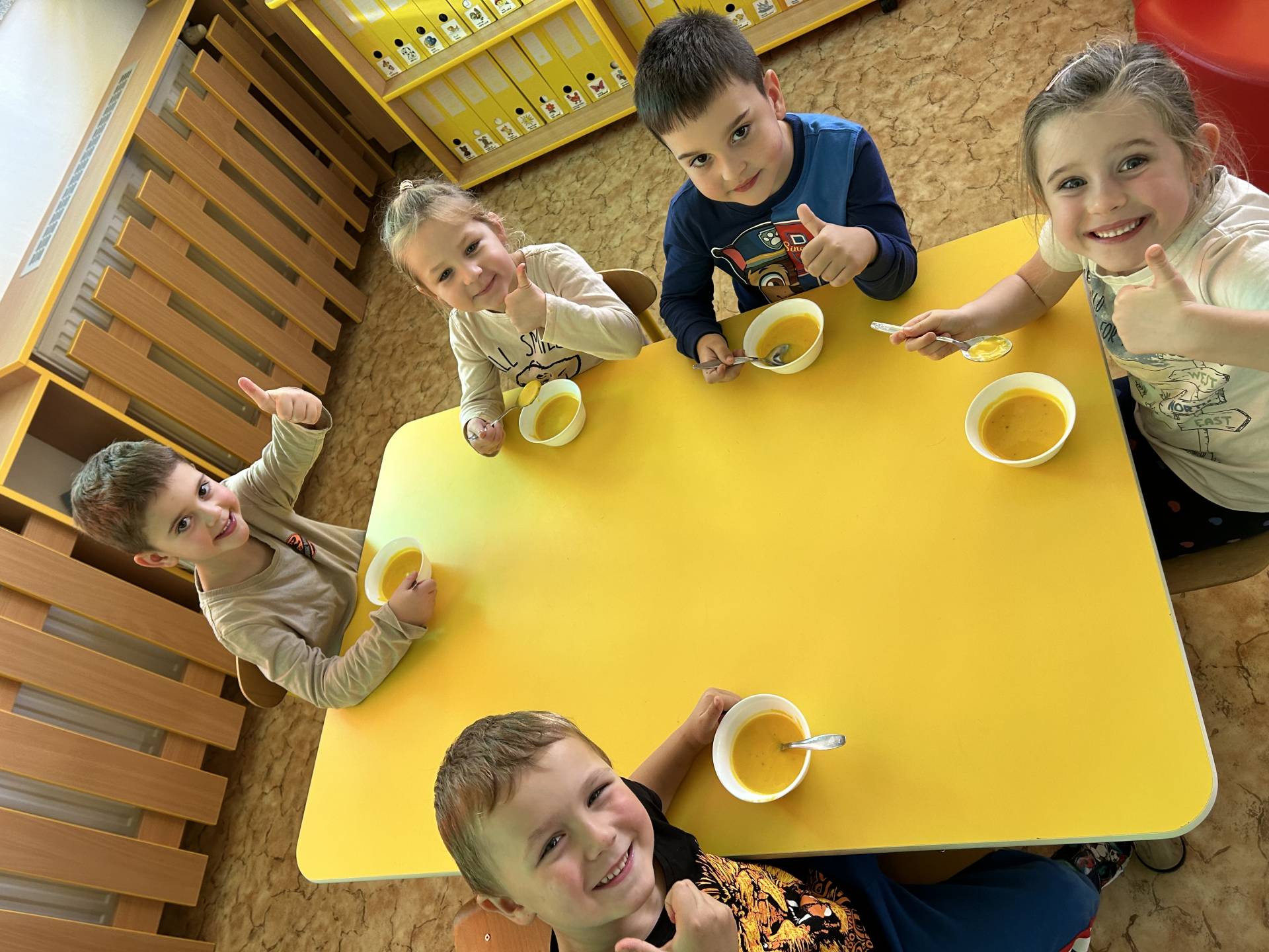 V říjnu jsme se seznámili s tím, co je potřeba udělat na zahradě a na poli před zimou. Sklidit ovoce a zeleninu? Víme jak chutná, voní, jakou má barvu. Vnímali jsme ji všemi smysly. Společně s paní Petrekovou jsme si uvařili výbornou dýňovou polévku. Pohrabat listí? Žádný problém, ovšem my jsme v něm dováděli, stavěli domečky pro zvířátka a vytvořili si podzimníčky. Poorat pole a nakypřit půdu před zimním spánkem? Práci na poli, jsme pozorovali při vycházkách a následně ji výtvarně ztvárnili. Při pobytu venku pozorujeme změny v přírodě, a protože je letošní podzim krásný užíváme si každou procházku barevnou přírodou.