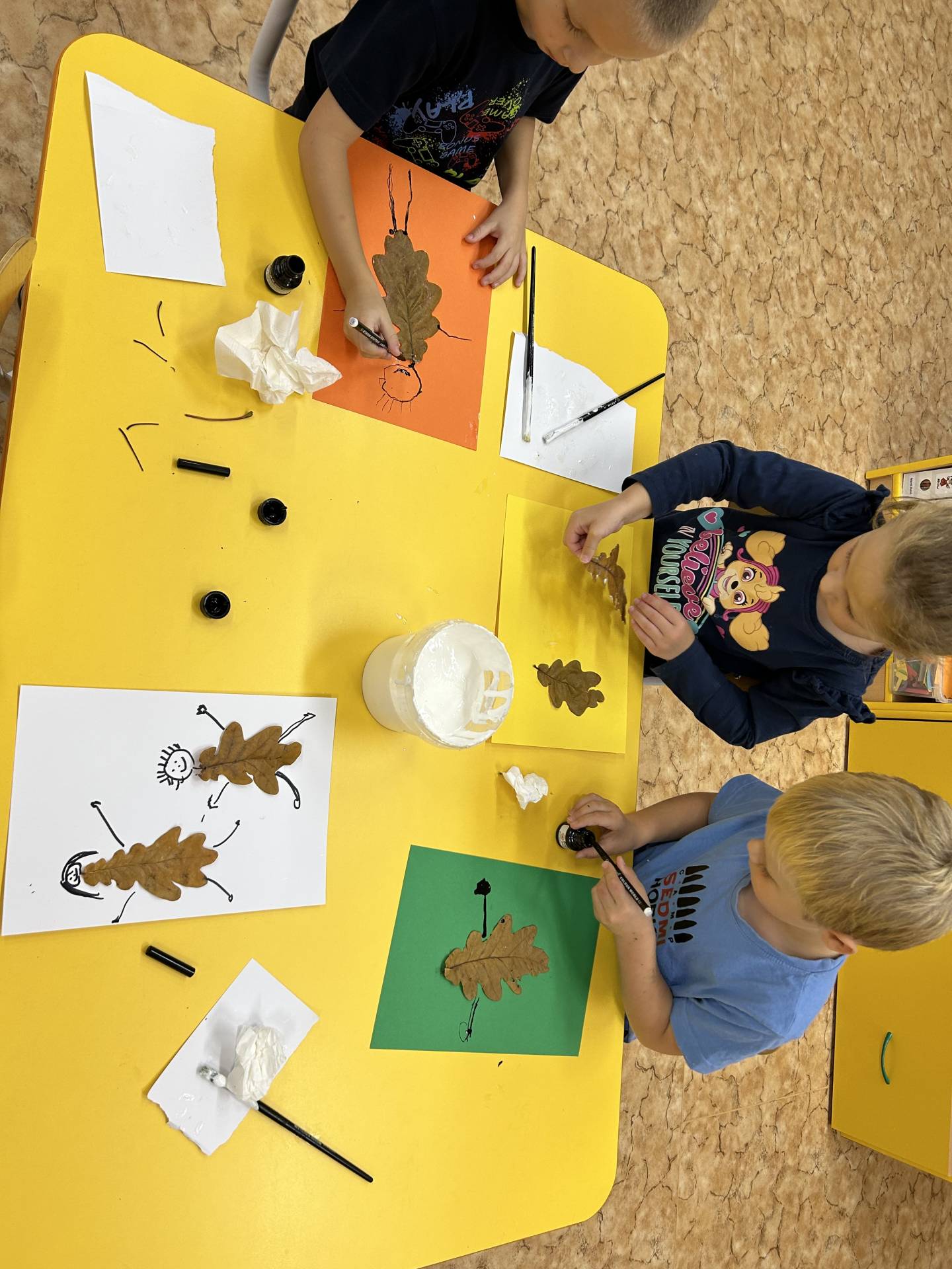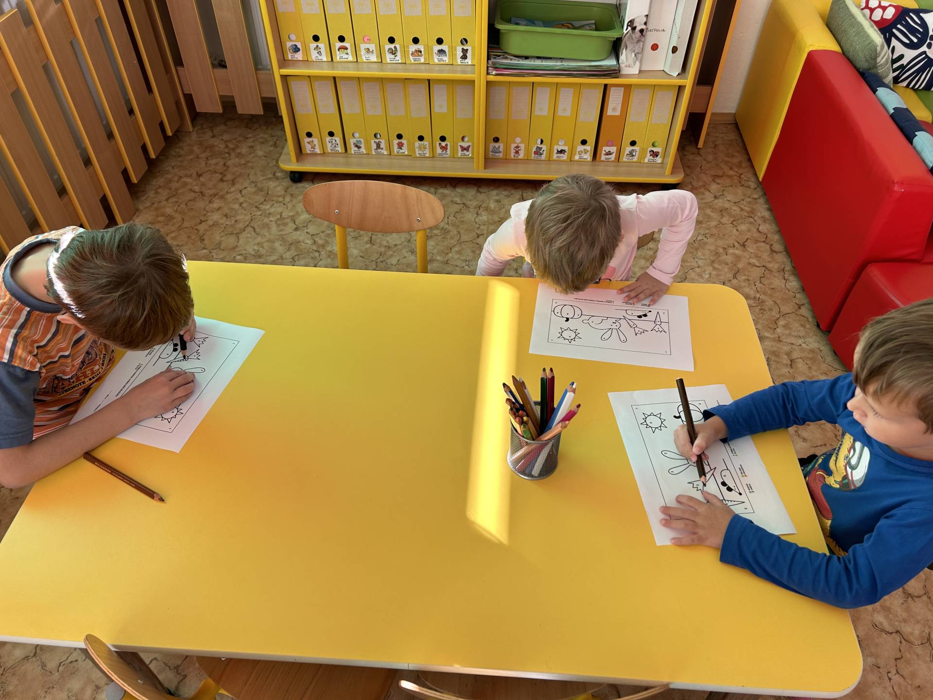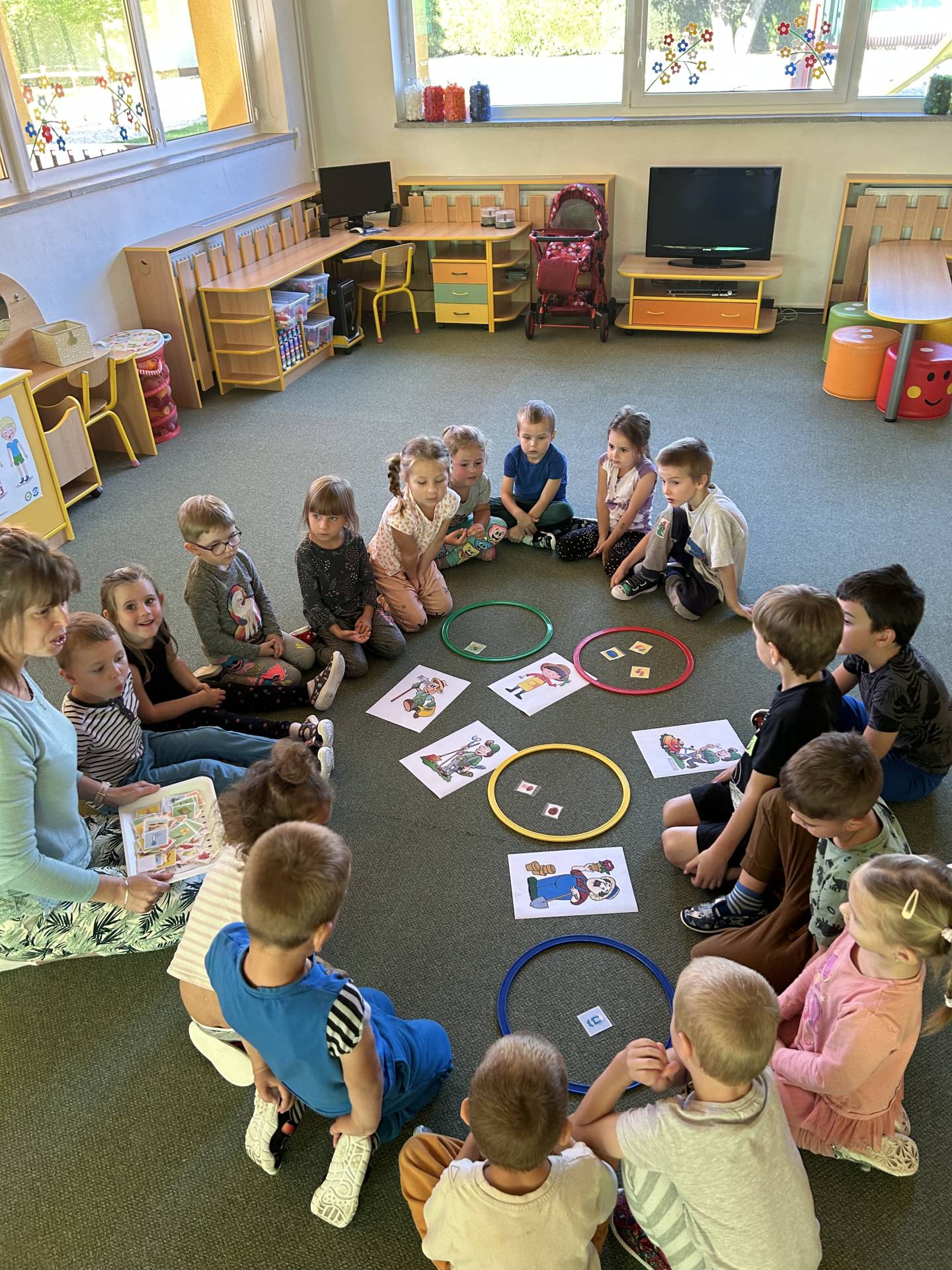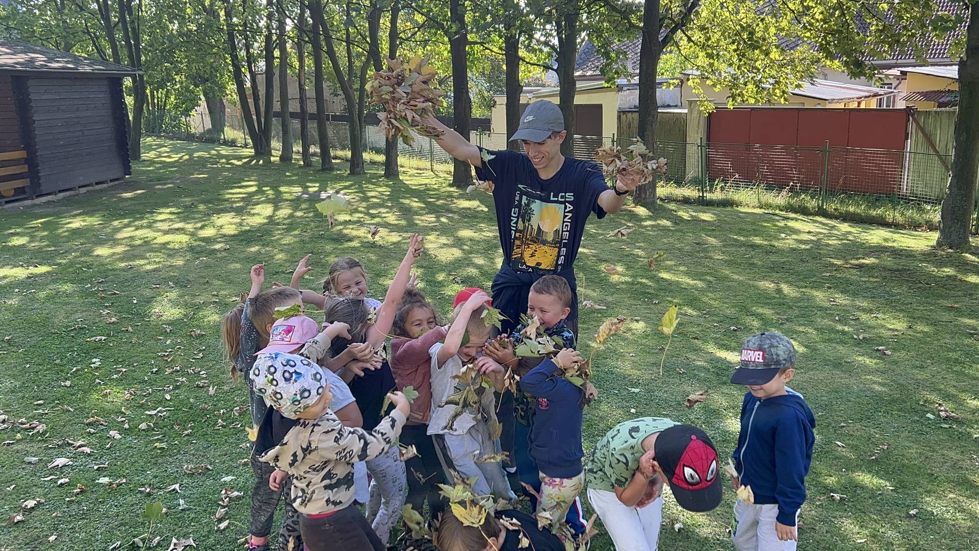V říjnu jsme se seznámili s tím, co je potřeba udělat na zahradě a na poli před zimou. Sklidit ovoce a zeleninu? Víme jak chutná, voní, jakou má barvu. Vnímali jsme ji všemi smysly. Společně s paní Petrekovou jsme si uvařili výbornou dýňovou polévku. Pohrabat listí? Žádný problém, ovšem my jsme v něm dováděli, stavěli domečky pro zvířátka a vytvořili si podzimníčky. Poorat pole a nakypřit půdu před zimním spánkem? Práci na poli, jsme pozorovali při vycházkách a následně ji výtvarně ztvárnili. Při pobytu venku pozorujeme změny v přírodě, a protože je letošní podzim krásný užíváme si každou procházku barevnou přírodou.