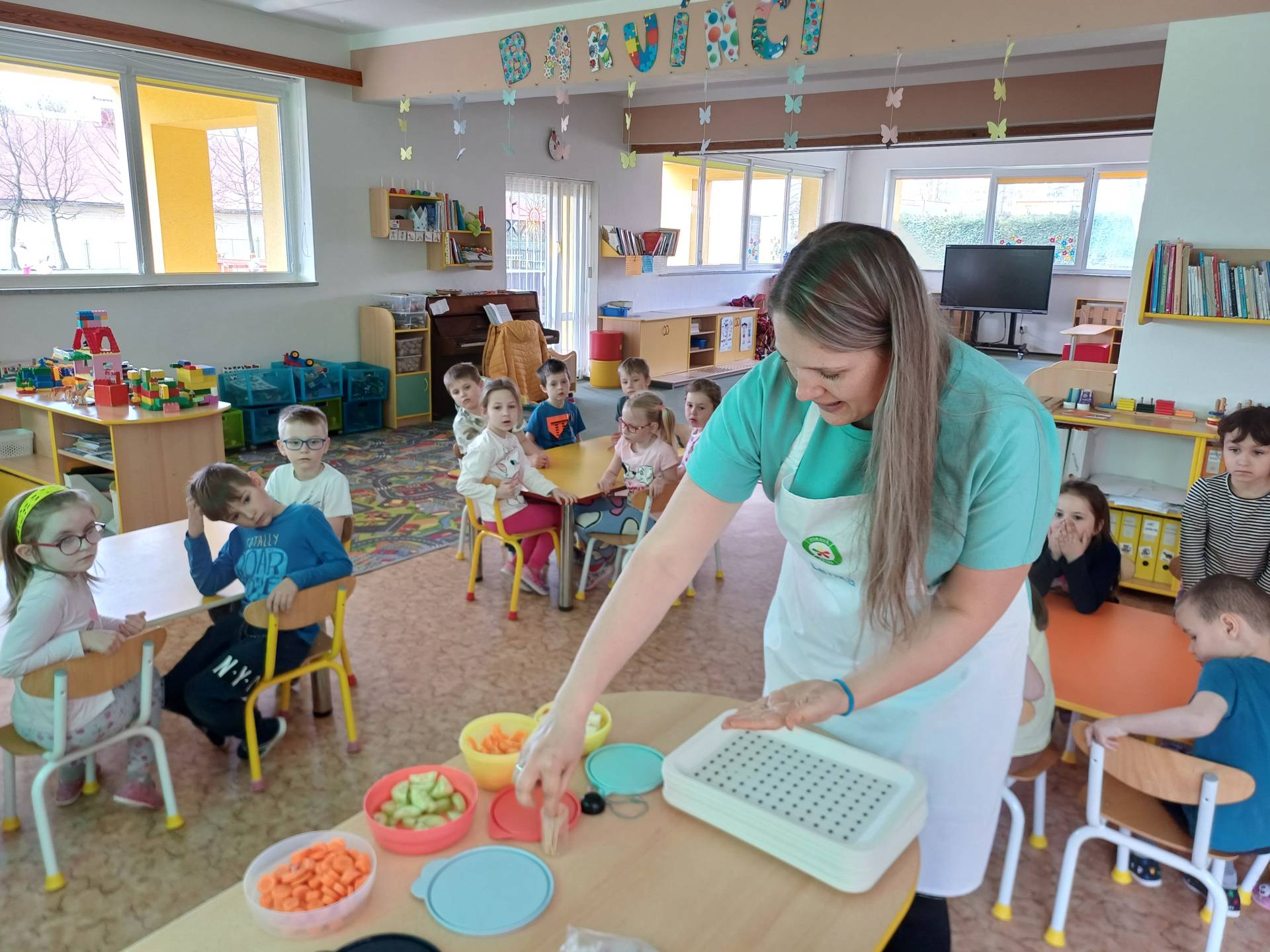 Dnes navštívila naši školku p. učitelka Lenka Kertysová, která se zabývá zdravou stravou a zdravými potravinami. Dopoledne s dětmi od Barvinků a Všeználků si povídali o kamarádce Otylce, která byla často nemocná a špatně se stravovala. Bája a Bingo ukázali Otylce co je dobře a co špatně, roztřídili potraviny, zacvičili si na písničku o zdravé mrkvičce a nakonec navlékli ovocné a zeleninové špízy.