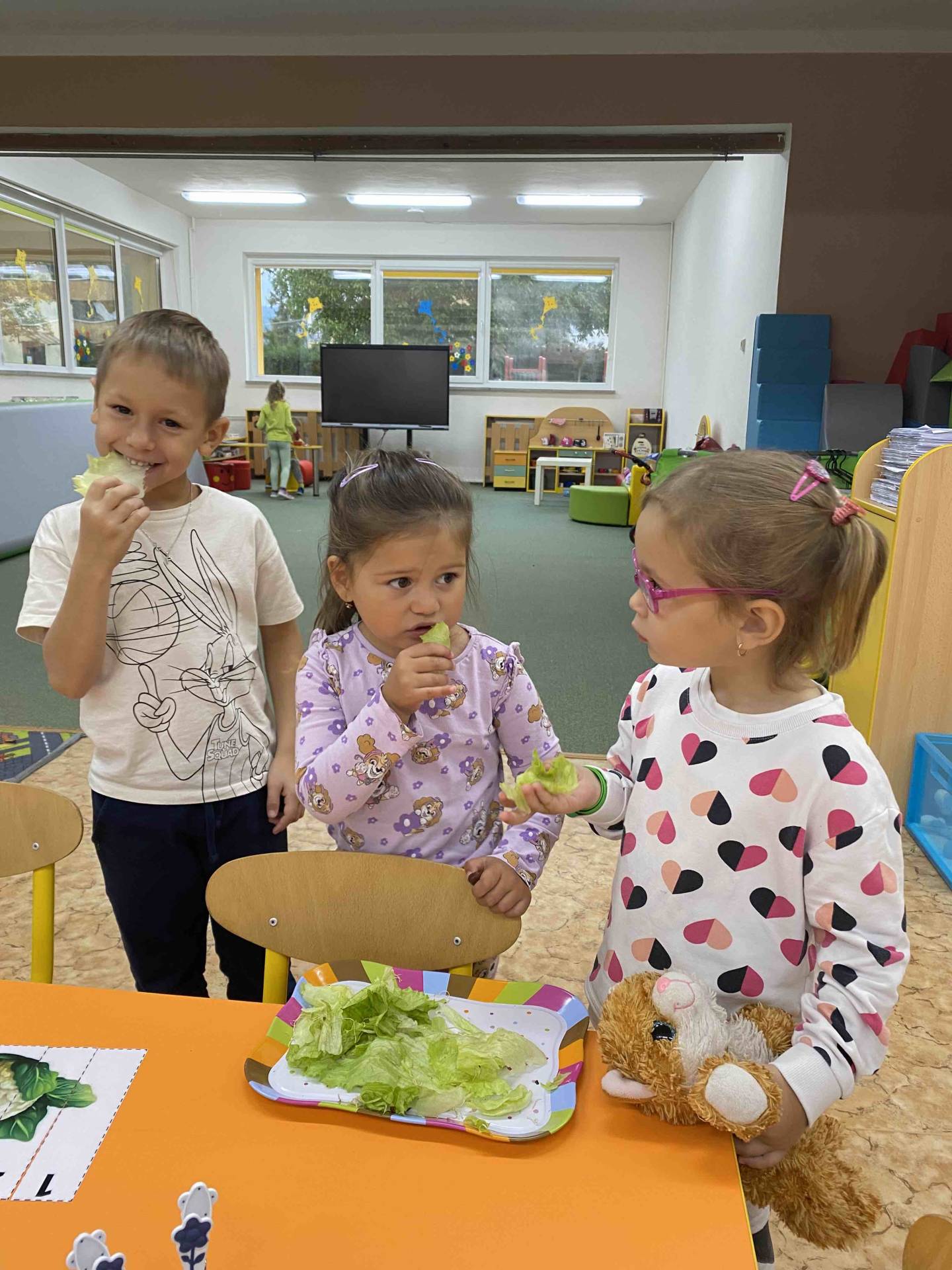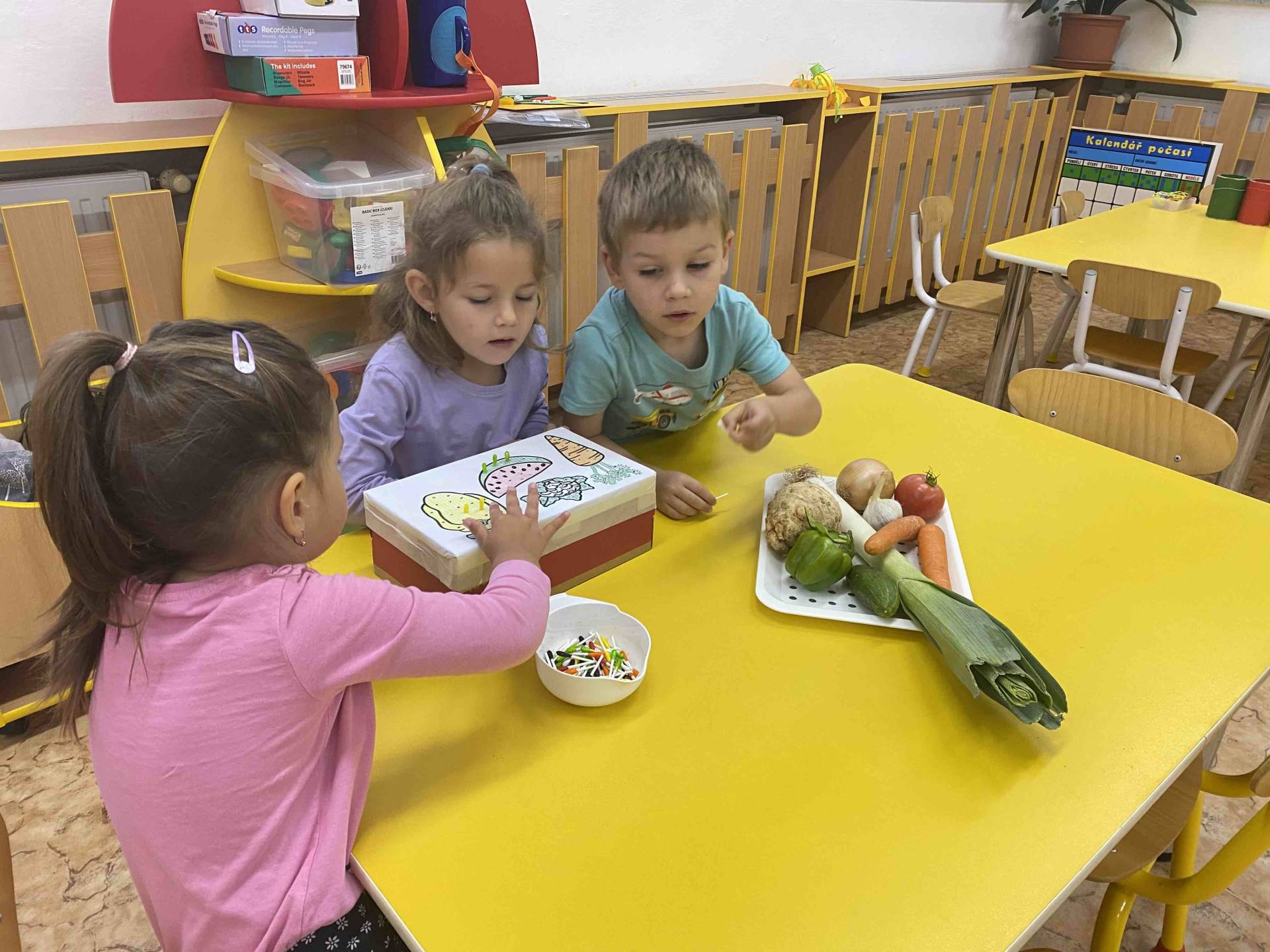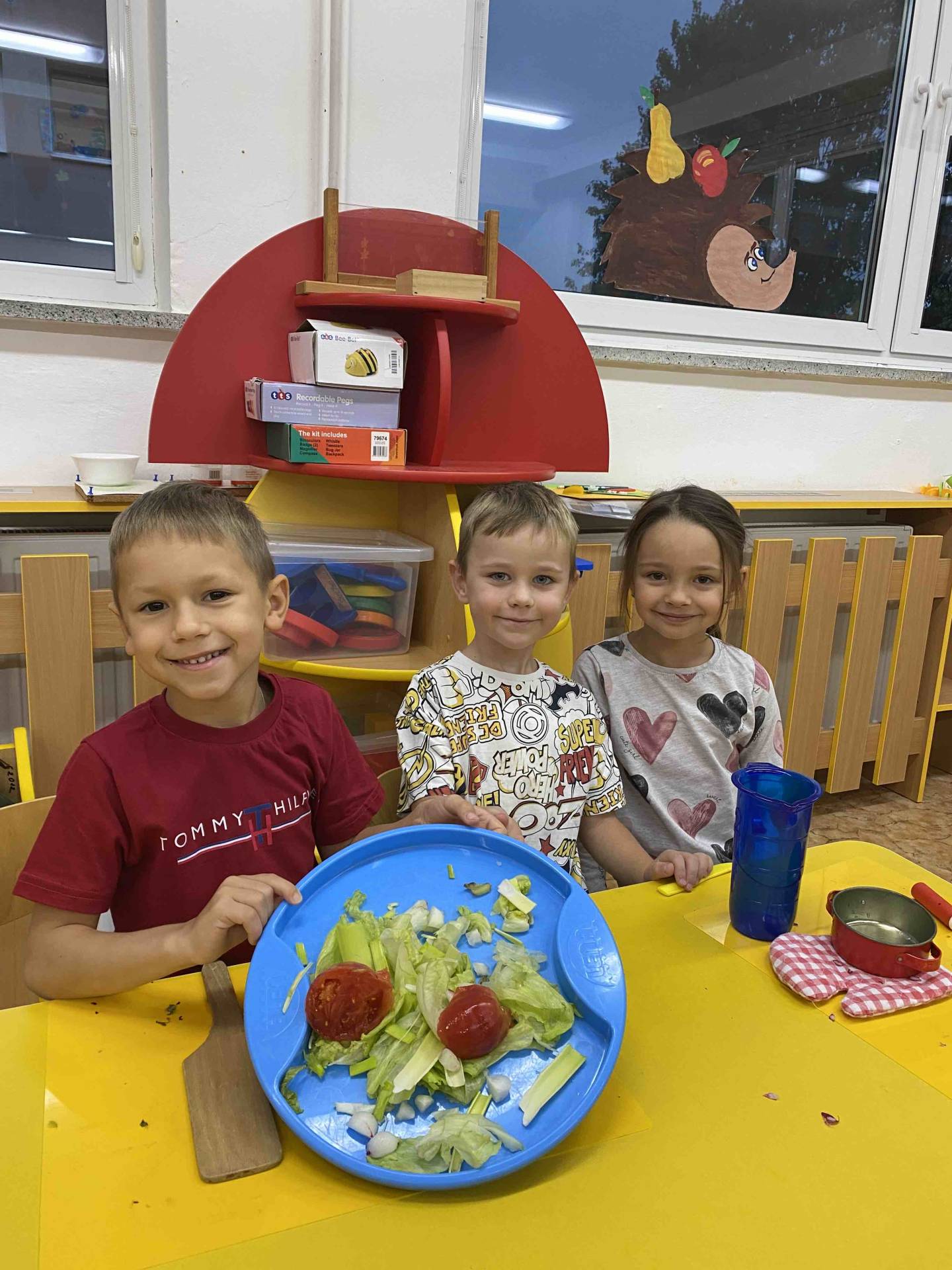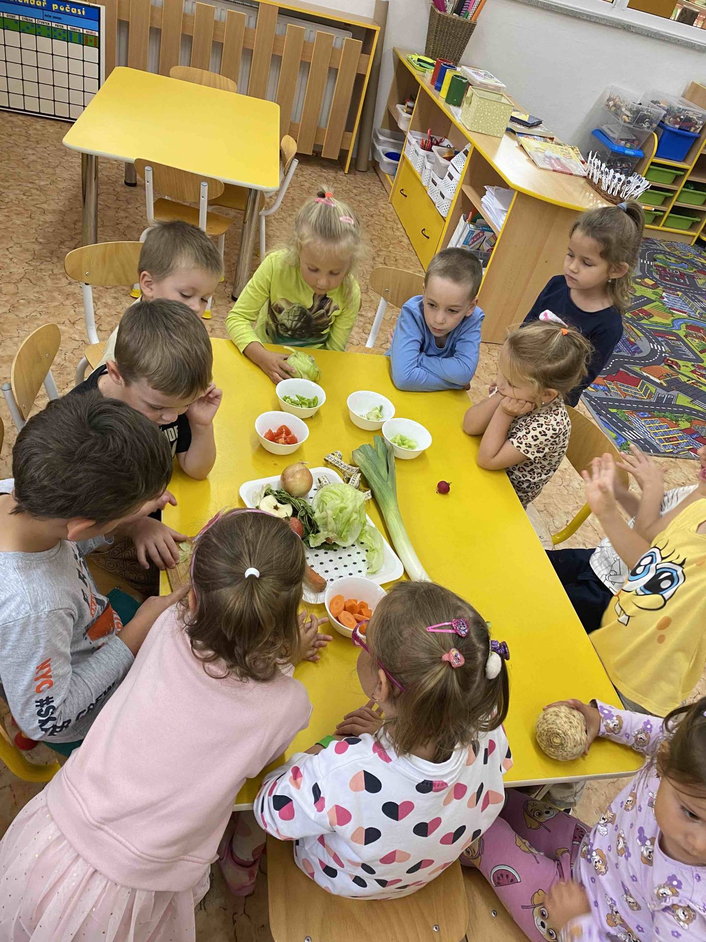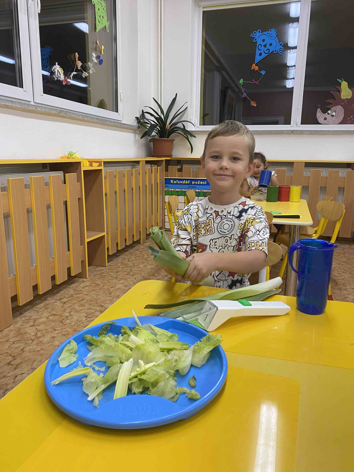 Svět zeleniny jsme s dětmi prozkoumávali opravdu všemismysly. Vytvořili jsme výstavku čerstvé a voňavé zeleniny, kde nechybělynejrůznější druhy – salát, pórek, cibule, česnek, kedluben, celer, ředkvičky,rajčátka, papriky…Povídali jsme si o místě a způsobu pěstování zeleniny, dětipojmenovávaly její druhy, zkoumaly její barvu, tvar a strukturu pomocí lupy. Objevilyspoustu detailů, které pouhým okem snadno přehlédneme … Pomocí metru a kuchyňské váhy zeleninu měřilya vážily, porovnávaly velikost – nejkratší x nejdelší a samozřejmě i hmotnost –nejprve pouze vlastním odhadem, pak přesným vážením na váze, takže si procvičilyi základní matematické dovednosti a jak jinak, než hravou formou. Každý den násdoprovázela veselá písnička „Šel zahradník do zahrady“, kterou si děti s chutízpívaly. Vyzkoušeli jsme si spoustu různých aktivit k tématu zelenina,procvičovali jemnou motoriku, zrakové vnímání, matematické dovednosti, logickémyšlení, barvičky, paměť i kreativitu a fantazii při výrobě zeleninového záhonku. Na závěr týdne jsme sispolečně připravili zeleninový salát z ledového salátu, rajčat a ředkviček.Děti si samy zeleninu nakrájely na malé kousky, následovala veselá ochutnávkase zavázanýma očima – děti se snažily podle vůně, chuti i hmatu poznat, jakouzeleninu právě ochutnávají. Nakonec jsem vše smíchali dohromady a vznikl krásněbarevný a svěží salát, na kterém si děti s radostí pochutnaly. Celýprojekt byl plný zábavy, objevování a radosti z vlastnoruční práce.