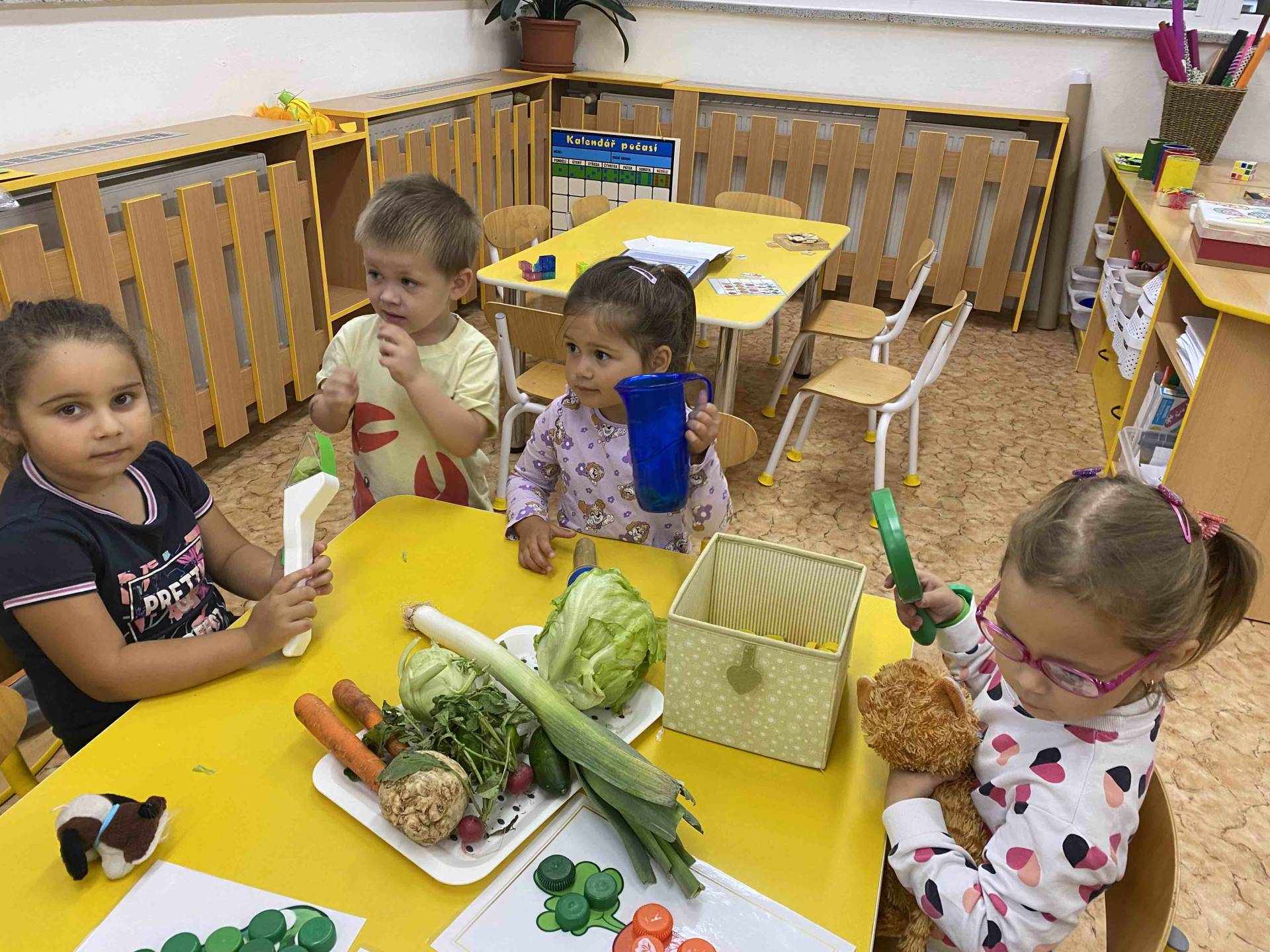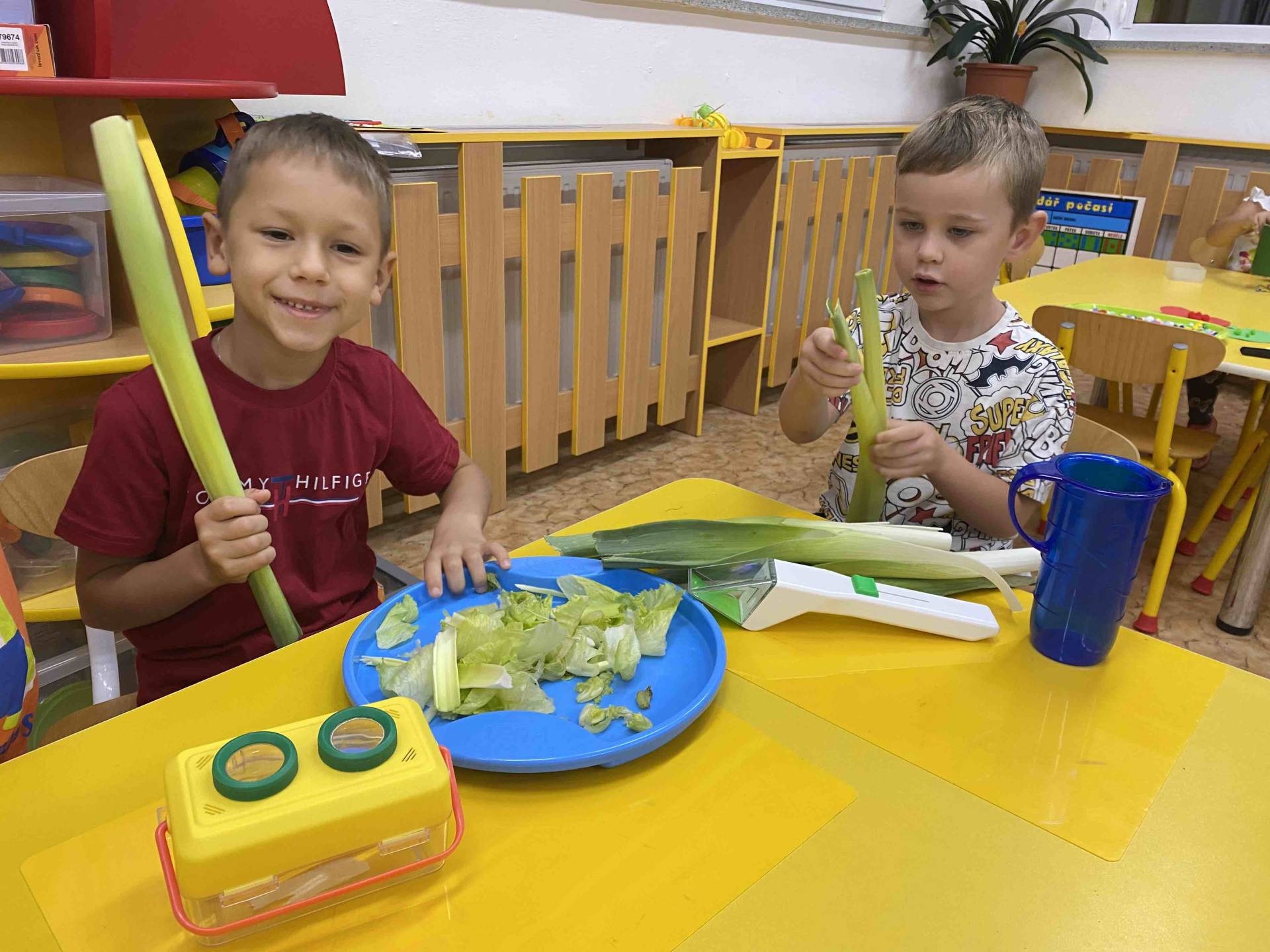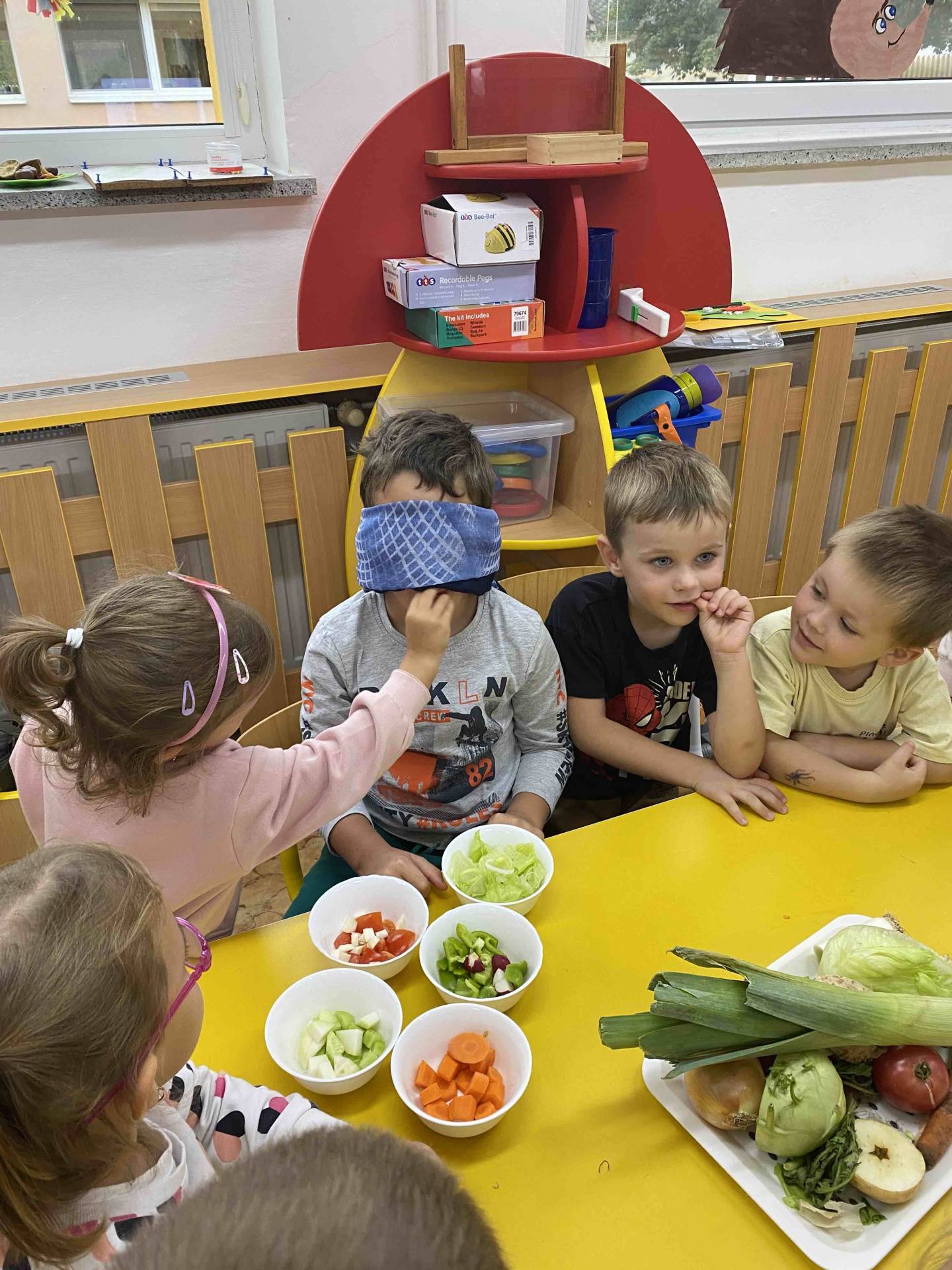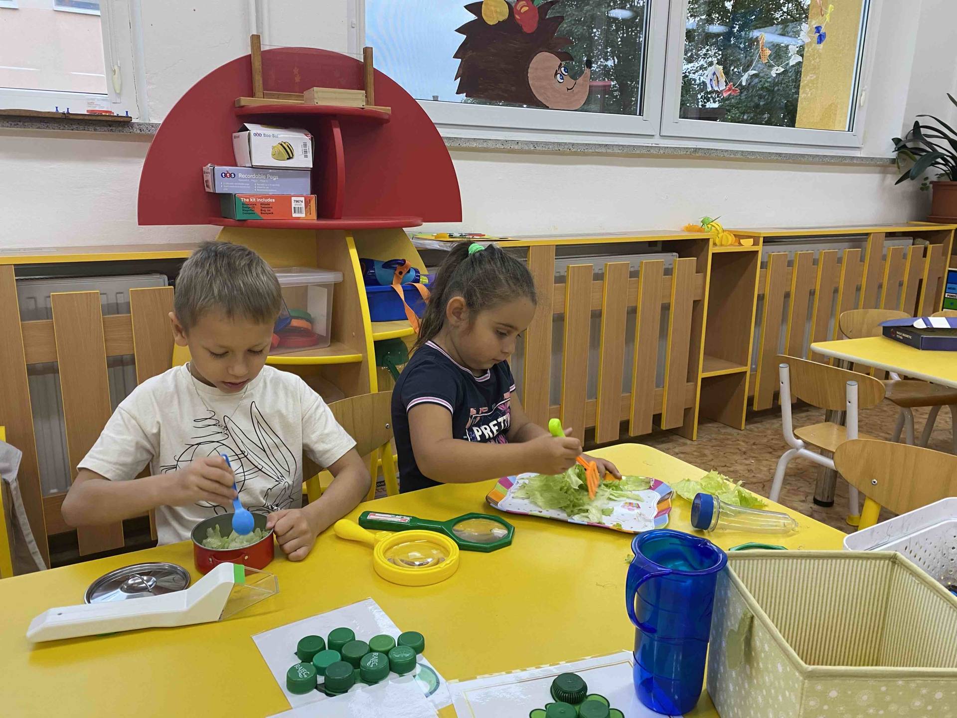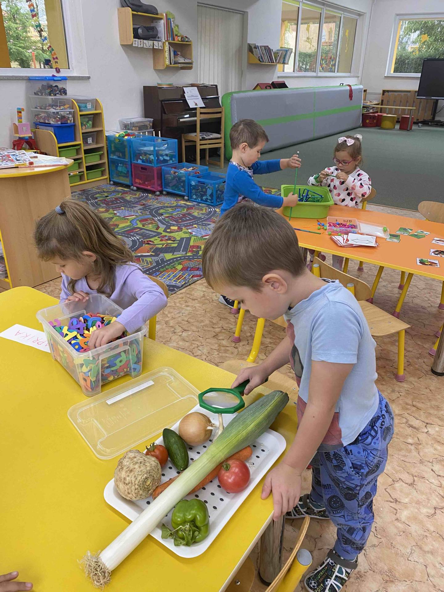 Svět zeleniny jsme s dětmi prozkoumávali opravdu všemismysly. Vytvořili jsme výstavku čerstvé a voňavé zeleniny, kde nechybělynejrůznější druhy – salát, pórek, cibule, česnek, kedluben, celer, ředkvičky,rajčátka, papriky…Povídali jsme si o místě a způsobu pěstování zeleniny, dětipojmenovávaly její druhy, zkoumaly její barvu, tvar a strukturu pomocí lupy. Objevilyspoustu detailů, které pouhým okem snadno přehlédneme … Pomocí metru a kuchyňské váhy zeleninu měřilya vážily, porovnávaly velikost – nejkratší x nejdelší a samozřejmě i hmotnost –nejprve pouze vlastním odhadem, pak přesným vážením na váze, takže si procvičilyi základní matematické dovednosti a jak jinak, než hravou formou. Každý den násdoprovázela veselá písnička „Šel zahradník do zahrady“, kterou si děti s chutízpívaly. Vyzkoušeli jsme si spoustu různých aktivit k tématu zelenina,procvičovali jemnou motoriku, zrakové vnímání, matematické dovednosti, logickémyšlení, barvičky, paměť i kreativitu a fantazii při výrobě zeleninového záhonku. Na závěr týdne jsme sispolečně připravili zeleninový salát z ledového salátu, rajčat a ředkviček.Děti si samy zeleninu nakrájely na malé kousky, následovala veselá ochutnávkase zavázanýma očima – děti se snažily podle vůně, chuti i hmatu poznat, jakouzeleninu právě ochutnávají. Nakonec jsem vše smíchali dohromady a vznikl krásněbarevný a svěží salát, na kterém si děti s radostí pochutnaly. Celýprojekt byl plný zábavy, objevování a radosti z vlastnoruční práce.
