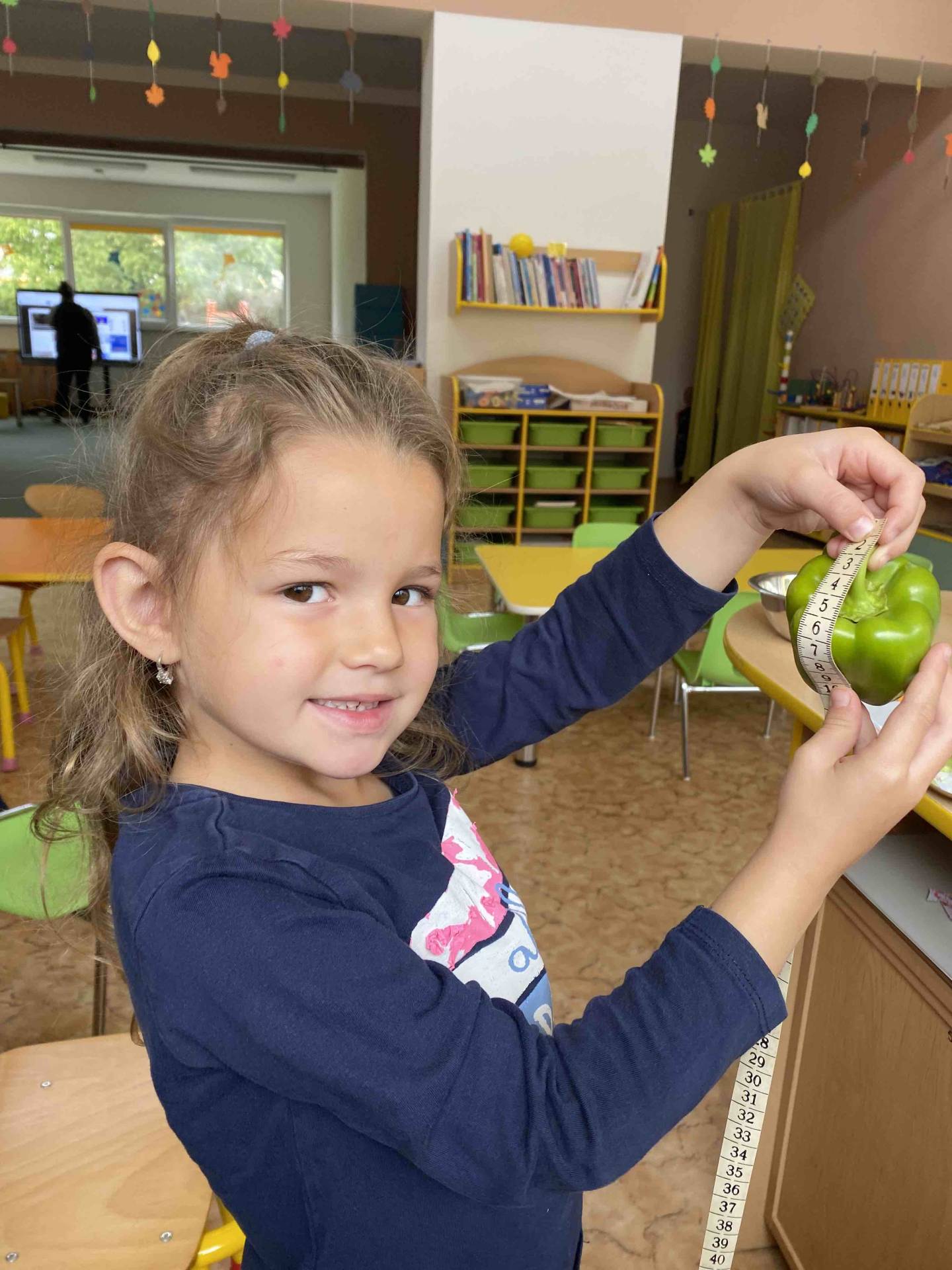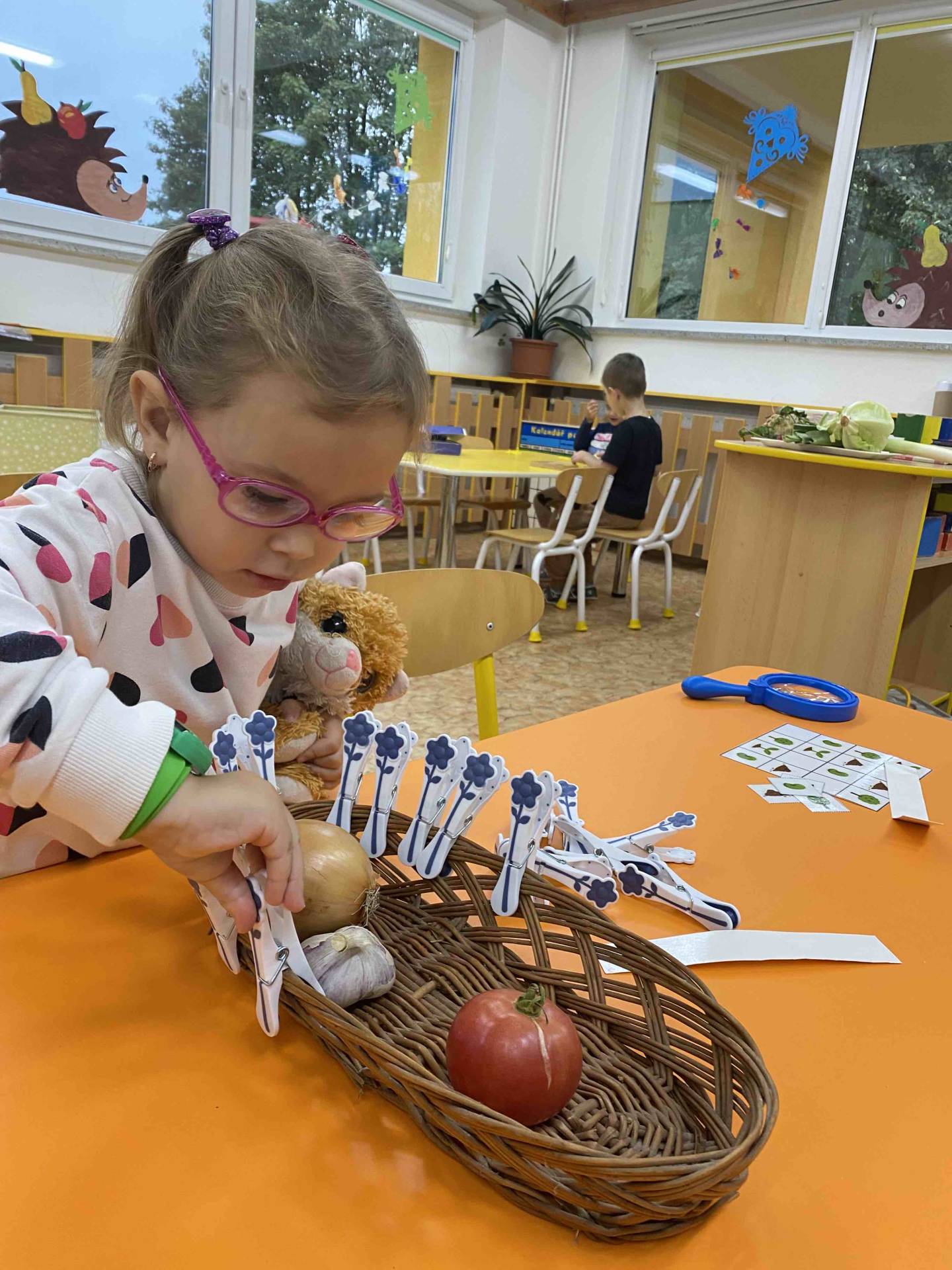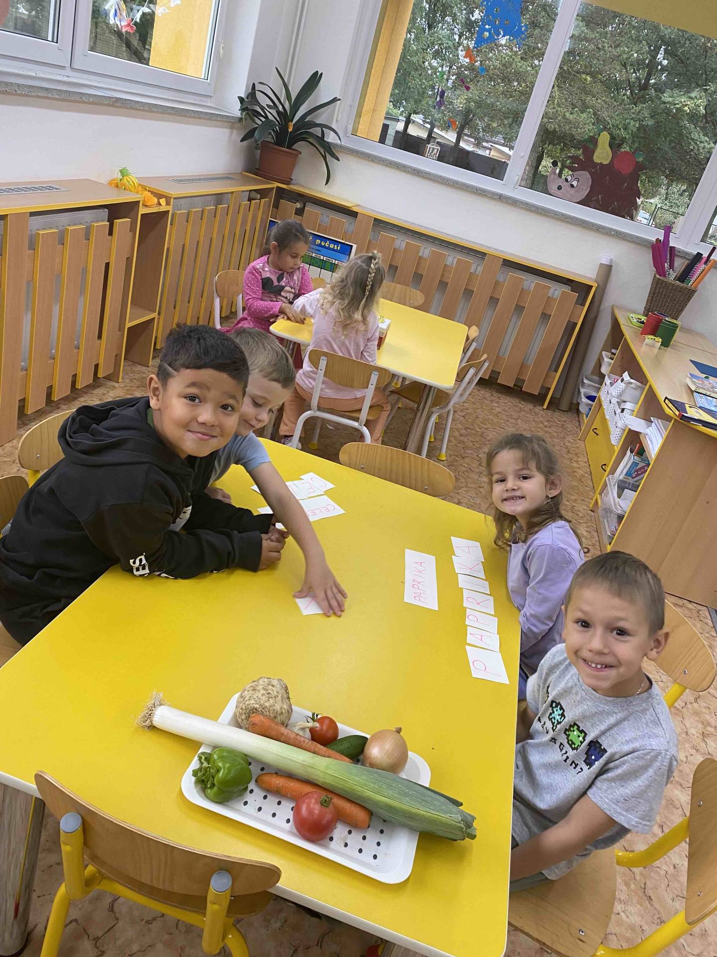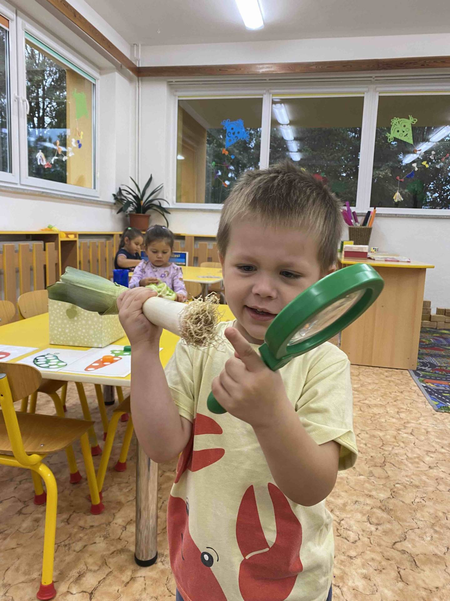 Svět zeleniny jsme s dětmi prozkoumávali opravdu všemismysly. Vytvořili jsme výstavku čerstvé a voňavé zeleniny, kde nechybělynejrůznější druhy – salát, pórek, cibule, česnek, kedluben, celer, ředkvičky,rajčátka, papriky…Povídali jsme si o místě a způsobu pěstování zeleniny, dětipojmenovávaly její druhy, zkoumaly její barvu, tvar a strukturu pomocí lupy. Objevilyspoustu detailů, které pouhým okem snadno přehlédneme … Pomocí metru a kuchyňské váhy zeleninu měřilya vážily, porovnávaly velikost – nejkratší x nejdelší a samozřejmě i hmotnost –nejprve pouze vlastním odhadem, pak přesným vážením na váze, takže si procvičilyi základní matematické dovednosti a jak jinak, než hravou formou. Každý den násdoprovázela veselá písnička „Šel zahradník do zahrady“, kterou si děti s chutízpívaly. Vyzkoušeli jsme si spoustu různých aktivit k tématu zelenina,procvičovali jemnou motoriku, zrakové vnímání, matematické dovednosti, logickémyšlení, barvičky, paměť i kreativitu a fantazii při výrobě zeleninového záhonku. Na závěr týdne jsme sispolečně připravili zeleninový salát z ledového salátu, rajčat a ředkviček.Děti si samy zeleninu nakrájely na malé kousky, následovala veselá ochutnávkase zavázanýma očima – děti se snažily podle vůně, chuti i hmatu poznat, jakouzeleninu právě ochutnávají. Nakonec jsem vše smíchali dohromady a vznikl krásněbarevný a svěží salát, na kterém si děti s radostí pochutnaly. Celýprojekt byl plný zábavy, objevování a radosti z vlastnoruční práce.