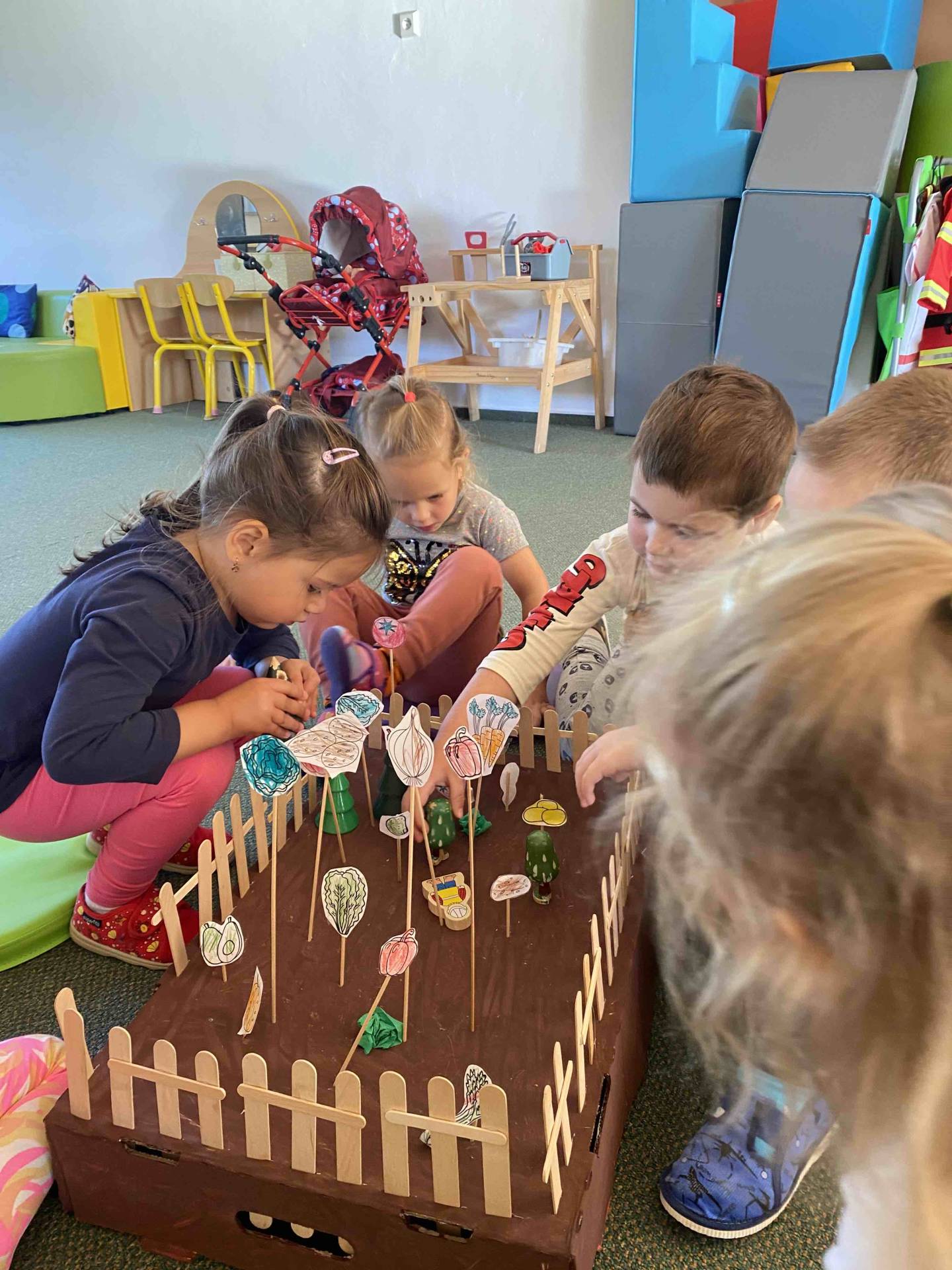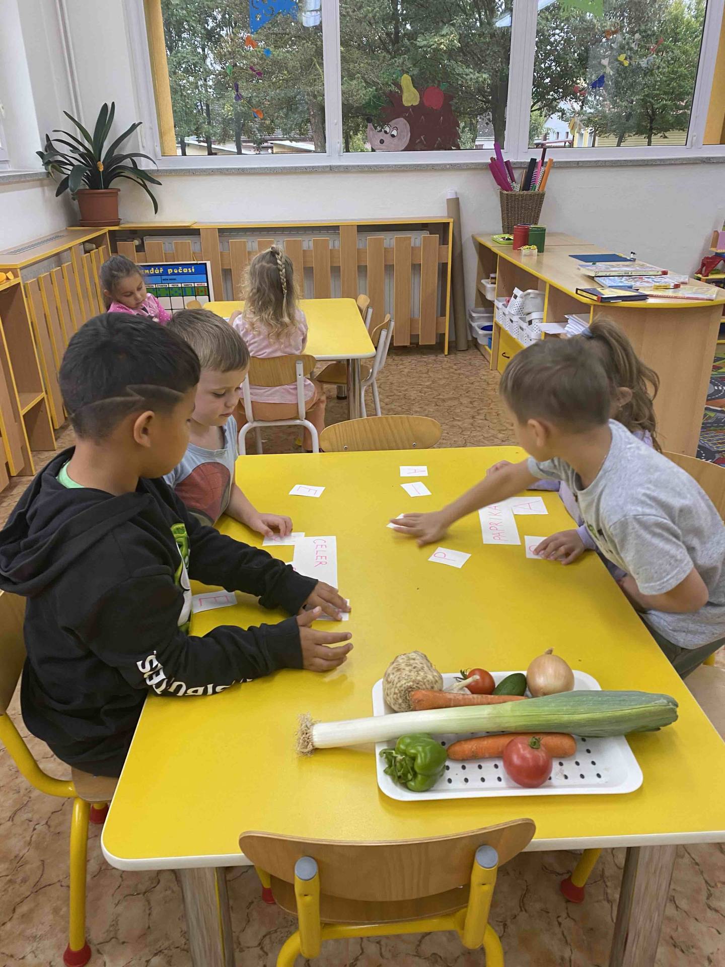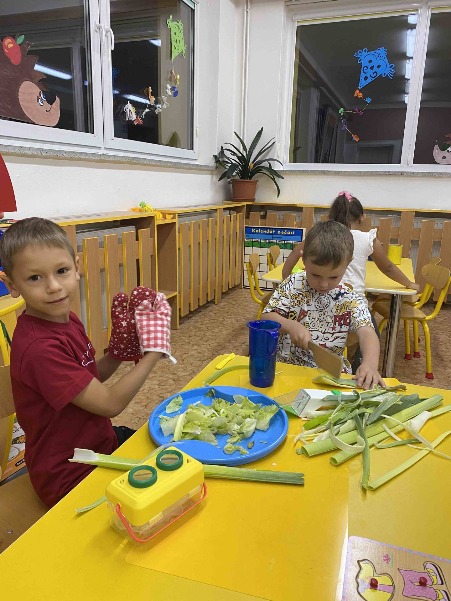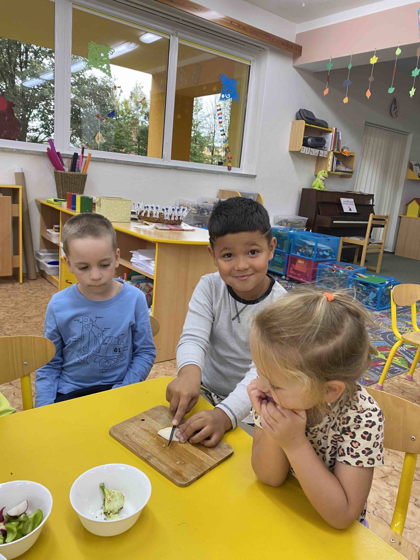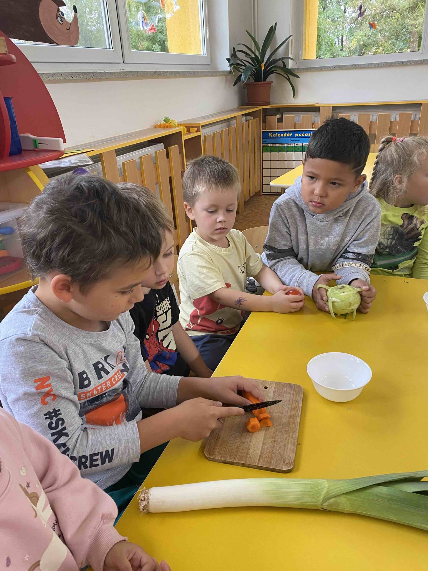 Svět zeleniny jsme s dětmi prozkoumávali opravdu všemismysly. Vytvořili jsme výstavku čerstvé a voňavé zeleniny, kde nechybělynejrůznější druhy – salát, pórek, cibule, česnek, kedluben, celer, ředkvičky,rajčátka, papriky…Povídali jsme si o místě a způsobu pěstování zeleniny, dětipojmenovávaly její druhy, zkoumaly její barvu, tvar a strukturu pomocí lupy. Objevilyspoustu detailů, které pouhým okem snadno přehlédneme … Pomocí metru a kuchyňské váhy zeleninu měřilya vážily, porovnávaly velikost – nejkratší x nejdelší a samozřejmě i hmotnost –nejprve pouze vlastním odhadem, pak přesným vážením na váze, takže si procvičilyi základní matematické dovednosti a jak jinak, než hravou formou. Každý den násdoprovázela veselá písnička „Šel zahradník do zahrady“, kterou si děti s chutízpívaly. Vyzkoušeli jsme si spoustu různých aktivit k tématu zelenina,procvičovali jemnou motoriku, zrakové vnímání, matematické dovednosti, logickémyšlení, barvičky, paměť i kreativitu a fantazii při výrobě zeleninového záhonku. Na závěr týdne jsme sispolečně připravili zeleninový salát z ledového salátu, rajčat a ředkviček.Děti si samy zeleninu nakrájely na malé kousky, následovala veselá ochutnávkase zavázanýma očima – děti se snažily podle vůně, chuti i hmatu poznat, jakouzeleninu právě ochutnávají. Nakonec jsem vše smíchali dohromady a vznikl krásněbarevný a svěží salát, na kterém si děti s radostí pochutnaly. Celýprojekt byl plný zábavy, objevování a radosti z vlastnoruční práce.