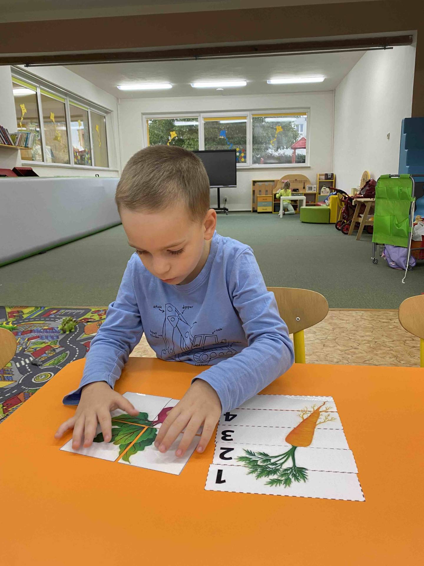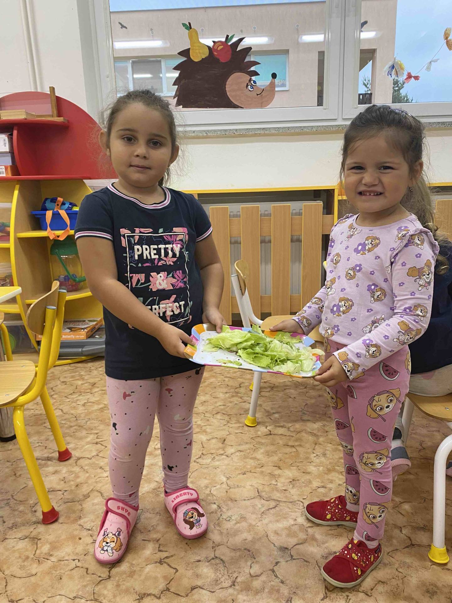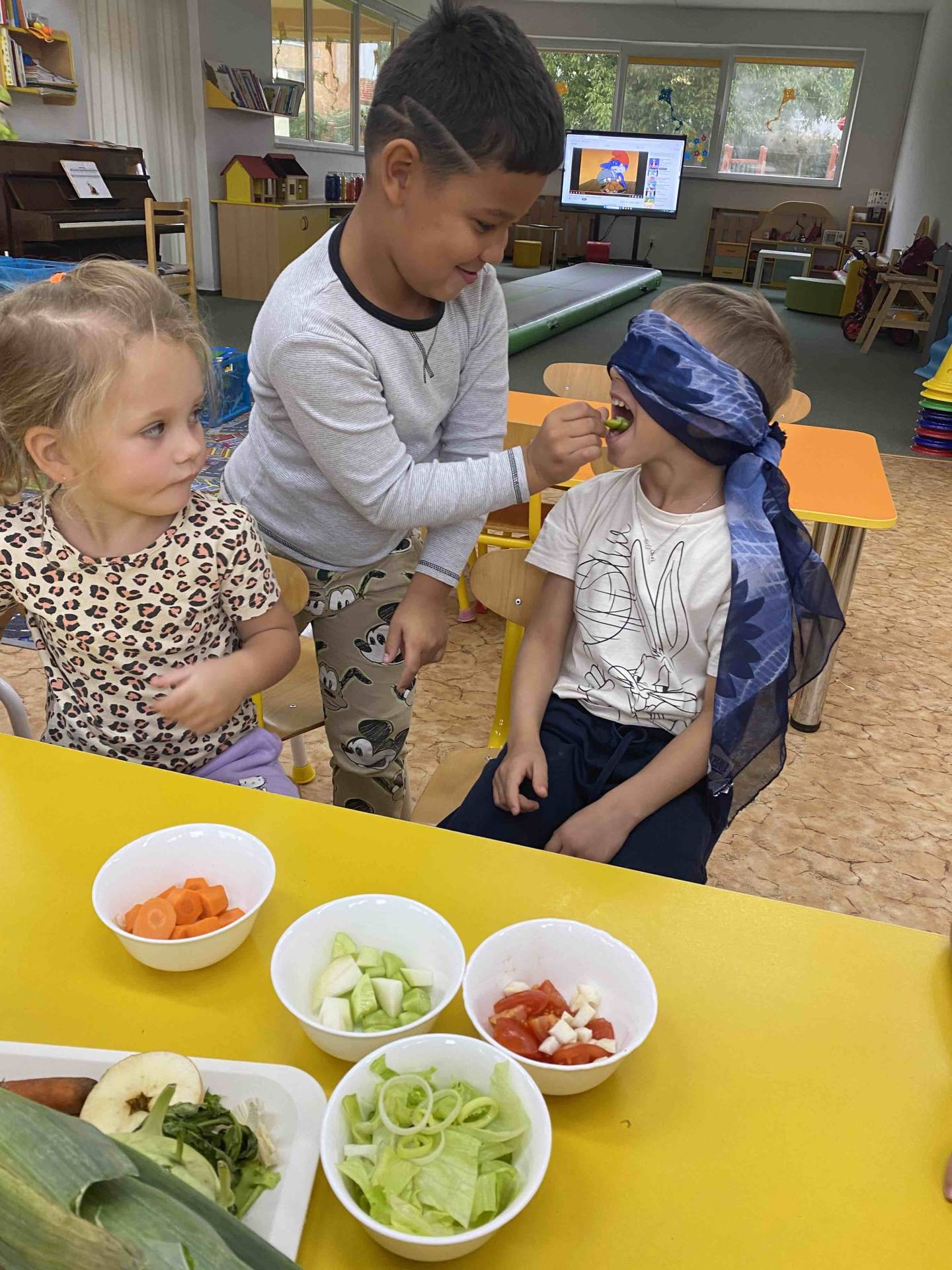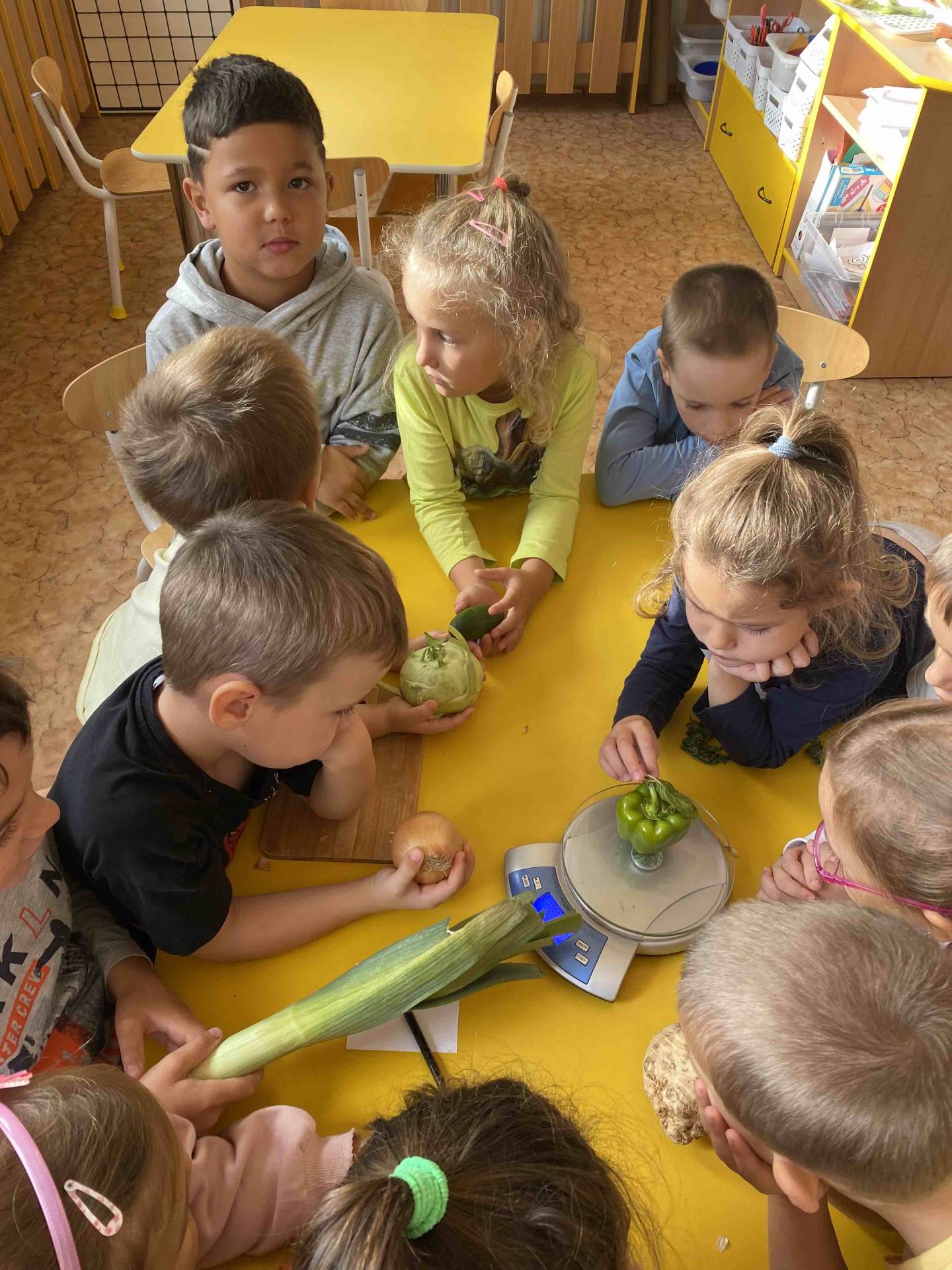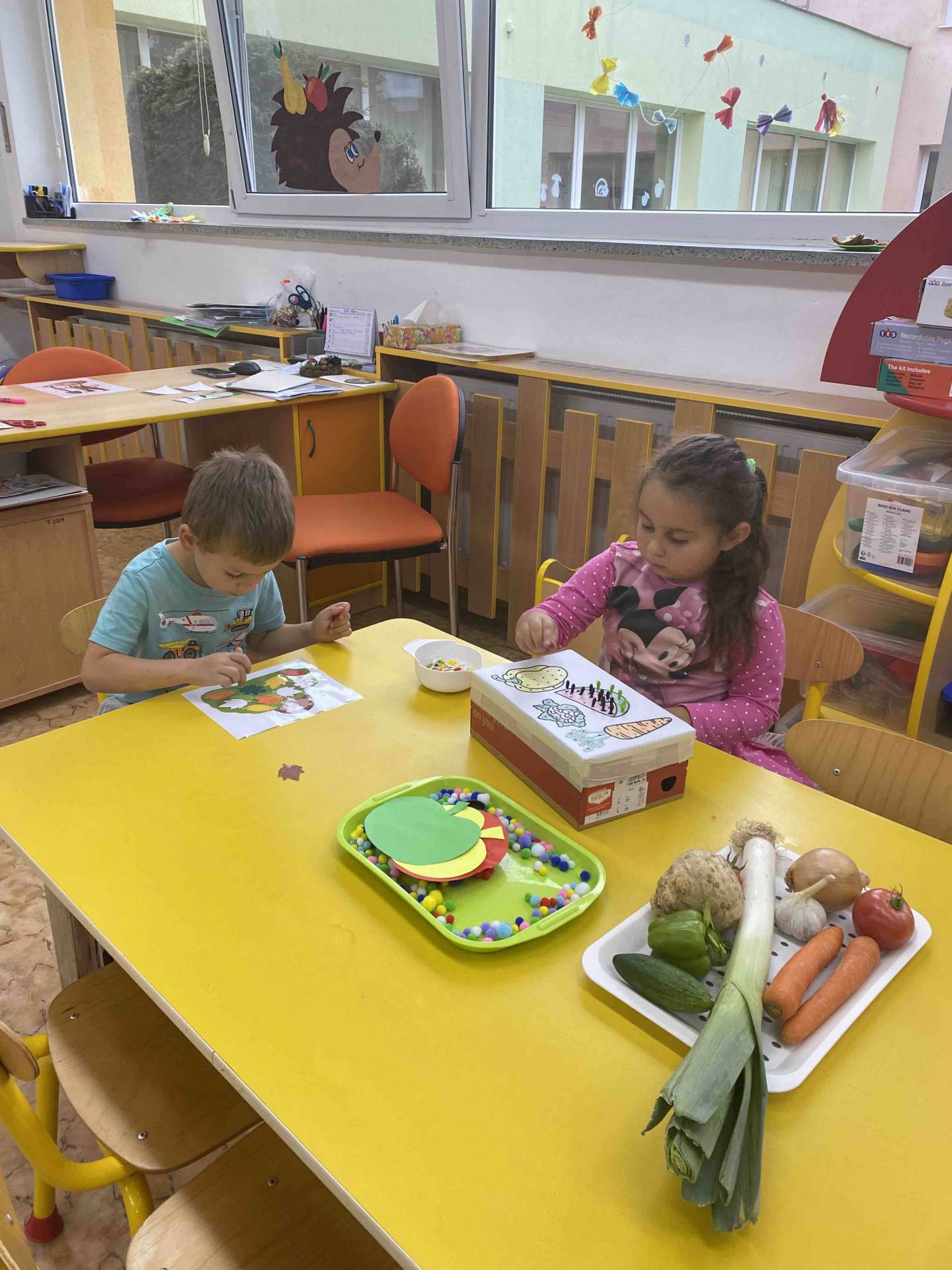 Svět zeleniny jsme s dětmi prozkoumávali opravdu všemismysly. Vytvořili jsme výstavku čerstvé a voňavé zeleniny, kde nechybělynejrůznější druhy – salát, pórek, cibule, česnek, kedluben, celer, ředkvičky,rajčátka, papriky…Povídali jsme si o místě a způsobu pěstování zeleniny, dětipojmenovávaly její druhy, zkoumaly její barvu, tvar a strukturu pomocí lupy. Objevilyspoustu detailů, které pouhým okem snadno přehlédneme … Pomocí metru a kuchyňské váhy zeleninu měřilya vážily, porovnávaly velikost – nejkratší x nejdelší a samozřejmě i hmotnost –nejprve pouze vlastním odhadem, pak přesným vážením na váze, takže si procvičilyi základní matematické dovednosti a jak jinak, než hravou formou. Každý den násdoprovázela veselá písnička „Šel zahradník do zahrady“, kterou si děti s chutízpívaly. Vyzkoušeli jsme si spoustu různých aktivit k tématu zelenina,procvičovali jemnou motoriku, zrakové vnímání, matematické dovednosti, logickémyšlení, barvičky, paměť i kreativitu a fantazii při výrobě zeleninového záhonku. Na závěr týdne jsme sispolečně připravili zeleninový salát z ledového salátu, rajčat a ředkviček.Děti si samy zeleninu nakrájely na malé kousky, následovala veselá ochutnávkase zavázanýma očima – děti se snažily podle vůně, chuti i hmatu poznat, jakouzeleninu právě ochutnávají. Nakonec jsem vše smíchali dohromady a vznikl krásněbarevný a svěží salát, na kterém si děti s radostí pochutnaly. Celýprojekt byl plný zábavy, objevování a radosti z vlastnoruční práce.
