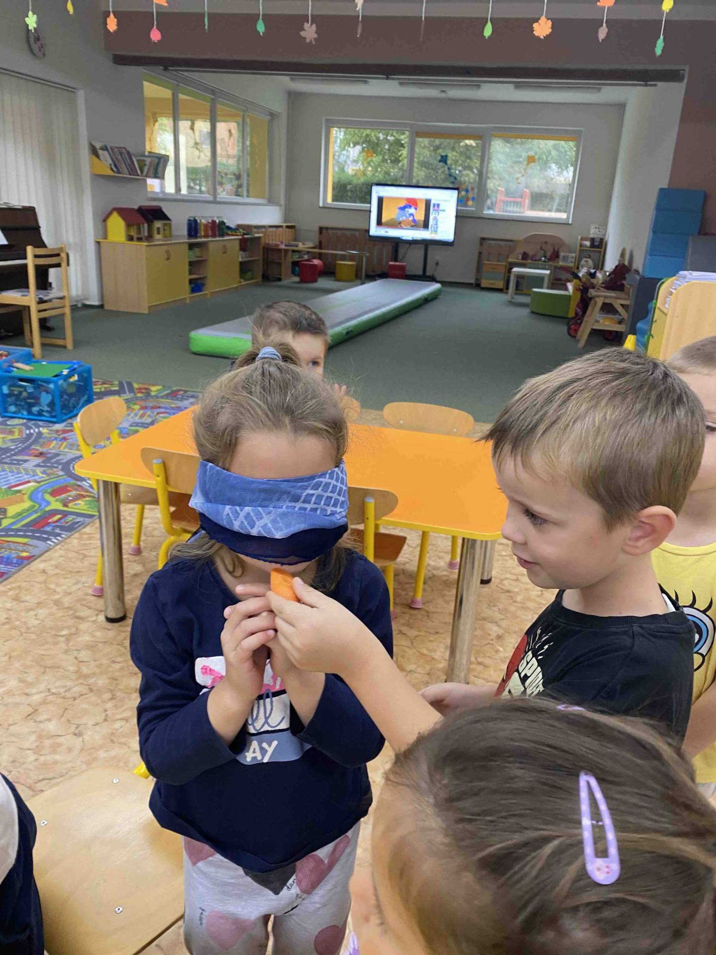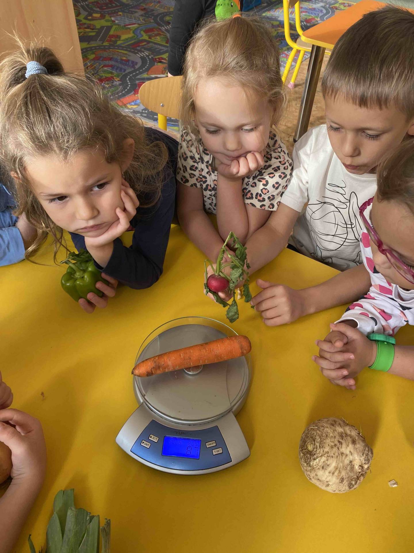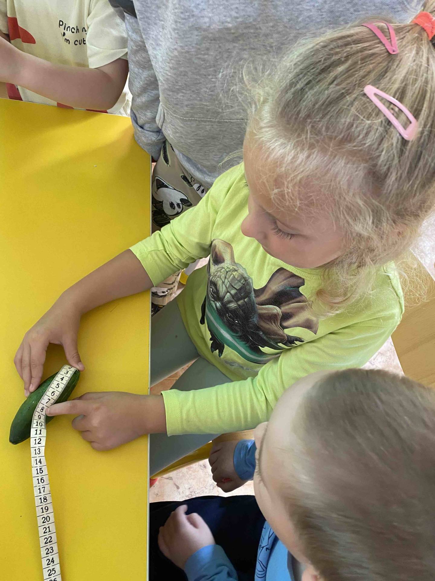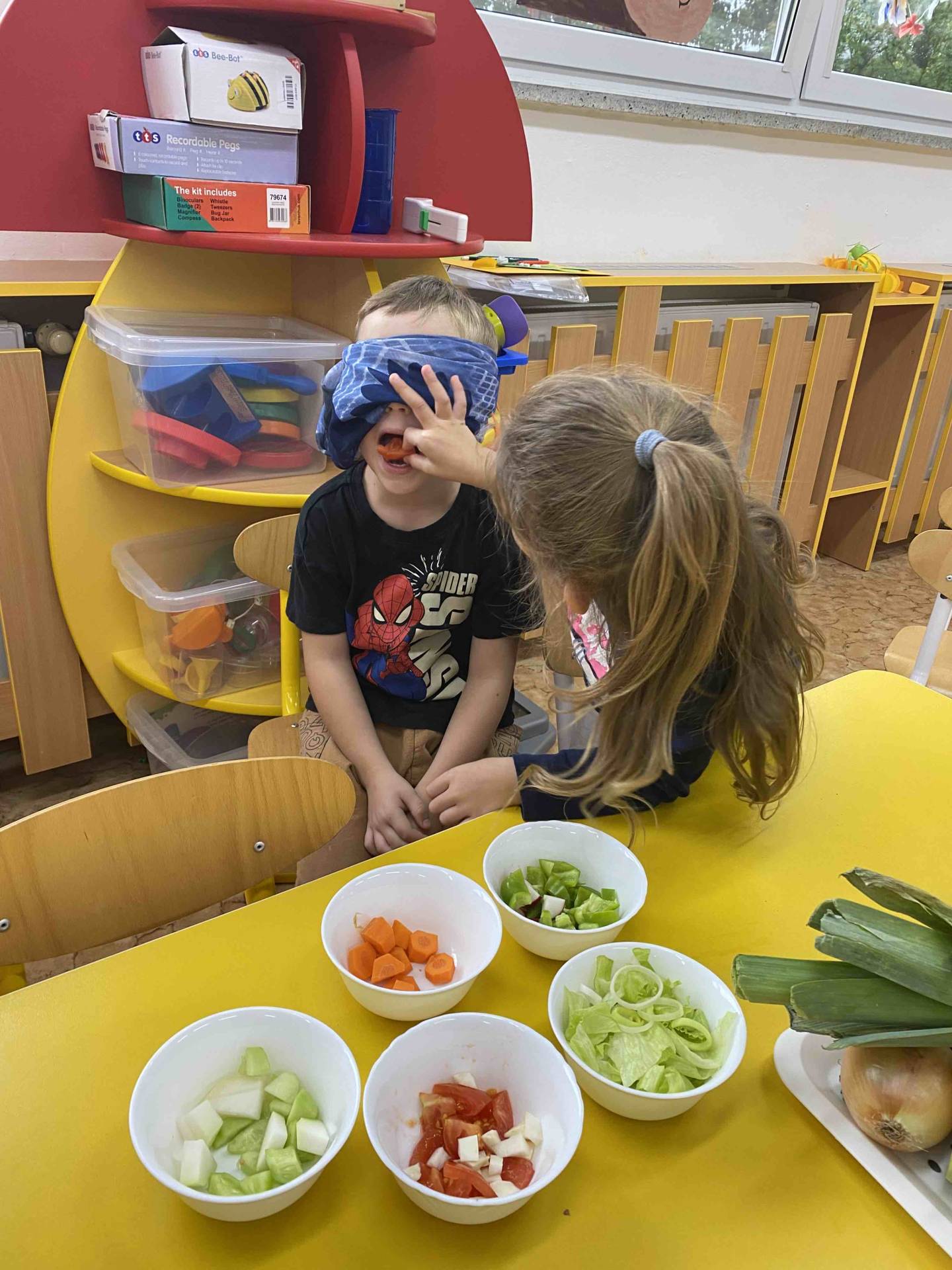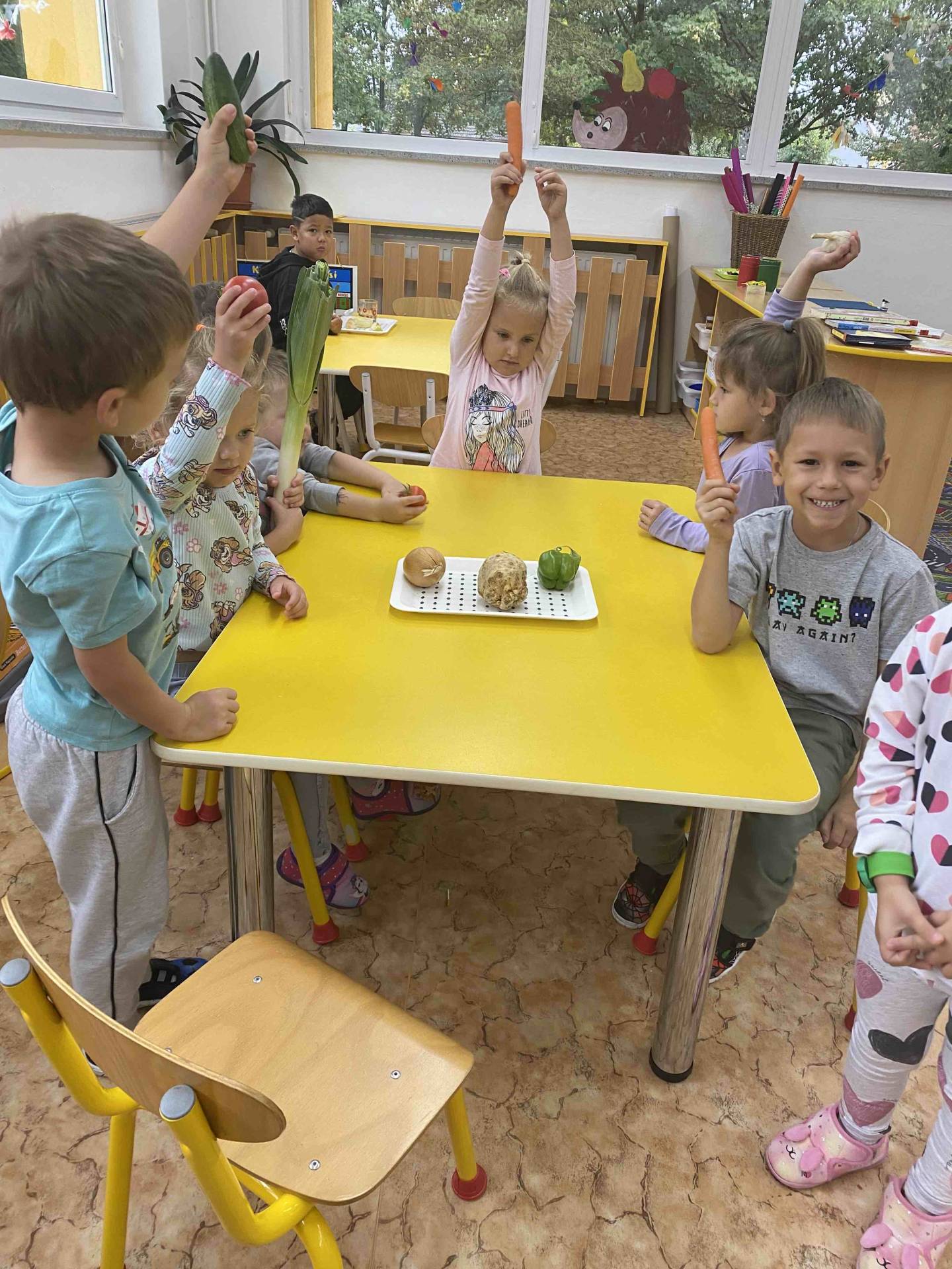 Svět zeleniny jsme s dětmi prozkoumávali opravdu všemismysly. Vytvořili jsme výstavku čerstvé a voňavé zeleniny, kde nechybělynejrůznější druhy – salát, pórek, cibule, česnek, kedluben, celer, ředkvičky,rajčátka, papriky…Povídali jsme si o místě a způsobu pěstování zeleniny, dětipojmenovávaly její druhy, zkoumaly její barvu, tvar a strukturu pomocí lupy. Objevilyspoustu detailů, které pouhým okem snadno přehlédneme … Pomocí metru a kuchyňské váhy zeleninu měřilya vážily, porovnávaly velikost – nejkratší x nejdelší a samozřejmě i hmotnost –nejprve pouze vlastním odhadem, pak přesným vážením na váze, takže si procvičilyi základní matematické dovednosti a jak jinak, než hravou formou. Každý den násdoprovázela veselá písnička „Šel zahradník do zahrady“, kterou si děti s chutízpívaly. Vyzkoušeli jsme si spoustu různých aktivit k tématu zelenina,procvičovali jemnou motoriku, zrakové vnímání, matematické dovednosti, logickémyšlení, barvičky, paměť i kreativitu a fantazii při výrobě zeleninového záhonku. Na závěr týdne jsme sispolečně připravili zeleninový salát z ledového salátu, rajčat a ředkviček.Děti si samy zeleninu nakrájely na malé kousky, následovala veselá ochutnávkase zavázanýma očima – děti se snažily podle vůně, chuti i hmatu poznat, jakouzeleninu právě ochutnávají. Nakonec jsem vše smíchali dohromady a vznikl krásněbarevný a svěží salát, na kterém si děti s radostí pochutnaly. Celýprojekt byl plný zábavy, objevování a radosti z vlastnoruční práce.