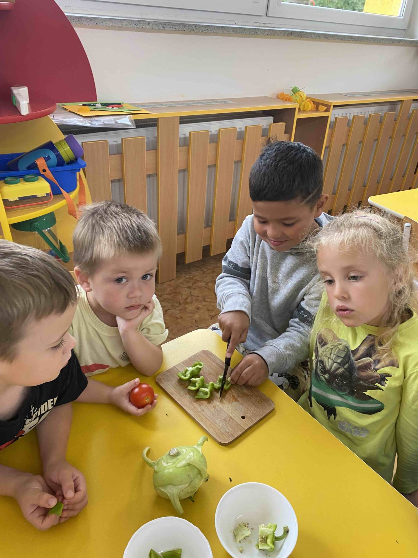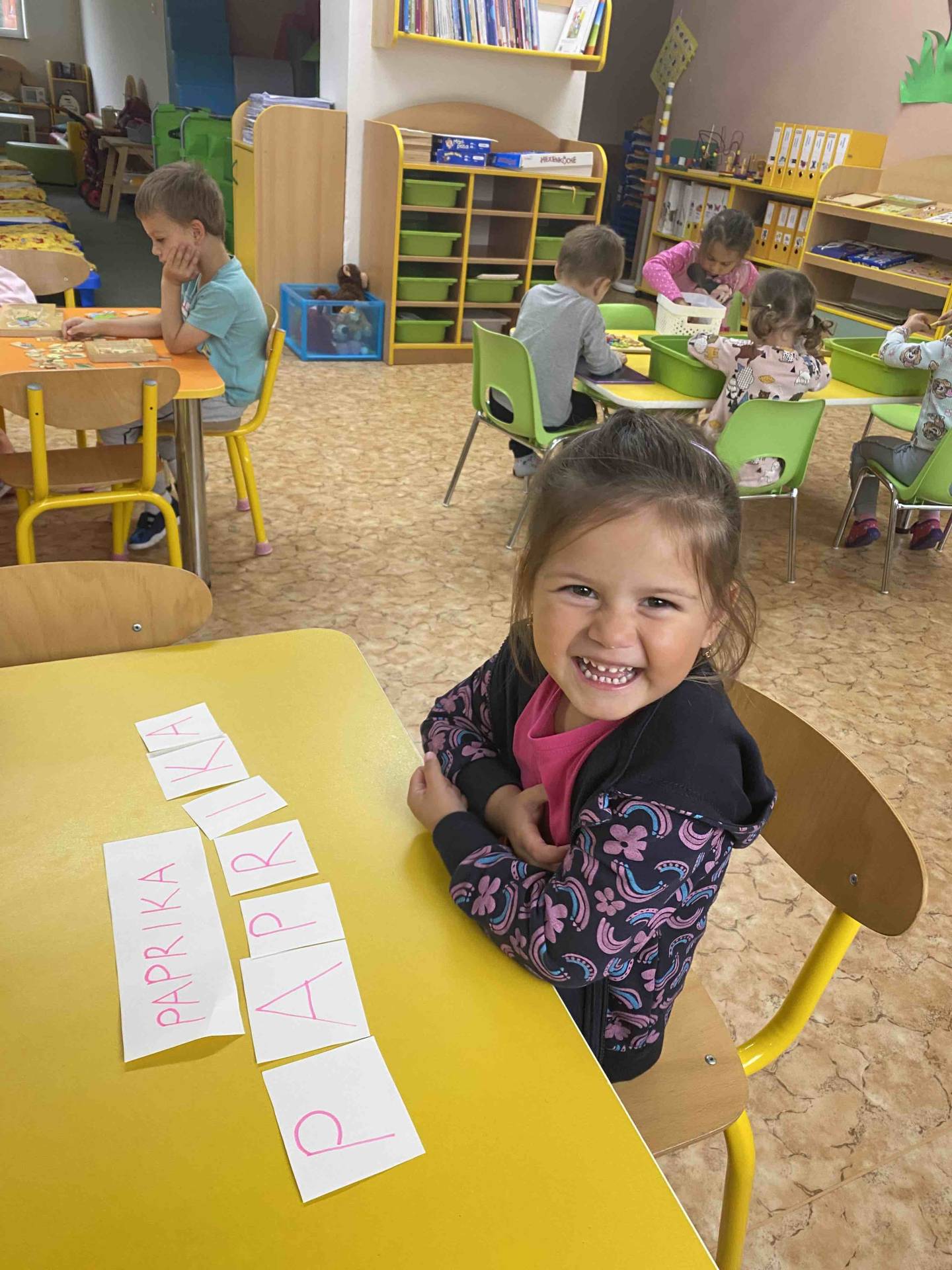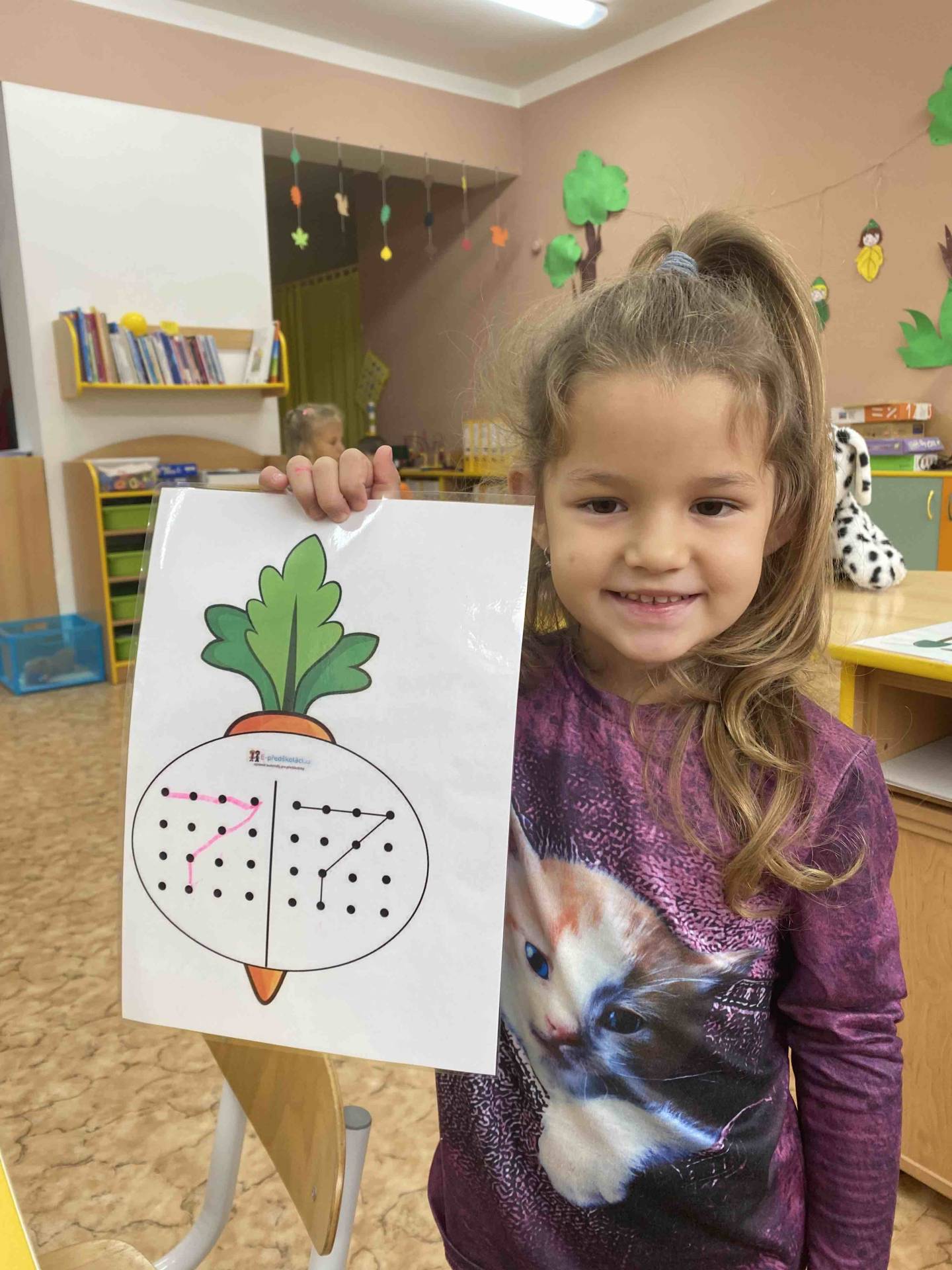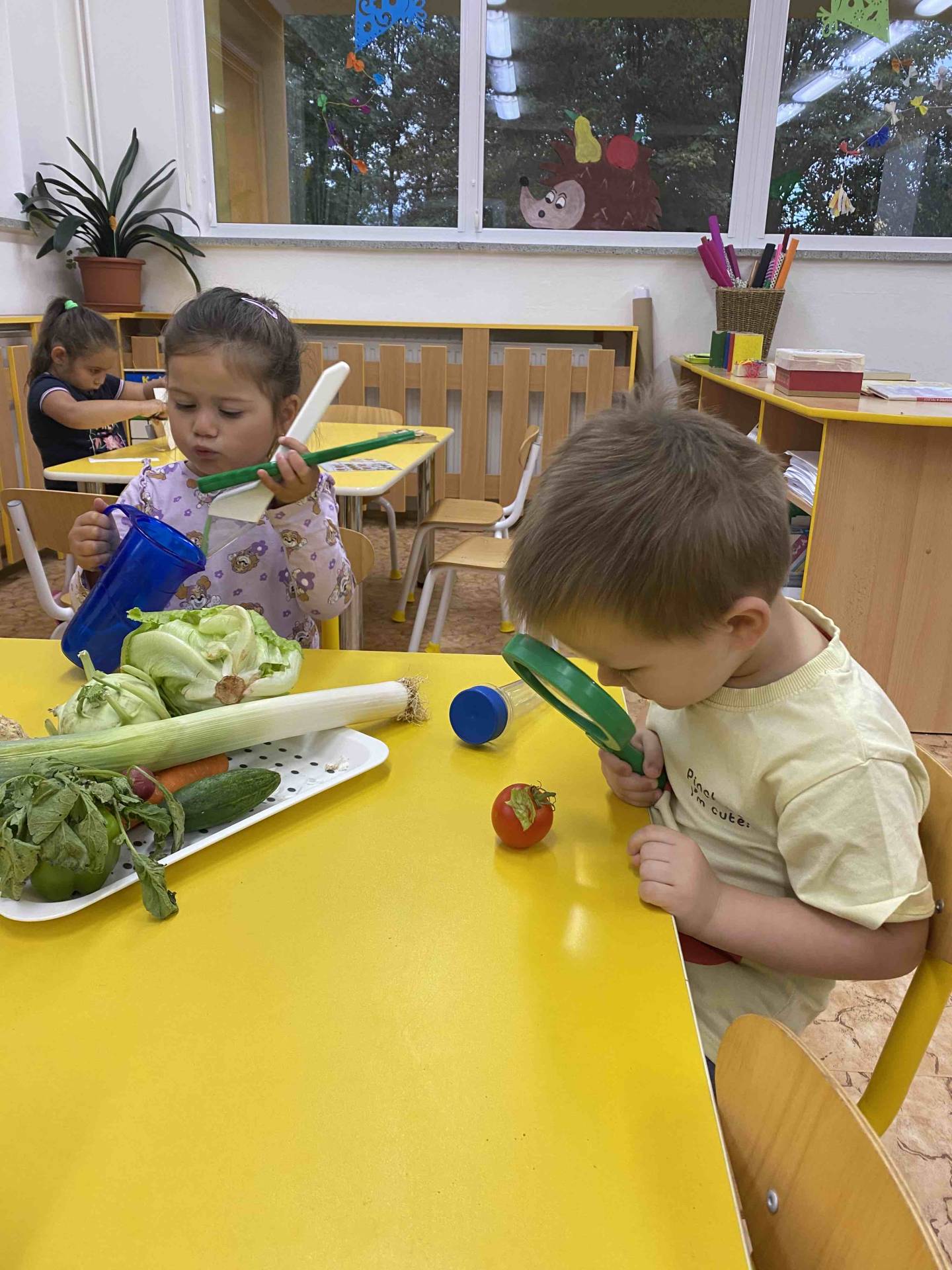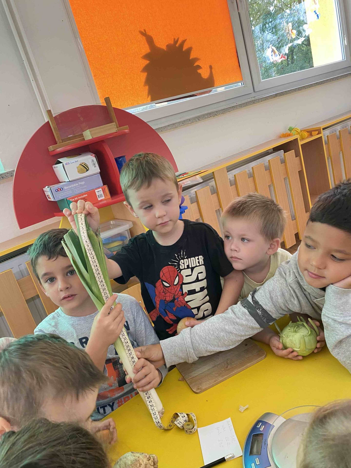 Svět zeleniny jsme s dětmi prozkoumávali opravdu všemismysly. Vytvořili jsme výstavku čerstvé a voňavé zeleniny, kde nechybělynejrůznější druhy – salát, pórek, cibule, česnek, kedluben, celer, ředkvičky,rajčátka, papriky…Povídali jsme si o místě a způsobu pěstování zeleniny, dětipojmenovávaly její druhy, zkoumaly její barvu, tvar a strukturu pomocí lupy. Objevilyspoustu detailů, které pouhým okem snadno přehlédneme … Pomocí metru a kuchyňské váhy zeleninu měřilya vážily, porovnávaly velikost – nejkratší x nejdelší a samozřejmě i hmotnost –nejprve pouze vlastním odhadem, pak přesným vážením na váze, takže si procvičilyi základní matematické dovednosti a jak jinak, než hravou formou. Každý den násdoprovázela veselá písnička „Šel zahradník do zahrady“, kterou si děti s chutízpívaly. Vyzkoušeli jsme si spoustu různých aktivit k tématu zelenina,procvičovali jemnou motoriku, zrakové vnímání, matematické dovednosti, logickémyšlení, barvičky, paměť i kreativitu a fantazii při výrobě zeleninového záhonku. Na závěr týdne jsme sispolečně připravili zeleninový salát z ledového salátu, rajčat a ředkviček.Děti si samy zeleninu nakrájely na malé kousky, následovala veselá ochutnávkase zavázanýma očima – děti se snažily podle vůně, chuti i hmatu poznat, jakouzeleninu právě ochutnávají. Nakonec jsem vše smíchali dohromady a vznikl krásněbarevný a svěží salát, na kterém si děti s radostí pochutnaly. Celýprojekt byl plný zábavy, objevování a radosti z vlastnoruční práce.