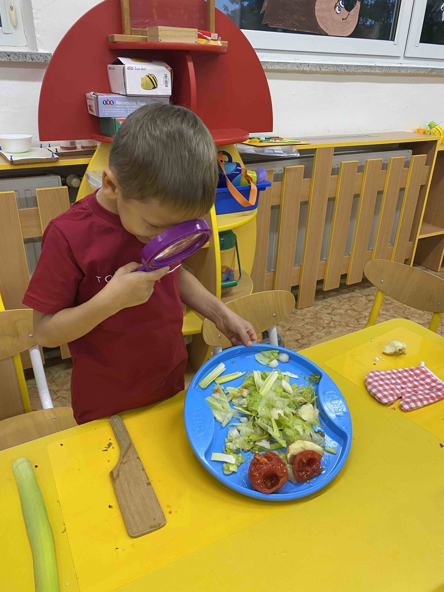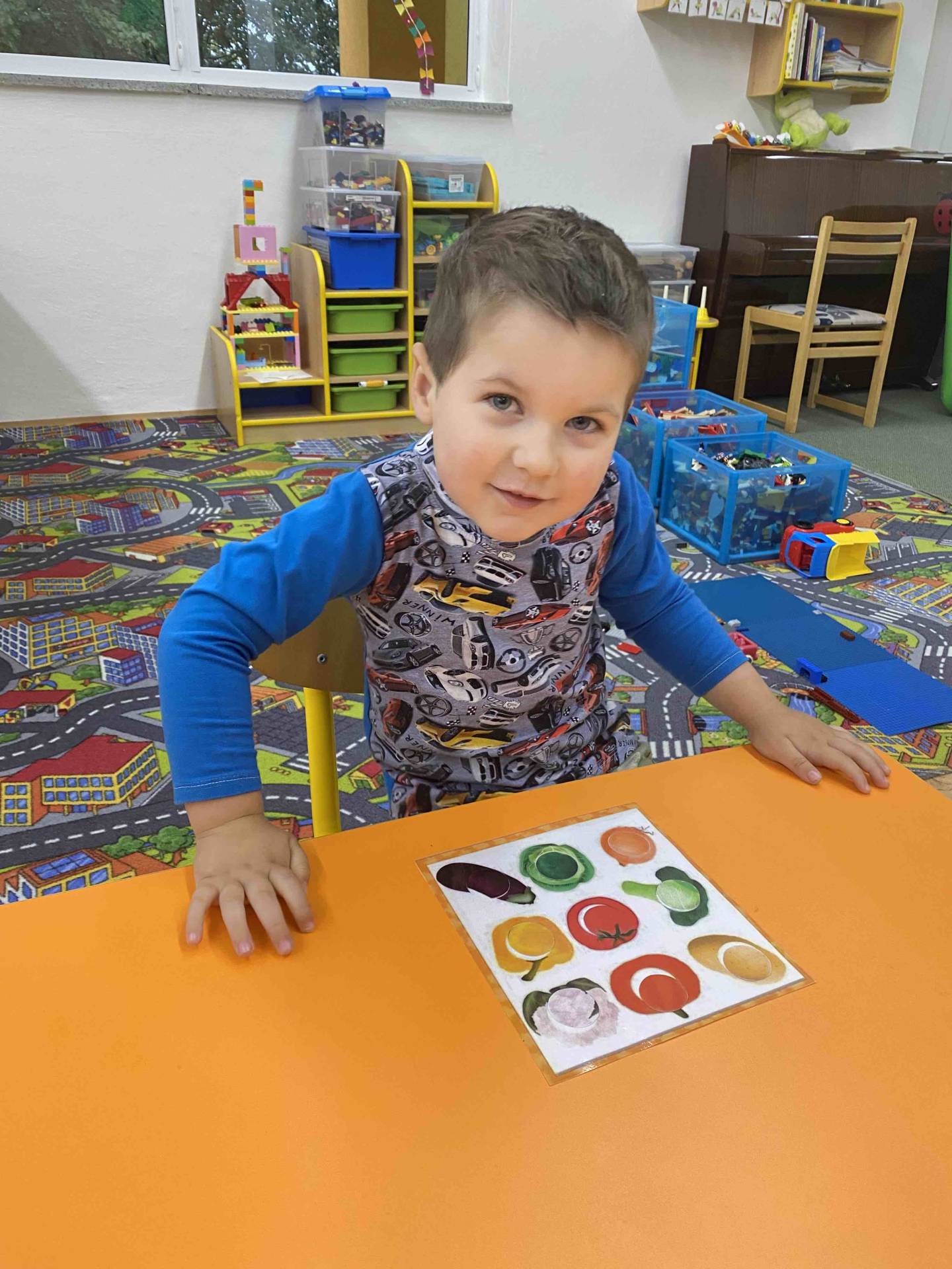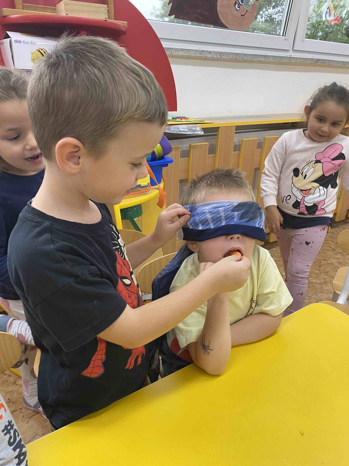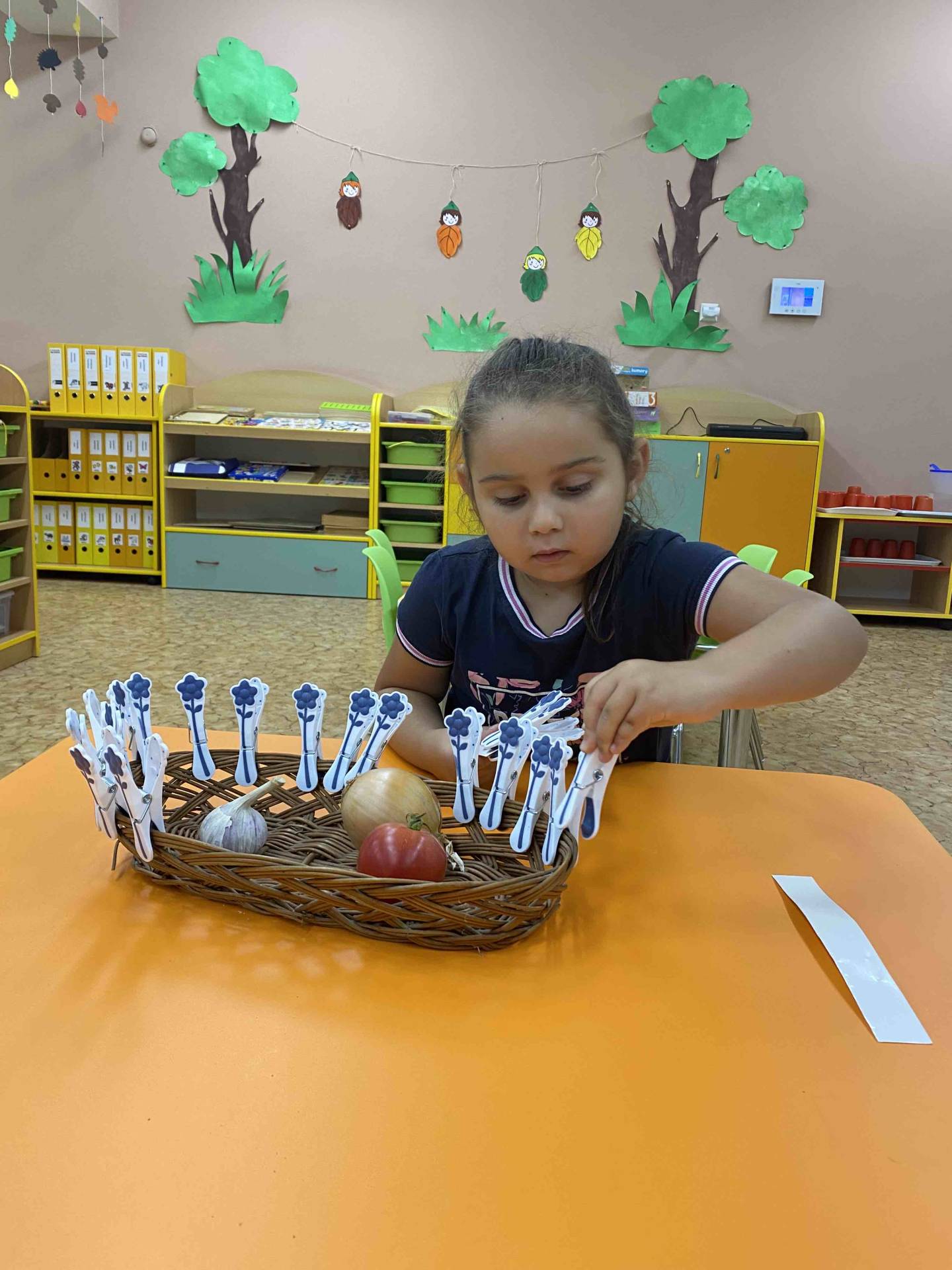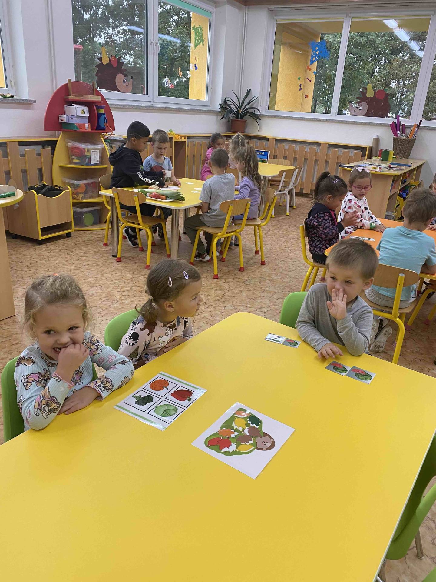 Svět zeleniny jsme s dětmi prozkoumávali opravdu všemismysly. Vytvořili jsme výstavku čerstvé a voňavé zeleniny, kde nechybělynejrůznější druhy – salát, pórek, cibule, česnek, kedluben, celer, ředkvičky,rajčátka, papriky…Povídali jsme si o místě a způsobu pěstování zeleniny, dětipojmenovávaly její druhy, zkoumaly její barvu, tvar a strukturu pomocí lupy. Objevilyspoustu detailů, které pouhým okem snadno přehlédneme … Pomocí metru a kuchyňské váhy zeleninu měřilya vážily, porovnávaly velikost – nejkratší x nejdelší a samozřejmě i hmotnost –nejprve pouze vlastním odhadem, pak přesným vážením na váze, takže si procvičilyi základní matematické dovednosti a jak jinak, než hravou formou. Každý den násdoprovázela veselá písnička „Šel zahradník do zahrady“, kterou si děti s chutízpívaly. Vyzkoušeli jsme si spoustu různých aktivit k tématu zelenina,procvičovali jemnou motoriku, zrakové vnímání, matematické dovednosti, logickémyšlení, barvičky, paměť i kreativitu a fantazii při výrobě zeleninového záhonku. Na závěr týdne jsme sispolečně připravili zeleninový salát z ledového salátu, rajčat a ředkviček.Děti si samy zeleninu nakrájely na malé kousky, následovala veselá ochutnávkase zavázanýma očima – děti se snažily podle vůně, chuti i hmatu poznat, jakouzeleninu právě ochutnávají. Nakonec jsem vše smíchali dohromady a vznikl krásněbarevný a svěží salát, na kterém si děti s radostí pochutnaly. Celýprojekt byl plný zábavy, objevování a radosti z vlastnoruční práce.