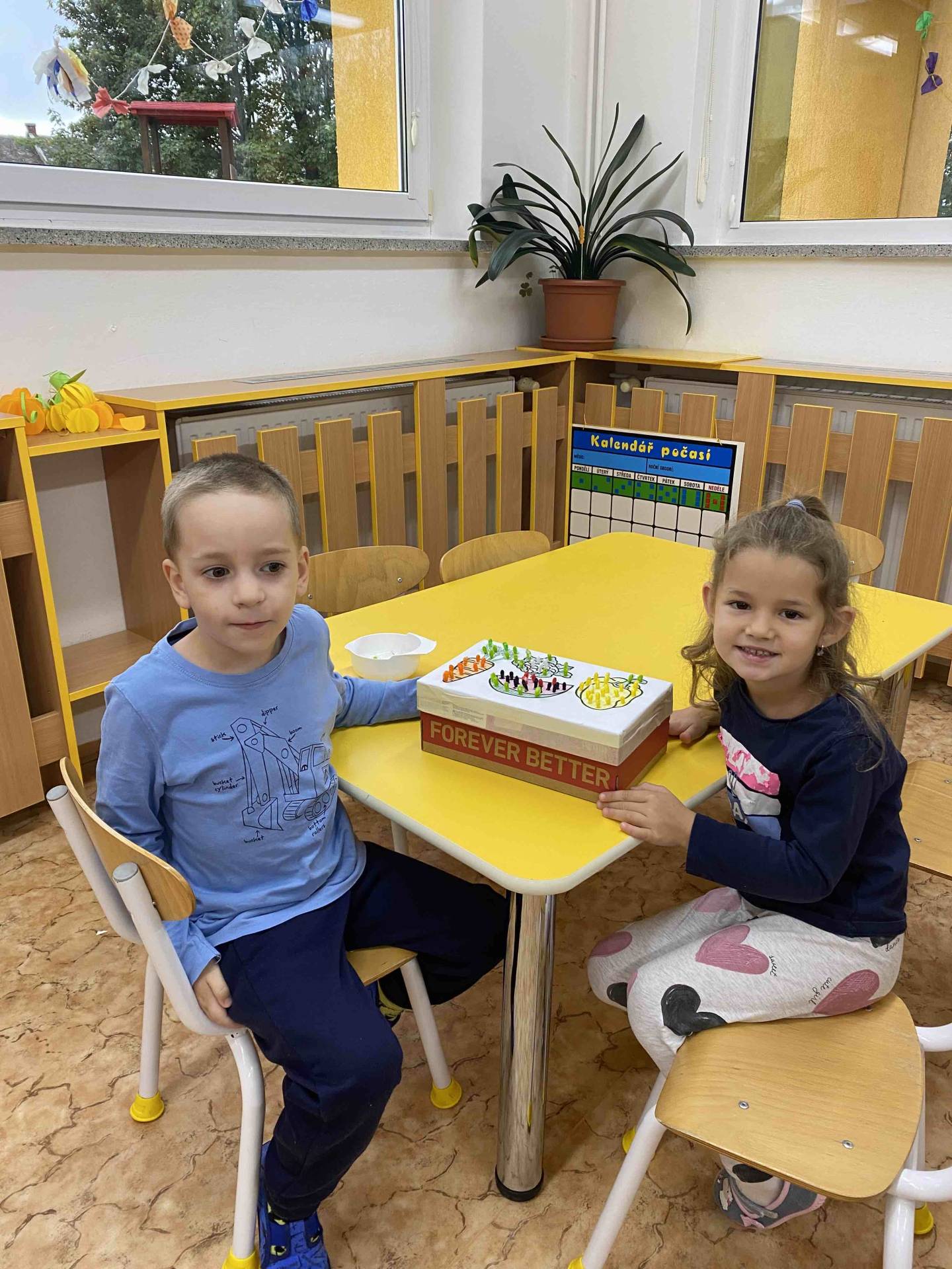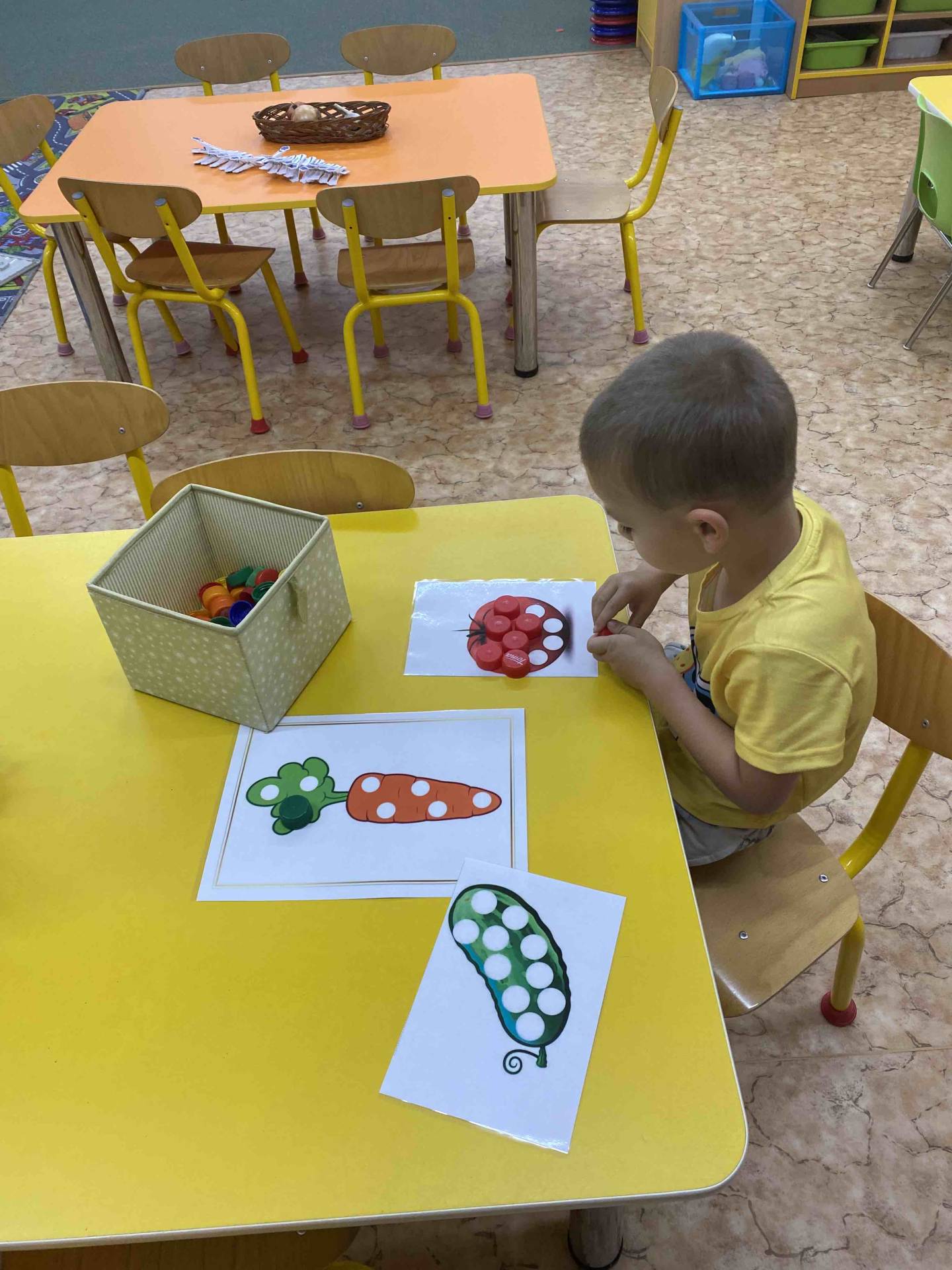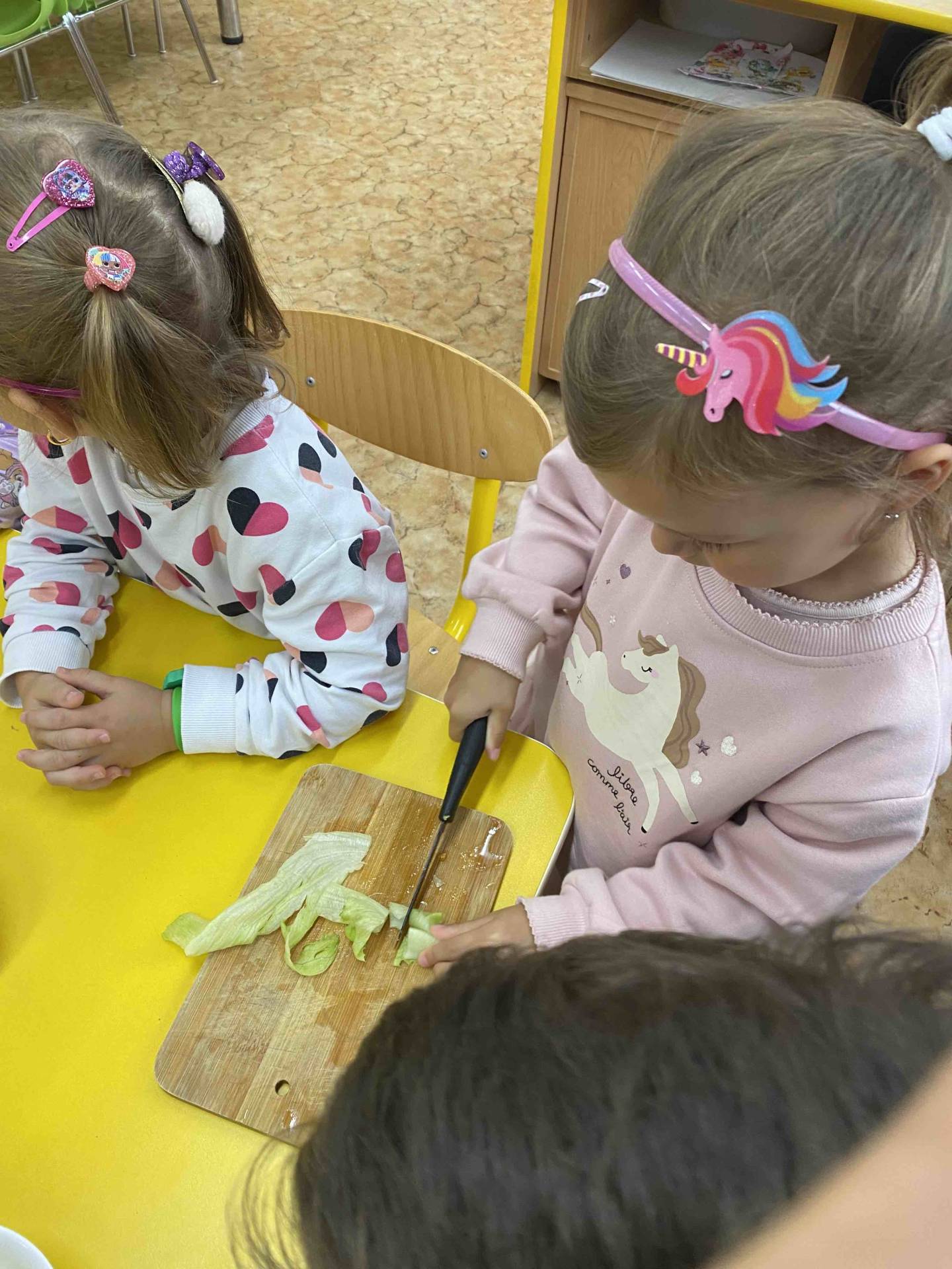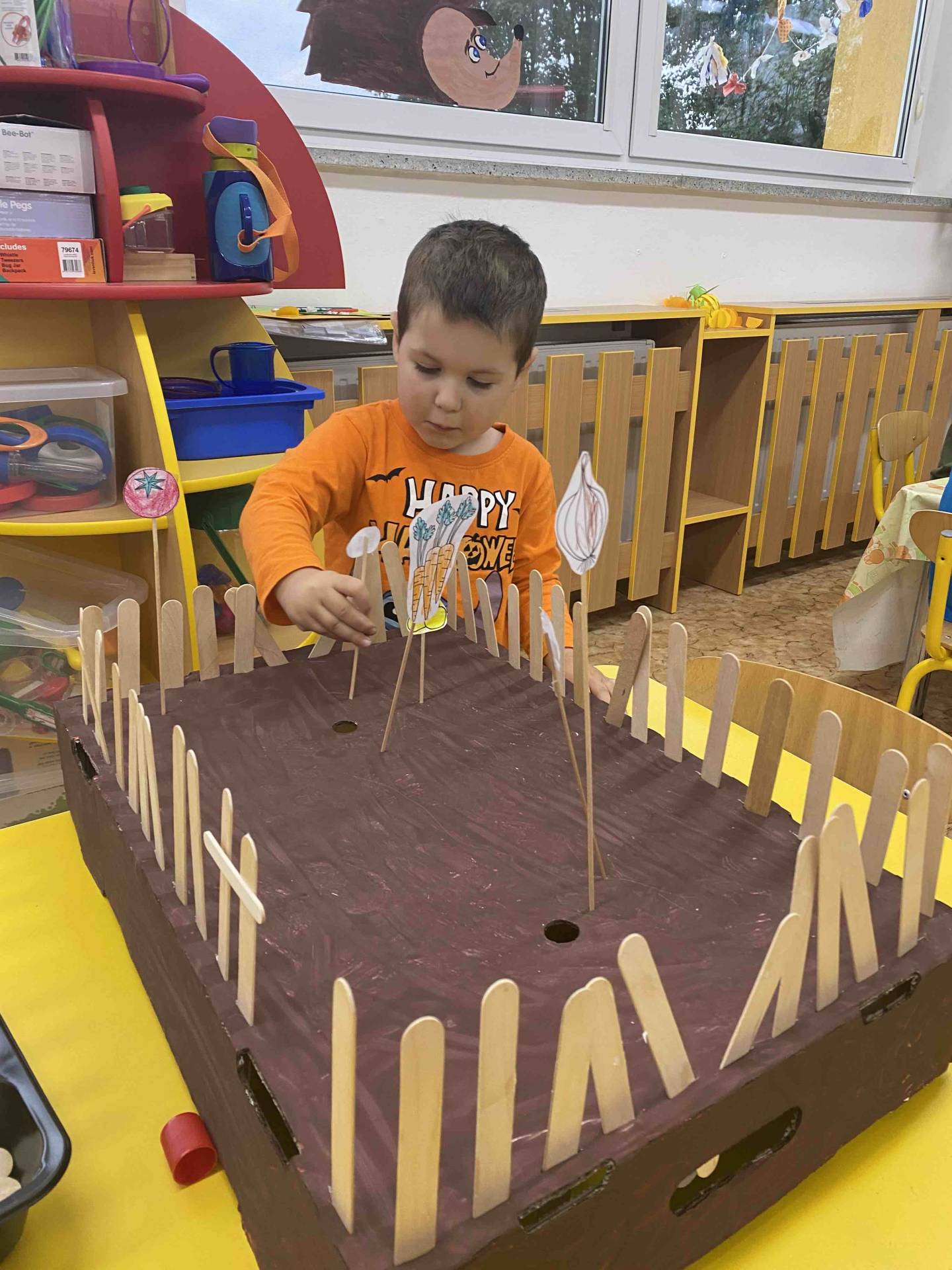 Svět zeleniny jsme s dětmi prozkoumávali opravdu všemismysly. Vytvořili jsme výstavku čerstvé a voňavé zeleniny, kde nechybělynejrůznější druhy – salát, pórek, cibule, česnek, kedluben, celer, ředkvičky,rajčátka, papriky…Povídali jsme si o místě a způsobu pěstování zeleniny, dětipojmenovávaly její druhy, zkoumaly její barvu, tvar a strukturu pomocí lupy. Objevilyspoustu detailů, které pouhým okem snadno přehlédneme … Pomocí metru a kuchyňské váhy zeleninu měřilya vážily, porovnávaly velikost – nejkratší x nejdelší a samozřejmě i hmotnost –nejprve pouze vlastním odhadem, pak přesným vážením na váze, takže si procvičilyi základní matematické dovednosti a jak jinak, než hravou formou. Každý den násdoprovázela veselá písnička „Šel zahradník do zahrady“, kterou si děti s chutízpívaly. Vyzkoušeli jsme si spoustu různých aktivit k tématu zelenina,procvičovali jemnou motoriku, zrakové vnímání, matematické dovednosti, logickémyšlení, barvičky, paměť i kreativitu a fantazii při výrobě zeleninového záhonku. Na závěr týdne jsme sispolečně připravili zeleninový salát z ledového salátu, rajčat a ředkviček.Děti si samy zeleninu nakrájely na malé kousky, následovala veselá ochutnávkase zavázanýma očima – děti se snažily podle vůně, chuti i hmatu poznat, jakouzeleninu právě ochutnávají. Nakonec jsem vše smíchali dohromady a vznikl krásněbarevný a svěží salát, na kterém si děti s radostí pochutnaly. Celýprojekt byl plný zábavy, objevování a radosti z vlastnoruční práce.