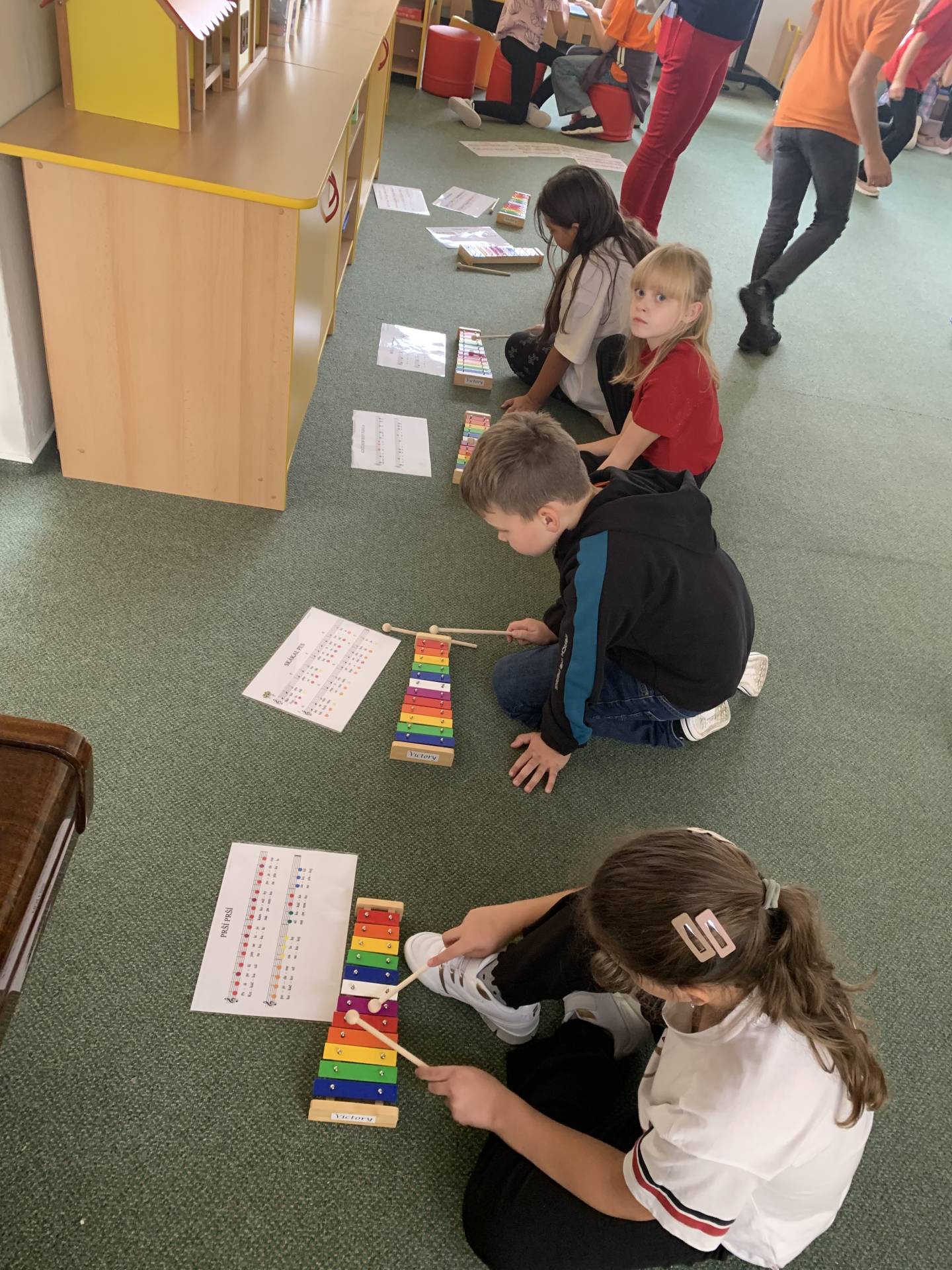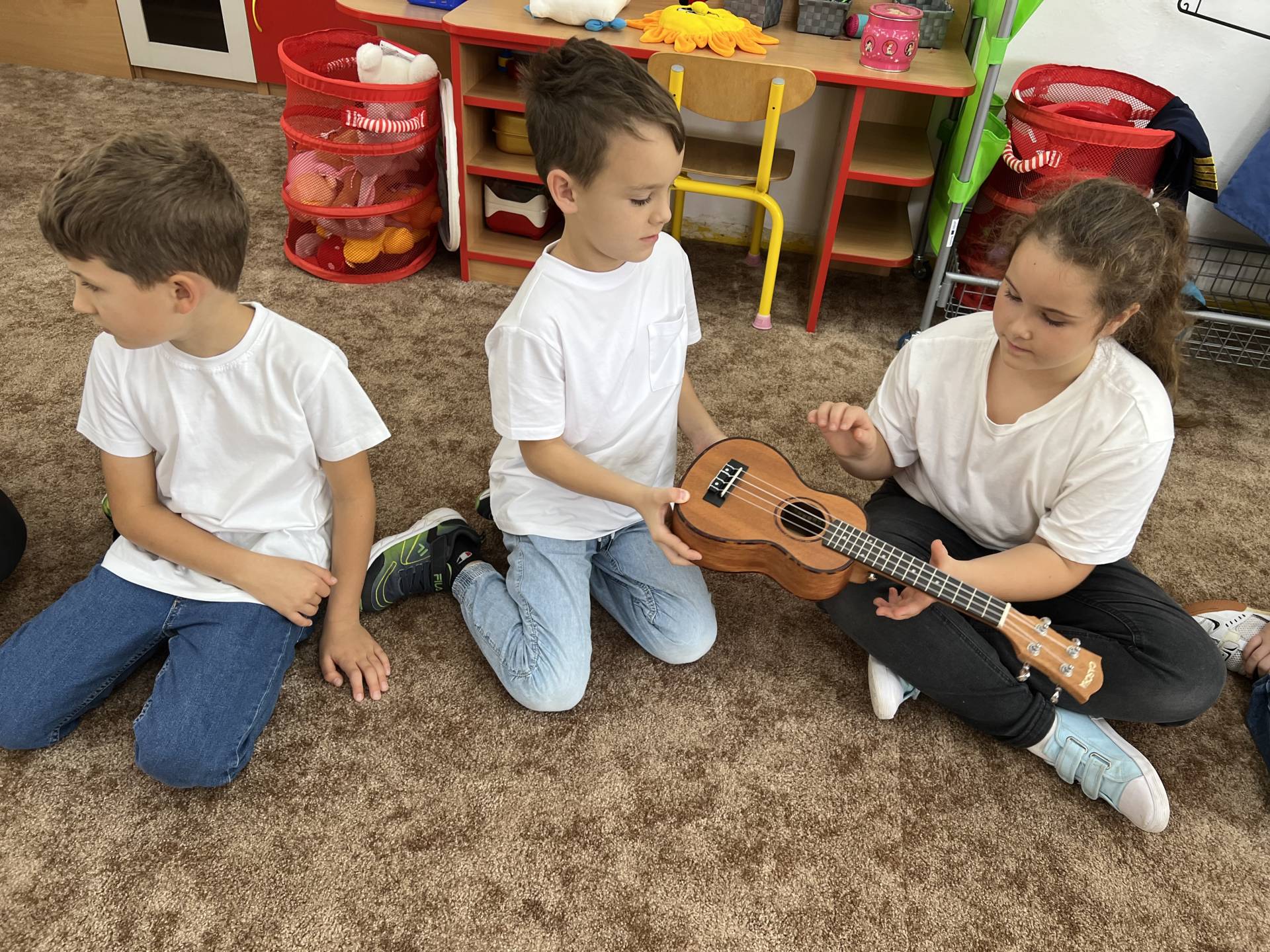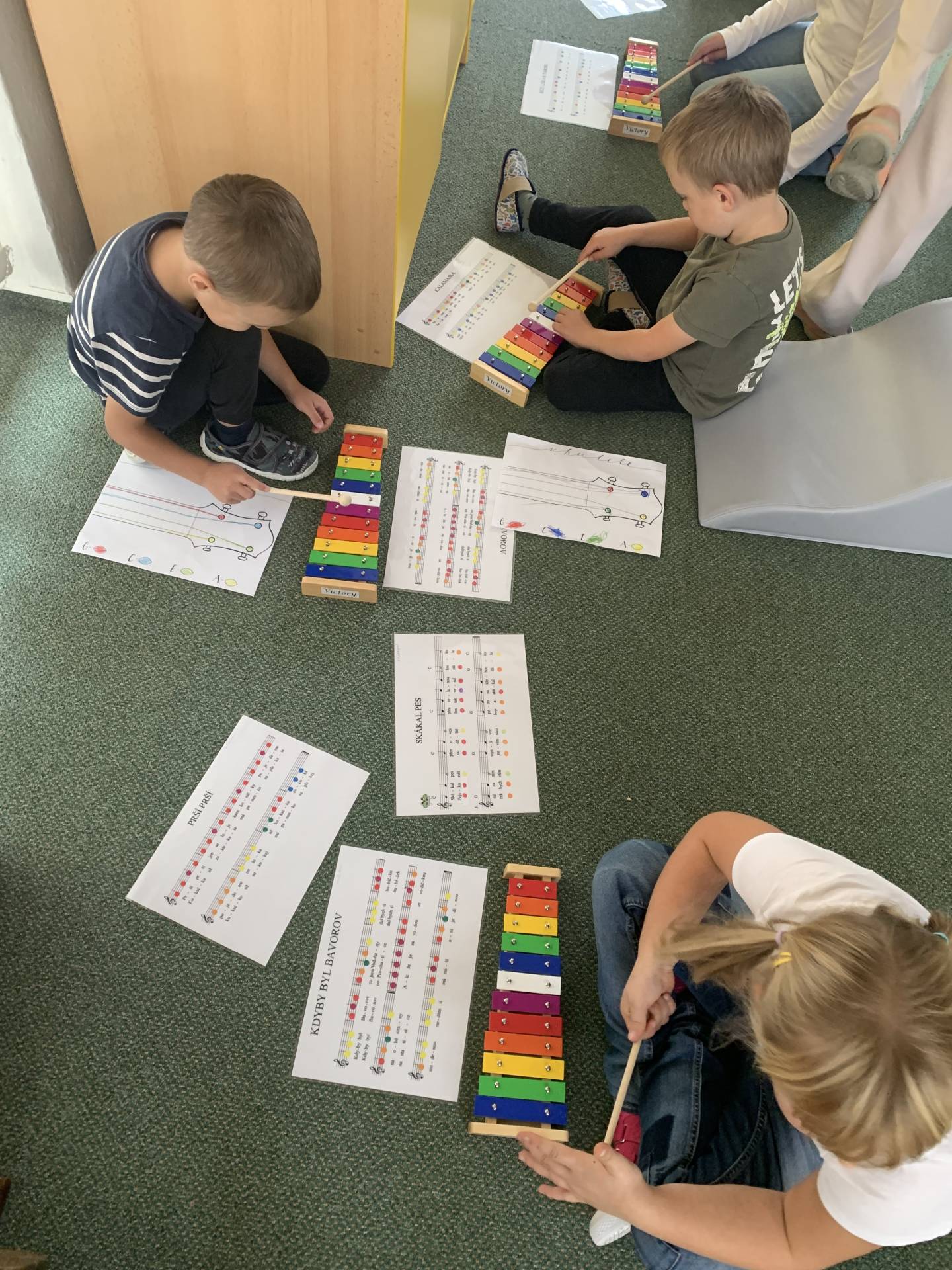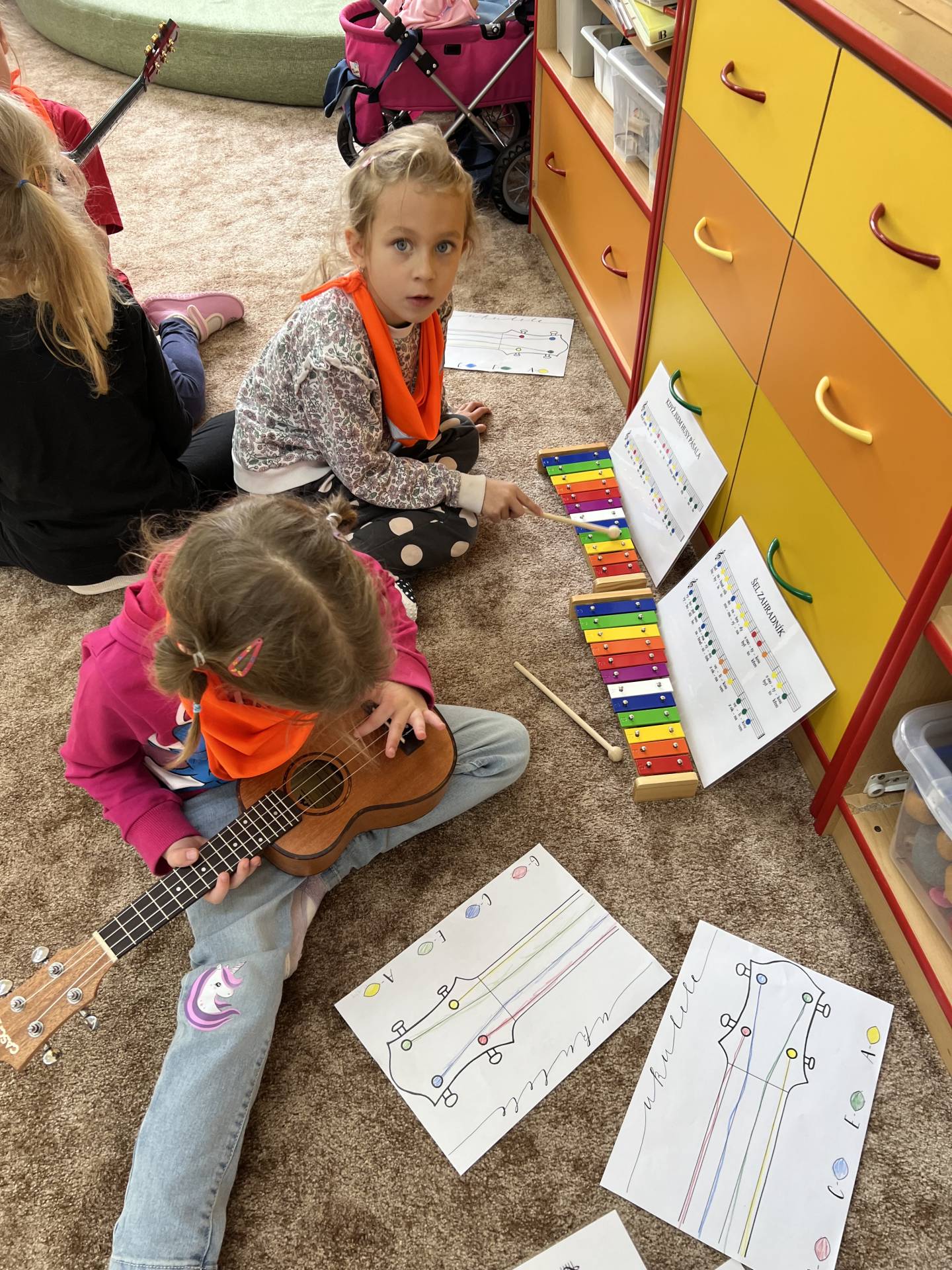 Následně proběhly hudební workshopy, během nichž měly děti možnost seznámit se s hrou na boomwhackers, xylofony, barevné zvonky a ukulele.