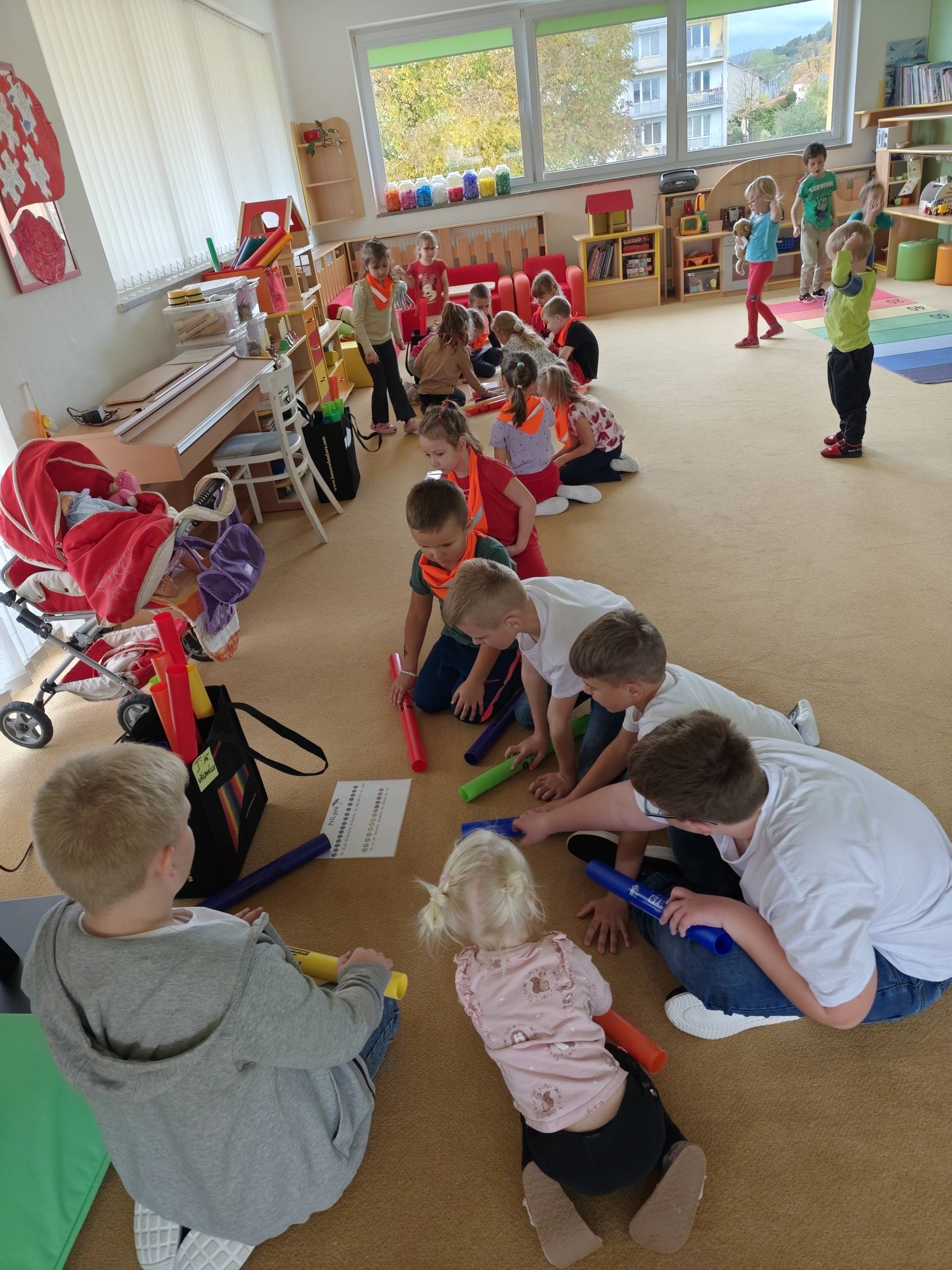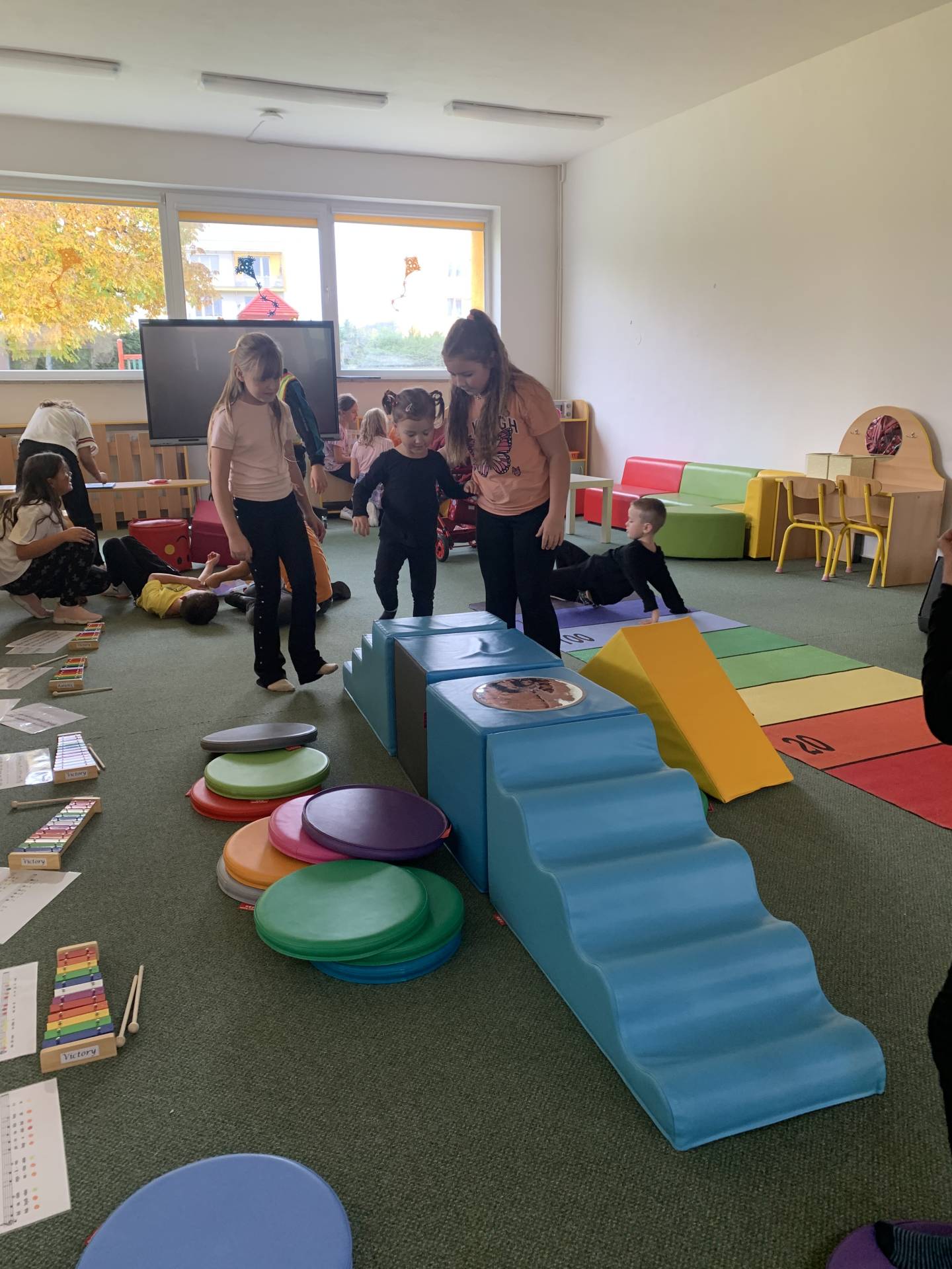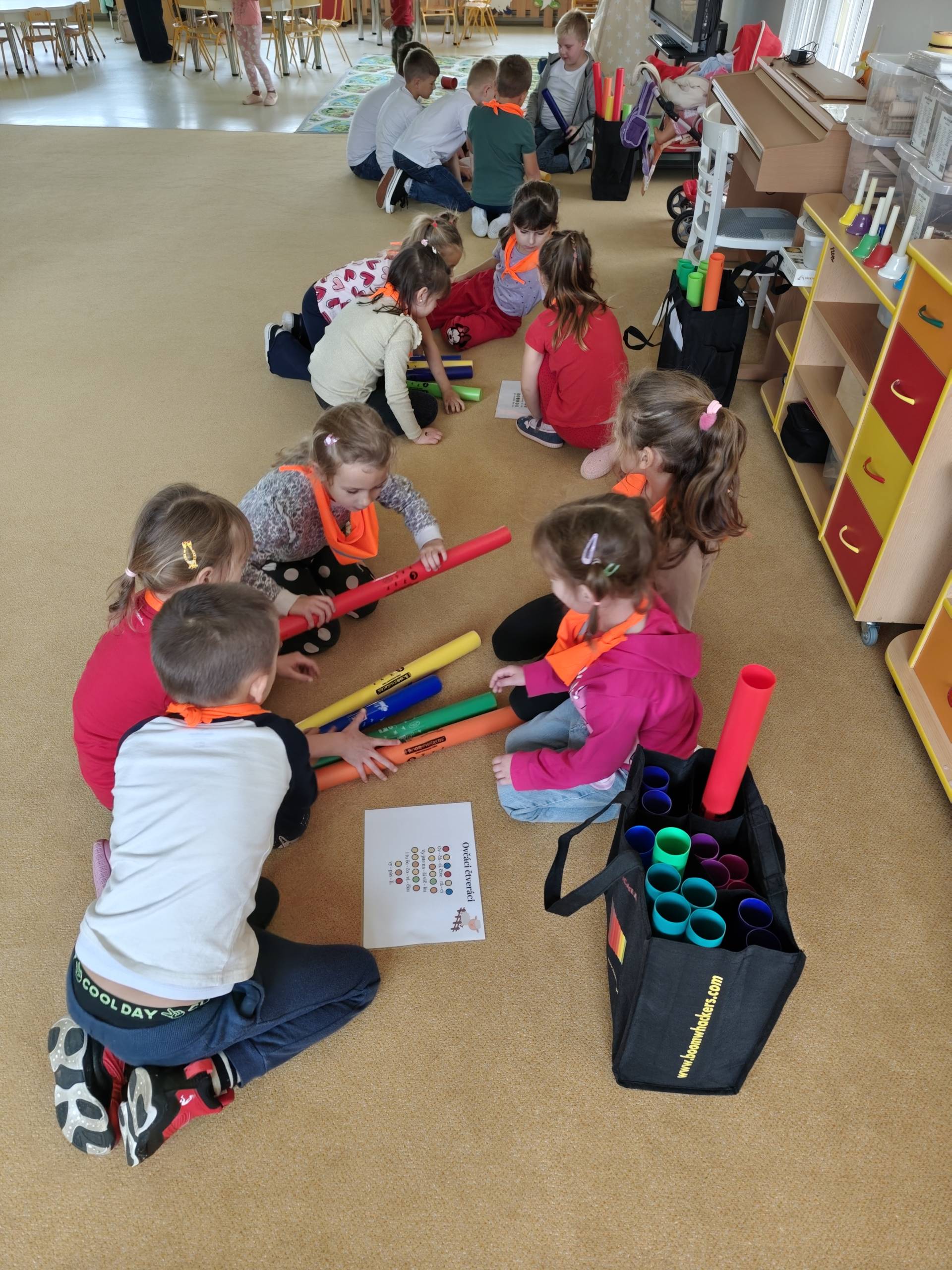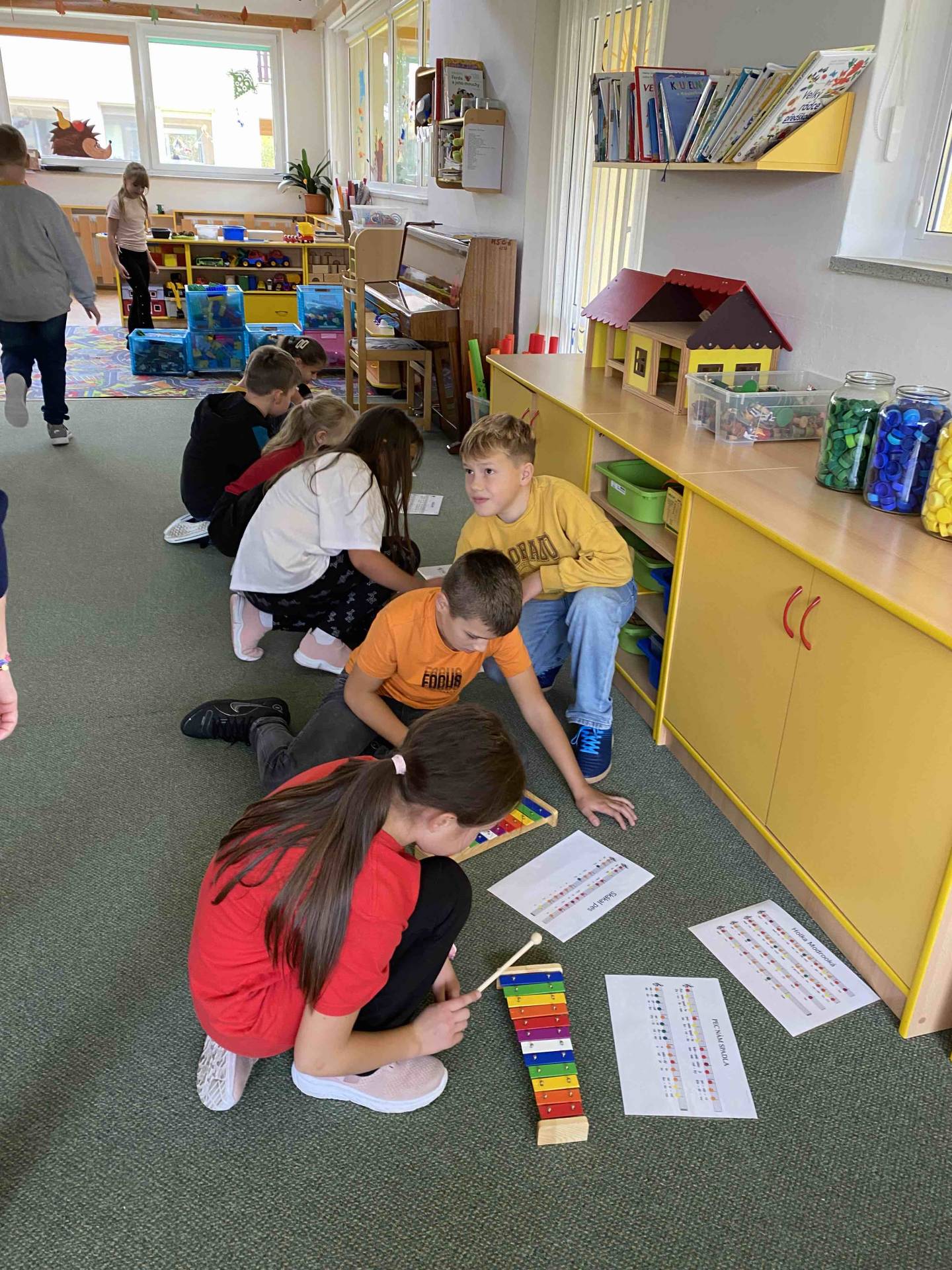 Následně proběhly hudební workshopy, během nichž měly děti možnost seznámit se s hrou na boomwhackers, xylofony, barevné zvonky a ukulele.