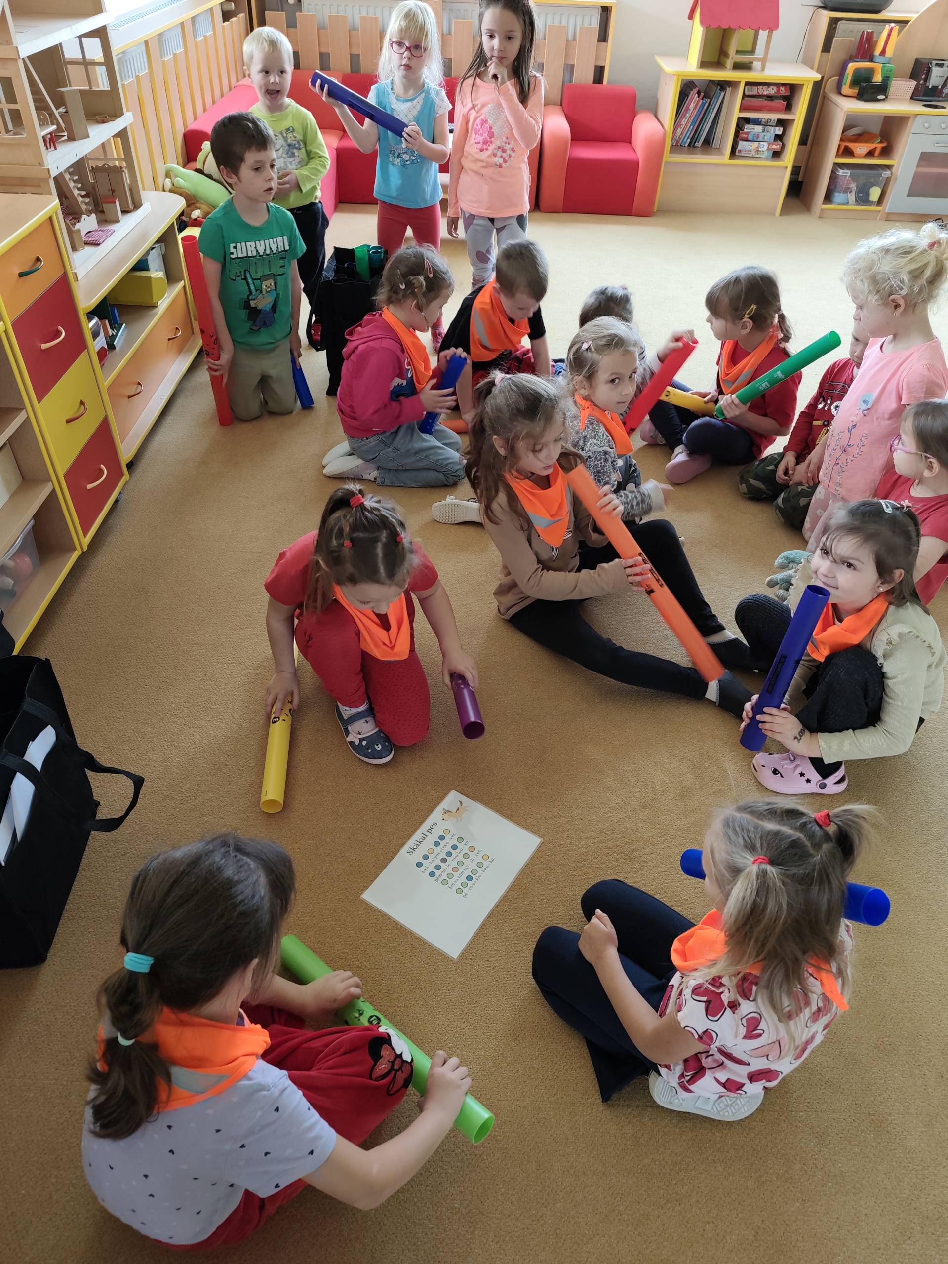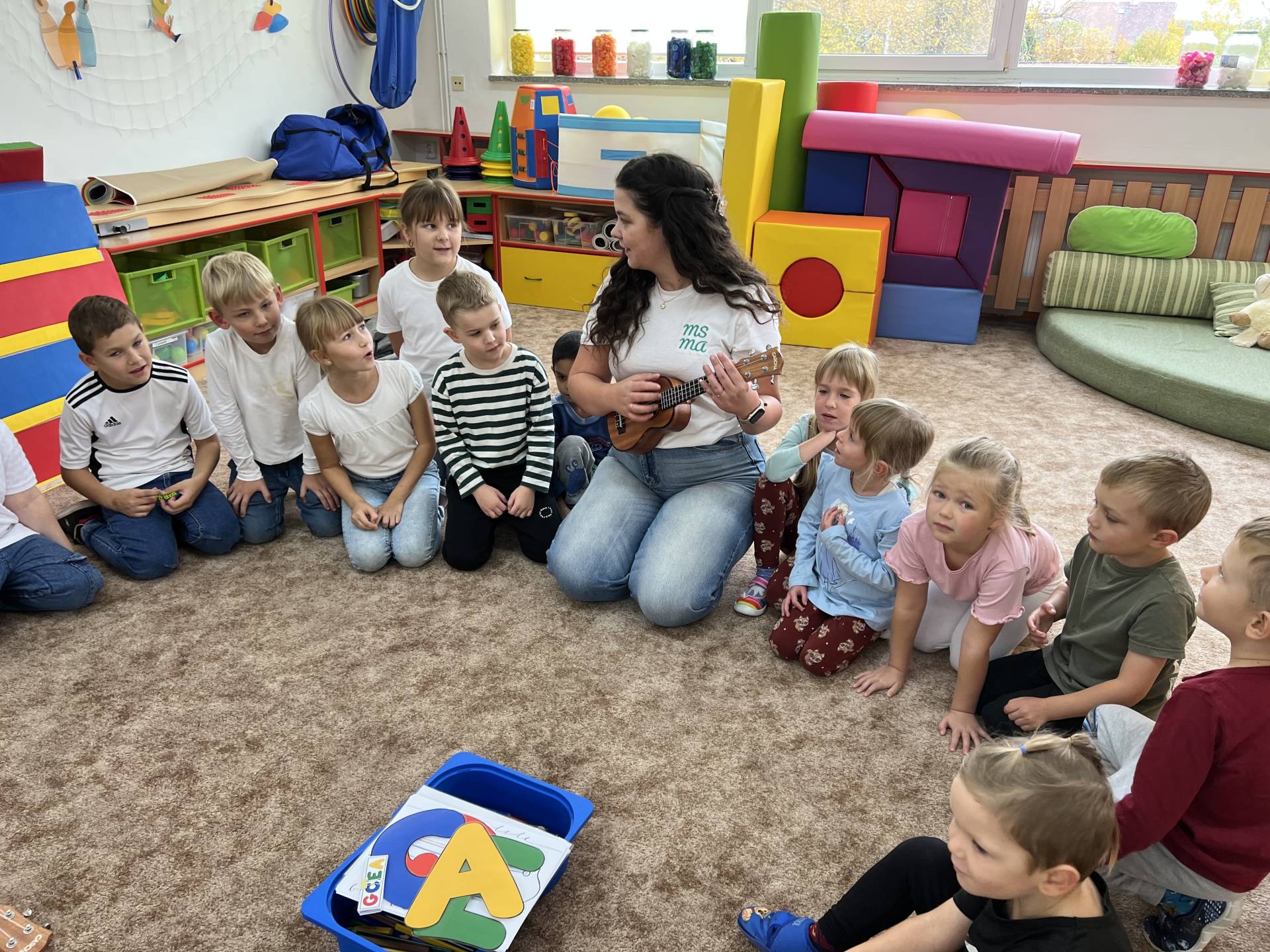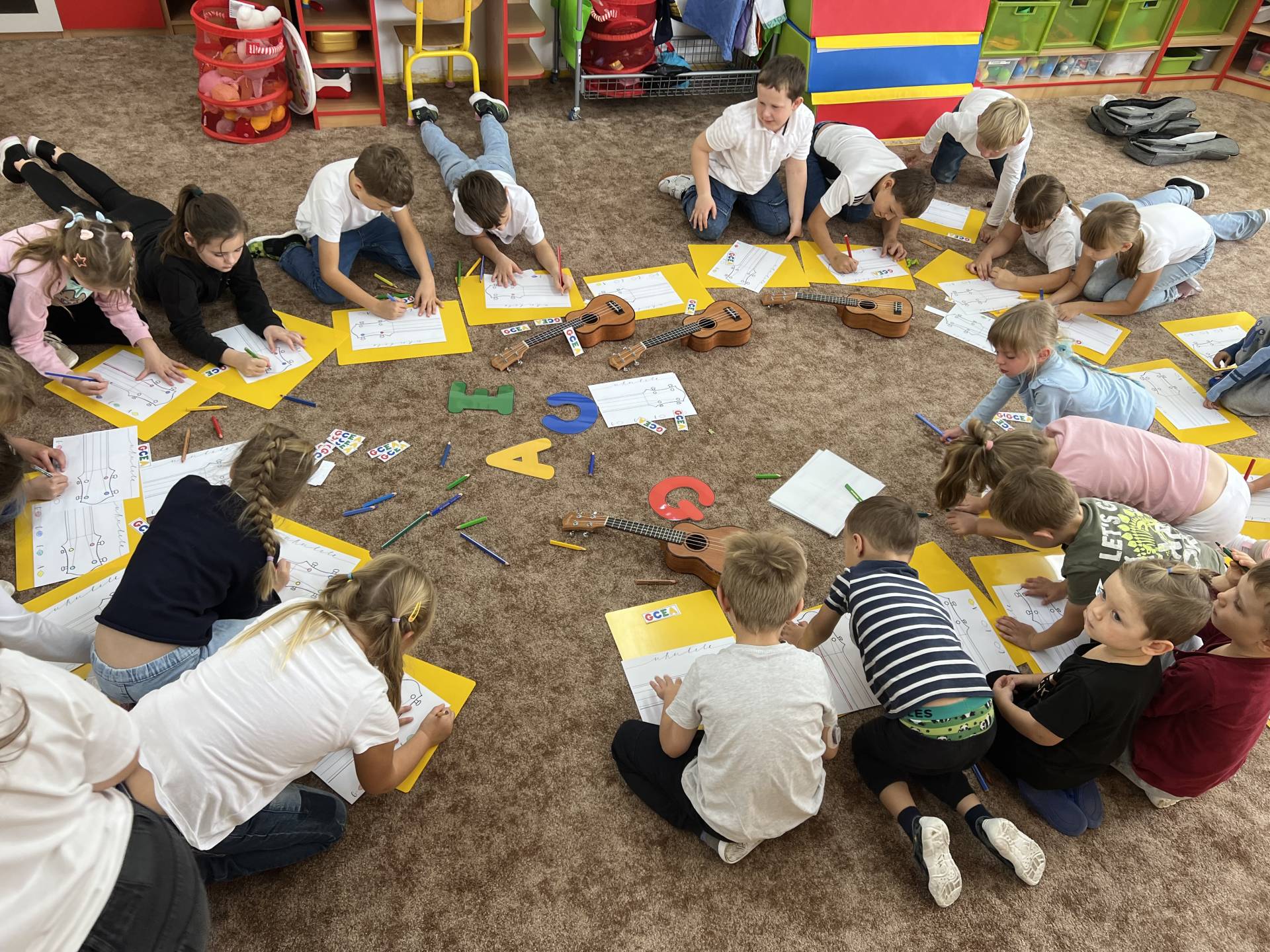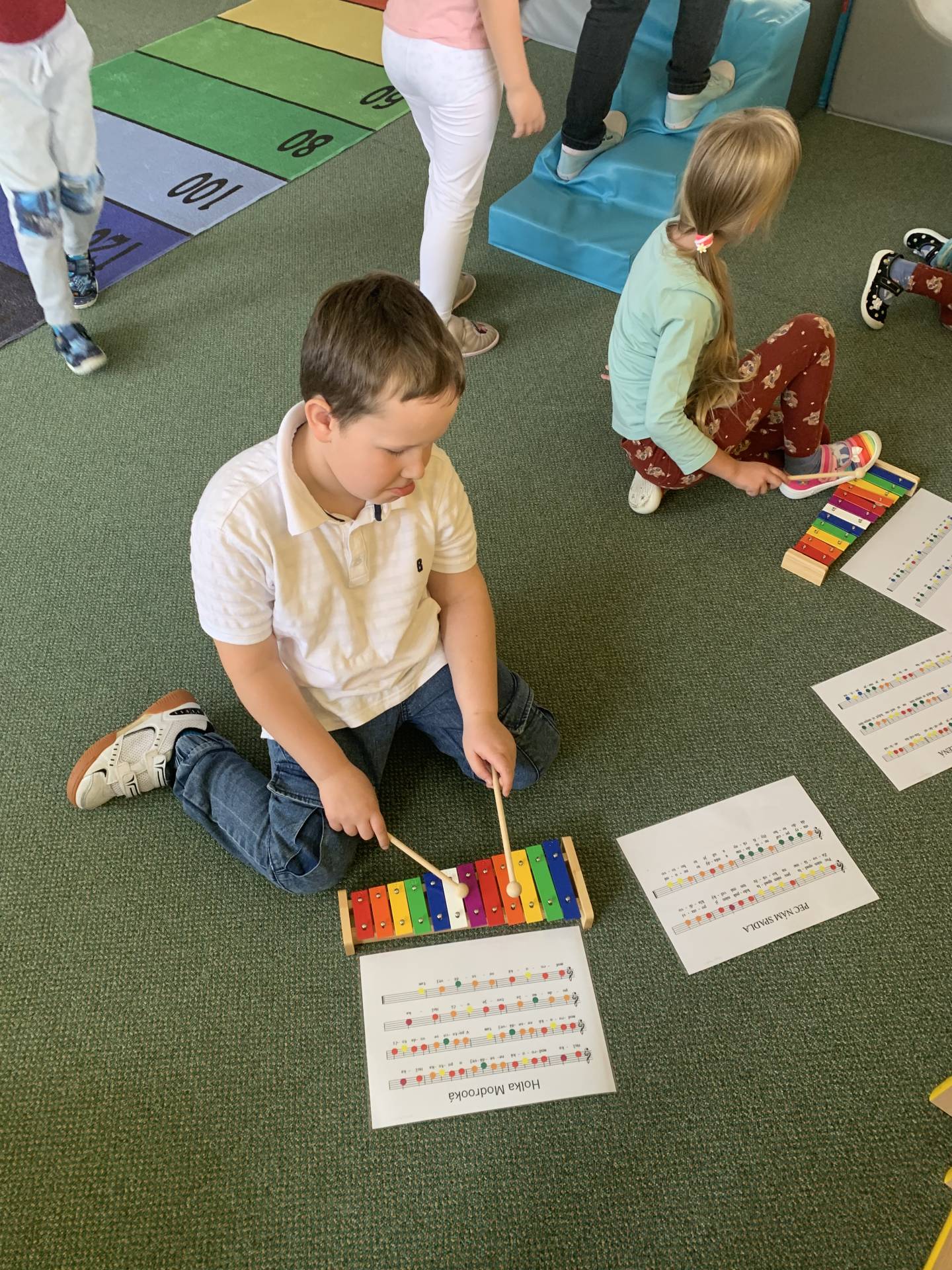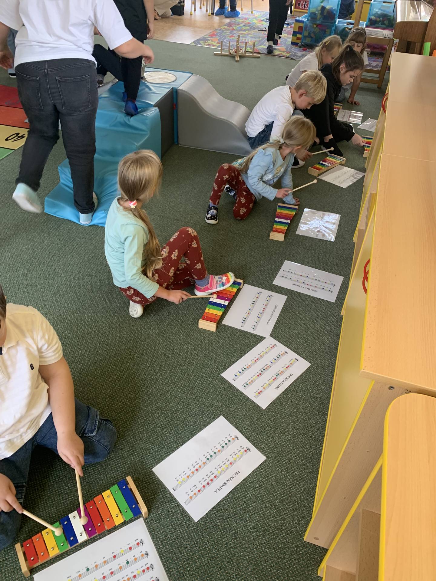 Následně proběhly hudební workshopy, během nichž měly děti možnost seznámit se s hrou na boomwhackers, xylofony, barevné zvonky a ukulele.