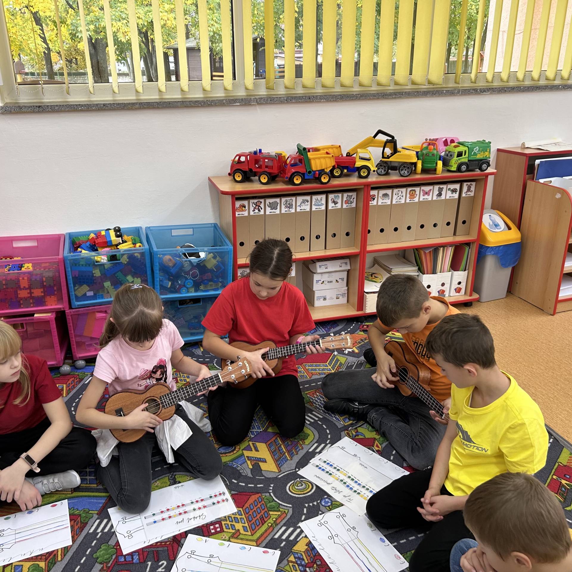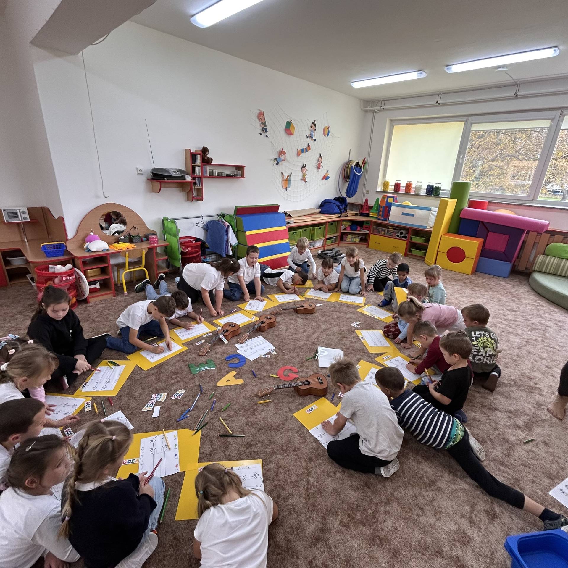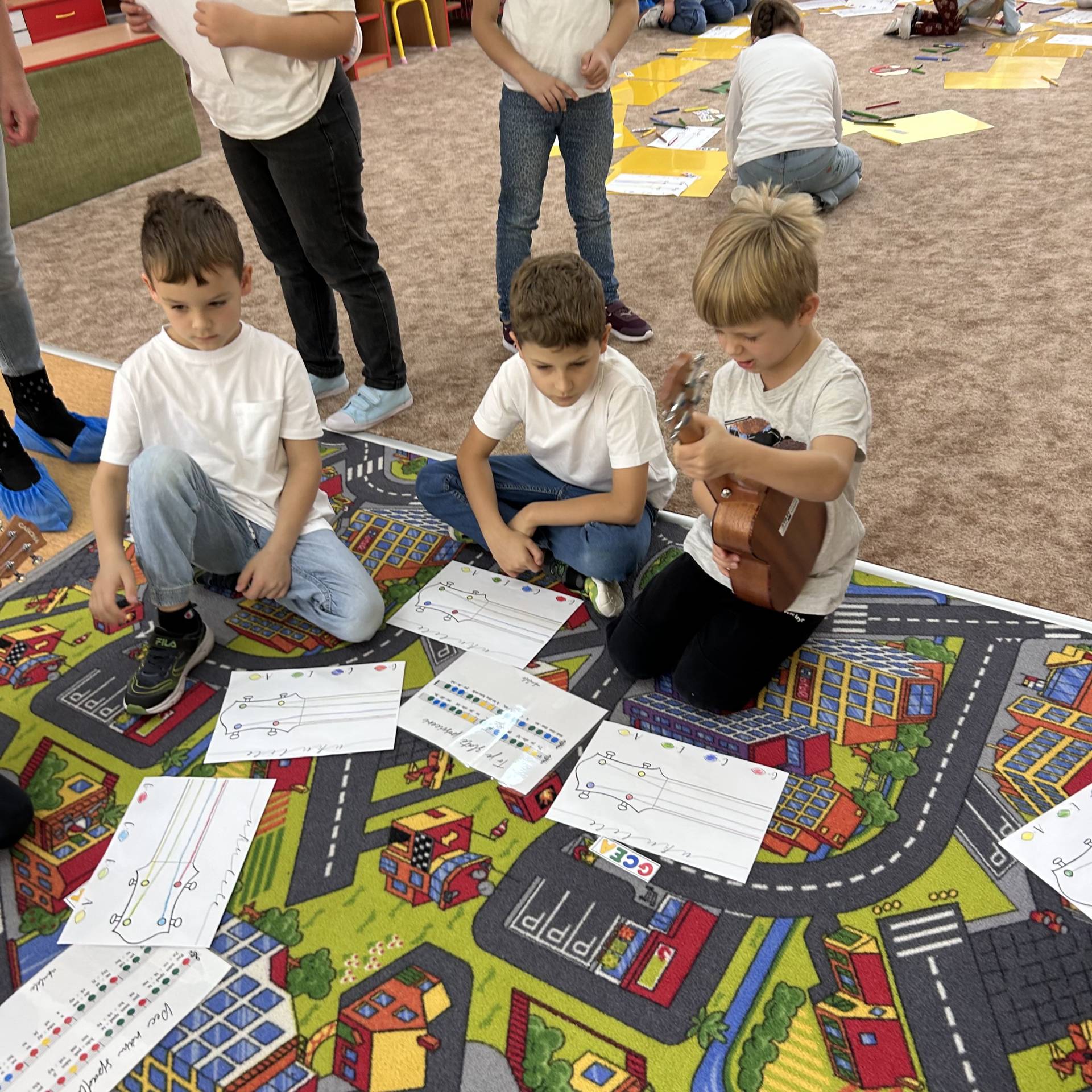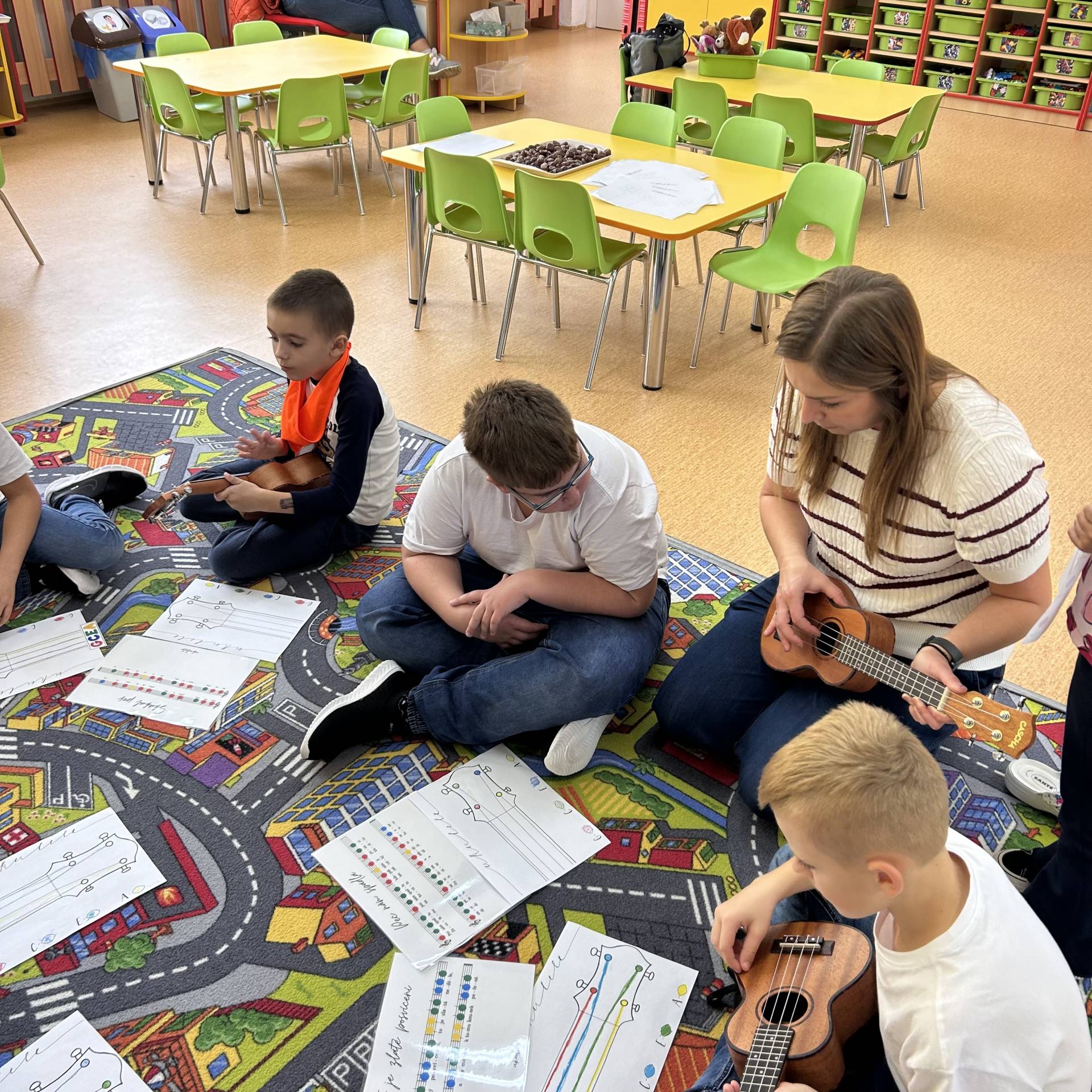 Následně proběhly hudební workshopy, během nichž měly děti možnost seznámit se s hrou na boomwhackers, xylofony, barevné zvonky a ukulele.
