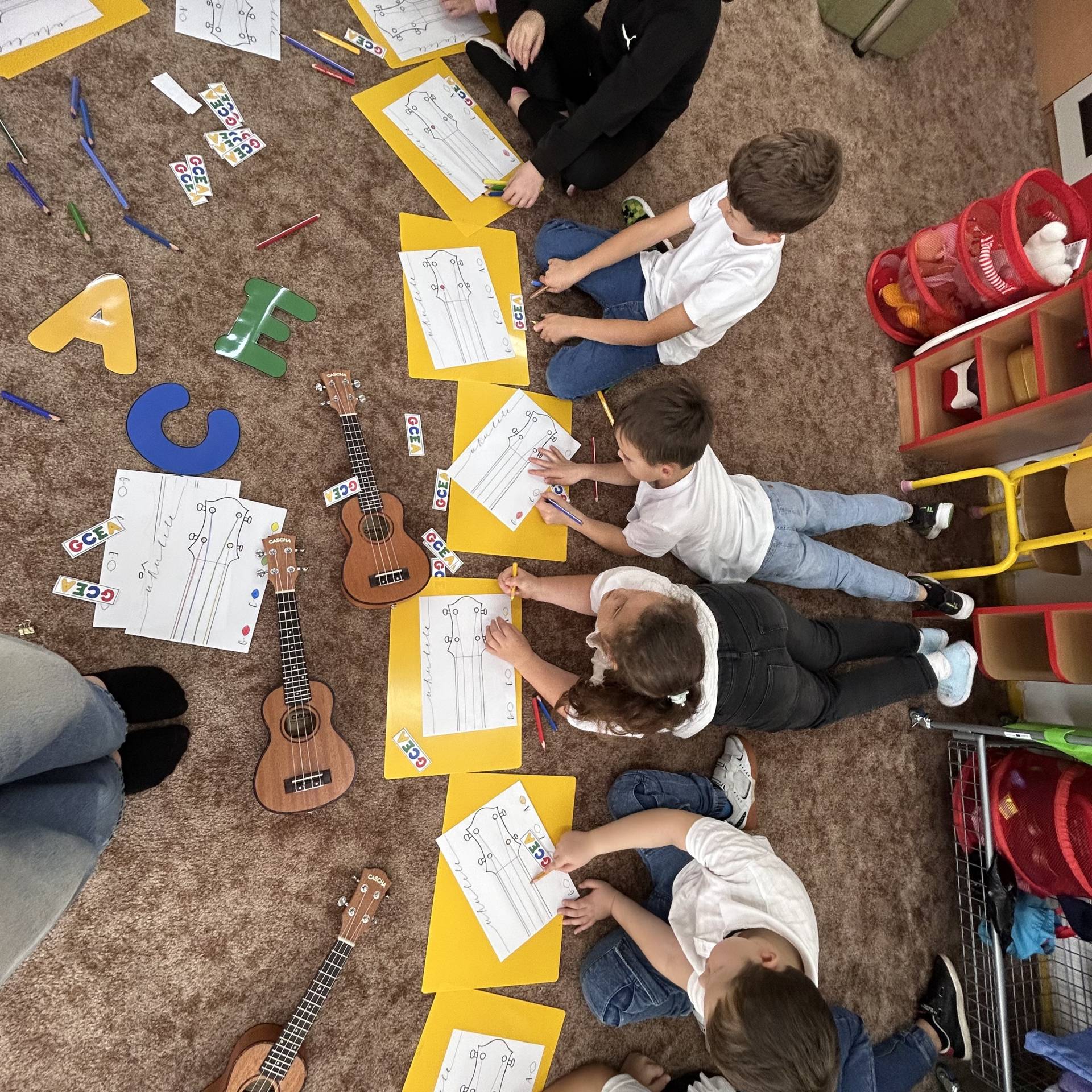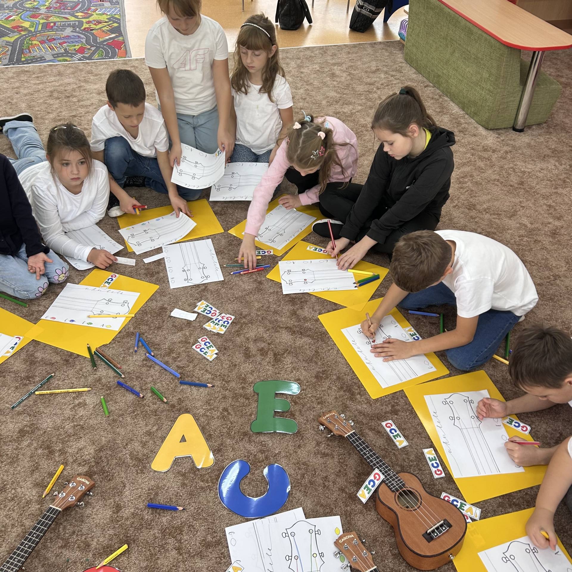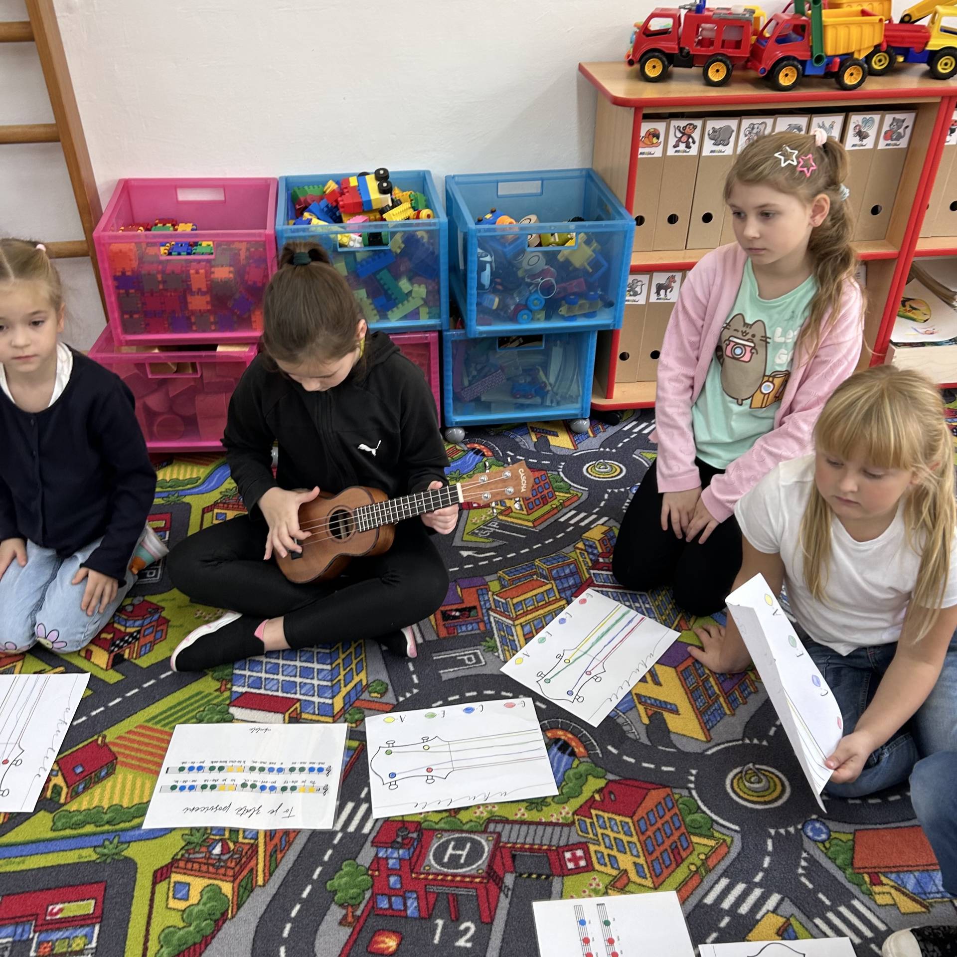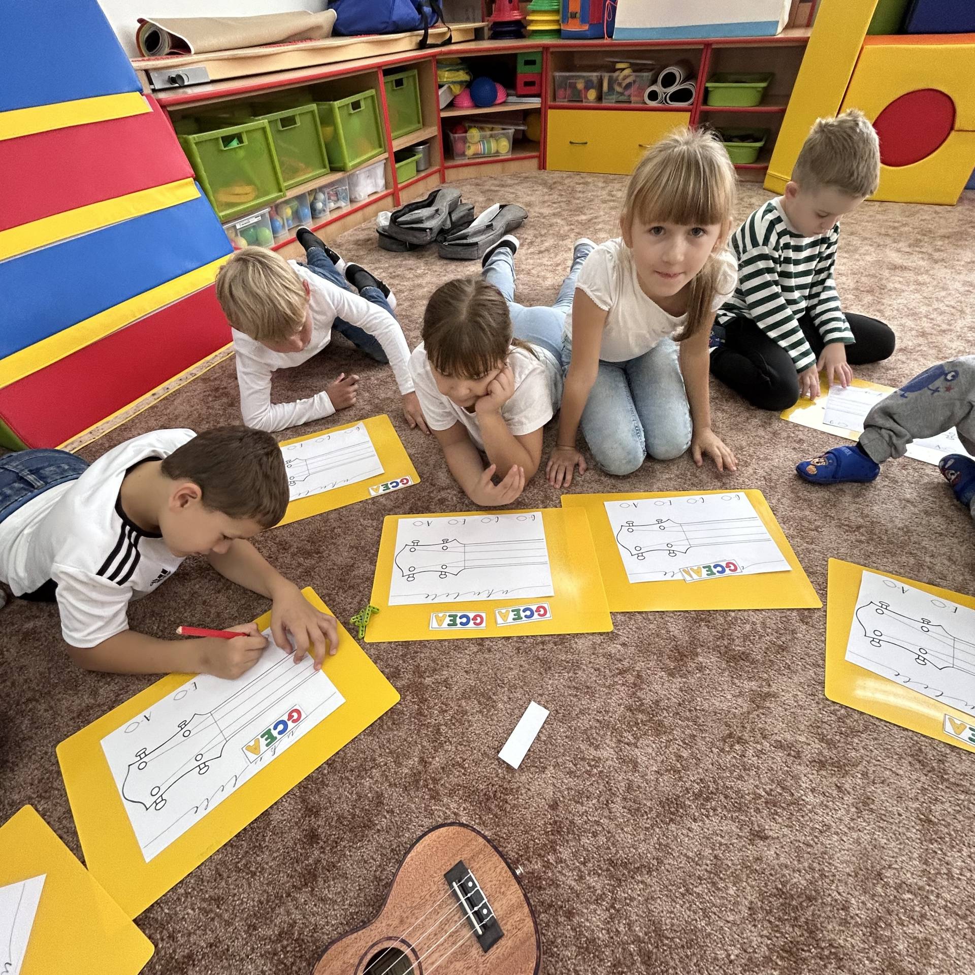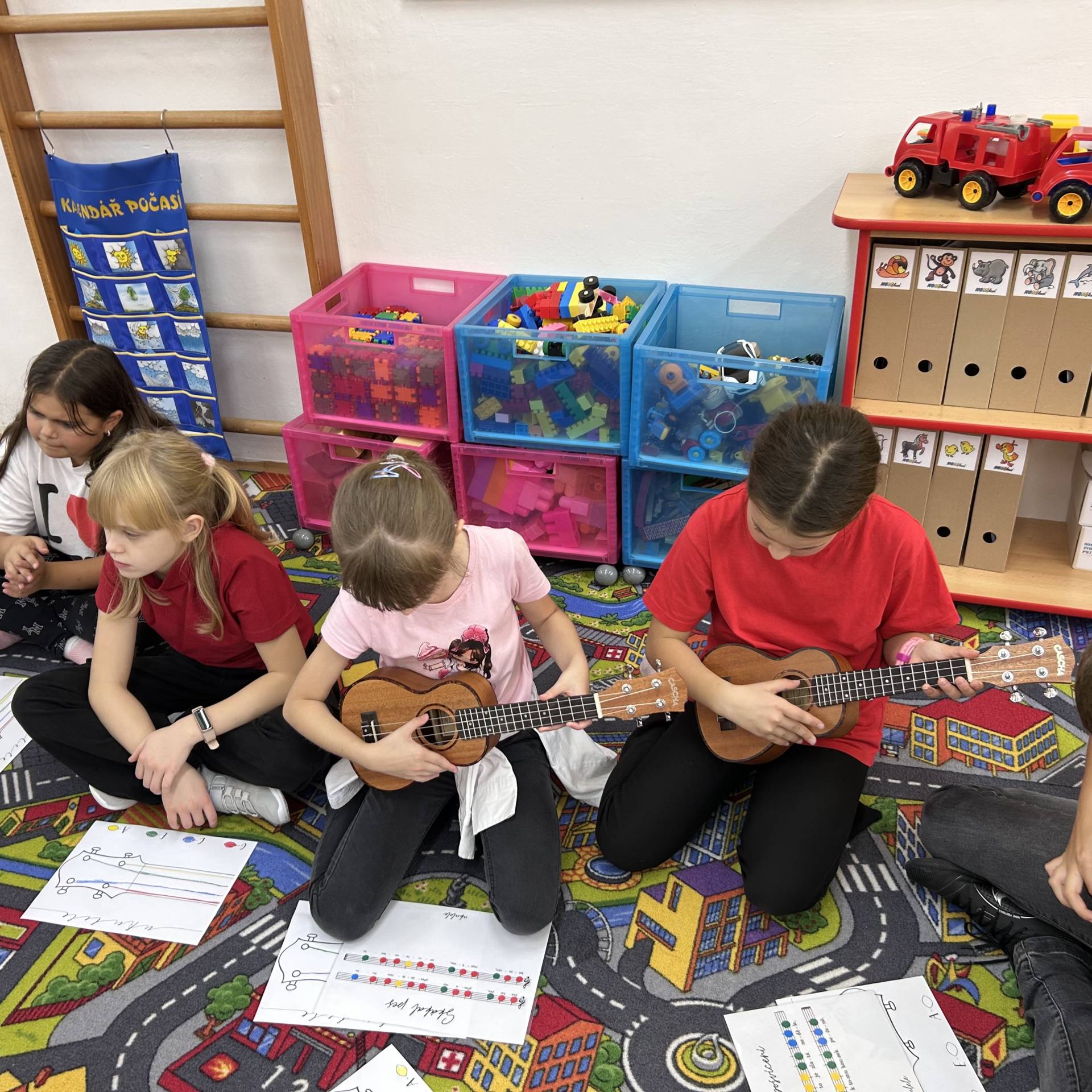 Následně proběhly hudební workshopy, během nichž měly děti možnost seznámit se s hrou na boomwhackers, xylofony, barevné zvonky a ukulele.
