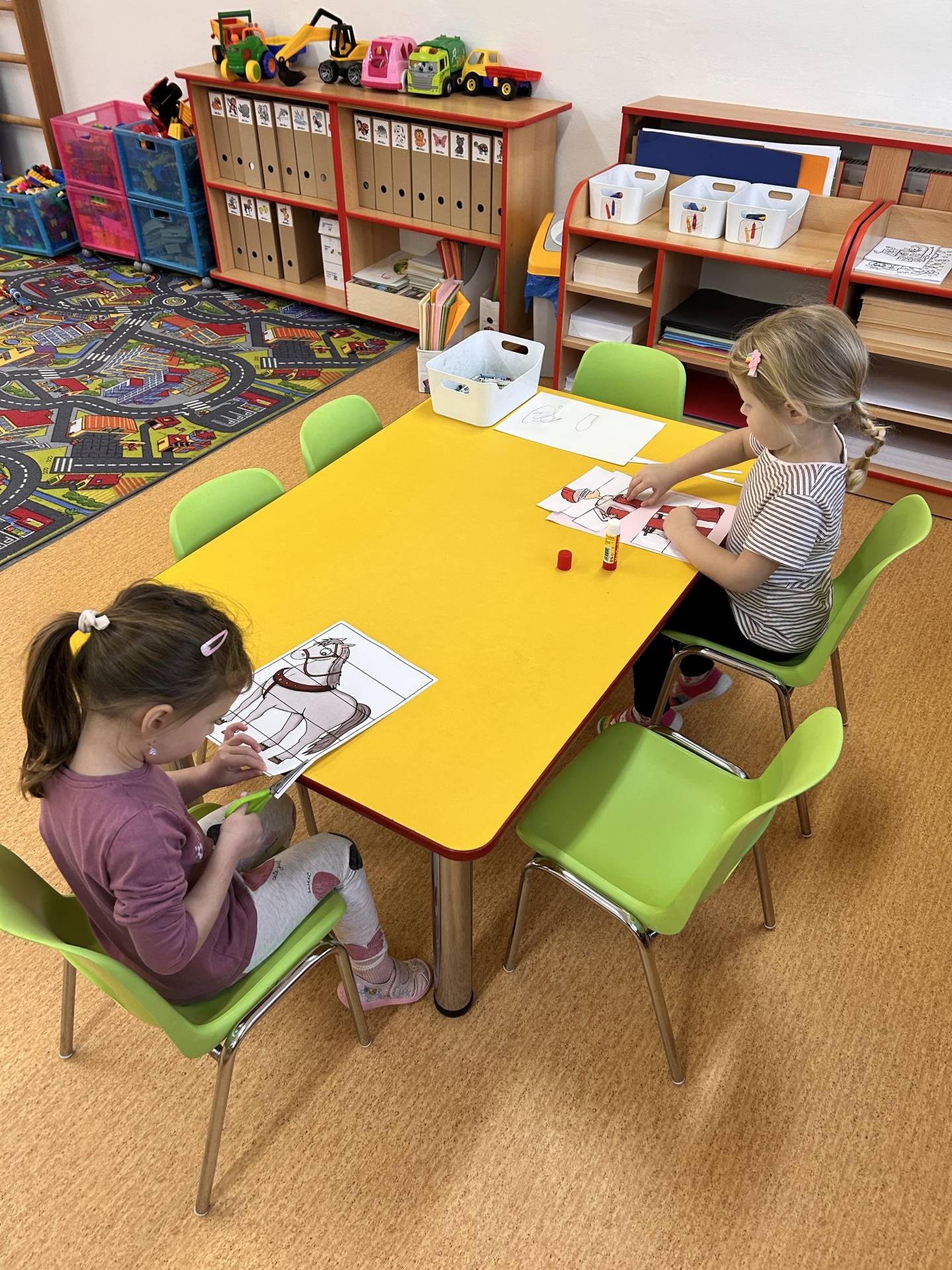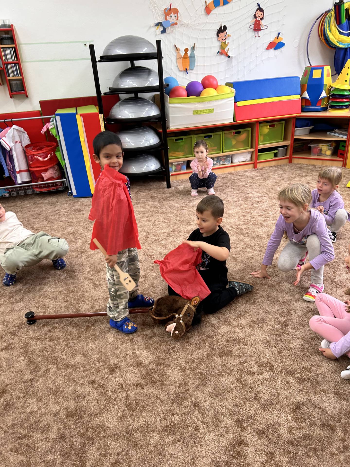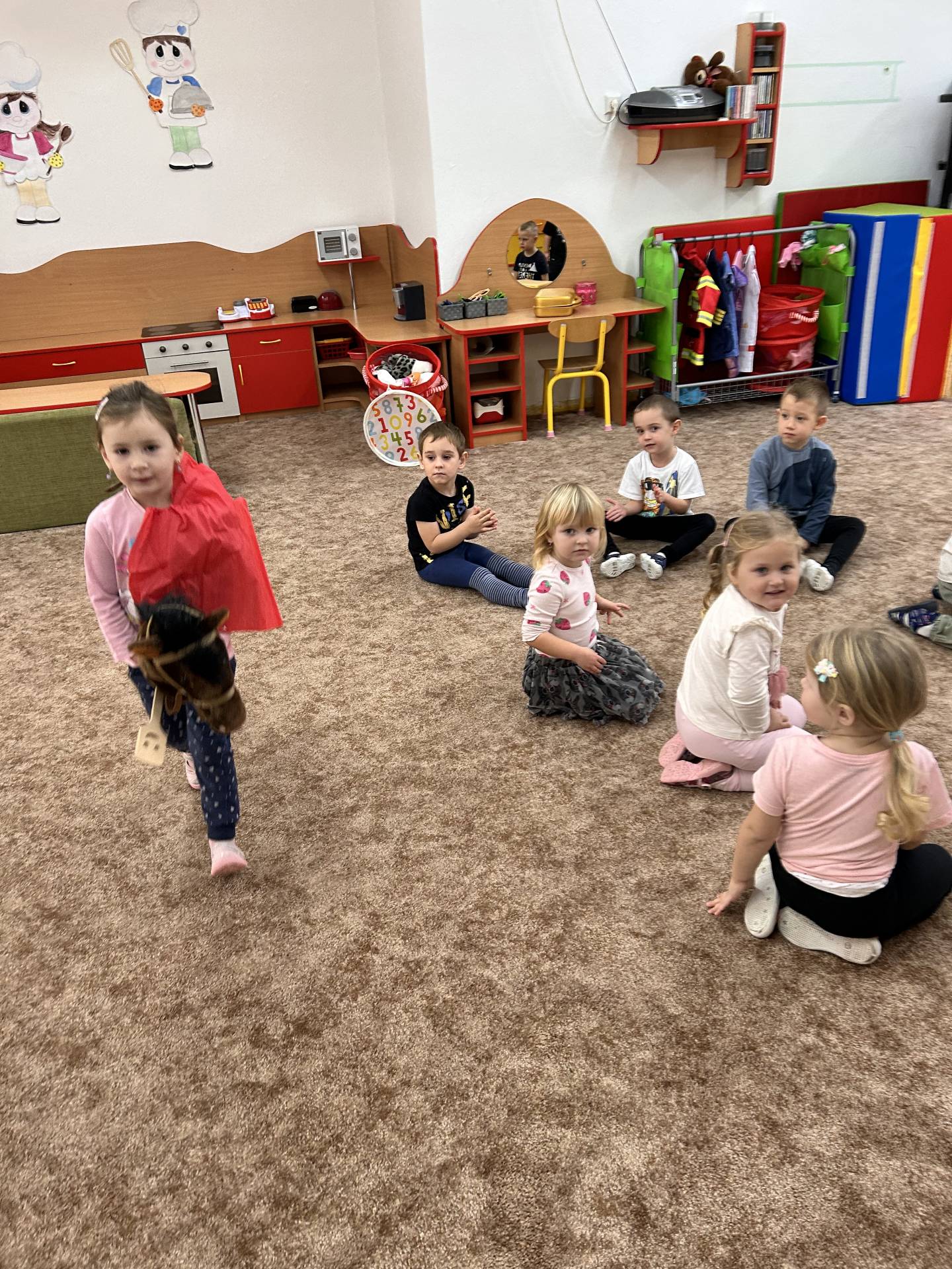 K Svatému Martinovi samozřejmě patří i jeho známá legenda o bílém koni a o tom, jak se Martin podělil o plášť s žebrákem. S dětmi jsme si příběh nejprve připomněly a poté ho samy zahrály formou krátké dramatizace.