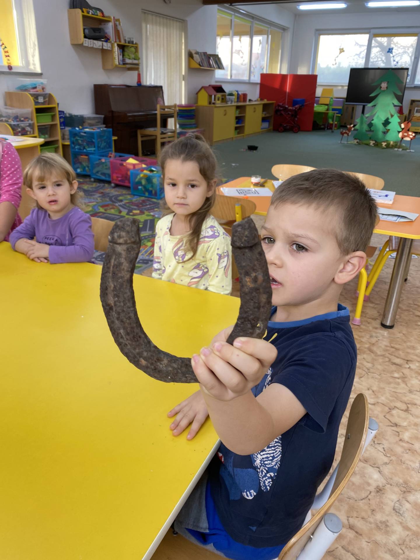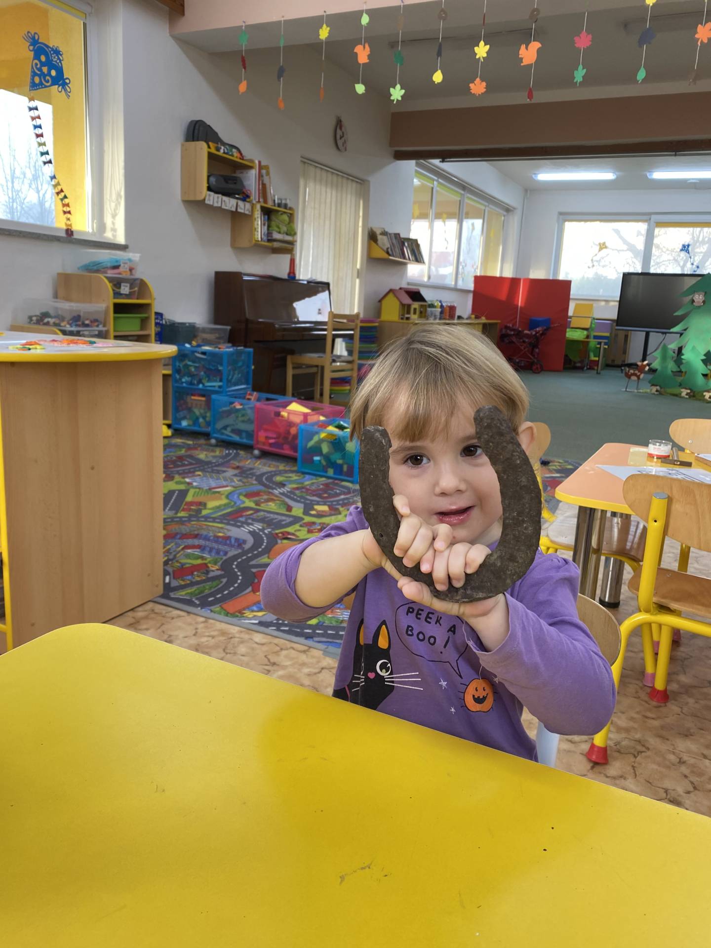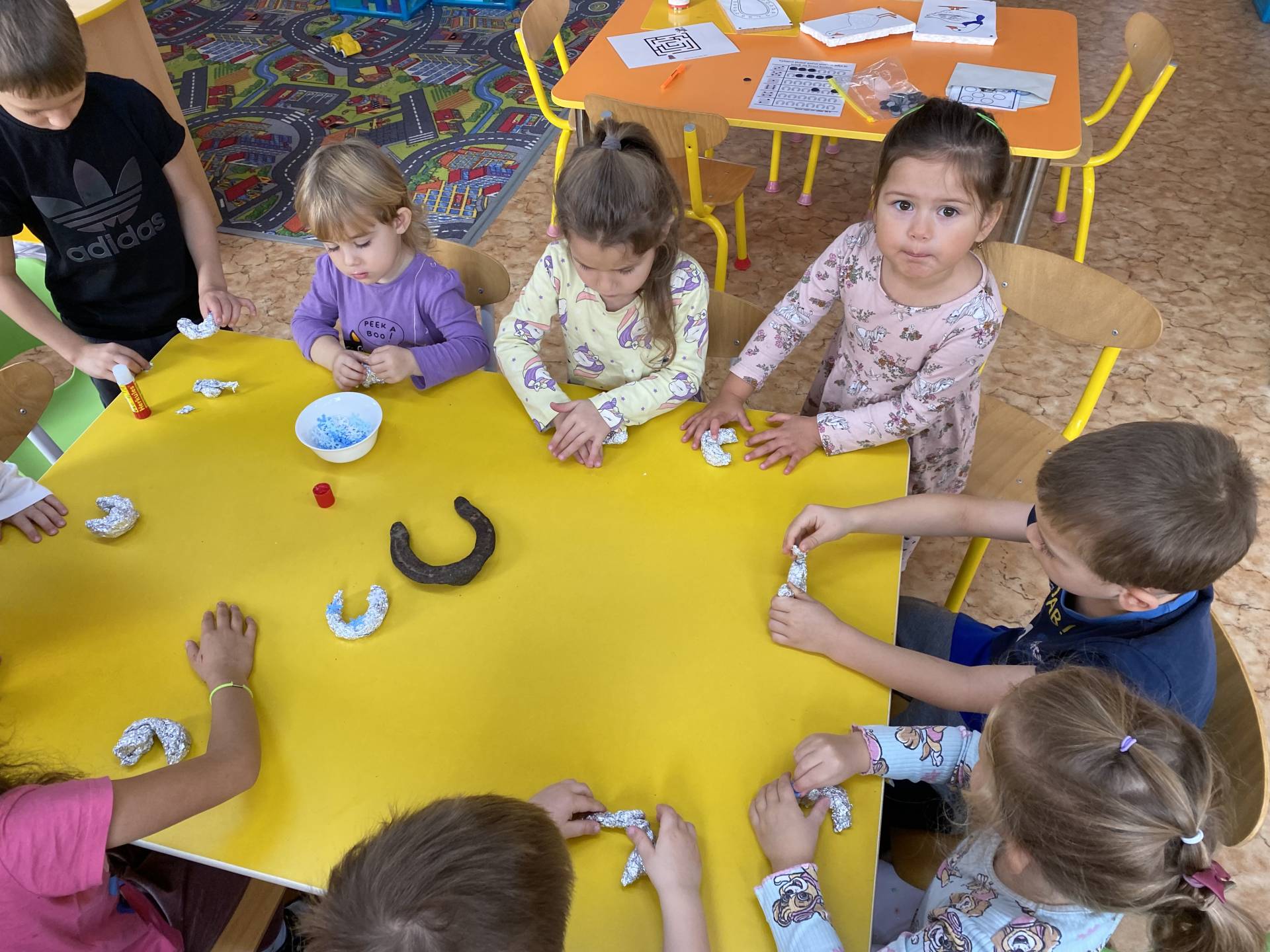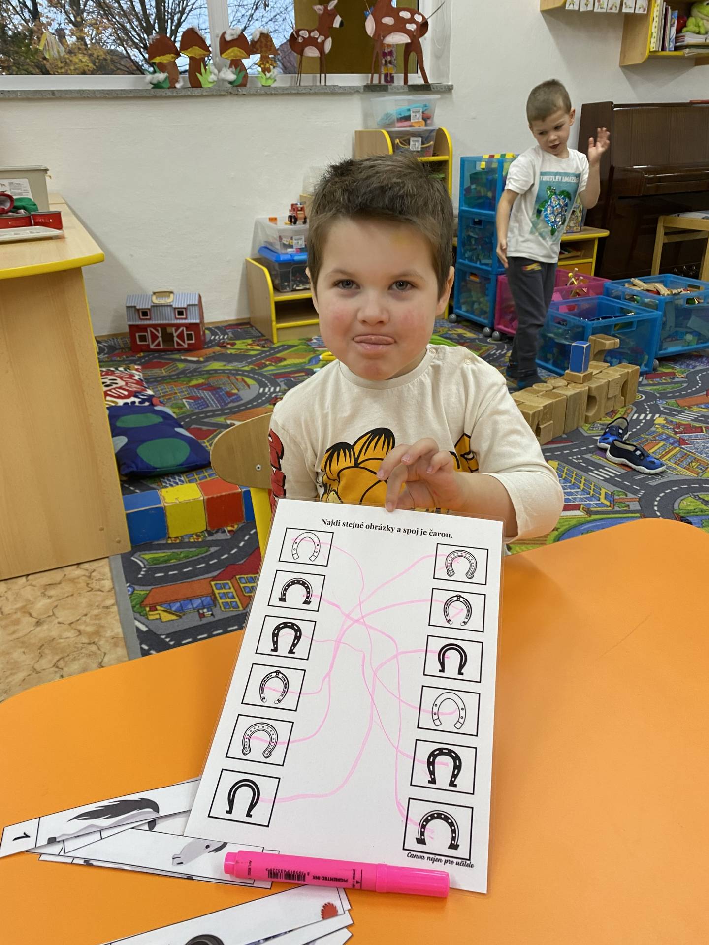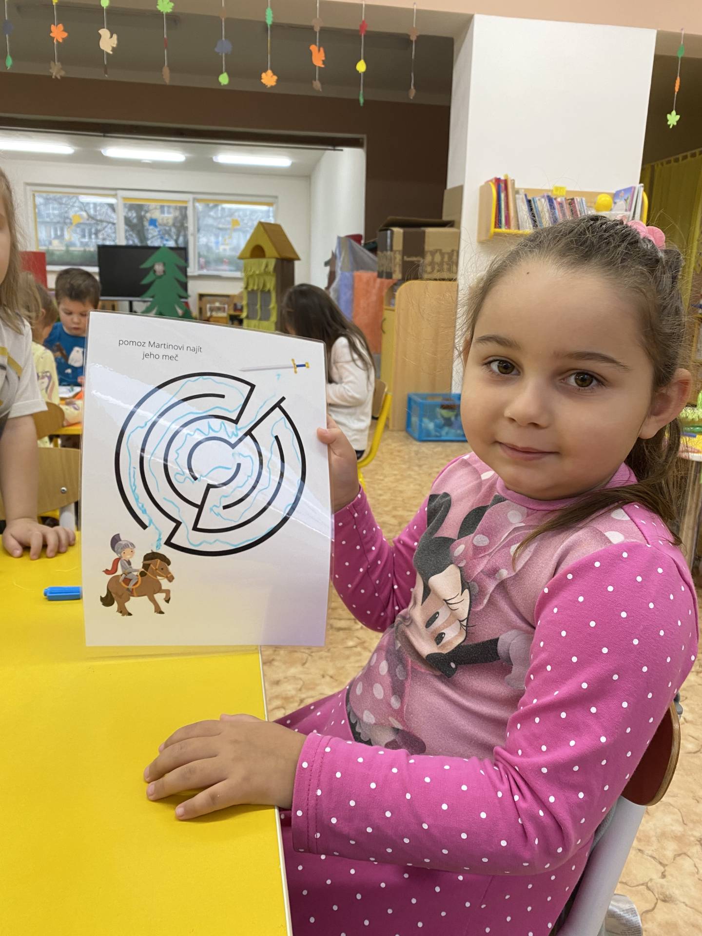 Když slaví svátek svatý Martin, s rozzářenýma očima vyhlížímez okna první snížek, přijede nebo nepřijede Martin na bílém koni? Letosnepřijel… Ale nám to nevadí, určitě se brzy dočkáme prvních vloček a budeme siužívat sněhových radovánek …. Čekání si krátíme různými aktivitami – seznámilijsme se s legendou o svatém Martinovi, kterou jsme si nejprve vyslechliformou čteného příběhu, pak také zhlédnutím na interaktivní tabuli a nakonecdramatickým ztvárněním v kostýmech a samozřejmě také nechyběly patřičnérekvizity. Povídali jsme si o pranostikách, skládali jsme dějovou posloupnostpříjezdu sv. Martina do města, abychom si upevnili děj příběhu. Vyzkoušeli jsmevpichování pírek, modelování rohlíčků z plastelíny a podkovyz alobalu, zatloukání hřebíčků do podkovy, vyšívání provázkem, smyslohraní– hledání vloček ve „sněhu“, luštili labyrinty, počítali, třídili, skládalipuzzle, tvořili koníky, vázali uzlíky, stavěli komíny, skládali vločky a mečez barevných víček a špátlí, hráli si na koníky, husy, zpívali arecitovali, experimentovali s vodou a různým materiálem a zkoumalirozpustnost látek ve vodě. Při pobytu venku jsme vyzkoušeli kreslení vločkymoukou a navštívili koníky na nedaleké farmě.