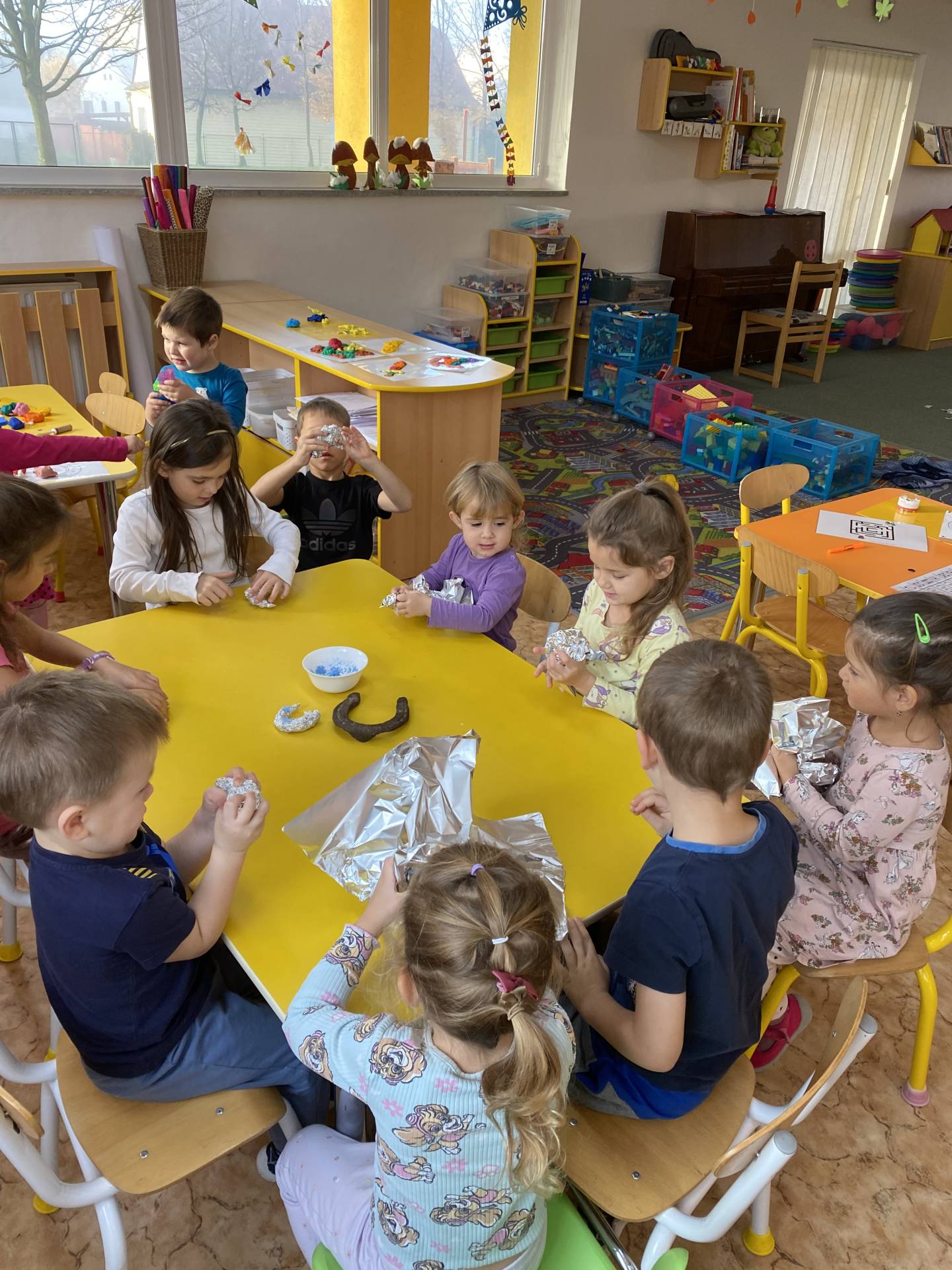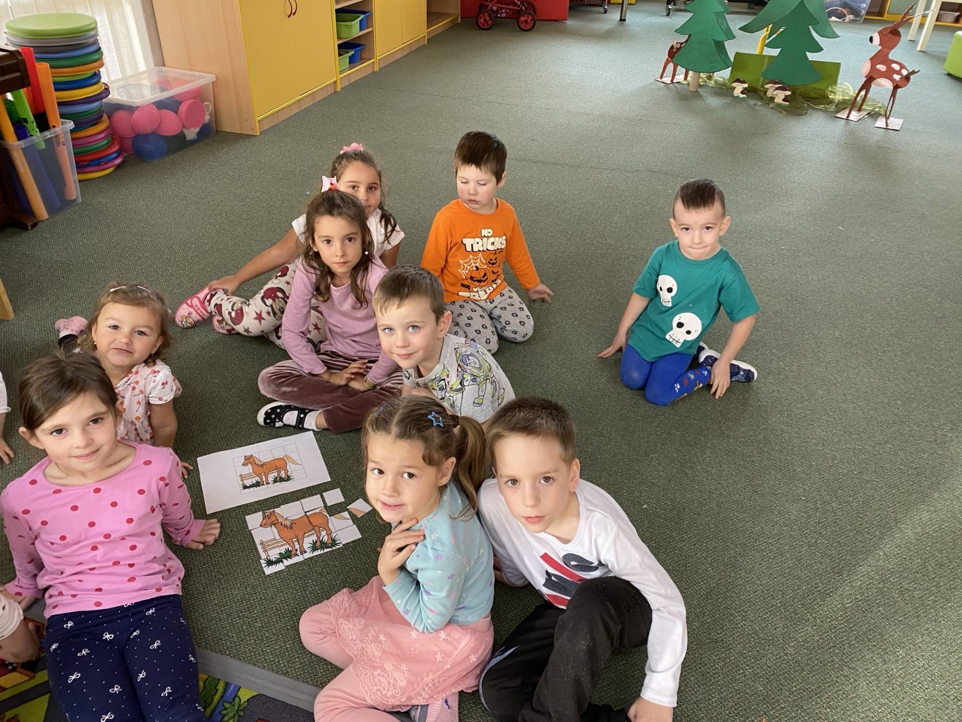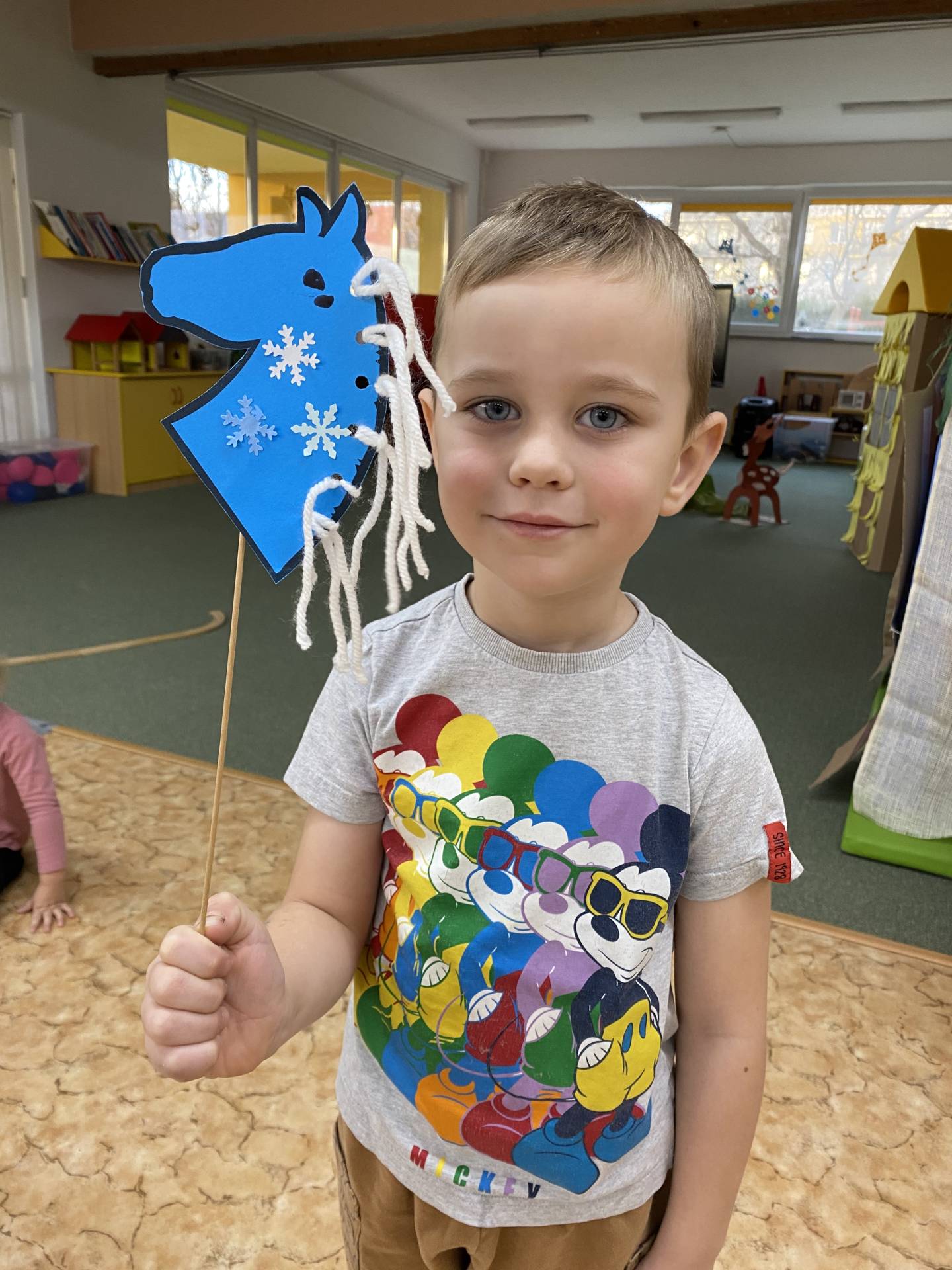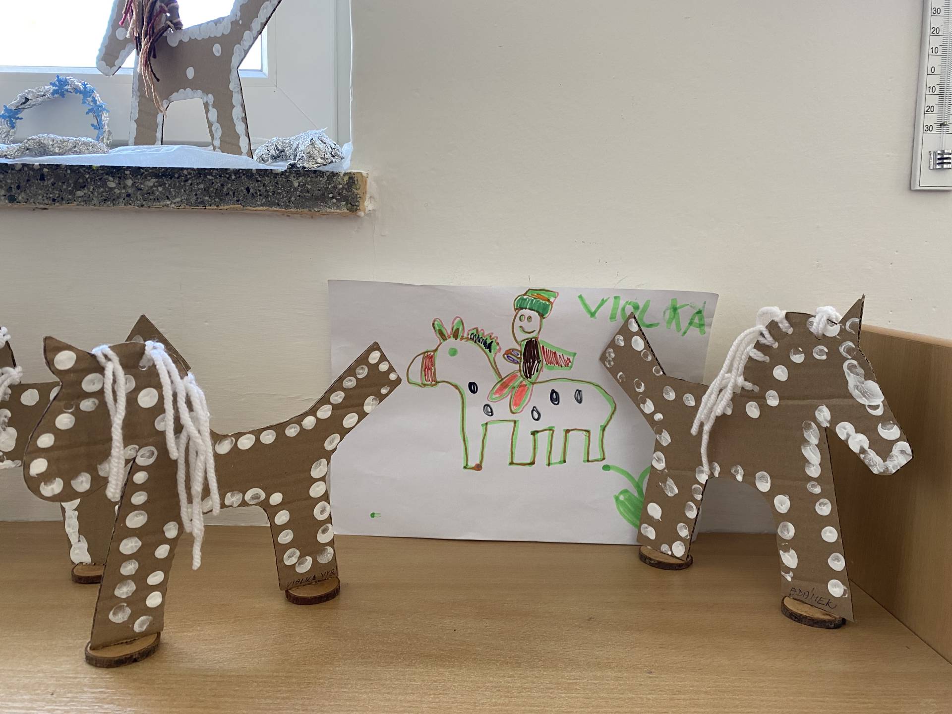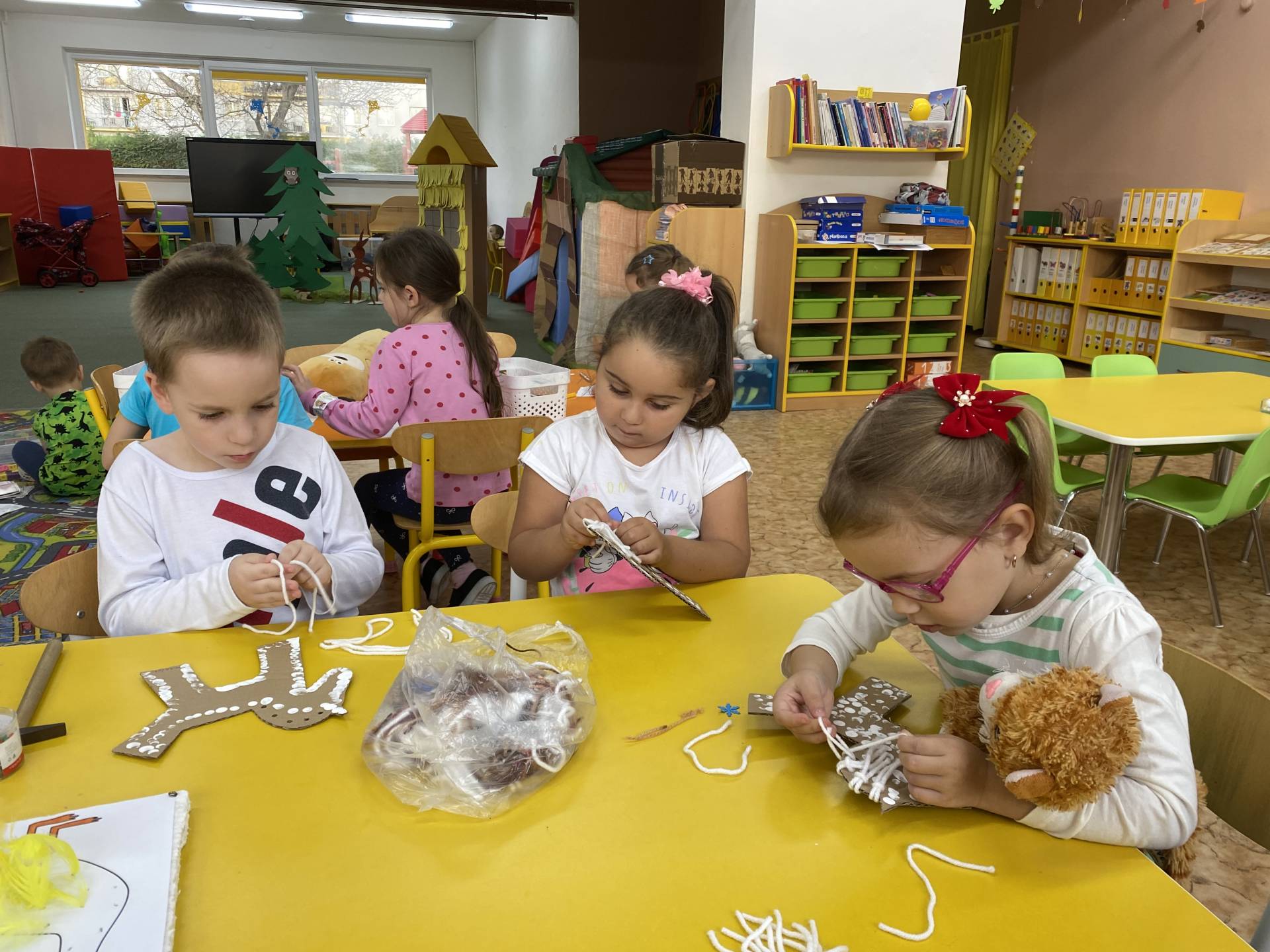Když slaví svátek svatý Martin, s rozzářenýma očima vyhlížímez okna první snížek, přijede nebo nepřijede Martin na bílém koni? Letosnepřijel… Ale nám to nevadí, určitě se brzy dočkáme prvních vloček a budeme siužívat sněhových radovánek …. Čekání si krátíme různými aktivitami – seznámilijsme se s legendou o svatém Martinovi, kterou jsme si nejprve vyslechliformou čteného příběhu, pak také zhlédnutím na interaktivní tabuli a nakonecdramatickým ztvárněním v kostýmech a samozřejmě také nechyběly patřičnérekvizity. Povídali jsme si o pranostikách, skládali jsme dějovou posloupnostpříjezdu sv. Martina do města, abychom si upevnili děj příběhu. Vyzkoušeli jsmevpichování pírek, modelování rohlíčků z plastelíny a podkovyz alobalu, zatloukání hřebíčků do podkovy, vyšívání provázkem, smyslohraní– hledání vloček ve „sněhu“, luštili labyrinty, počítali, třídili, skládalipuzzle, tvořili koníky, vázali uzlíky, stavěli komíny, skládali vločky a mečez barevných víček a špátlí, hráli si na koníky, husy, zpívali arecitovali, experimentovali s vodou a různým materiálem a zkoumalirozpustnost látek ve vodě. Při pobytu venku jsme vyzkoušeli kreslení vločkymoukou a navštívili koníky na nedaleké farmě.