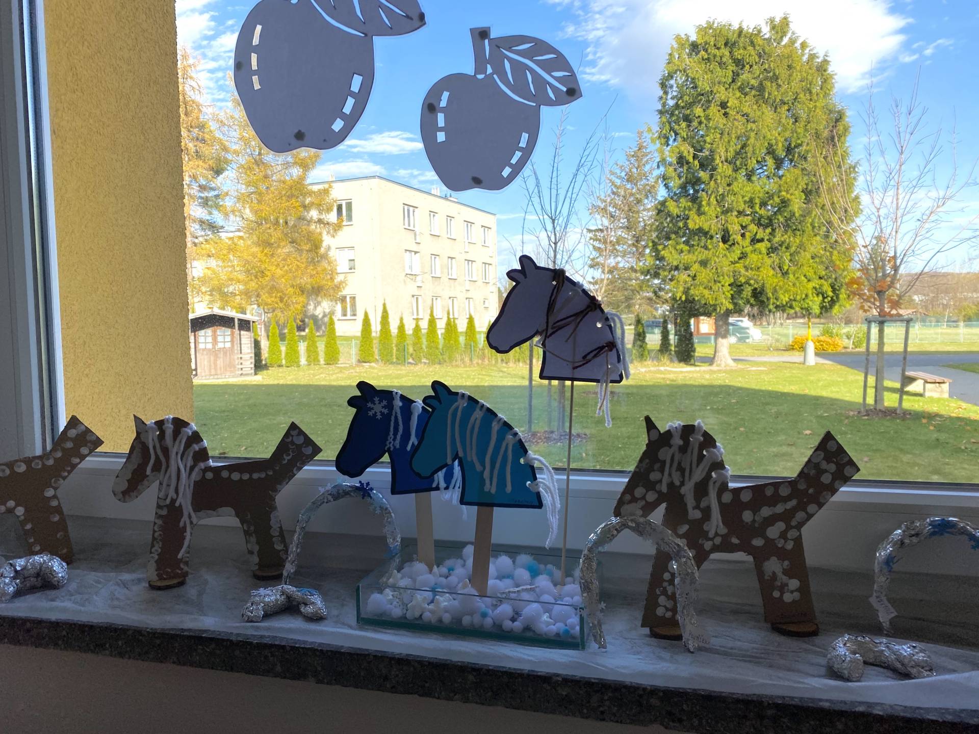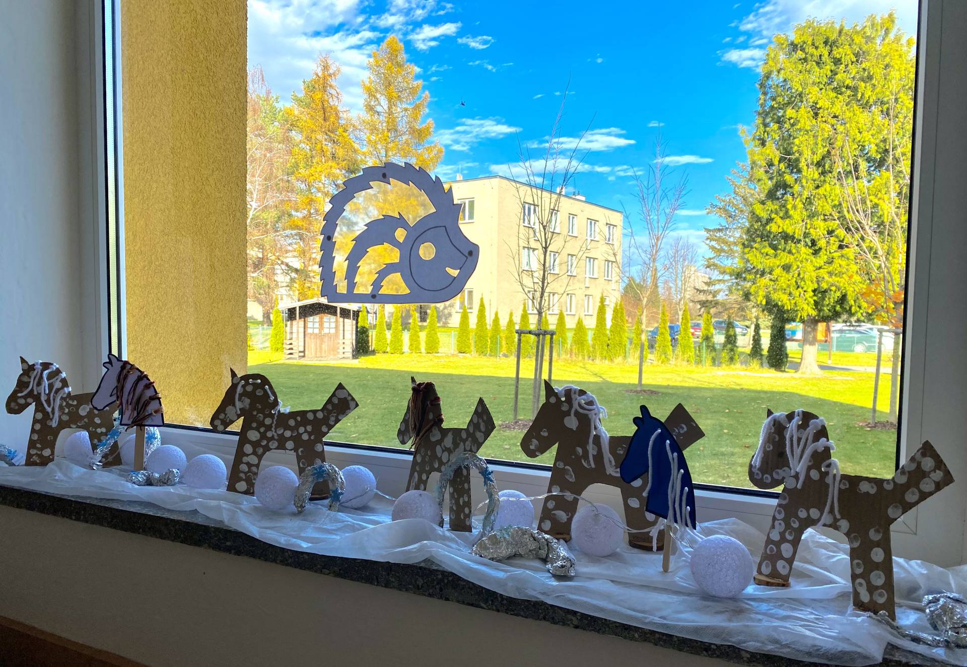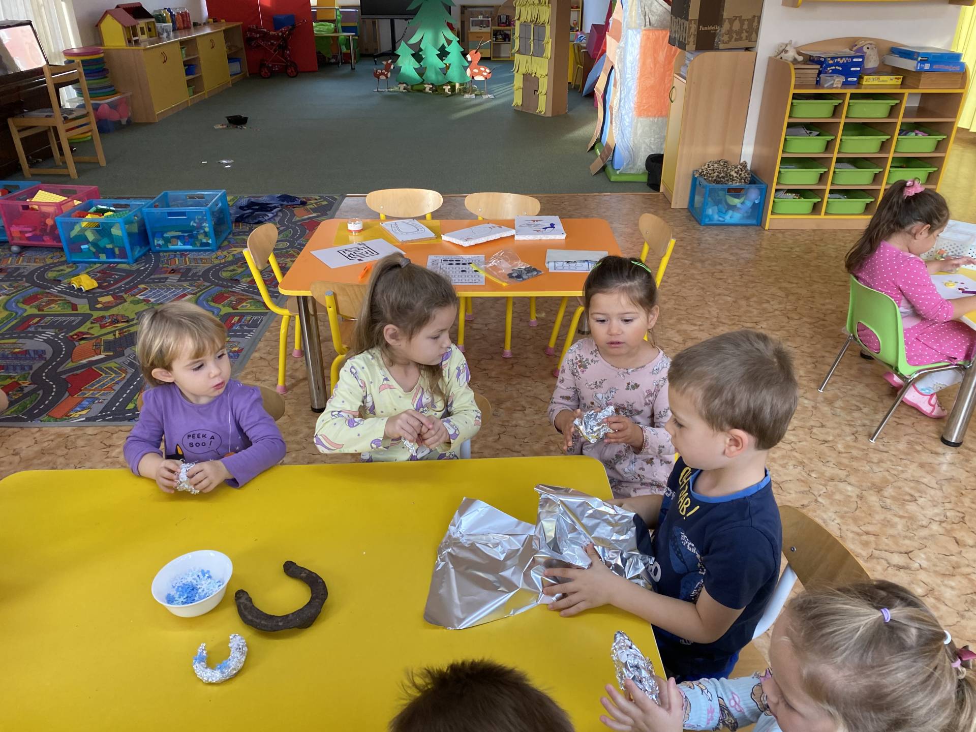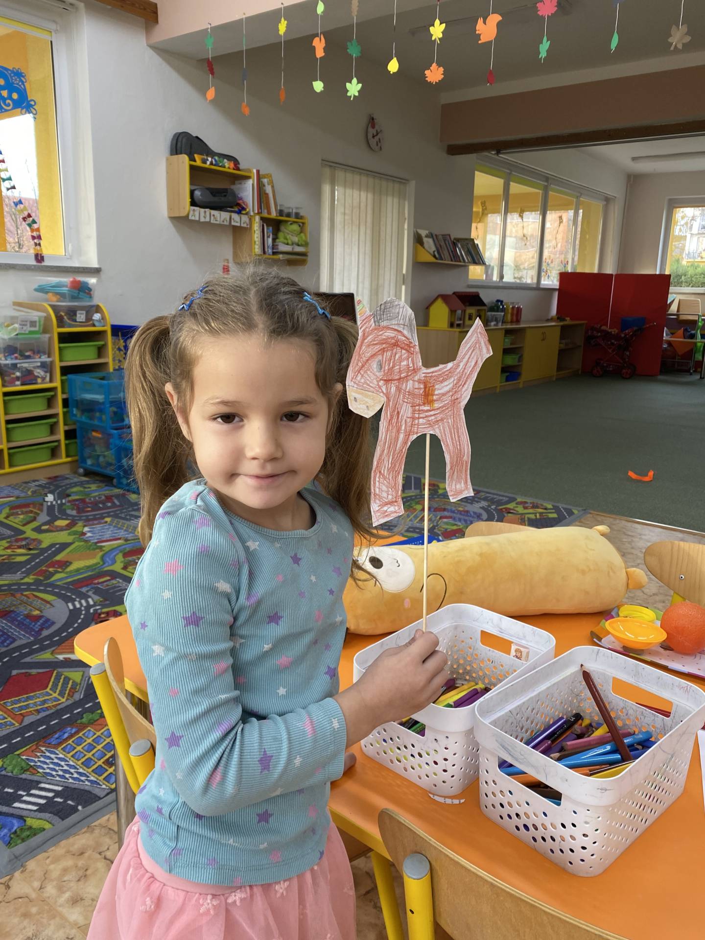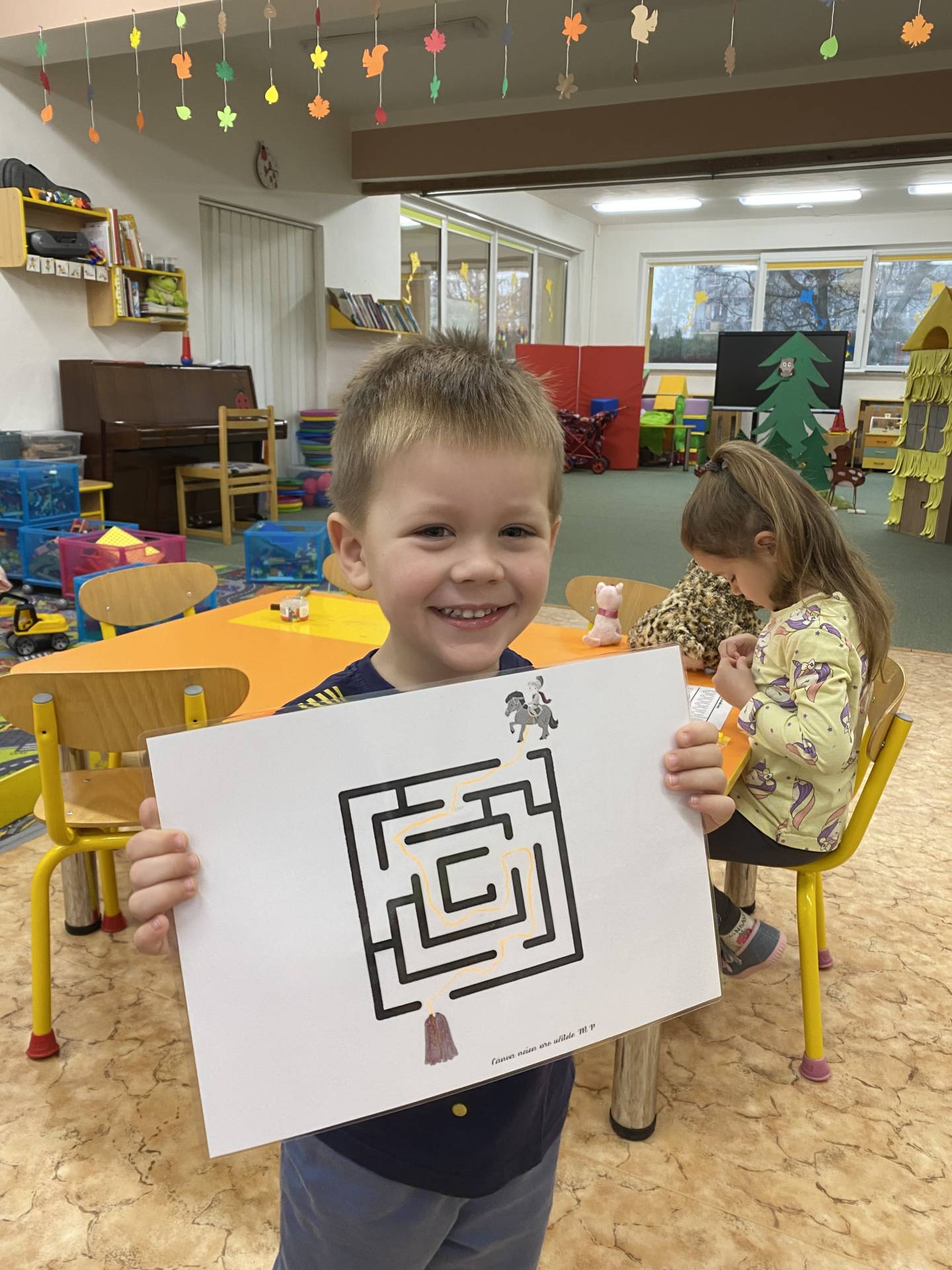 Když slaví svátek svatý Martin, s rozzářenýma očima vyhlížímez okna první snížek, přijede nebo nepřijede Martin na bílém koni? Letosnepřijel… Ale nám to nevadí, určitě se brzy dočkáme prvních vloček a budeme siužívat sněhových radovánek …. Čekání si krátíme různými aktivitami – seznámilijsme se s legendou o svatém Martinovi, kterou jsme si nejprve vyslechliformou čteného příběhu, pak také zhlédnutím na interaktivní tabuli a nakonecdramatickým ztvárněním v kostýmech a samozřejmě také nechyběly patřičnérekvizity. Povídali jsme si o pranostikách, skládali jsme dějovou posloupnostpříjezdu sv. Martina do města, abychom si upevnili děj příběhu. Vyzkoušeli jsmevpichování pírek, modelování rohlíčků z plastelíny a podkovyz alobalu, zatloukání hřebíčků do podkovy, vyšívání provázkem, smyslohraní– hledání vloček ve „sněhu“, luštili labyrinty, počítali, třídili, skládalipuzzle, tvořili koníky, vázali uzlíky, stavěli komíny, skládali vločky a mečez barevných víček a špátlí, hráli si na koníky, husy, zpívali arecitovali, experimentovali s vodou a různým materiálem a zkoumalirozpustnost látek ve vodě. Při pobytu venku jsme vyzkoušeli kreslení vločkymoukou a navštívili koníky na nedaleké farmě.