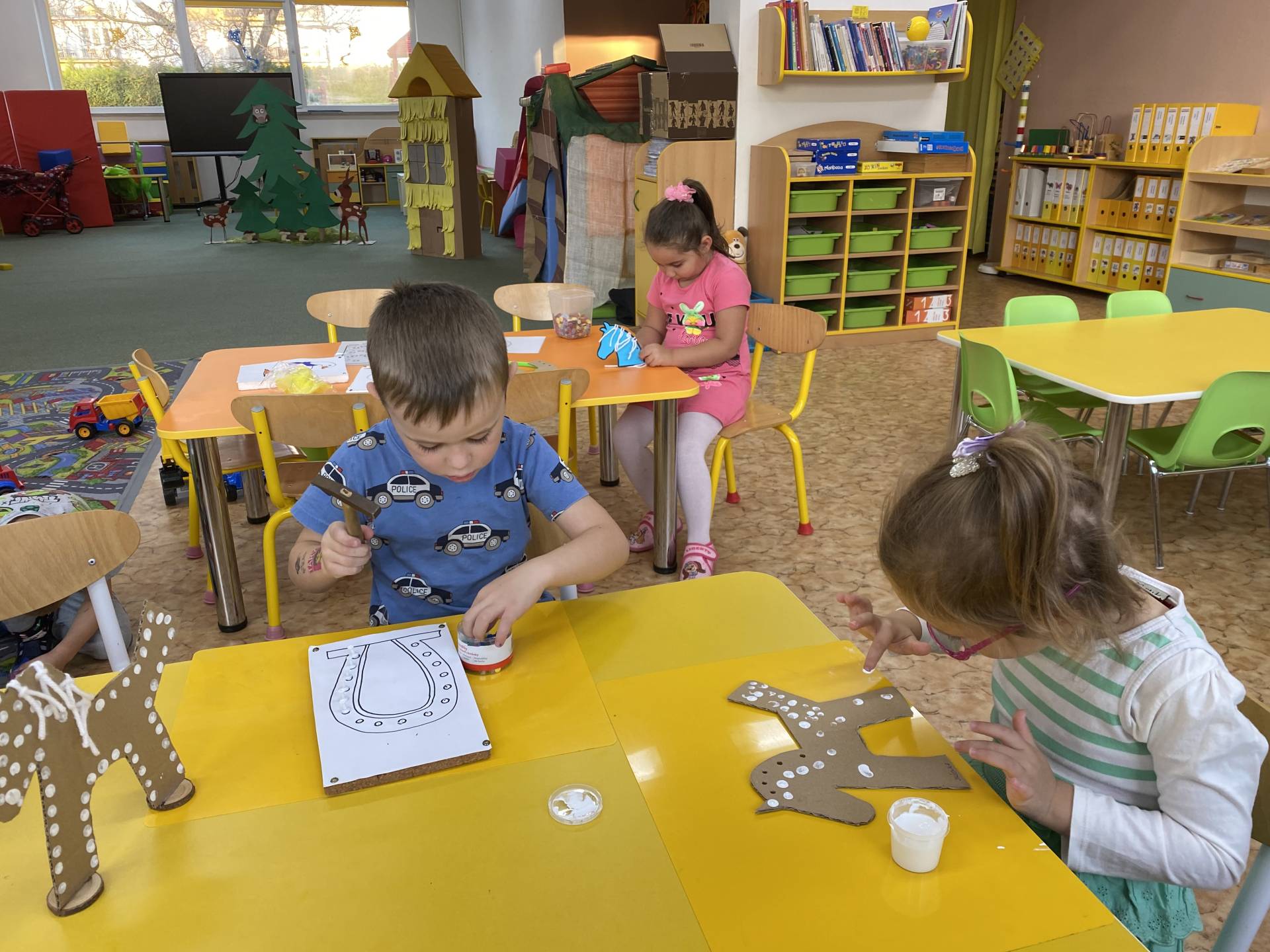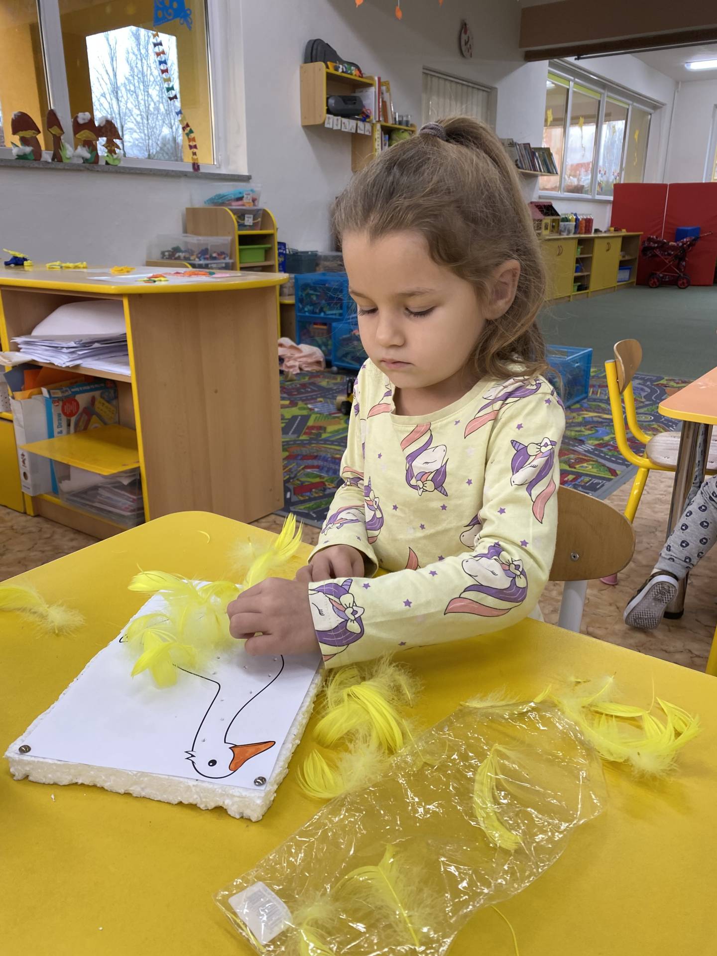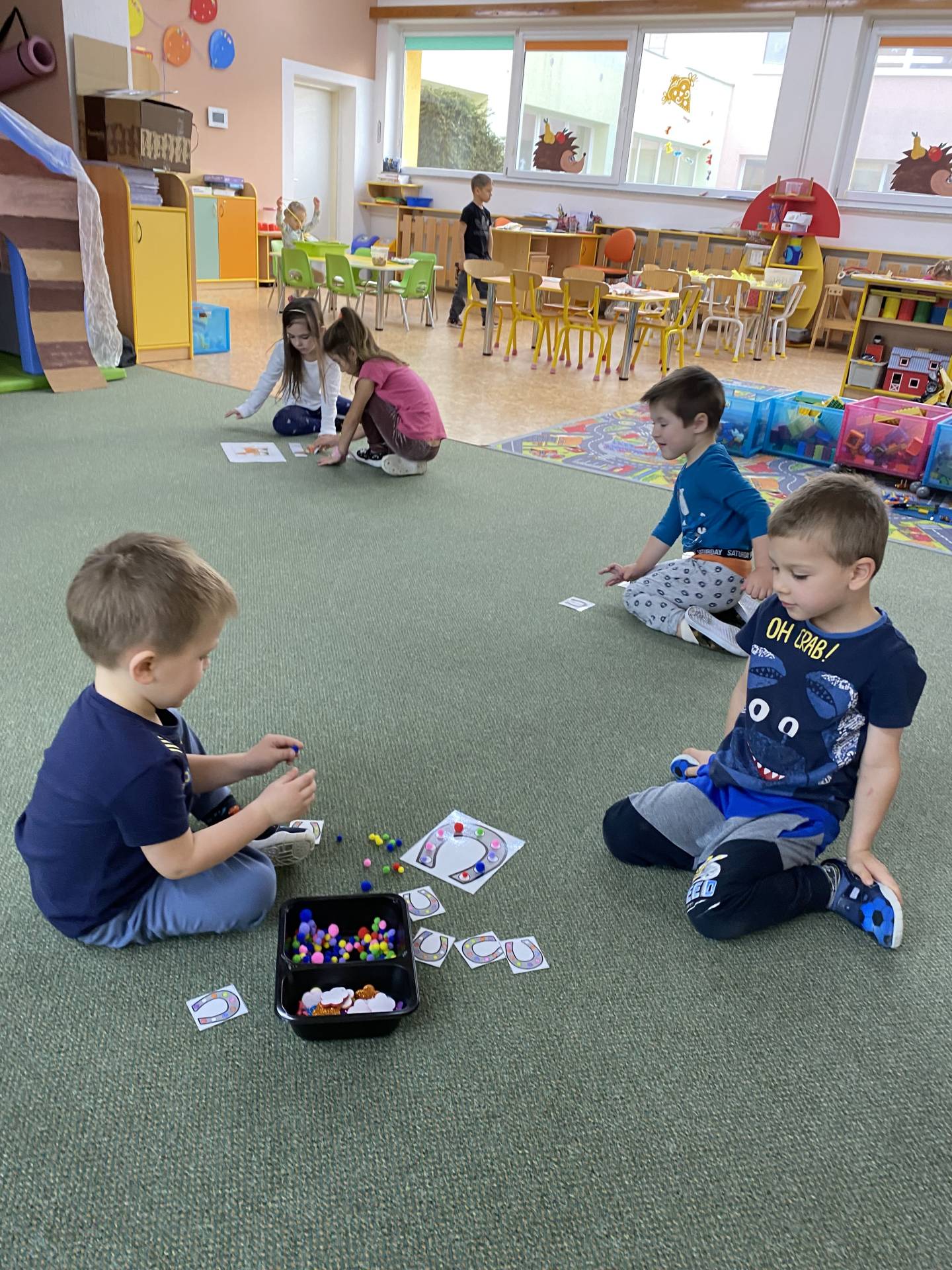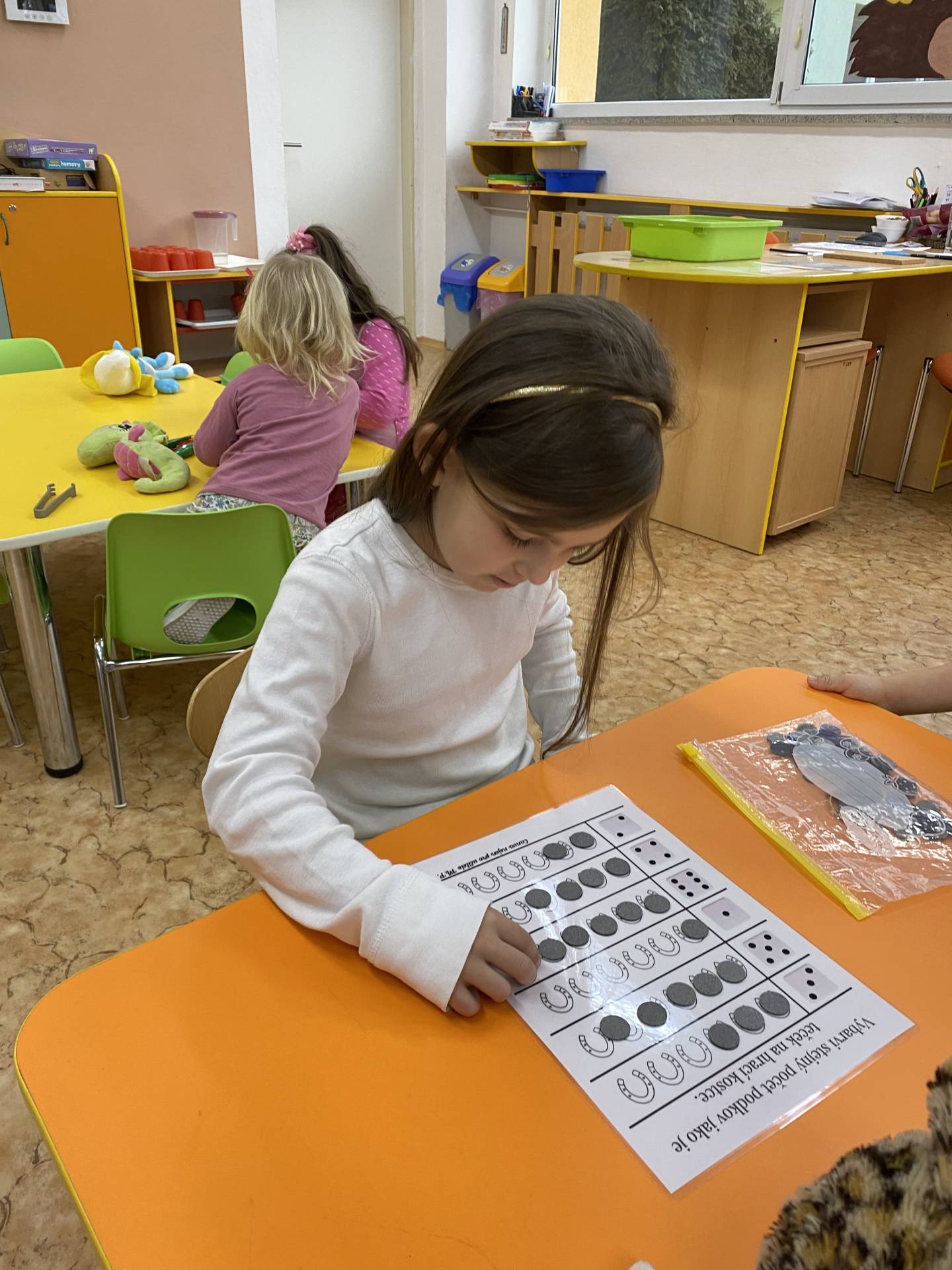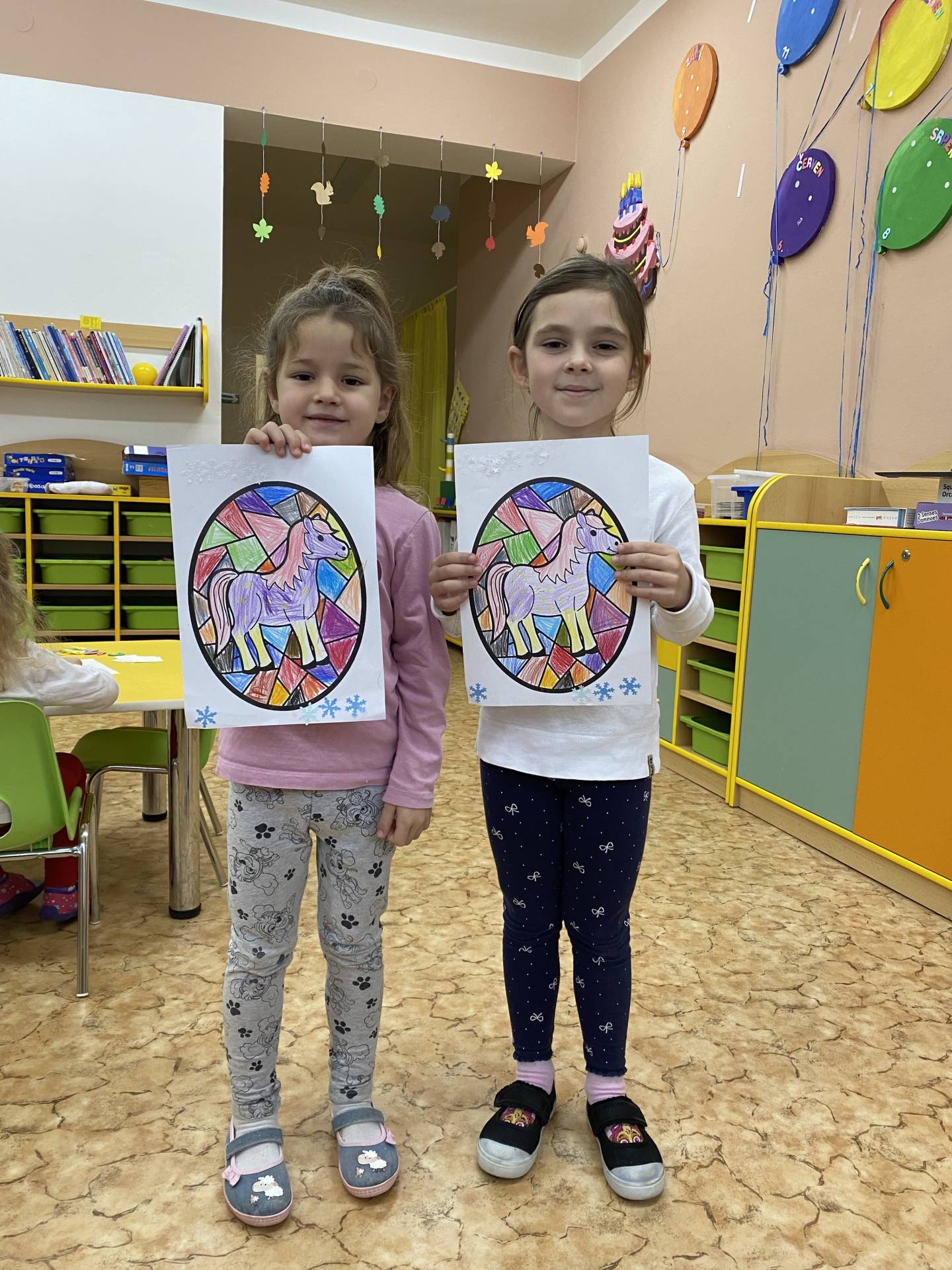 Když slaví svátek svatý Martin, s rozzářenýma očima vyhlížímez okna první snížek, přijede nebo nepřijede Martin na bílém koni? Letosnepřijel… Ale nám to nevadí, určitě se brzy dočkáme prvních vloček a budeme siužívat sněhových radovánek …. Čekání si krátíme různými aktivitami – seznámilijsme se s legendou o svatém Martinovi, kterou jsme si nejprve vyslechliformou čteného příběhu, pak také zhlédnutím na interaktivní tabuli a nakonecdramatickým ztvárněním v kostýmech a samozřejmě také nechyběly patřičnérekvizity. Povídali jsme si o pranostikách, skládali jsme dějovou posloupnostpříjezdu sv. Martina do města, abychom si upevnili děj příběhu. Vyzkoušeli jsmevpichování pírek, modelování rohlíčků z plastelíny a podkovyz alobalu, zatloukání hřebíčků do podkovy, vyšívání provázkem, smyslohraní– hledání vloček ve „sněhu“, luštili labyrinty, počítali, třídili, skládalipuzzle, tvořili koníky, vázali uzlíky, stavěli komíny, skládali vločky a mečez barevných víček a špátlí, hráli si na koníky, husy, zpívali arecitovali, experimentovali s vodou a různým materiálem a zkoumalirozpustnost látek ve vodě. Při pobytu venku jsme vyzkoušeli kreslení vločkymoukou a navštívili koníky na nedaleké farmě.