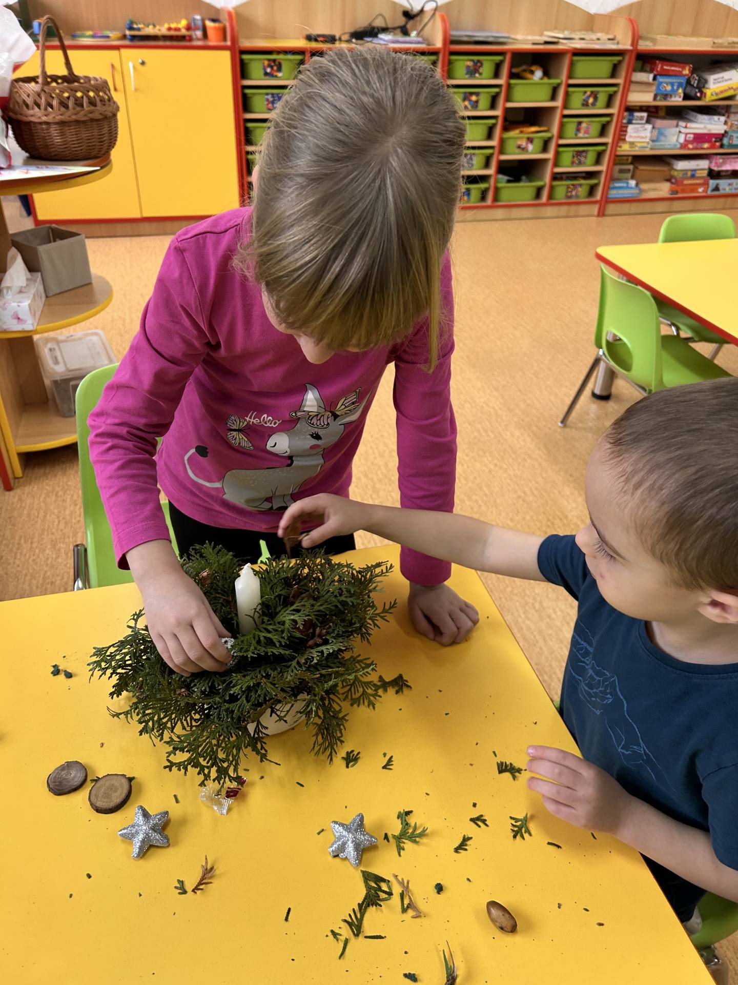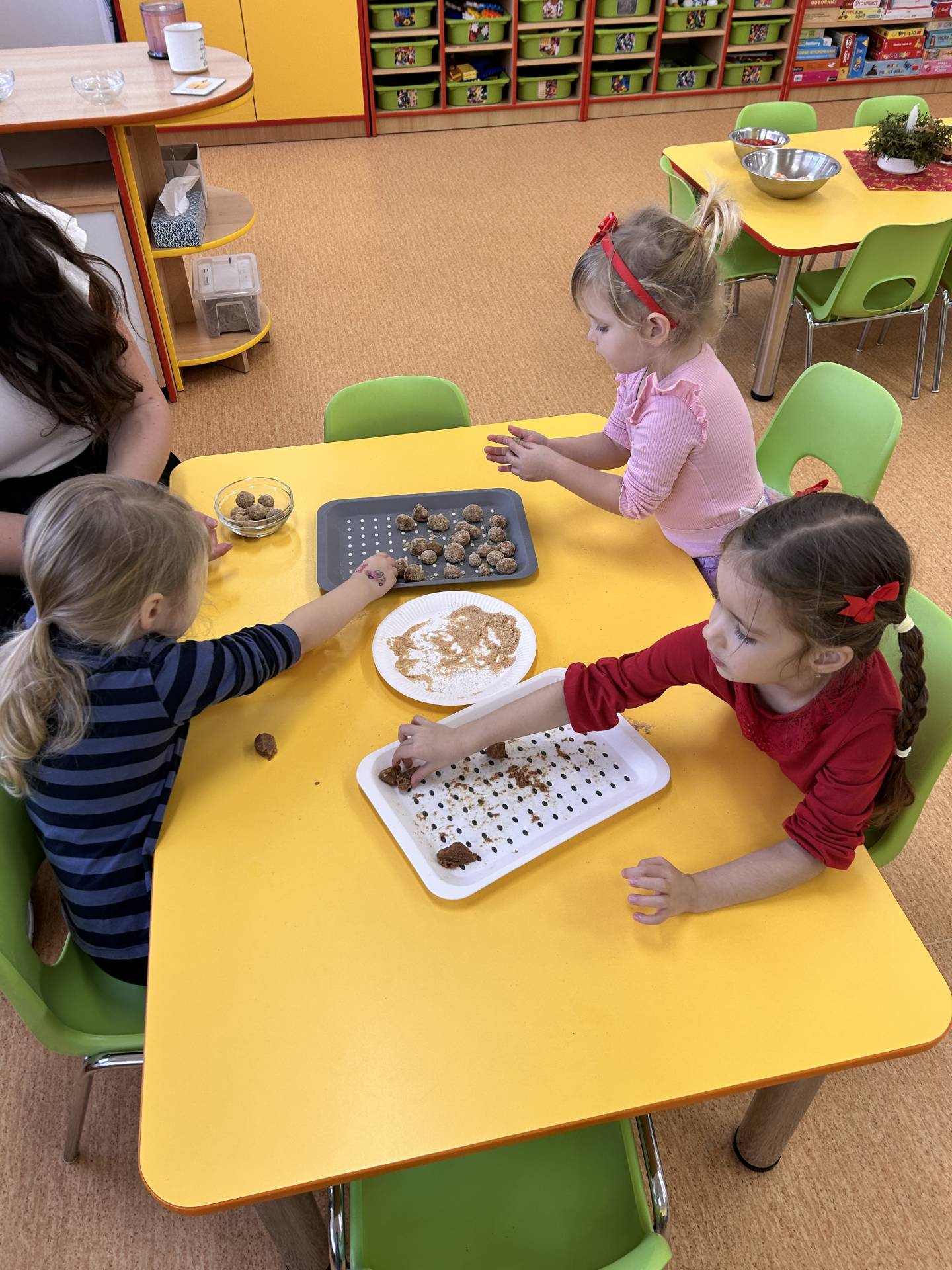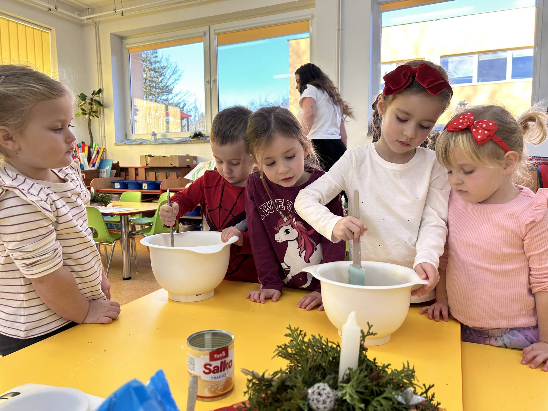 Stihli jsme vánoční besídku, návštěvu zámku a nechybělo ani tvoření. Vyrobili jsme si vánoční svícny, kterými jsme ozdobili stolečky. Velký úspěch mělo také společné vyrábění nepečených cukrovinek – sladkých kuliček, které si děti samy tvarovaly a s nadšením ochutnávaly. Procvičily si jemnou motoriku, trpělivost i spolupráci a zároveň si užily radost z vlastního výtvoru.