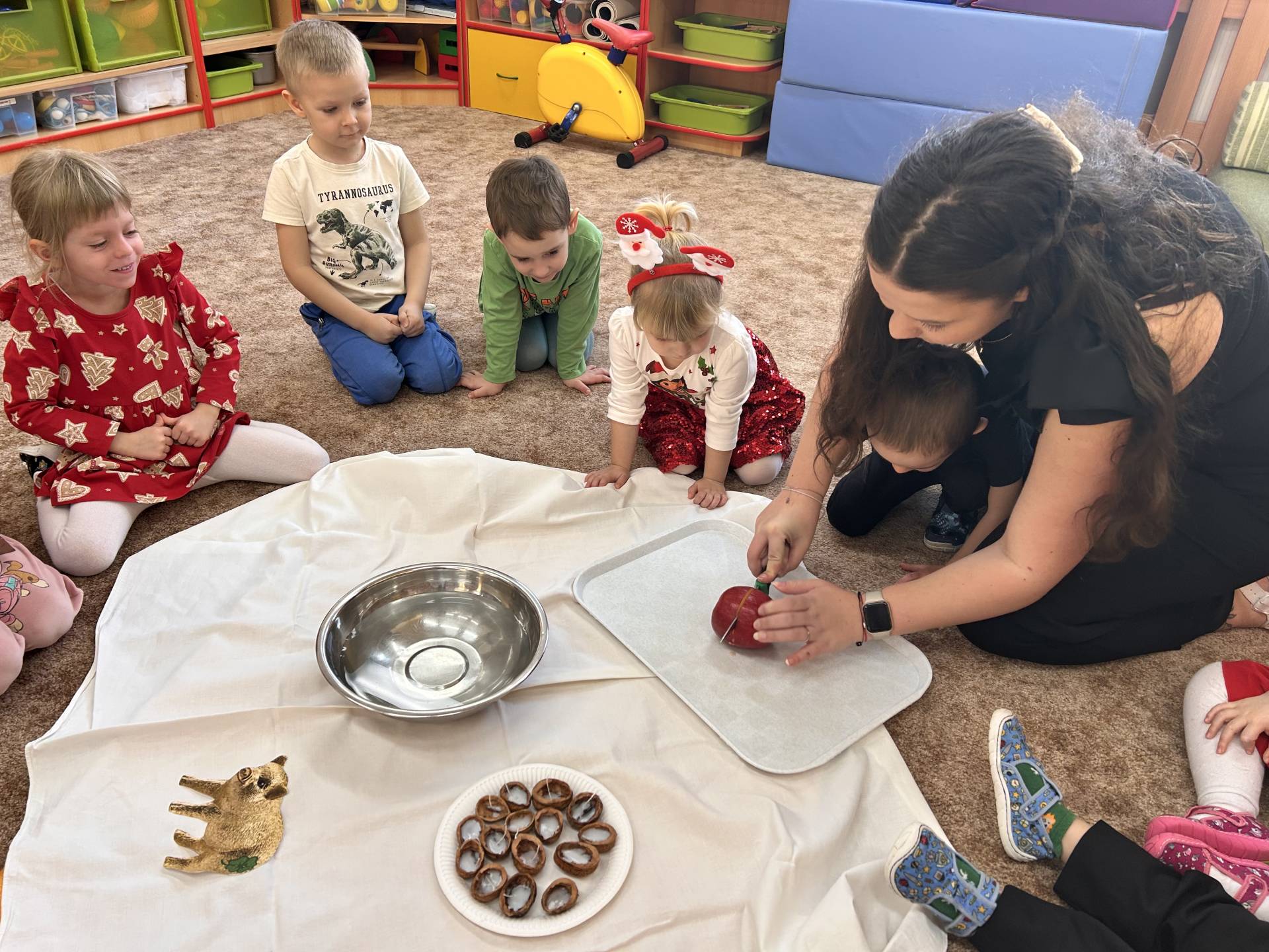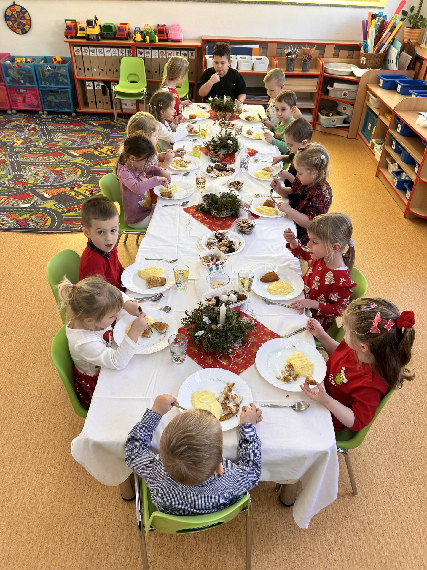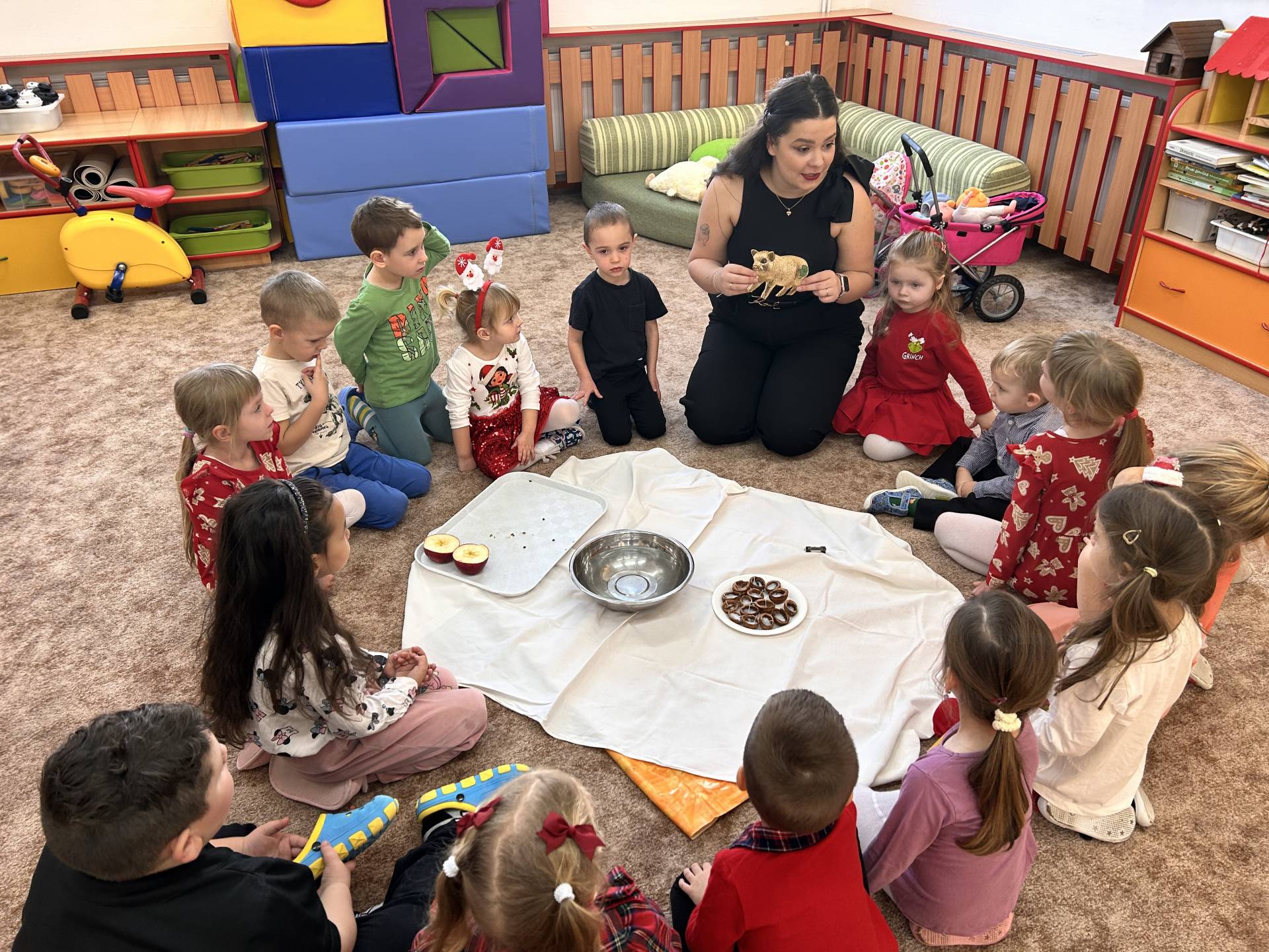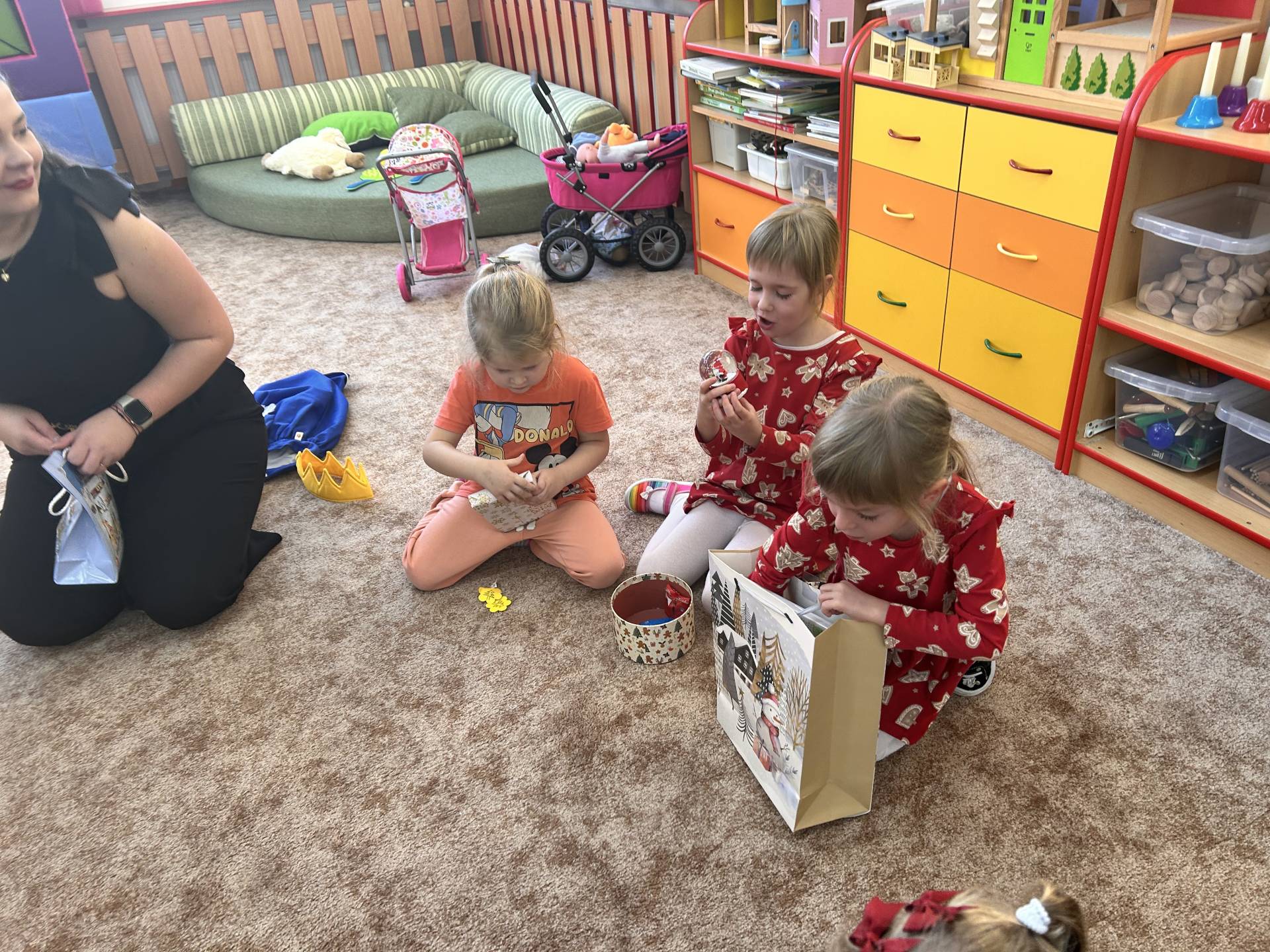 Vyvrcholením celého prosince bylo štědré dopoledne. Do školky přišel “školkový” Ježíšek a přinesl dětem dárečky. Losovali jsme si dáreček od kamaráda, dodržovali vánoční tradice, ochutnávali cukroví, povídali si o Vánocích a užívali si klidnou, slavnostní atmosféru při poslechu koled. Dětská radost, rozzářené oči a upřímné nadšení byly tou nejkrásnější odměnou.
