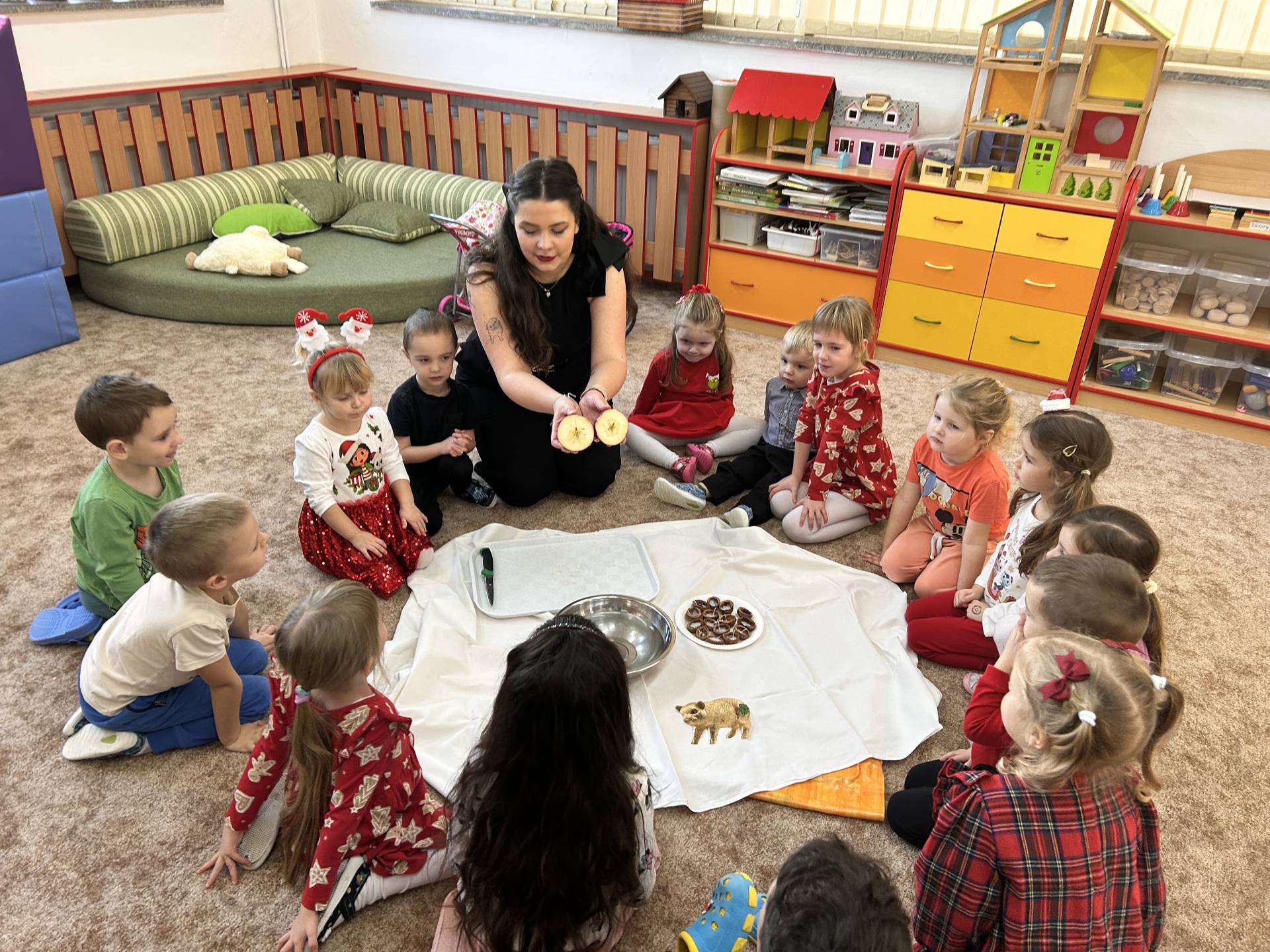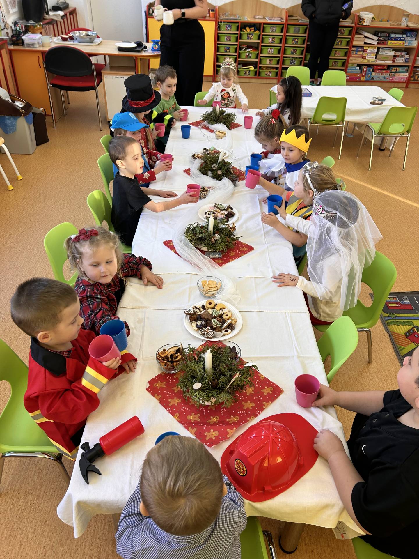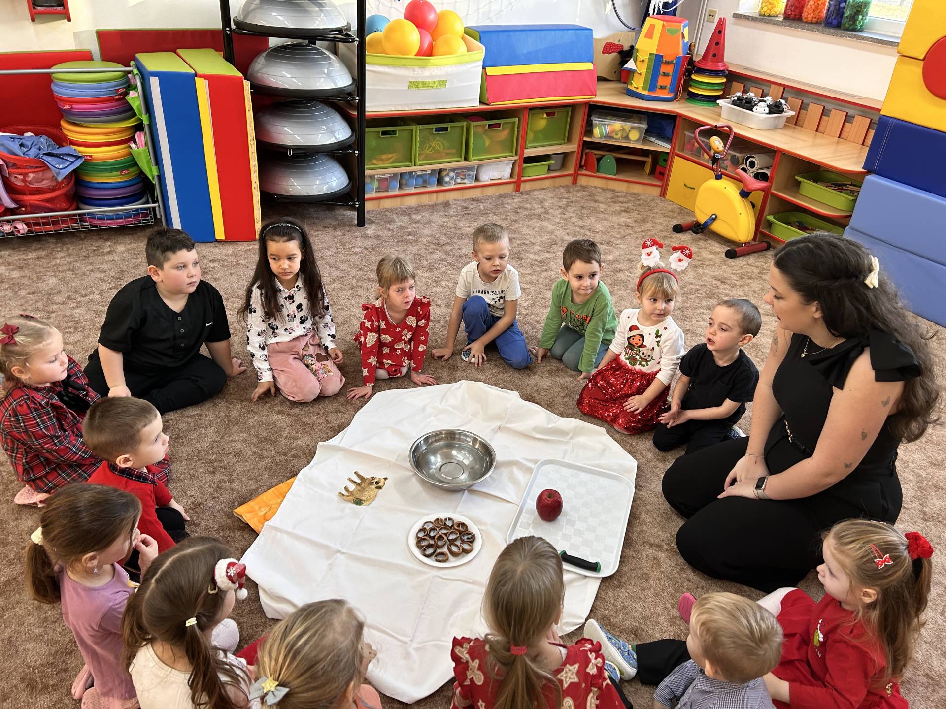 Vyvrcholením celého prosince bylo štědré dopoledne. Do školky přišel “školkový” Ježíšek a přinesl dětem dárečky. Losovali jsme si dáreček od kamaráda, dodržovali vánoční tradice, ochutnávali cukroví, povídali si o Vánocích a užívali si klidnou, slavnostní atmosféru při poslechu koled. Dětská radost, rozzářené oči a upřímné nadšení byly tou nejkrásnější odměnou.