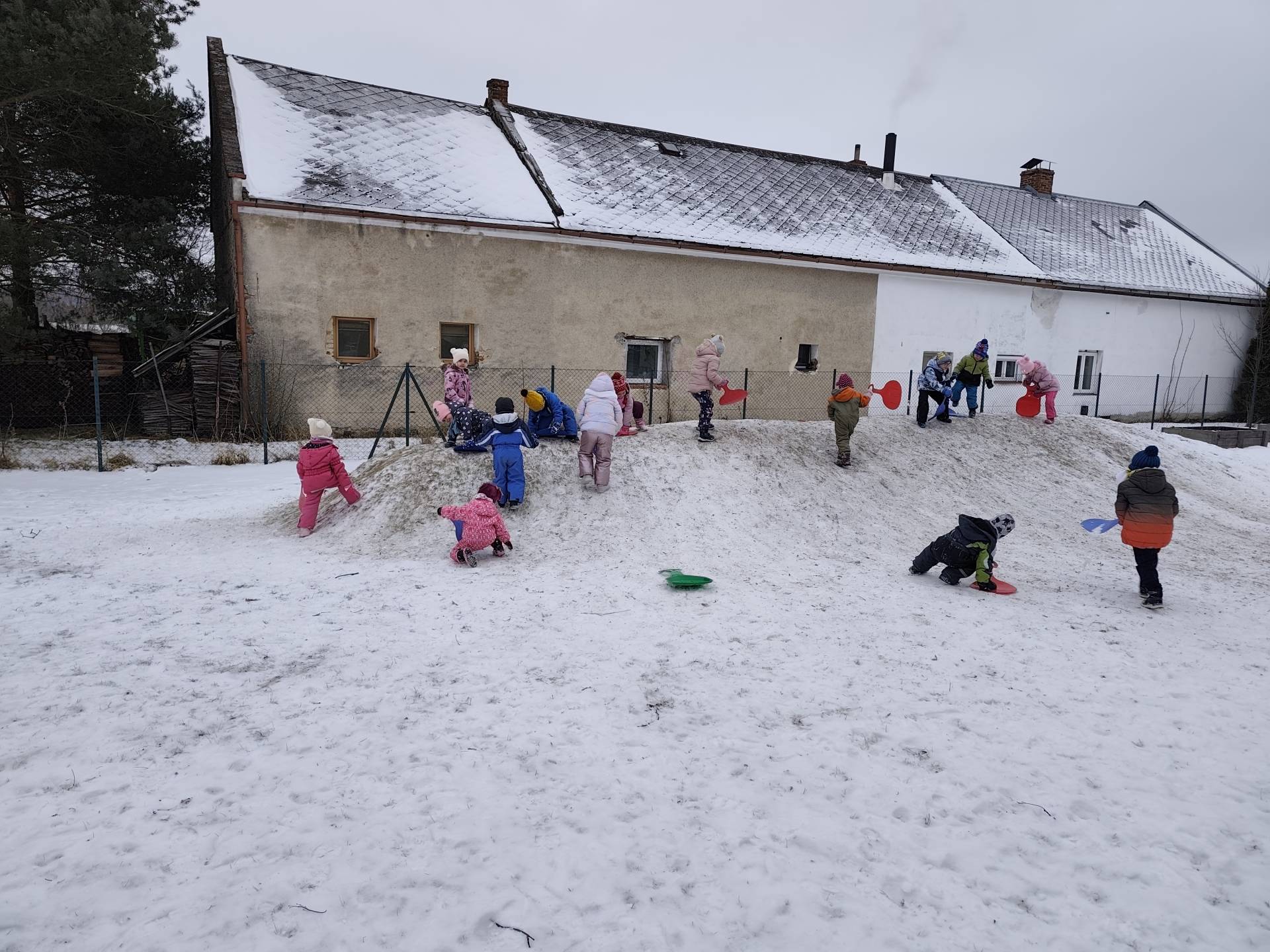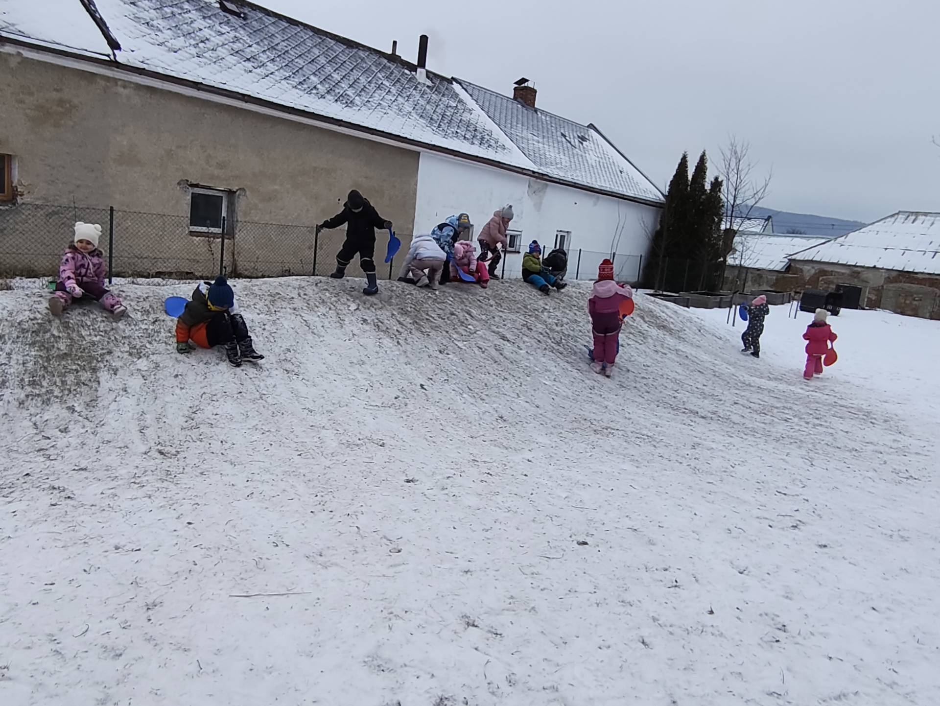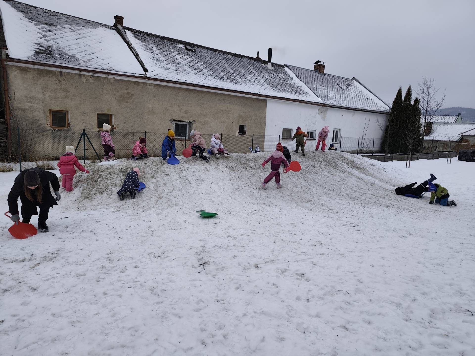 Na zimu jsme připraveni a zimní radovánky si užíváme. Běháme a řádíme na školní zahradě, zdoláváme přírodní překážky, s vervou a chutí sjíždíme na lopatách kopec. Doprovází nás spousta smíchu, kotrmelců a legrace.