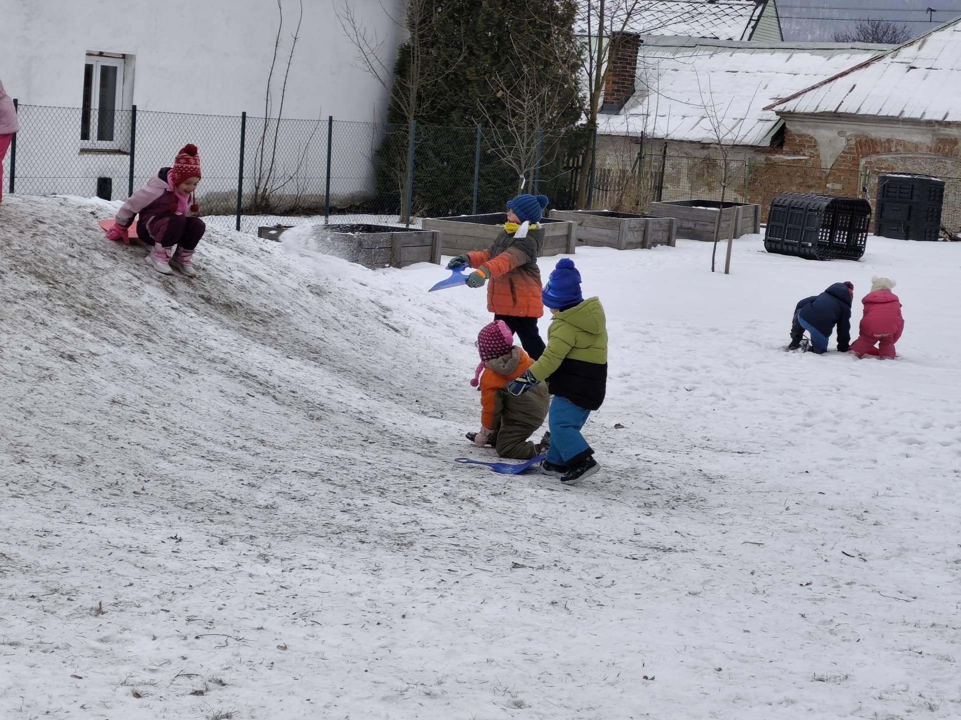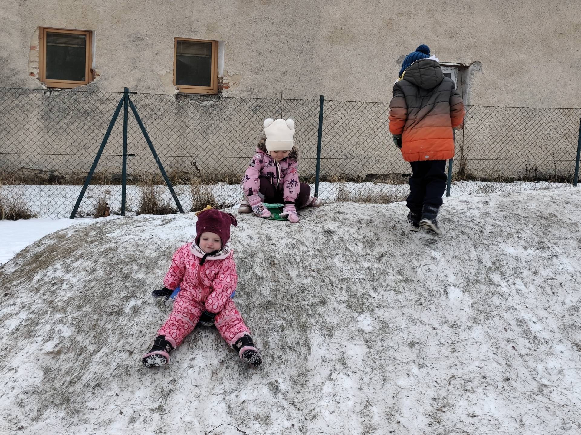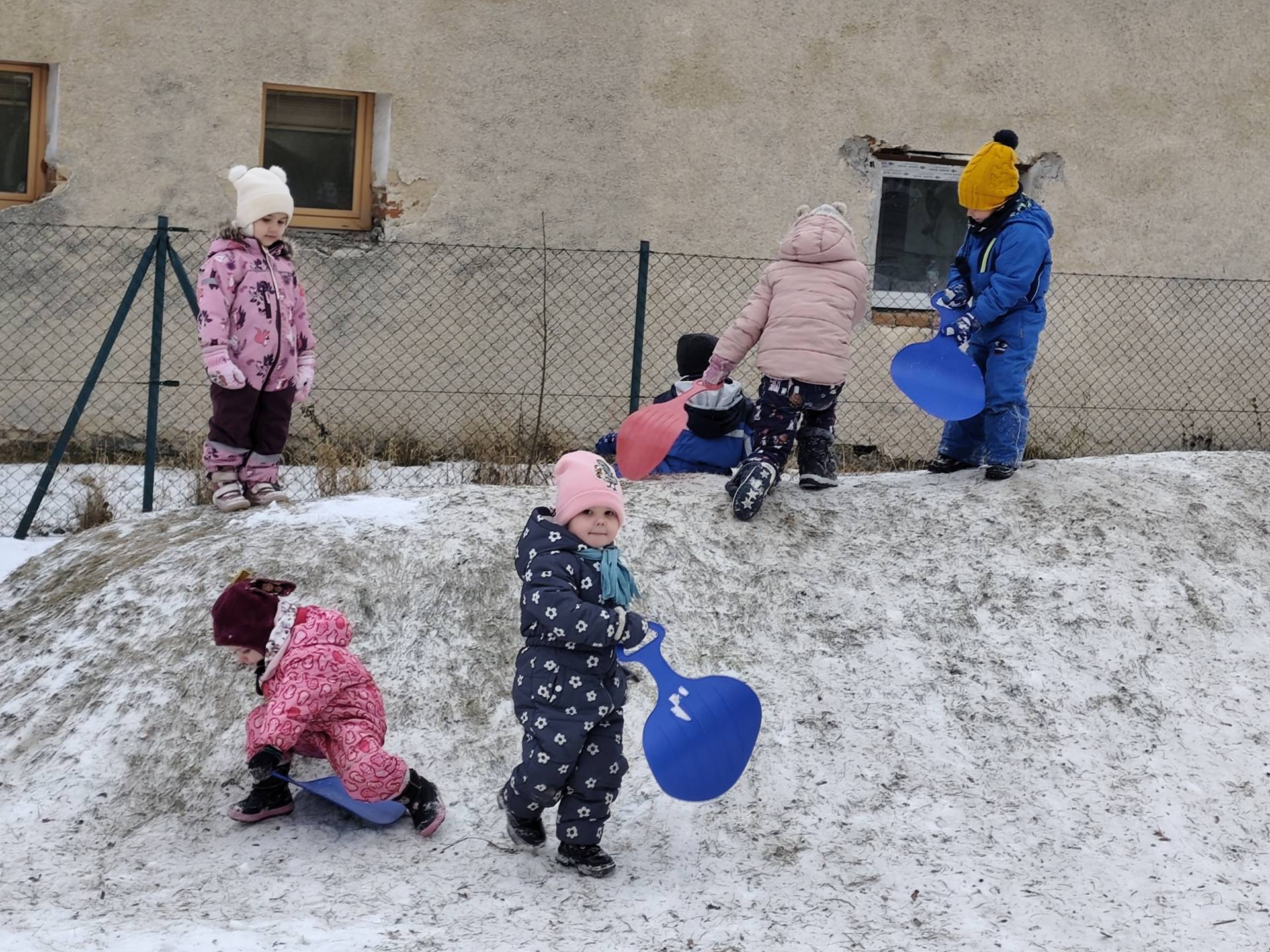 Na zimu jsme připraveni a zimní radovánky si užíváme. Běháme a řádíme na školní zahradě, zdoláváme přírodní překážky, s vervou a chutí sjíždíme na lopatách kopec. Doprovází nás spousta smíchu, kotrmelců a legrace.