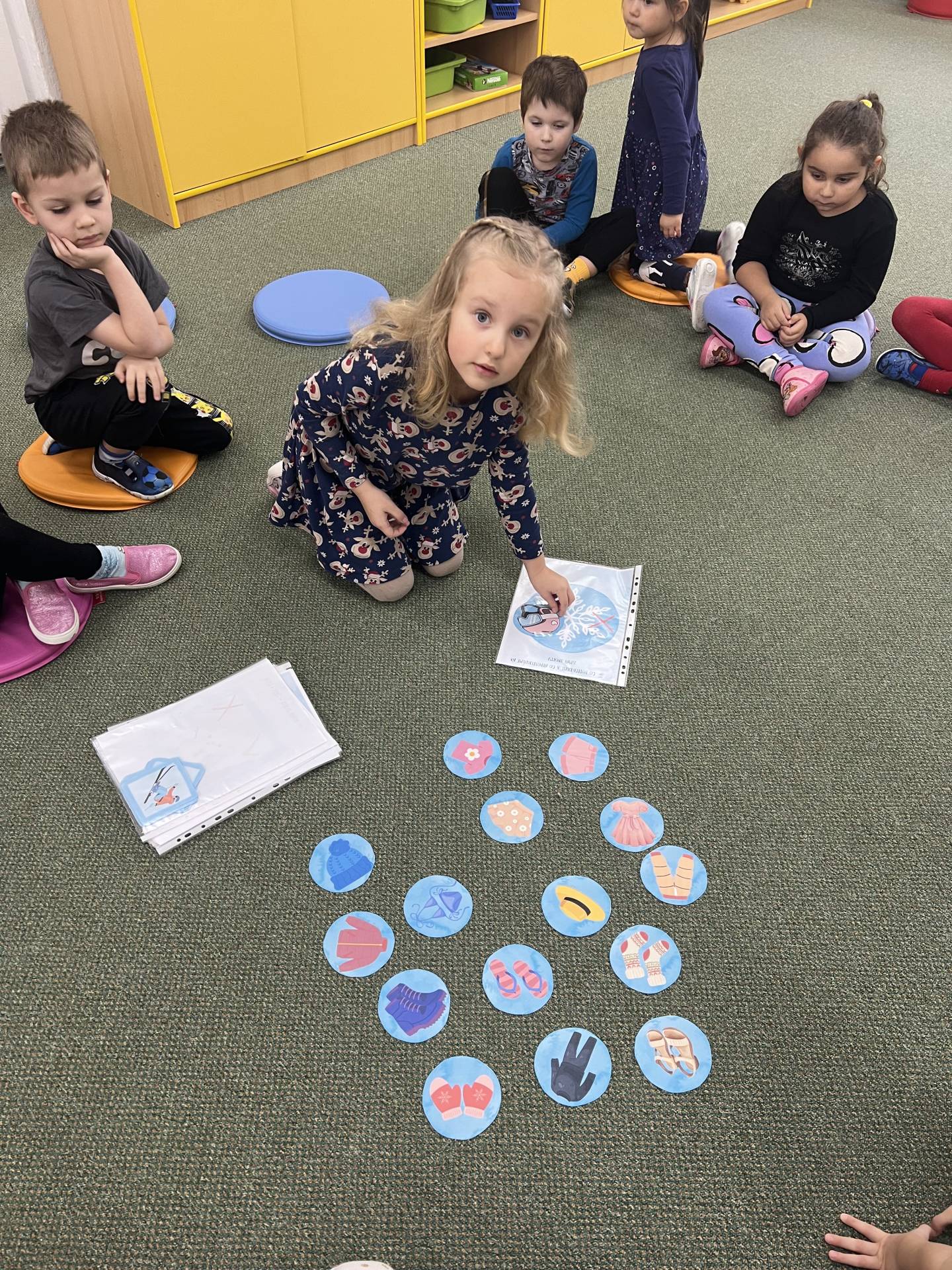 Povídali jsme si o zimním období a o tom, jaké oblečení je v zimě důležité. Děti poznávaly jednotlivé části zimního oblečení, některé si také vyrobily různými výtvarnými technikami. Povídali jame si o tom, proč je důležité v mrazivém počasí nosit čepici, rukavice nebo šálu, a trénovaly správné oblékání. Nechyběly ani tematické hry, písničky a básničky se zimní tematikou.