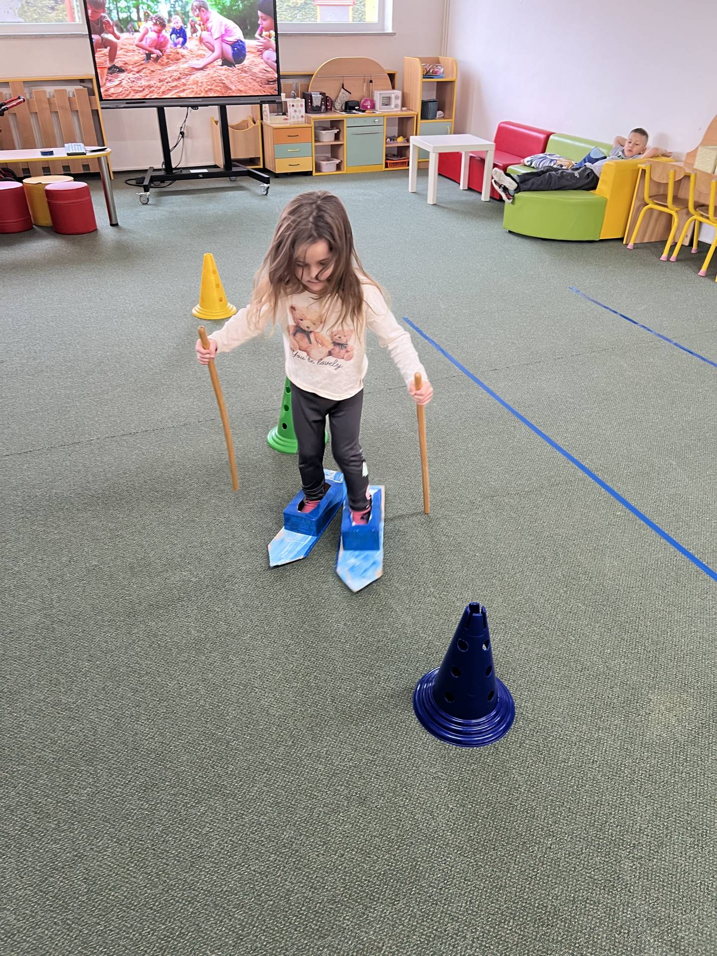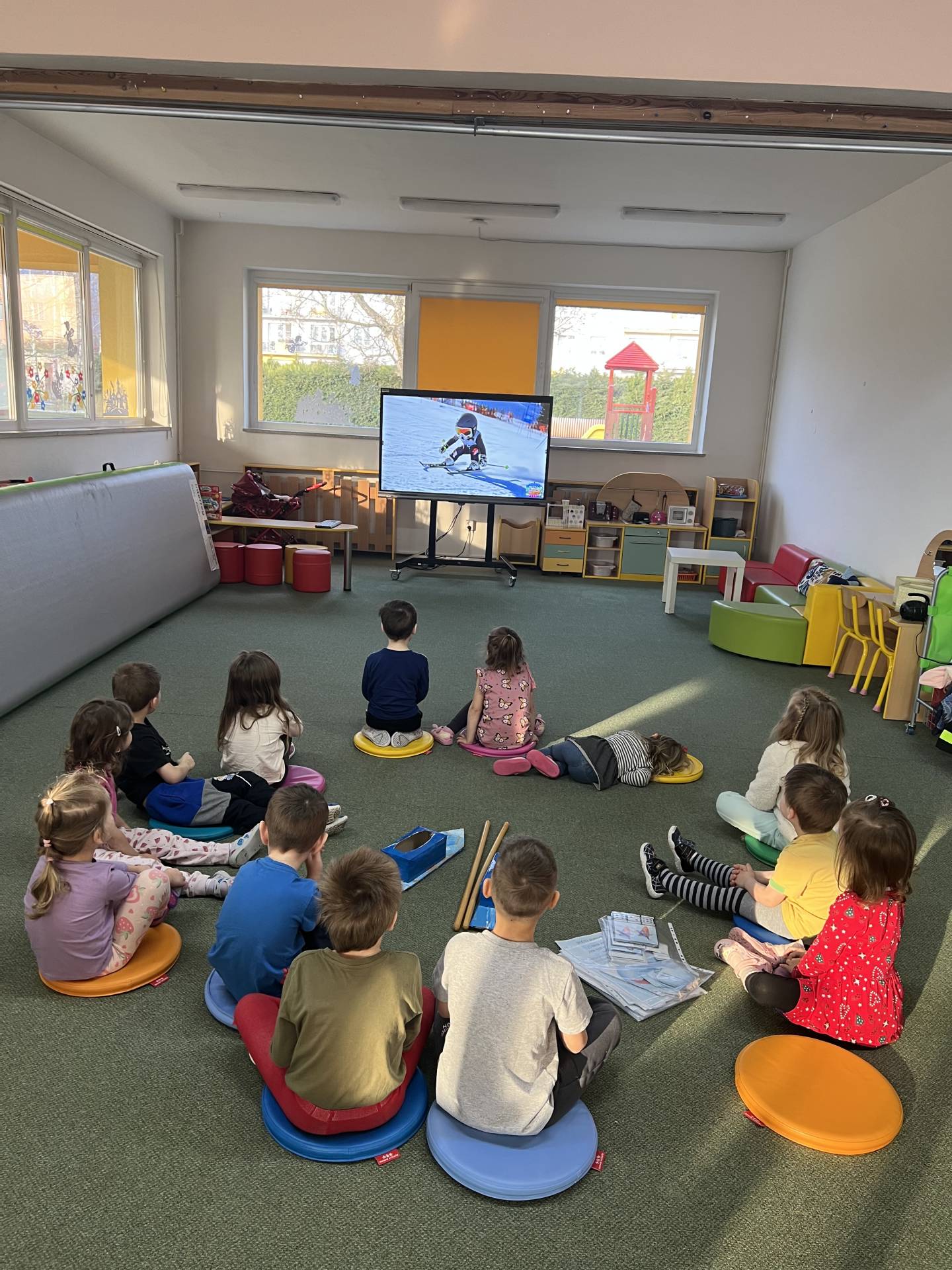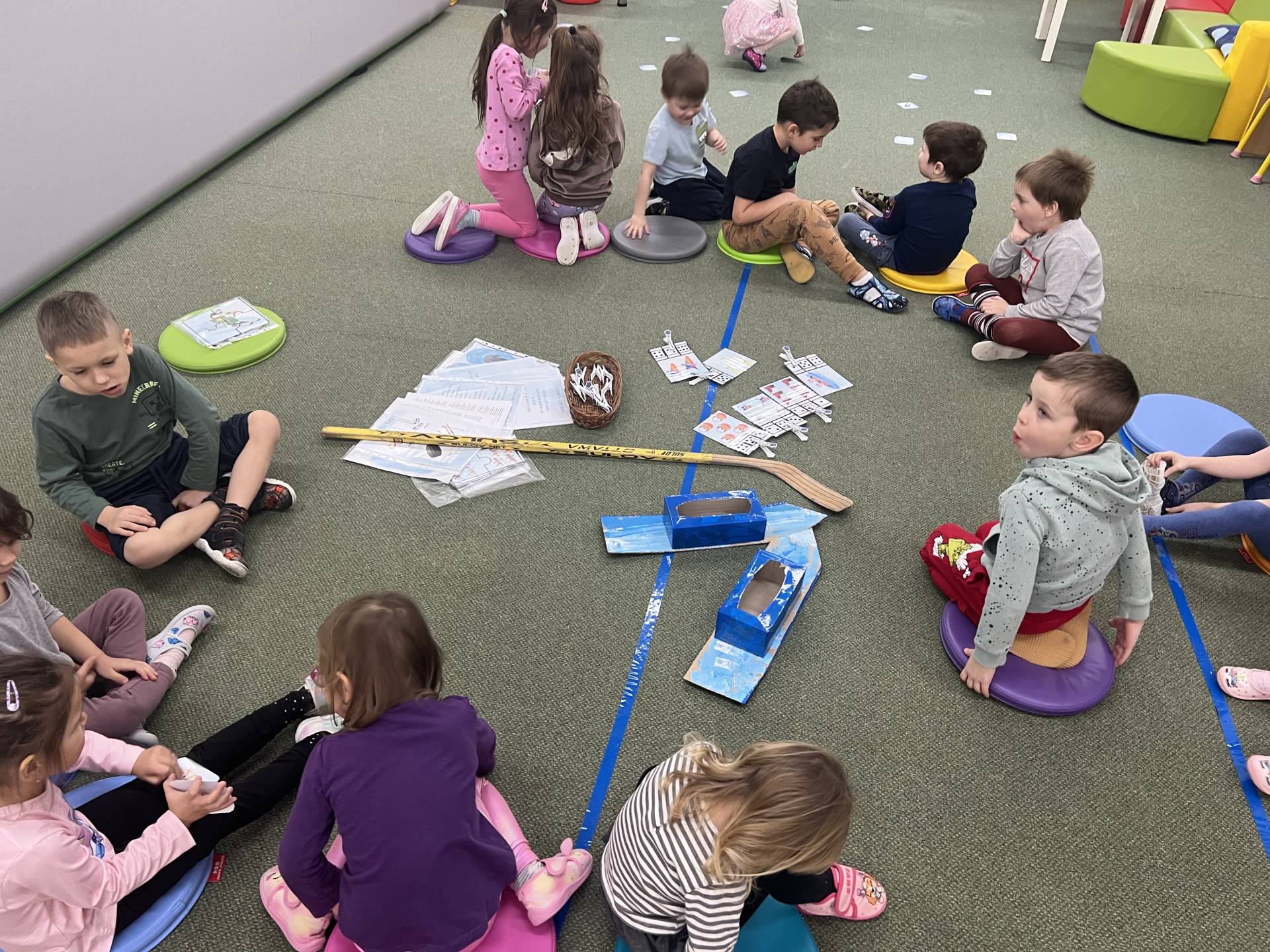 Velkým tématem byla také zimní olympiáda. Děti se dozvěděly, jaké sporty patří mezi zimní disciplíny, a samy si některé z nich vyzkoušely alespoň formou pohybových her. Největší nadšení však přinesl hokej – děti si mohly zahrát s opravdovou hokejkou, vyzkoušely si střelbu na branku i týmovou spolupráci. Sportovní dopoledne bylo plné radosti, fandění a pohybu.