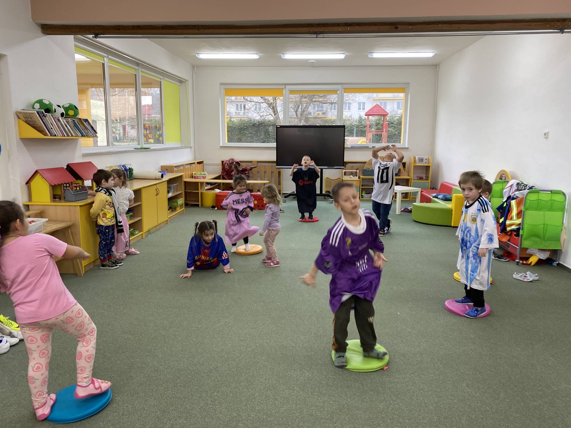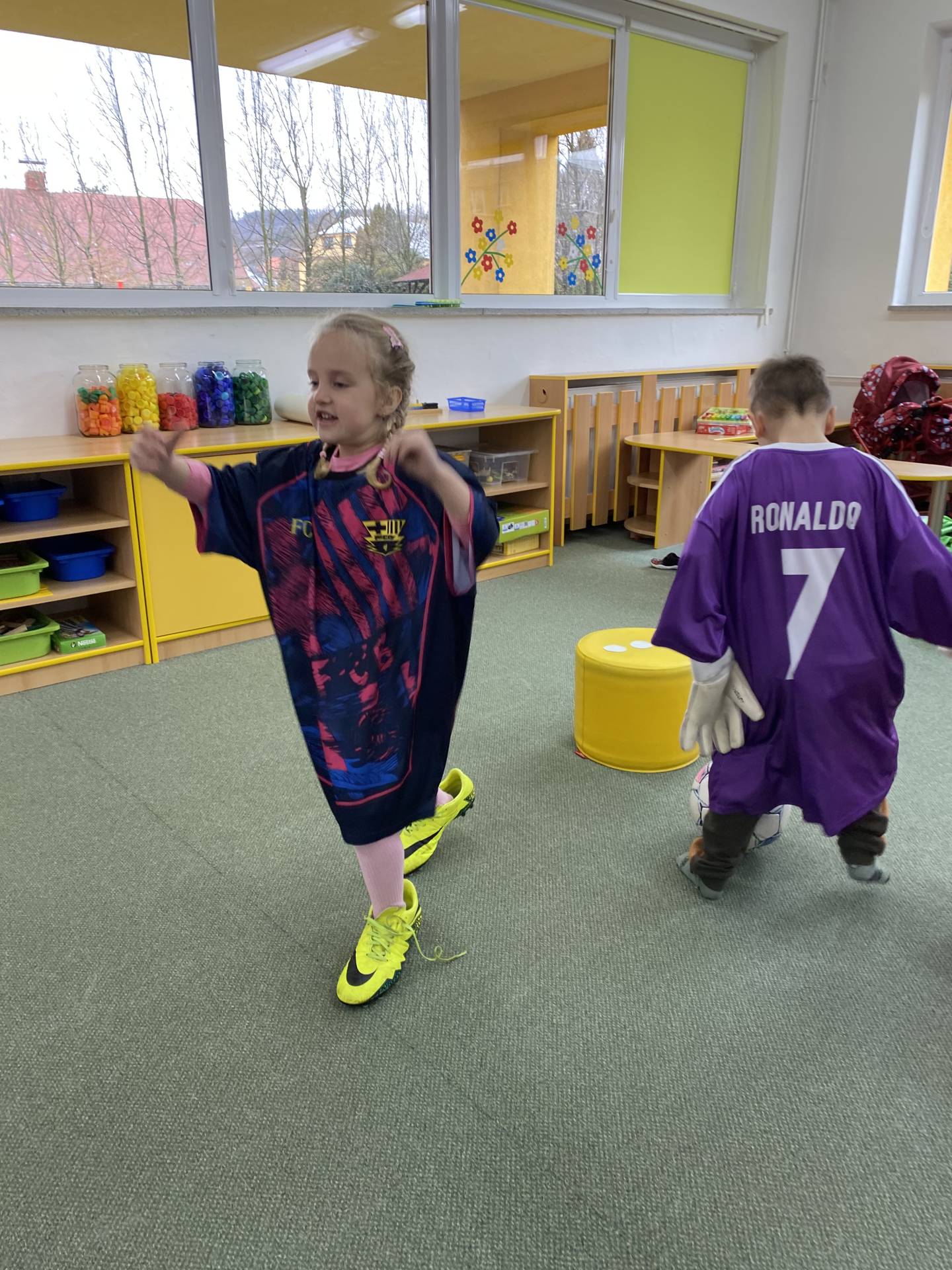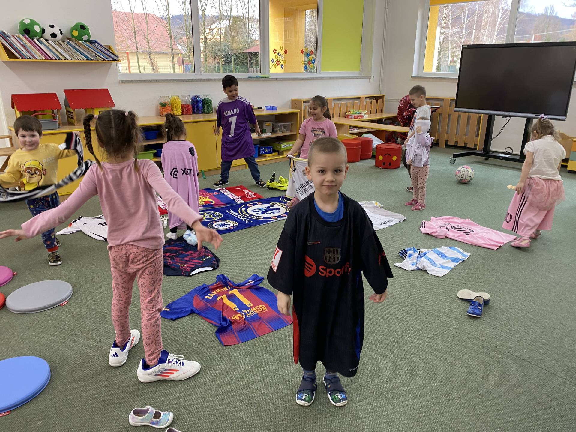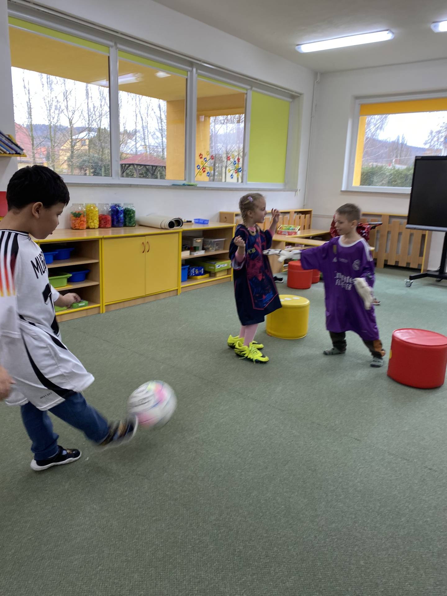 Nezapomněli jsme ani na řemesla a povolání, kdy si děti samy zvolily téma - Fotbalista. Děti si oblékly fotbalové dresy a vyzkoušely si roli fotbalistů. Trénovaly přihrávky, střelbu na branku i týmového ducha. Radost z pohybu byla vidět na každém kroku.
