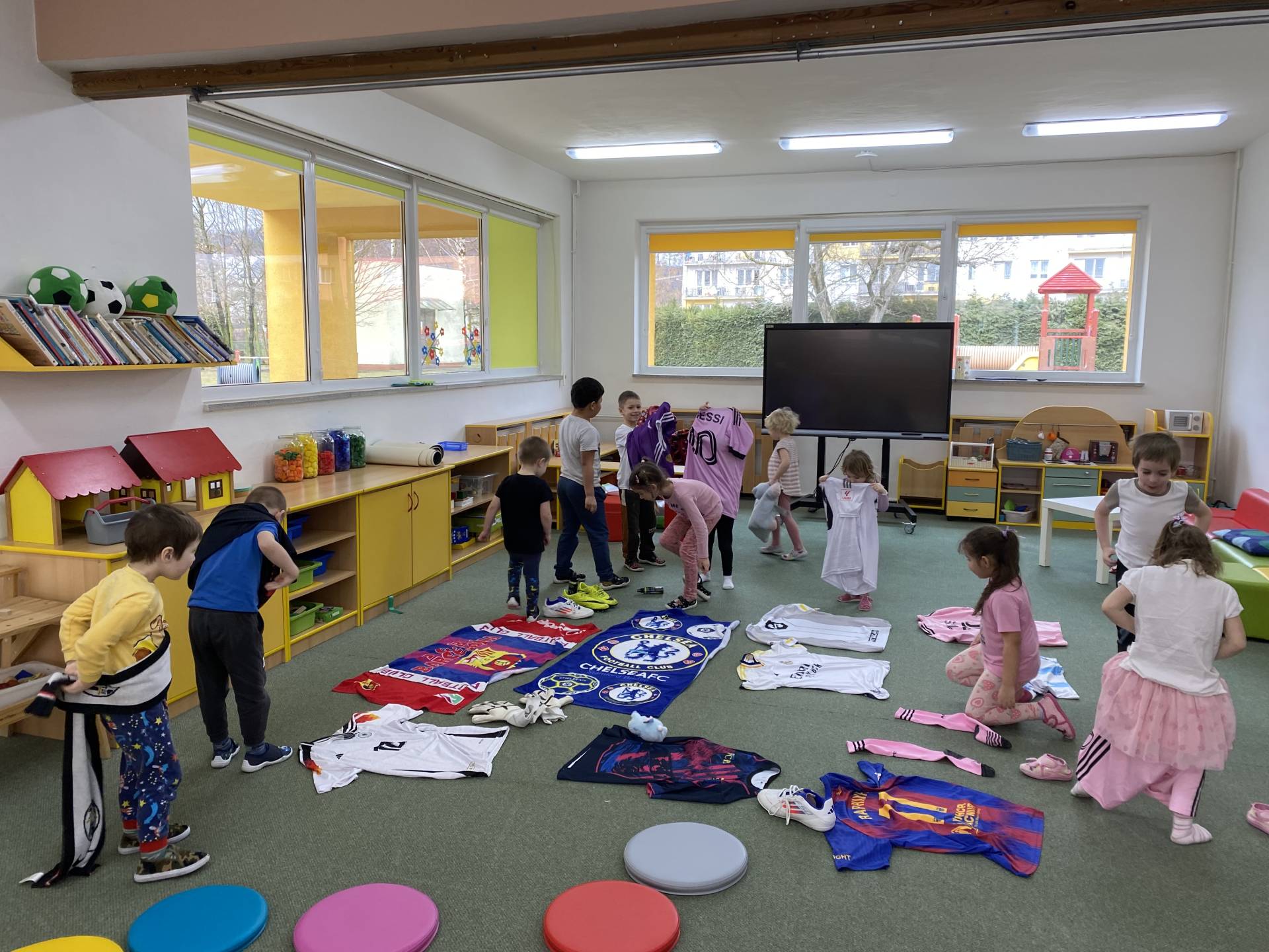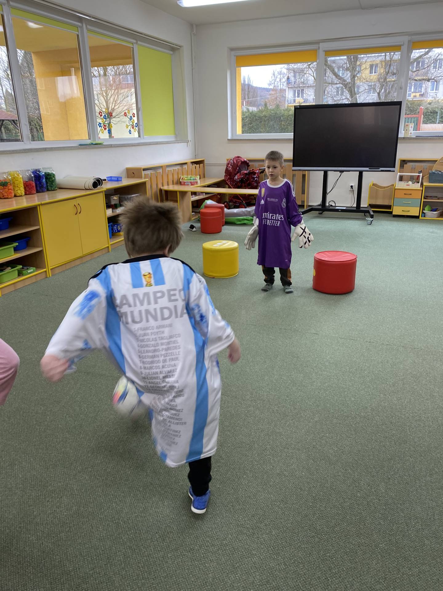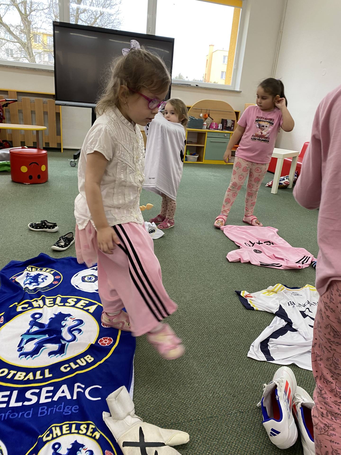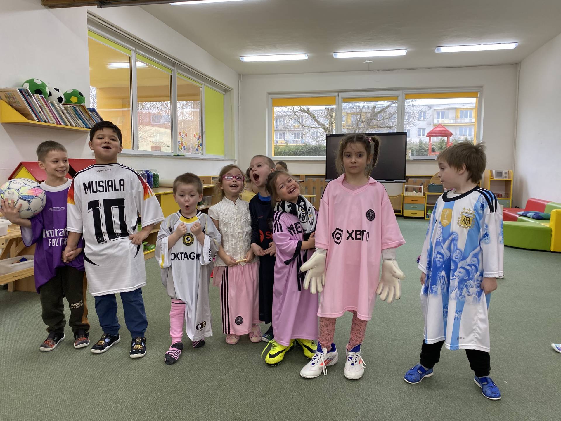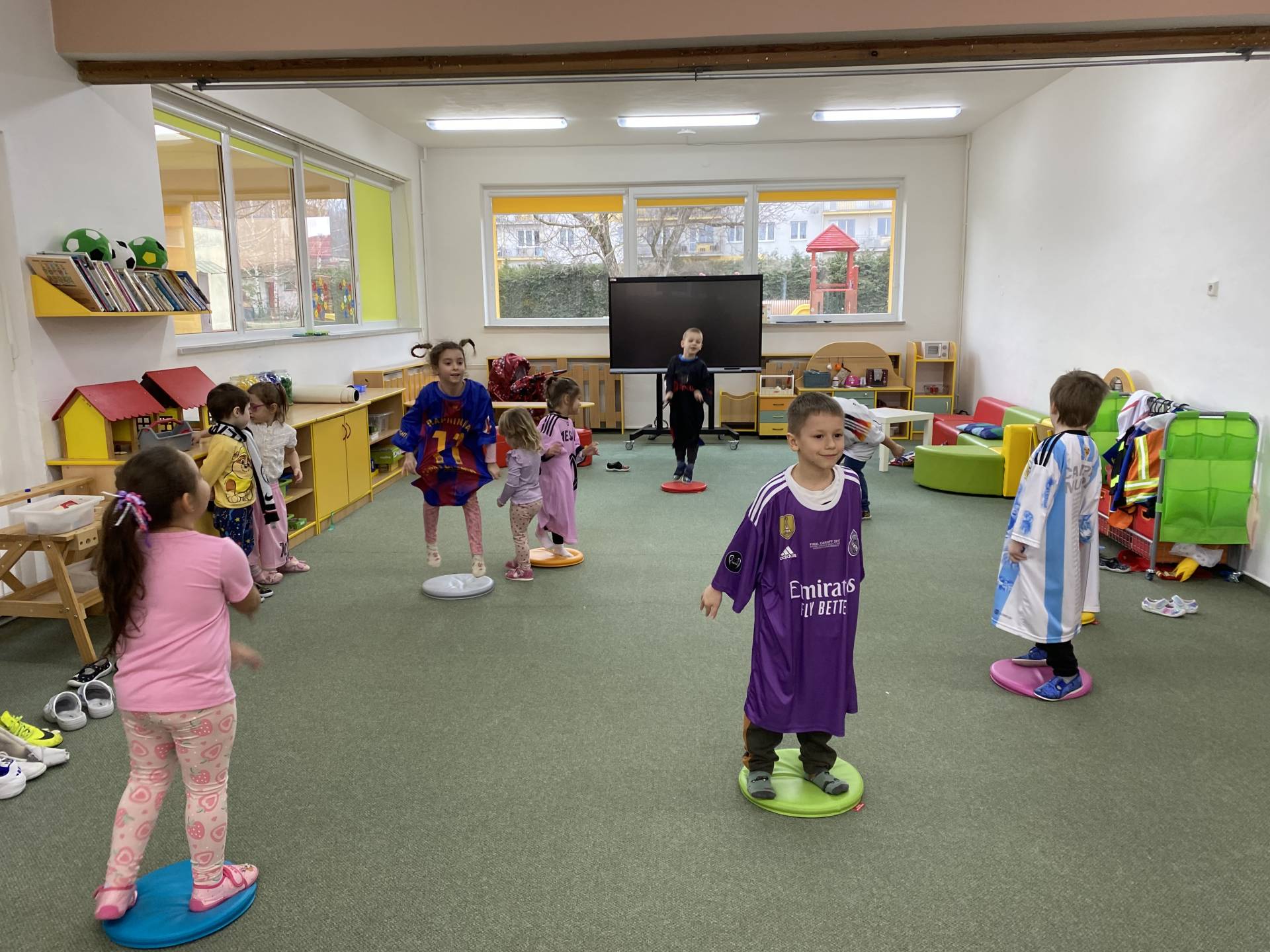Nezapomněli jsme ani na řemesla a povolání, kdy si děti samy zvolily téma - Fotbalista. Děti si oblékly fotbalové dresy a vyzkoušely si roli fotbalistů. Trénovaly přihrávky, střelbu na branku i týmového ducha. Radost z pohybu byla vidět na každém kroku.