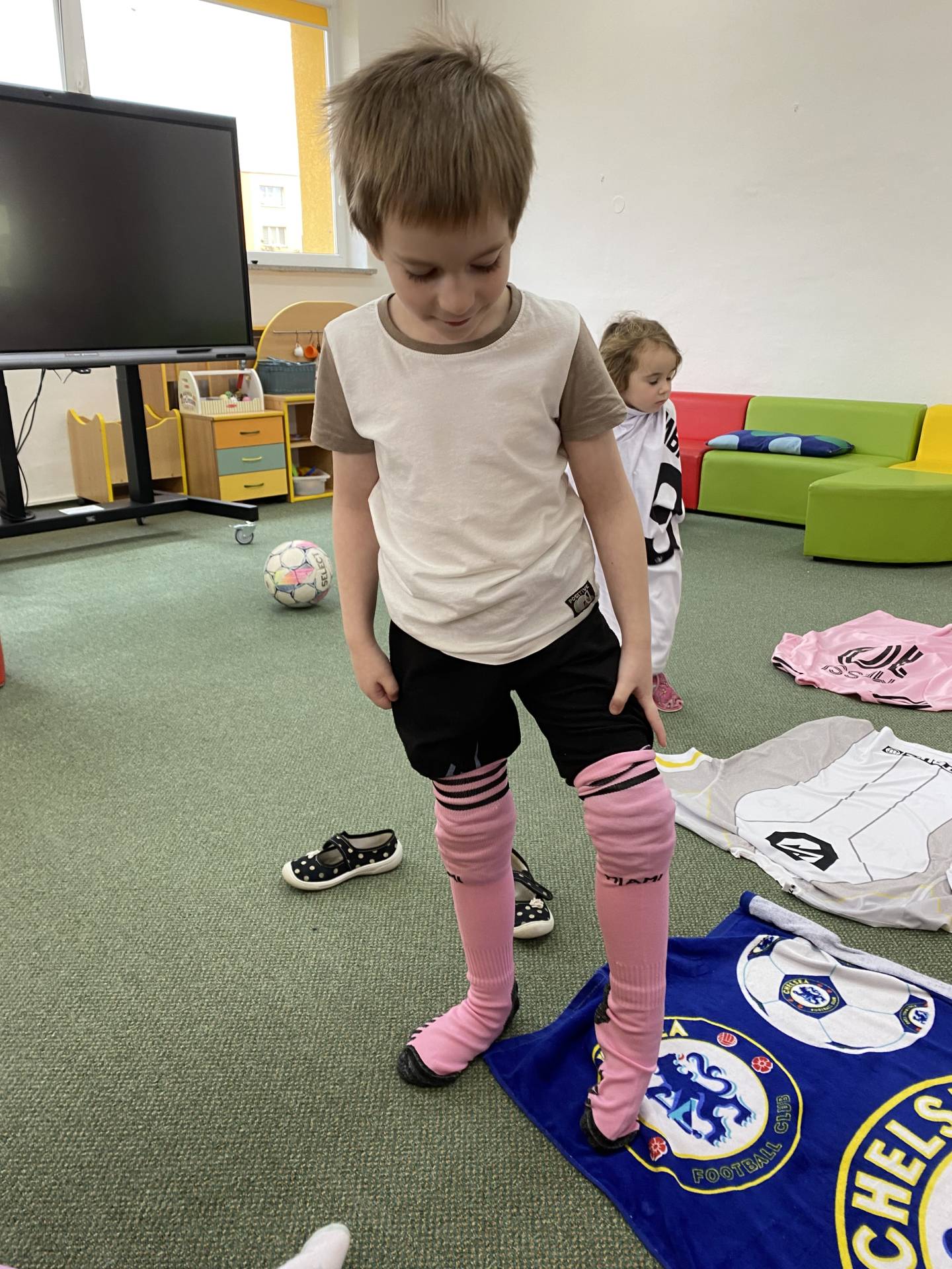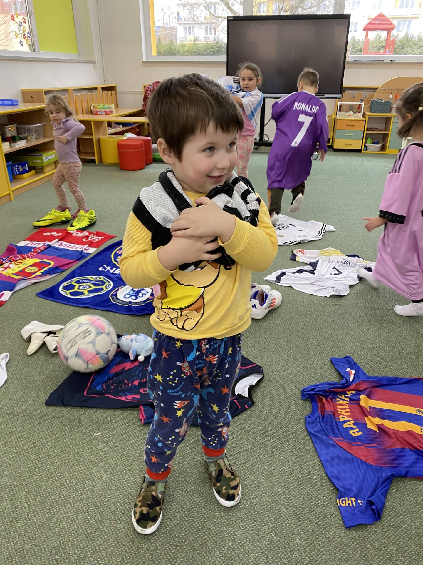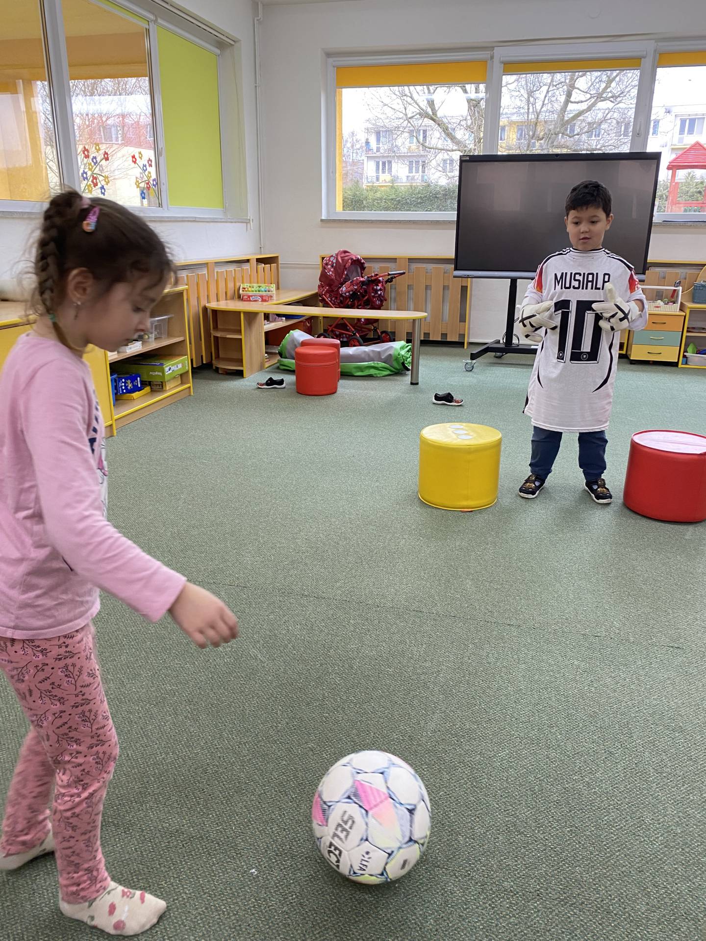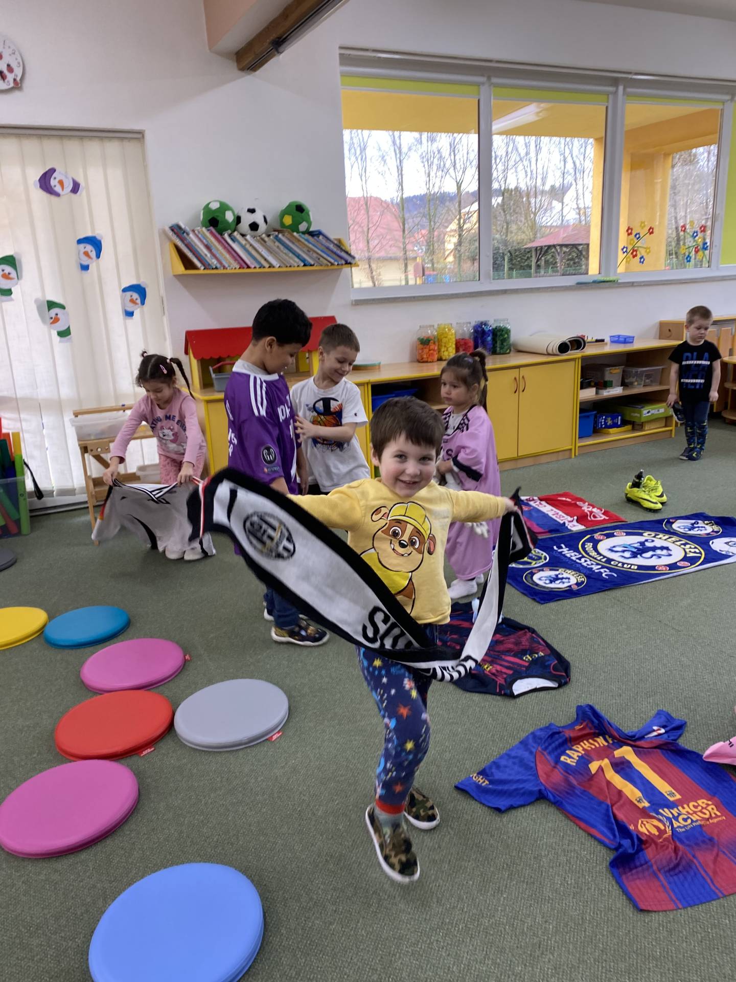 Nezapomněli jsme ani na řemesla a povolání, kdy si děti samy zvolily téma - Fotbalista. Děti si oblékly fotbalové dresy a vyzkoušely si roli fotbalistů. Trénovaly přihrávky, střelbu na branku i týmového ducha. Radost z pohybu byla vidět na každém kroku.