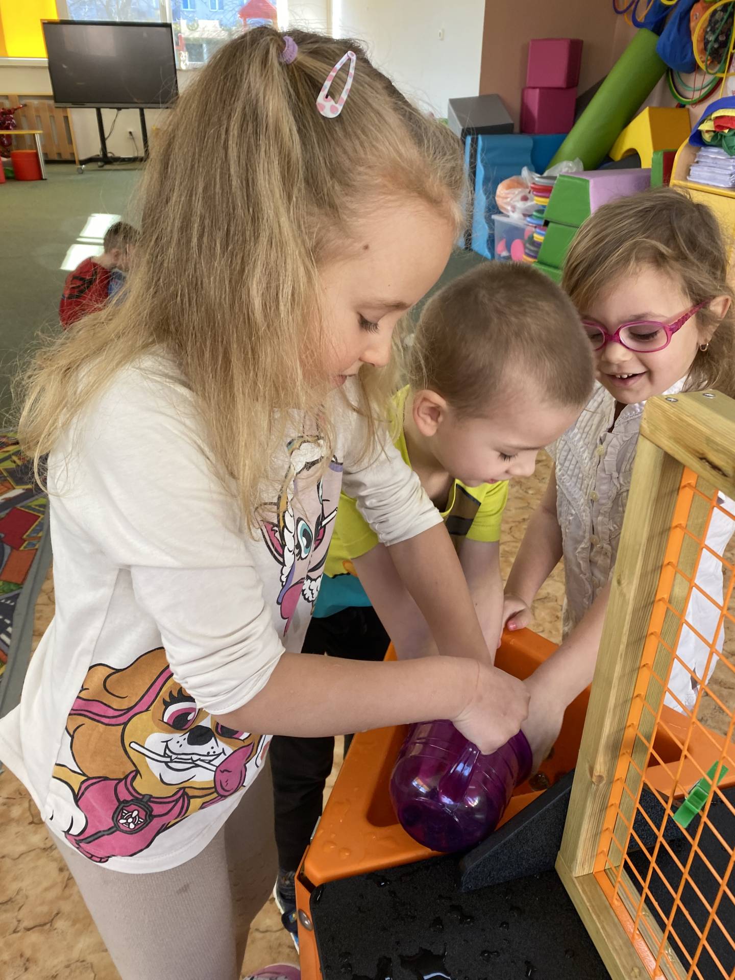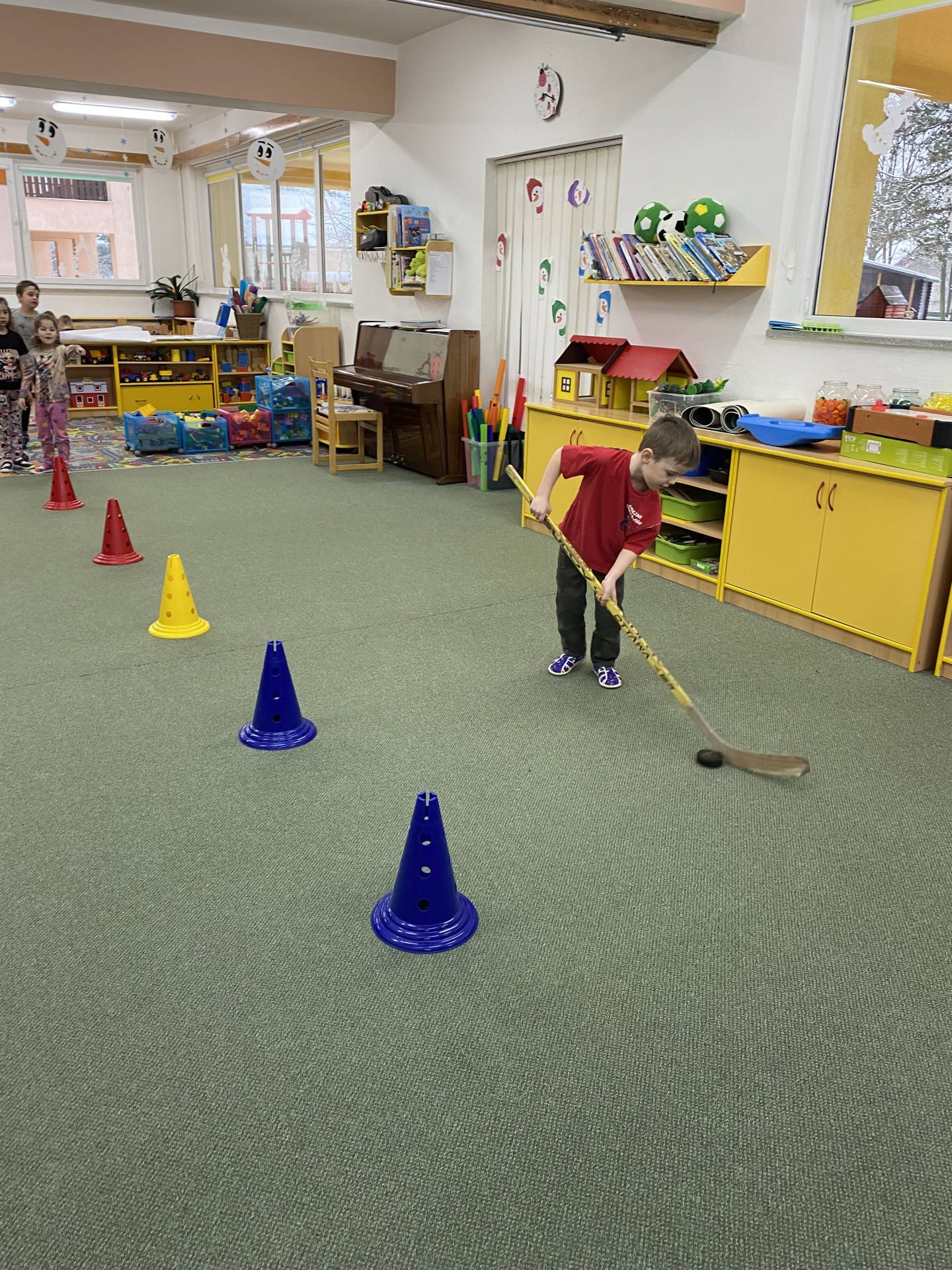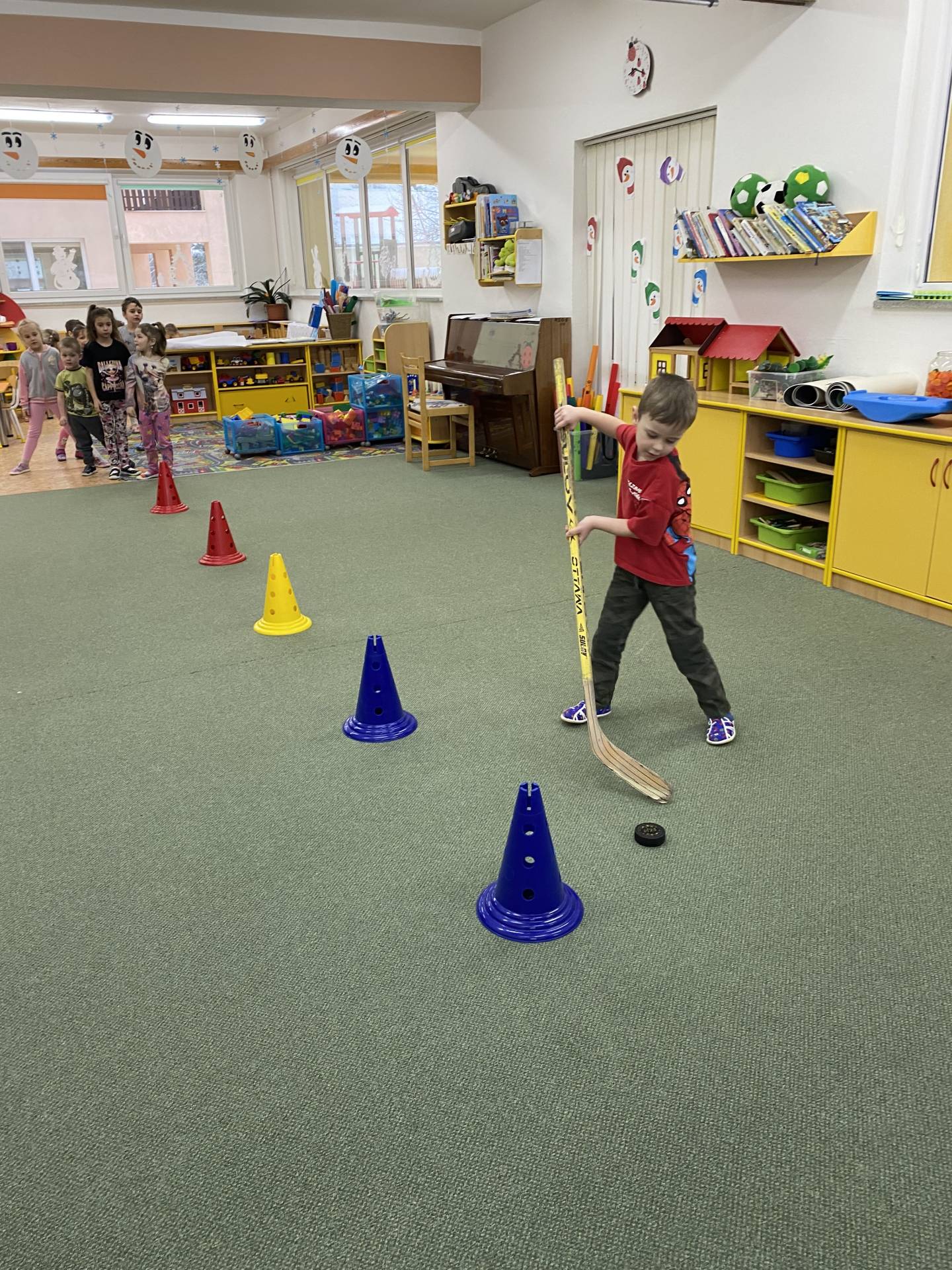 Velkým tématem byla také zimní olympiáda. Děti se dozvěděly, jaké sporty patří mezi zimní disciplíny, a samy si některé z nich vyzkoušely alespoň formou pohybových her. Největší nadšení však přinesl hokej – děti si mohly zahrát s opravdovou hokejkou, vyzkoušely si střelbu na branku i týmovou spolupráci. Sportovní dopoledne bylo plné radosti, fandění a pohybu.