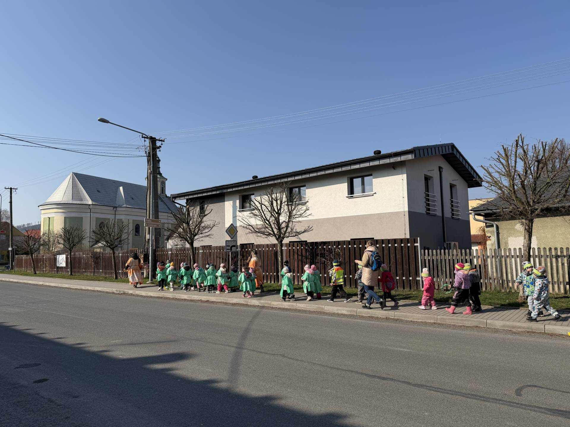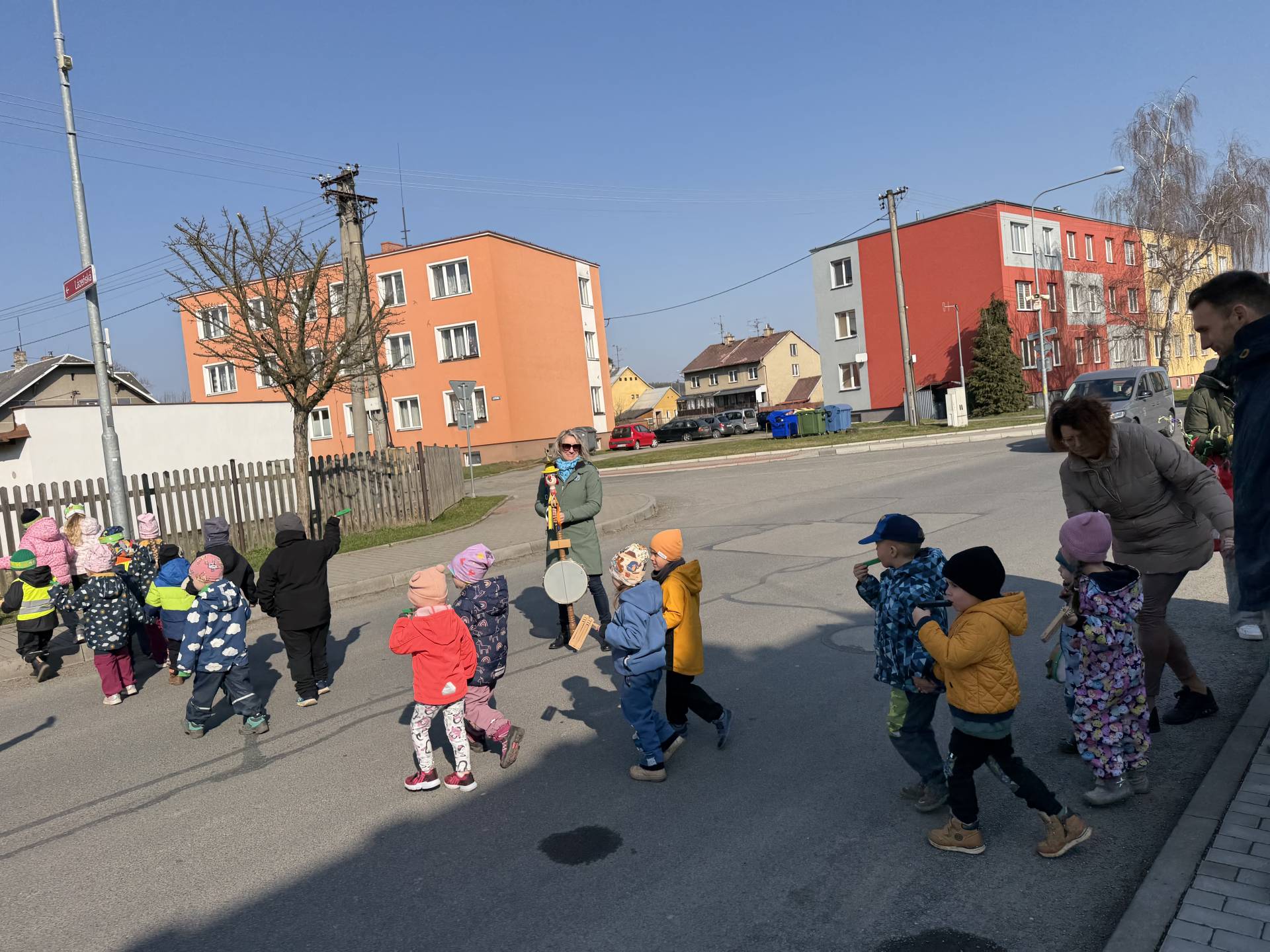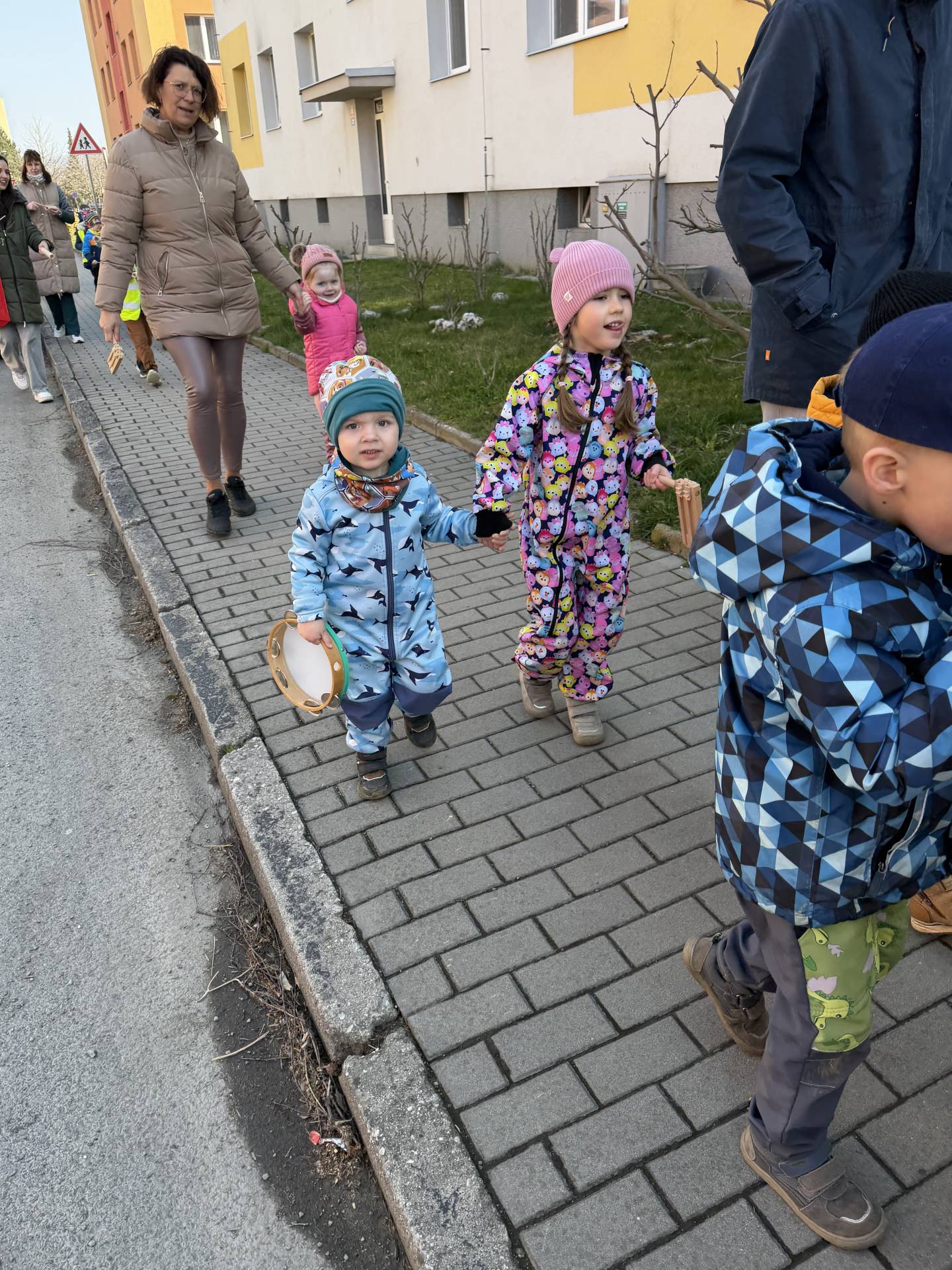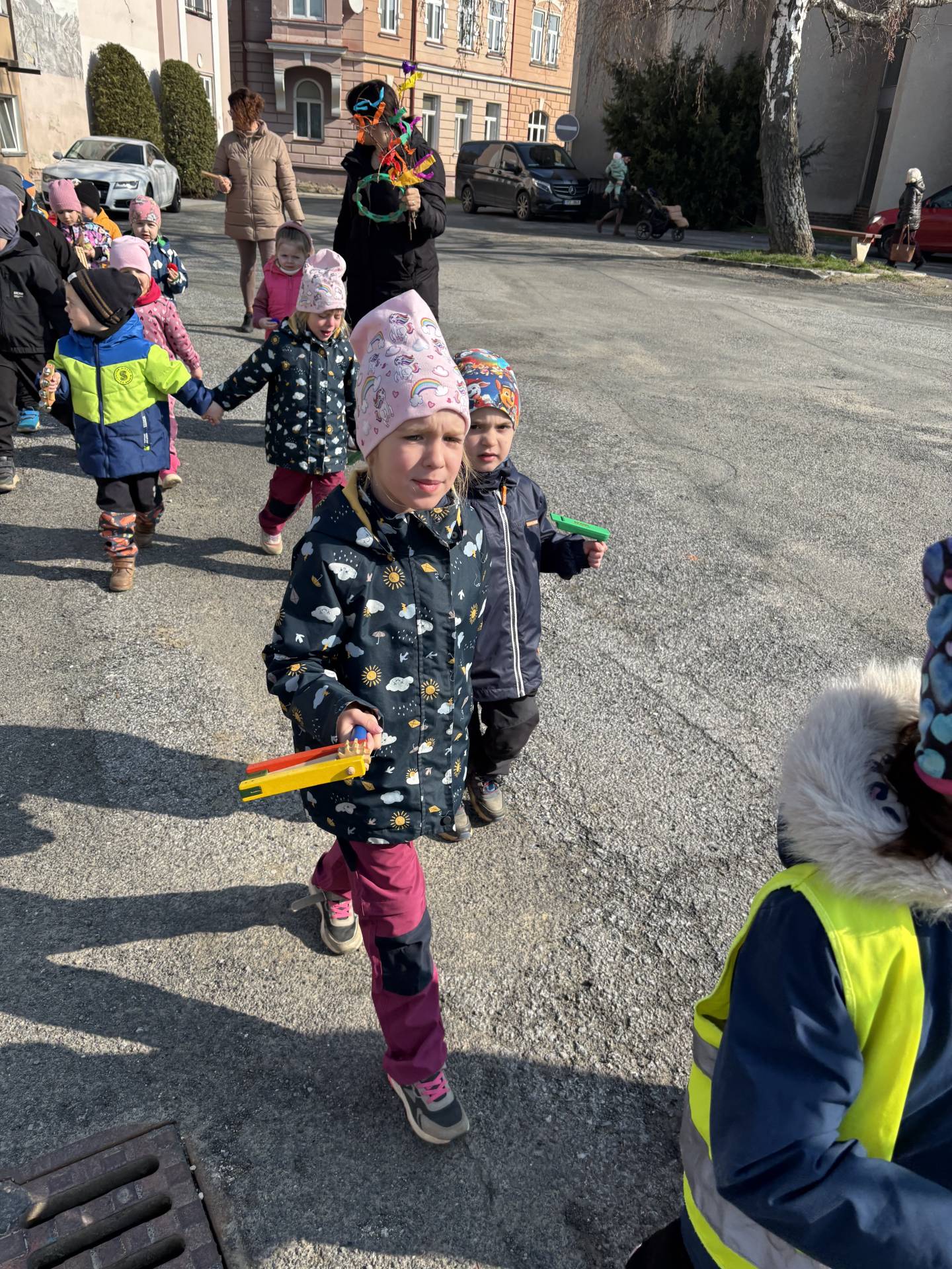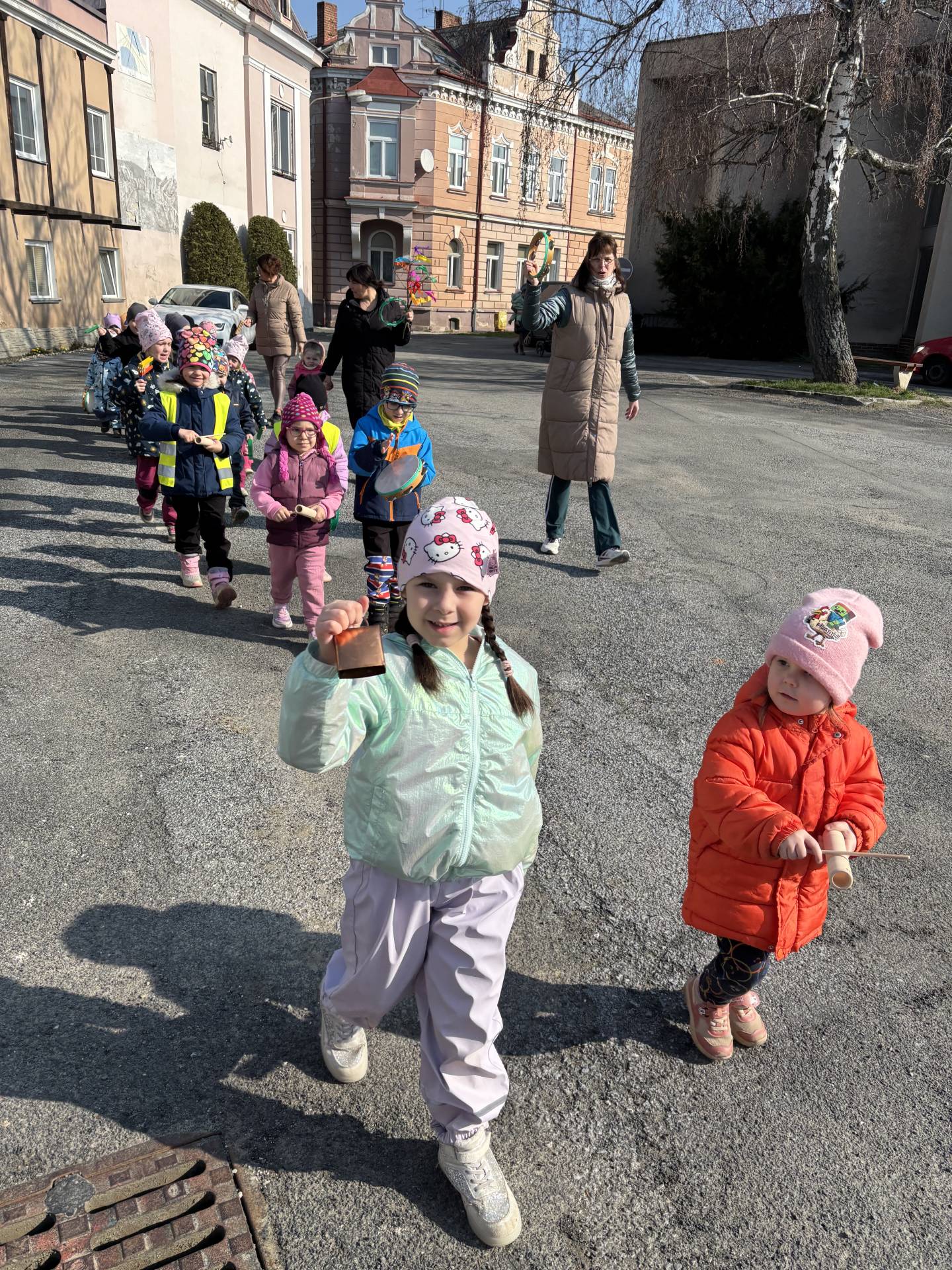 Hned dopoledne jsme se vydali na slavnostní průvod. Děti kráčely s nadšením, zpívaly jarní písně a nesly Moranu, kterou jsme si společně připravili. Atmosféra byla radostná a plná očekávání – bylo znát, že děti vnímají význam tohoto okamžiku nejen jako tradici, ale i jako společný zážitek.