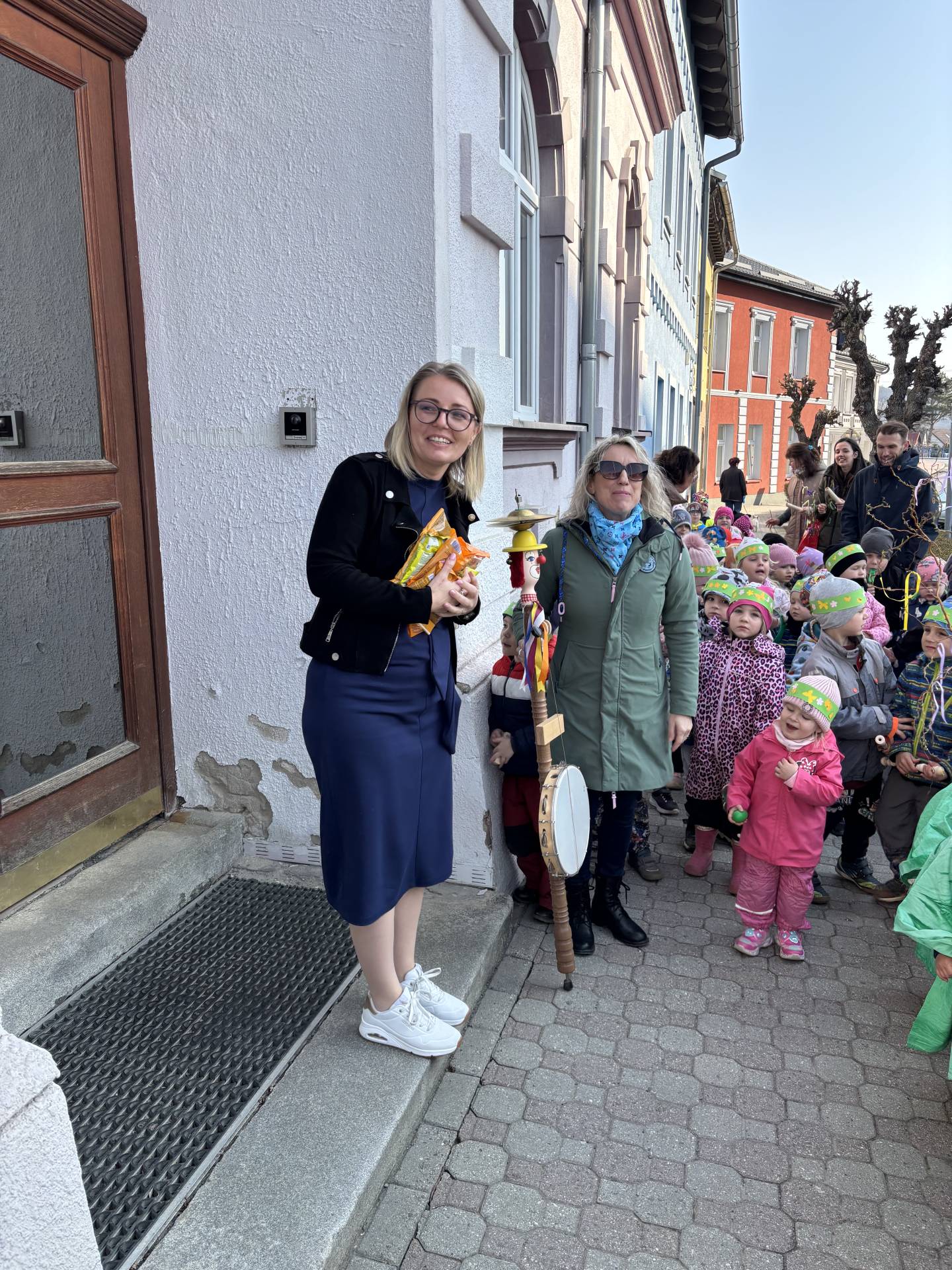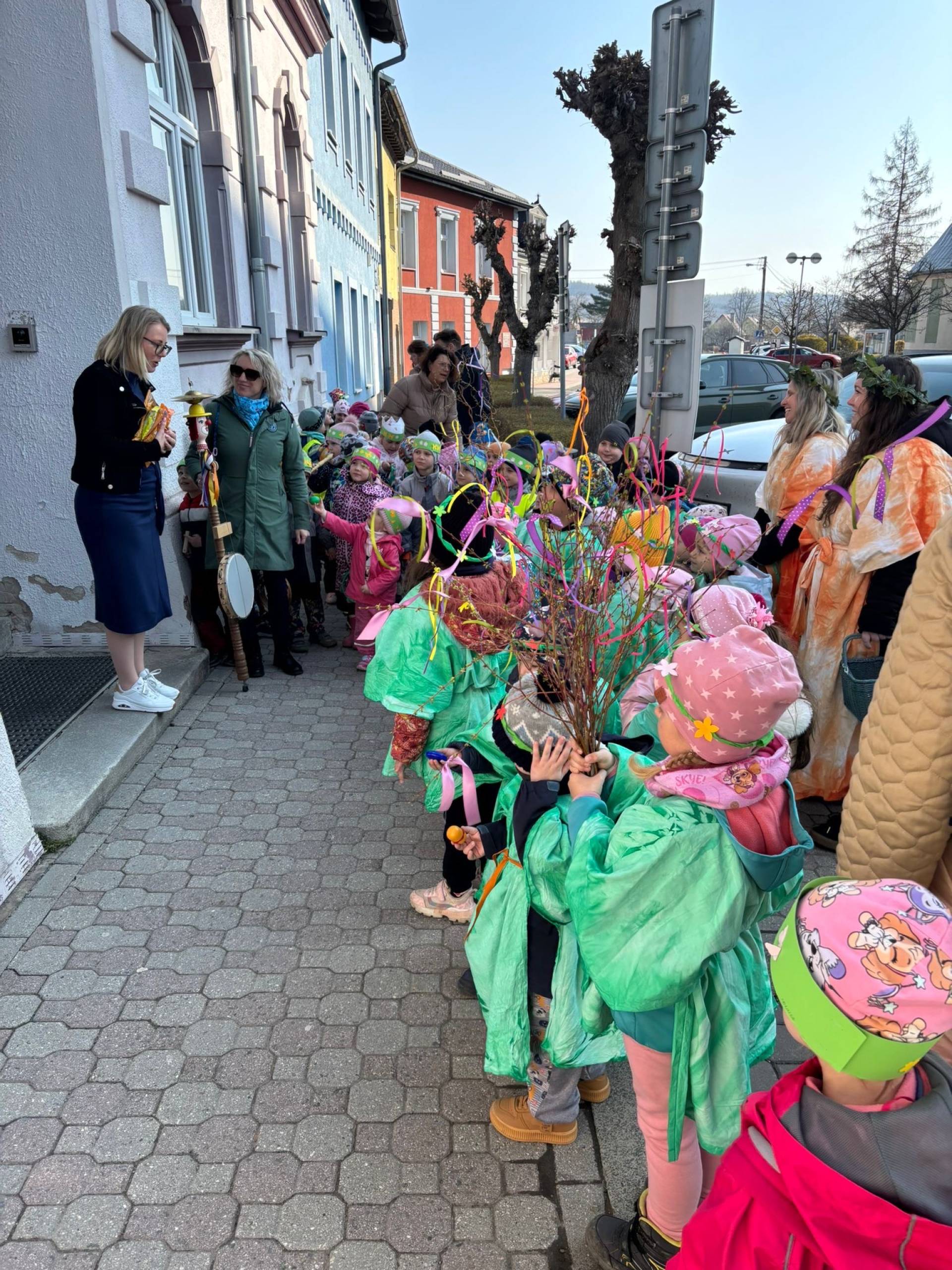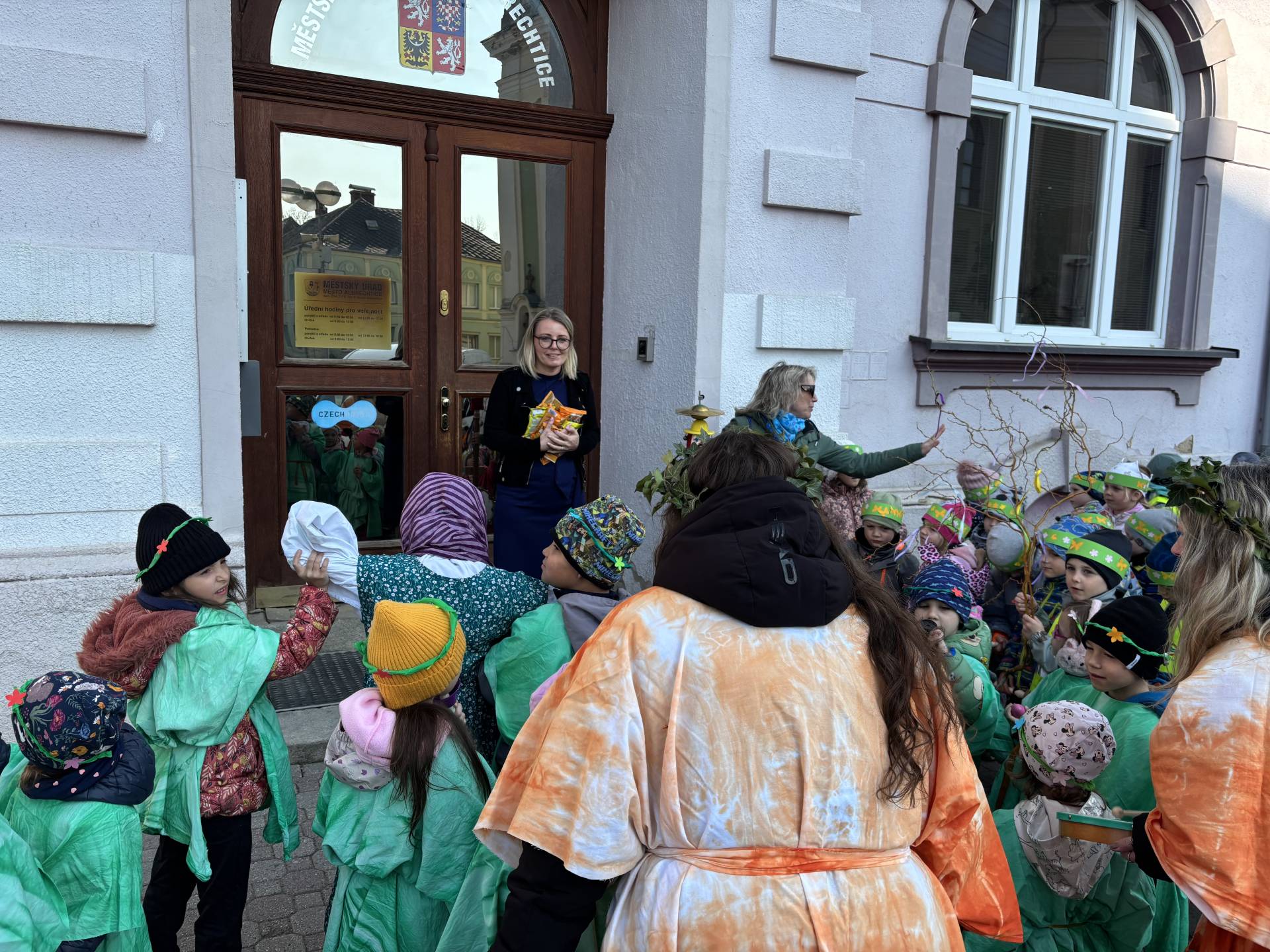 Během průvodu jsme se zastavili také na obecním úřadu, kde nás přivítala paní starostka. Děti jí s radostí zazpívaly několik písní, čímž jí poděkovaly za milé přijetí. Tento okamžik byl pro děti velmi slavnostní a zároveň jim přinesl další cennou zkušenost vystupování před publikem.