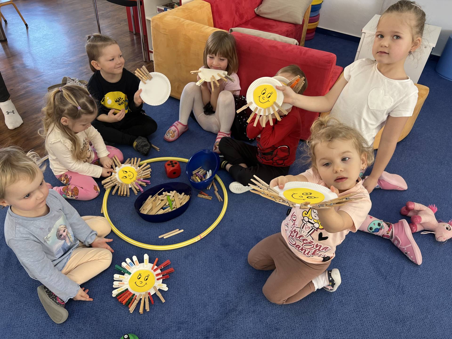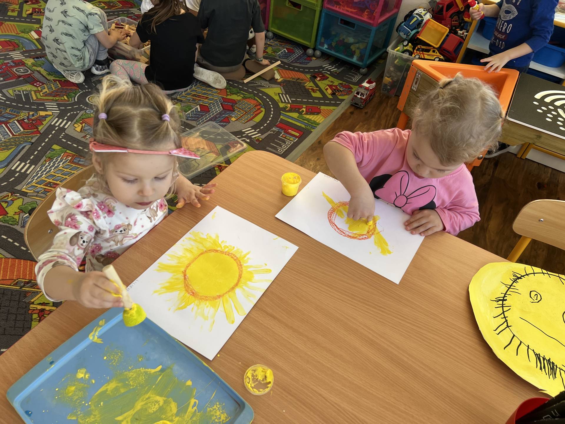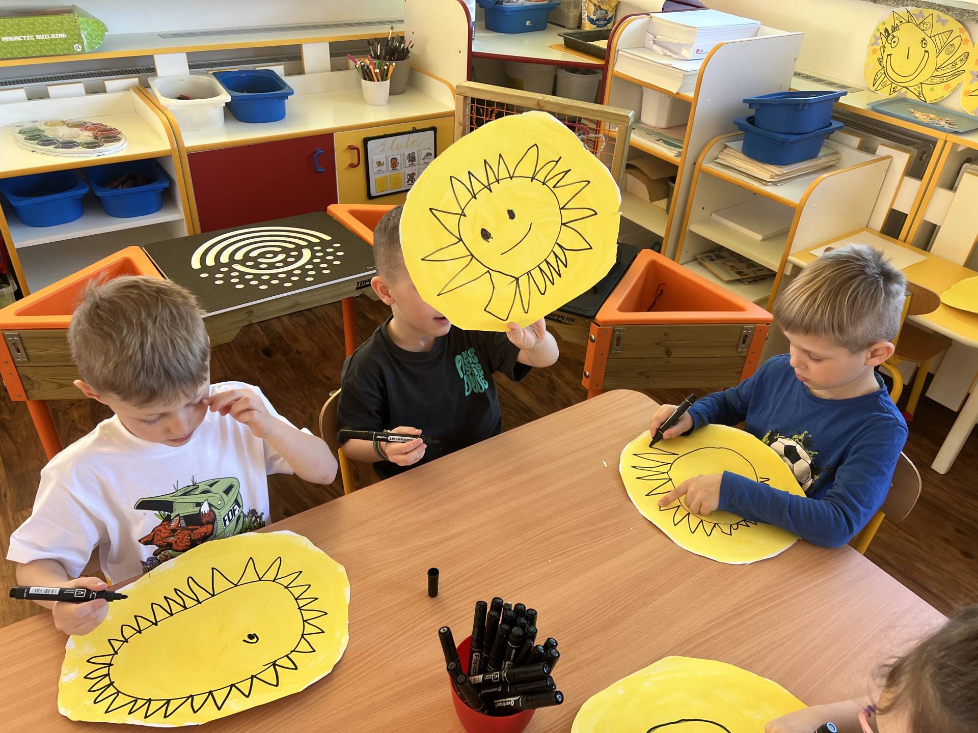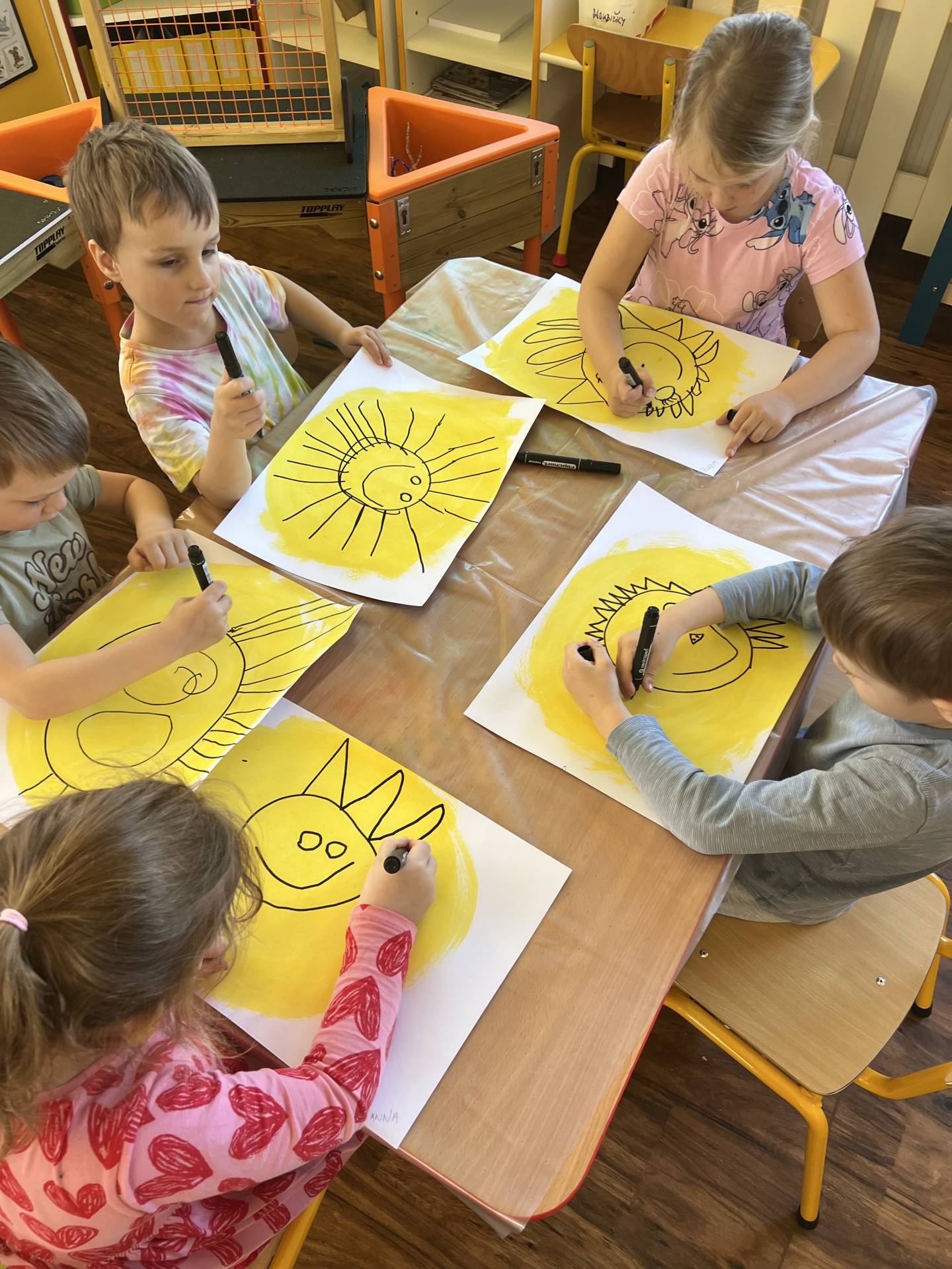 My "Medovníčci" jsme si vyzkoušeli sluníčko namalovat různými technikami, nastříhat, sestavit z dřívek i kolíčků, nebo jej pozdravit jógovou sestavou. Naše sluníčka krásně rozsvítila prostory školky.