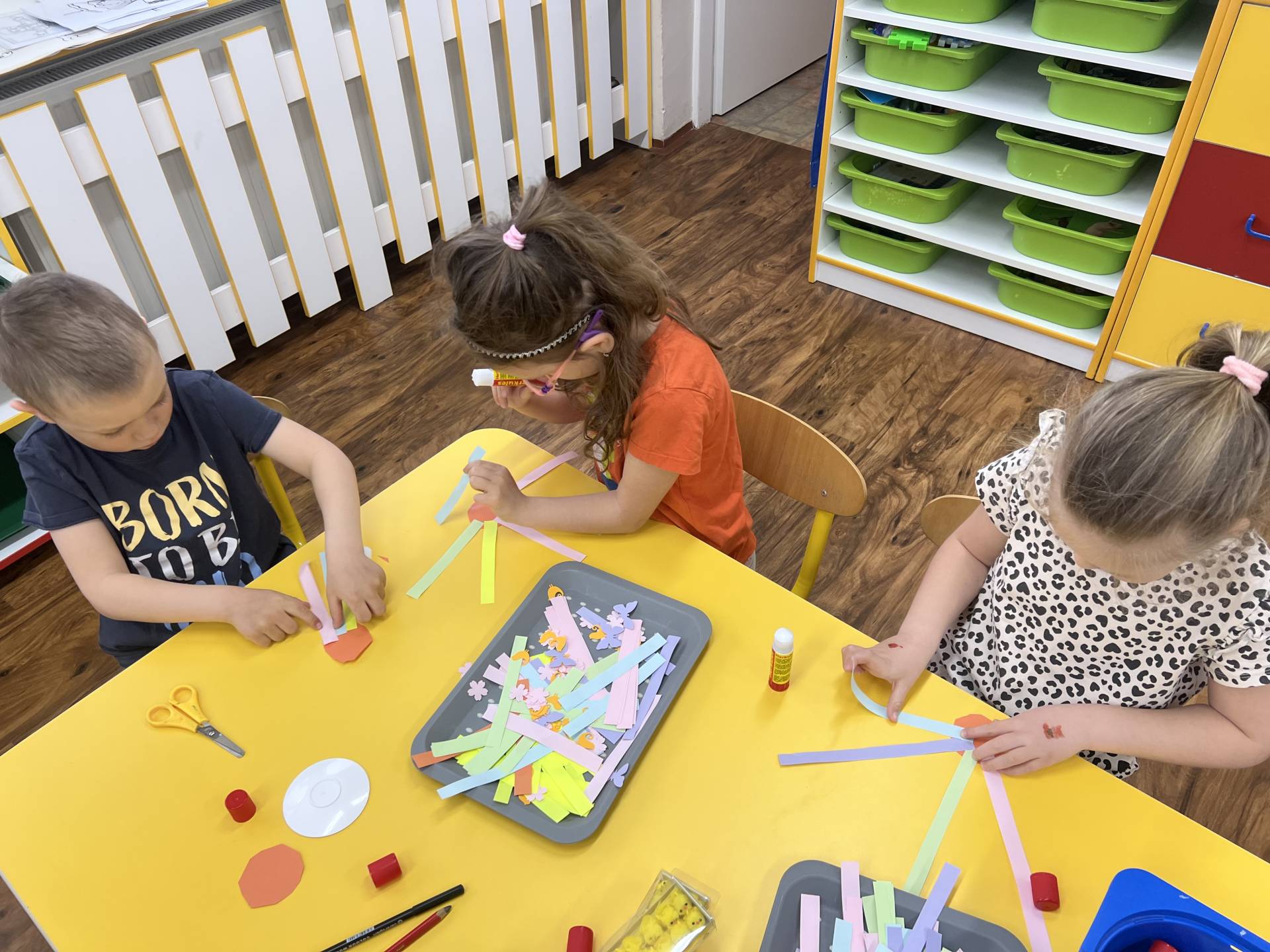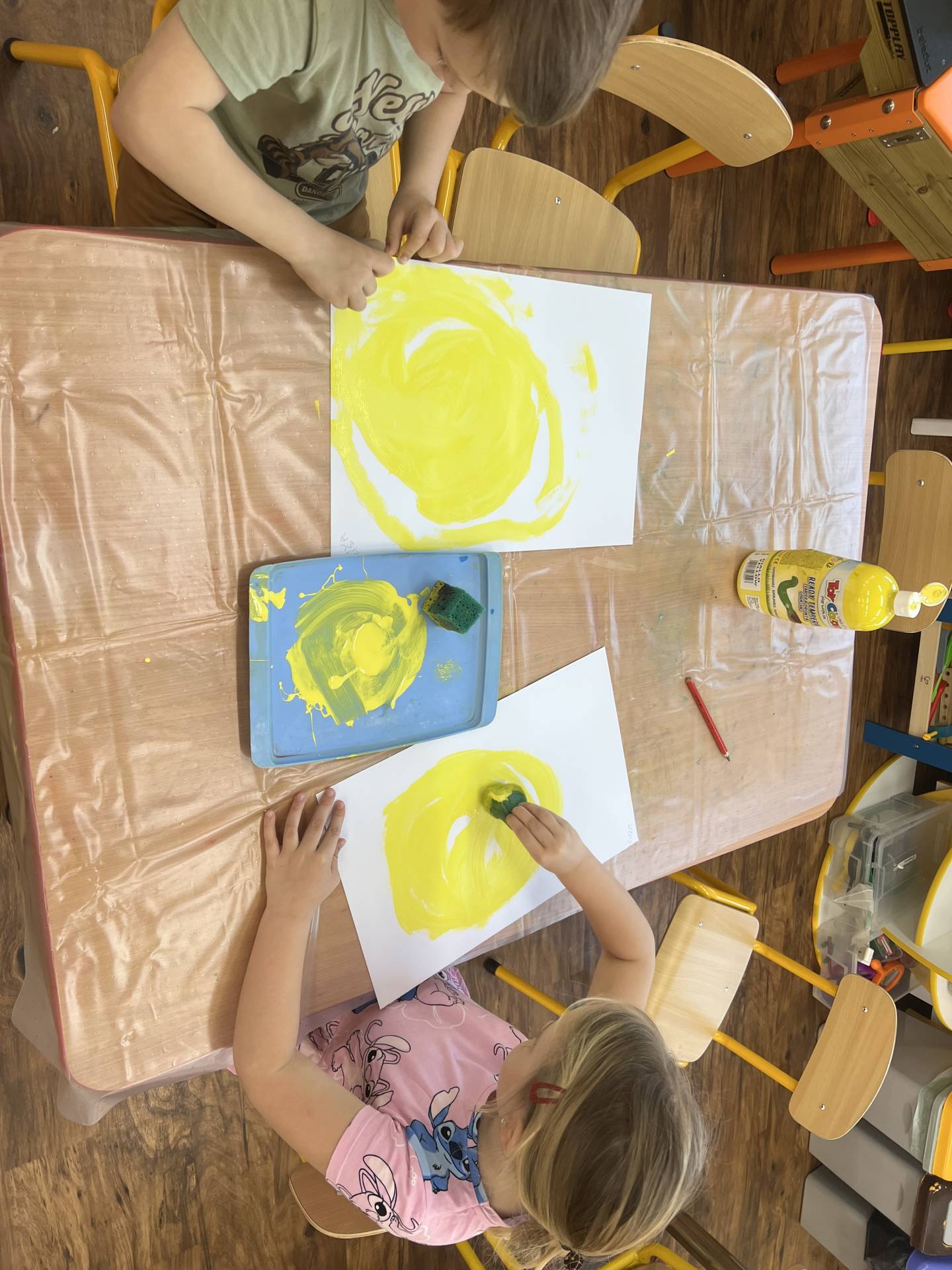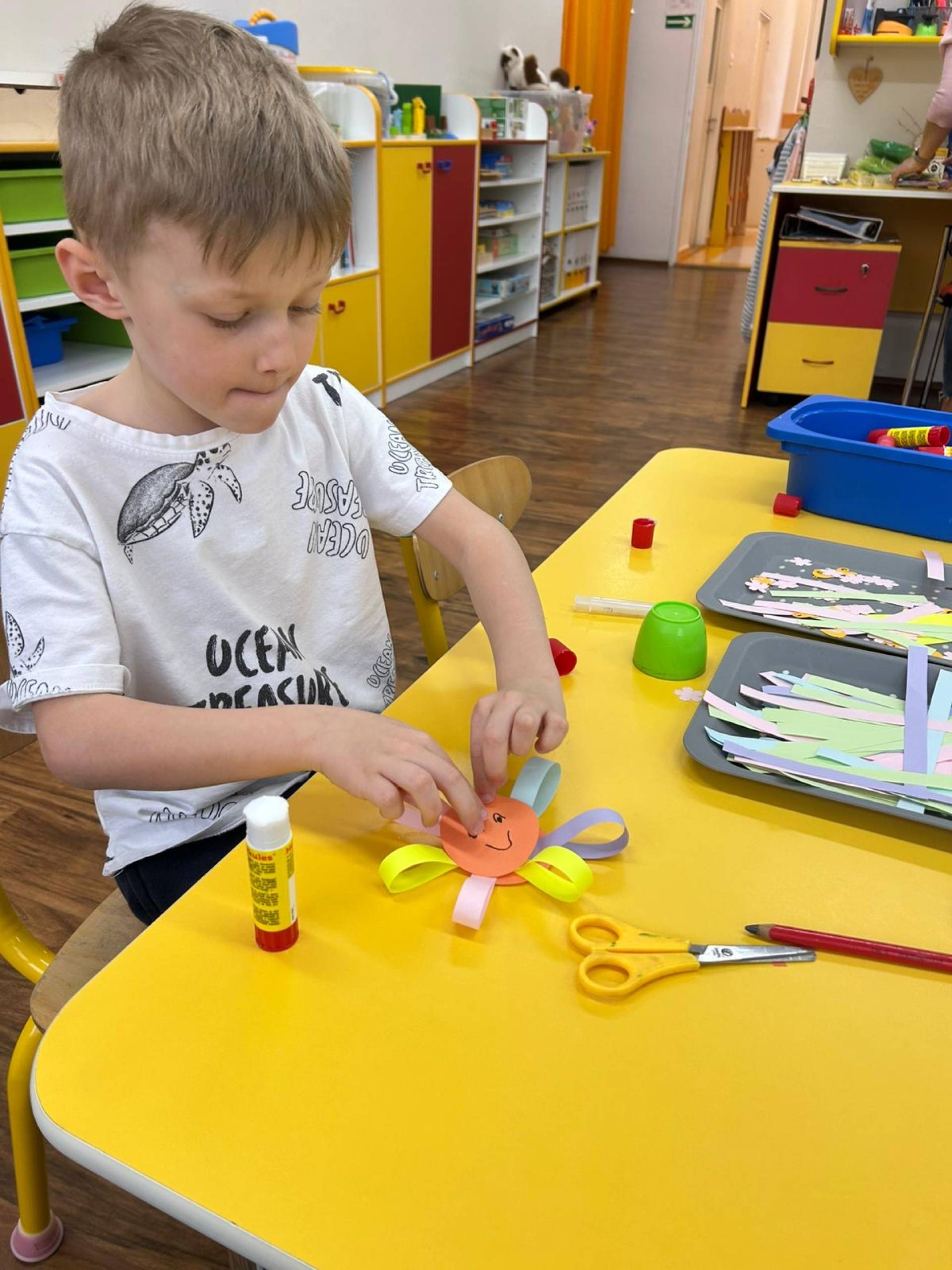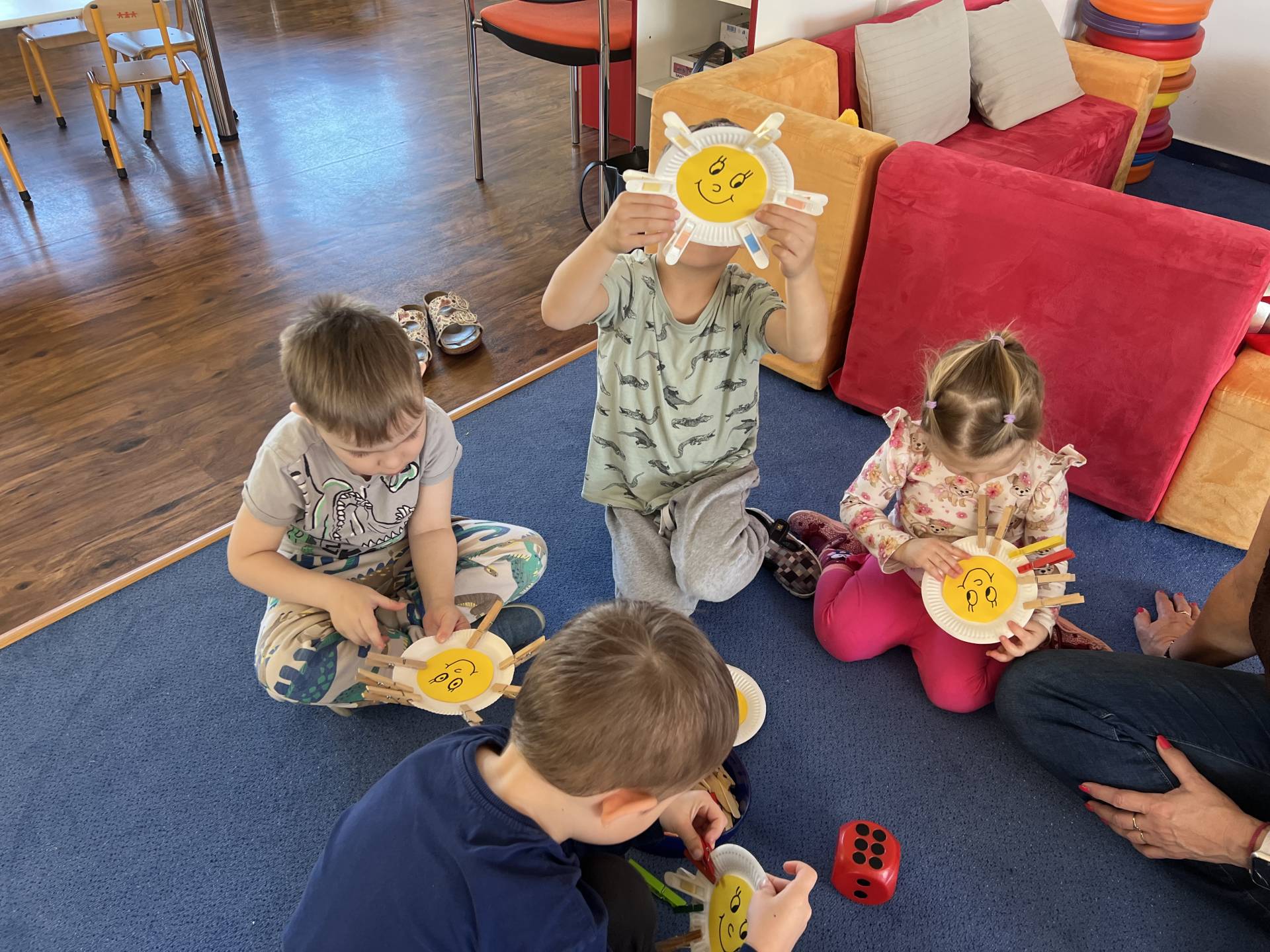 My "Medovníčci" jsme si vyzkoušeli sluníčko namalovat různými technikami, nastříhat, sestavit z dřívek i kolíčků, nebo jej pozdravit jógovou sestavou. Naše sluníčka krásně rozsvítila prostory školky.