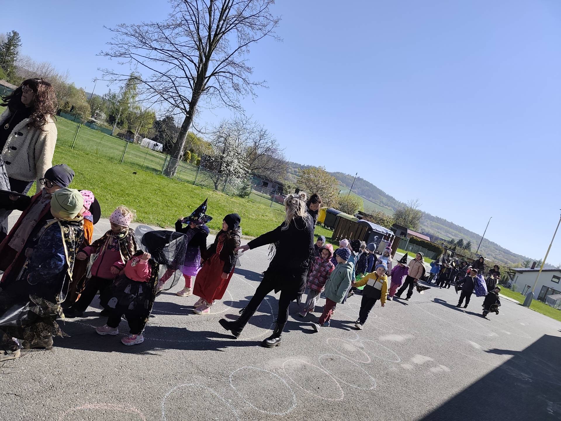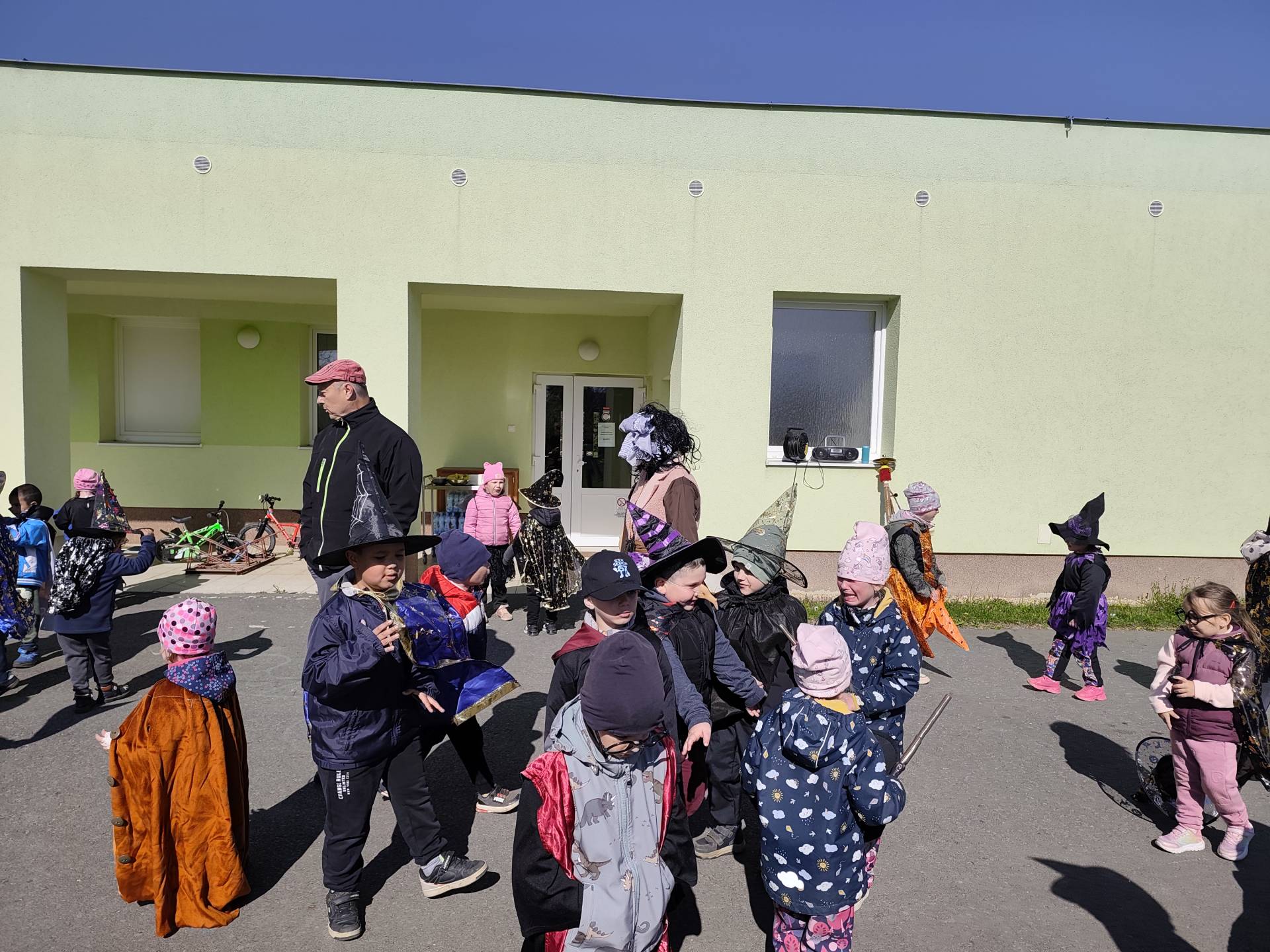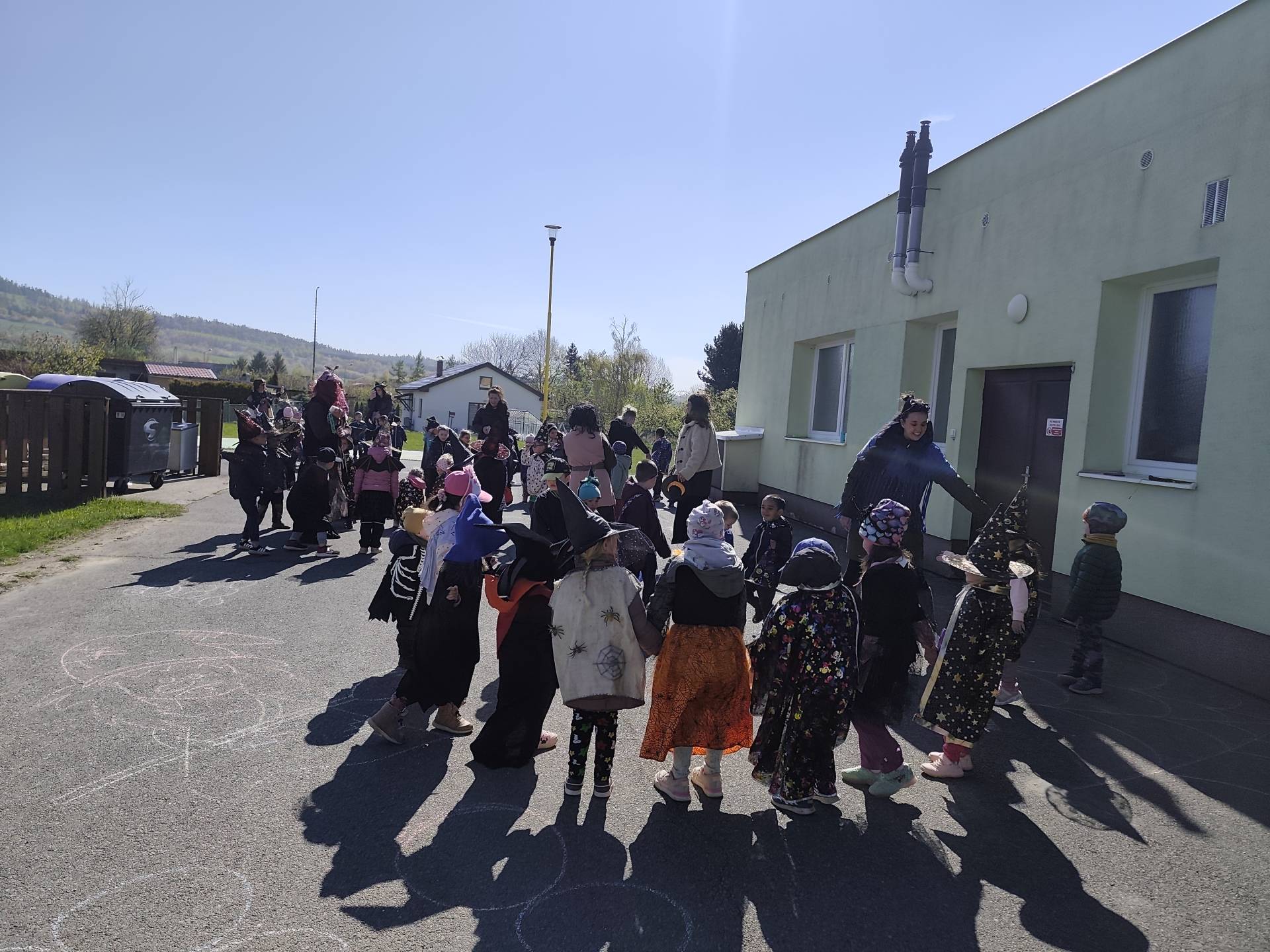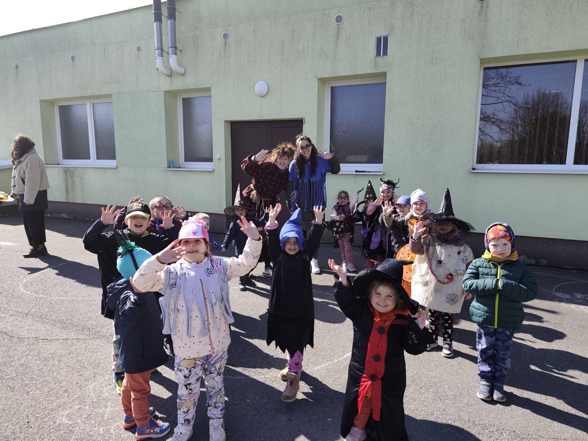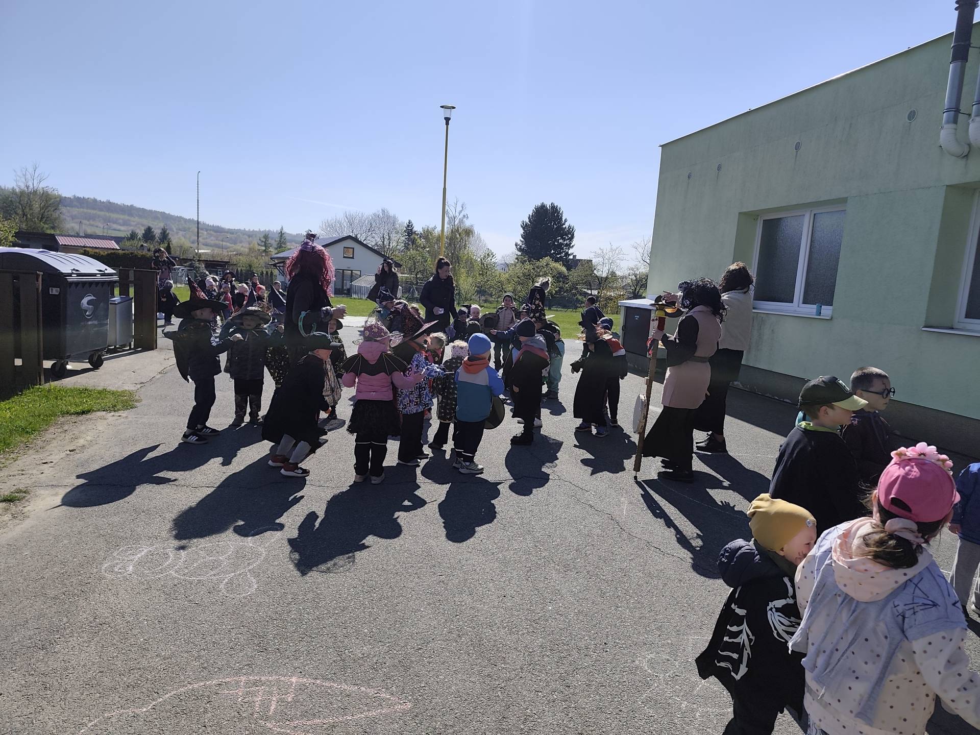 Po občerstvení jsme se přesunuli před školku, kde jsme si společně zatancovali a užili si čarodějnickou atmosféru. Následně jsme se vydali na průvod městem, během kterého děti v kostýmech rozdávaly radost a úsměvy všem kolemjdoucím.