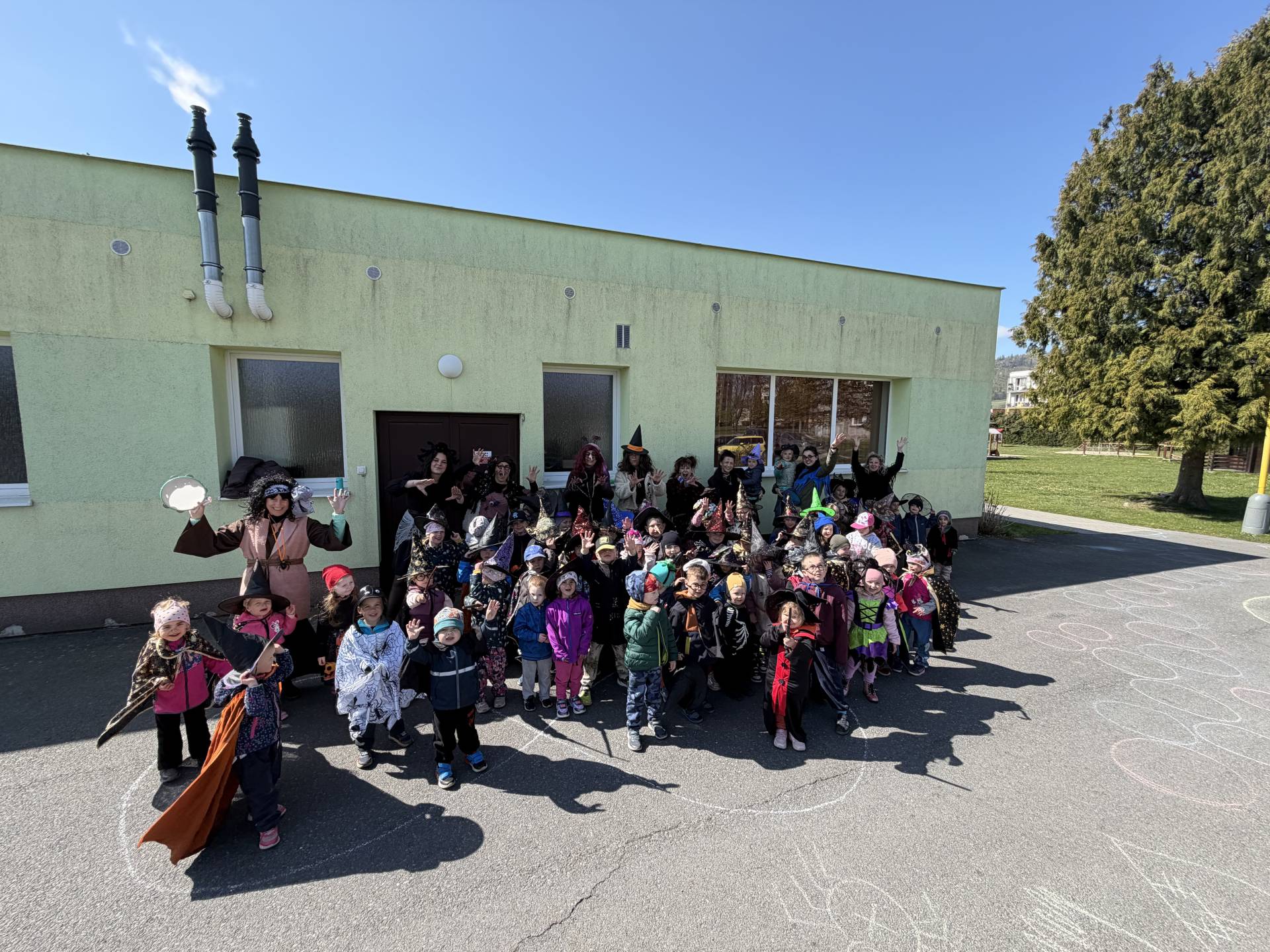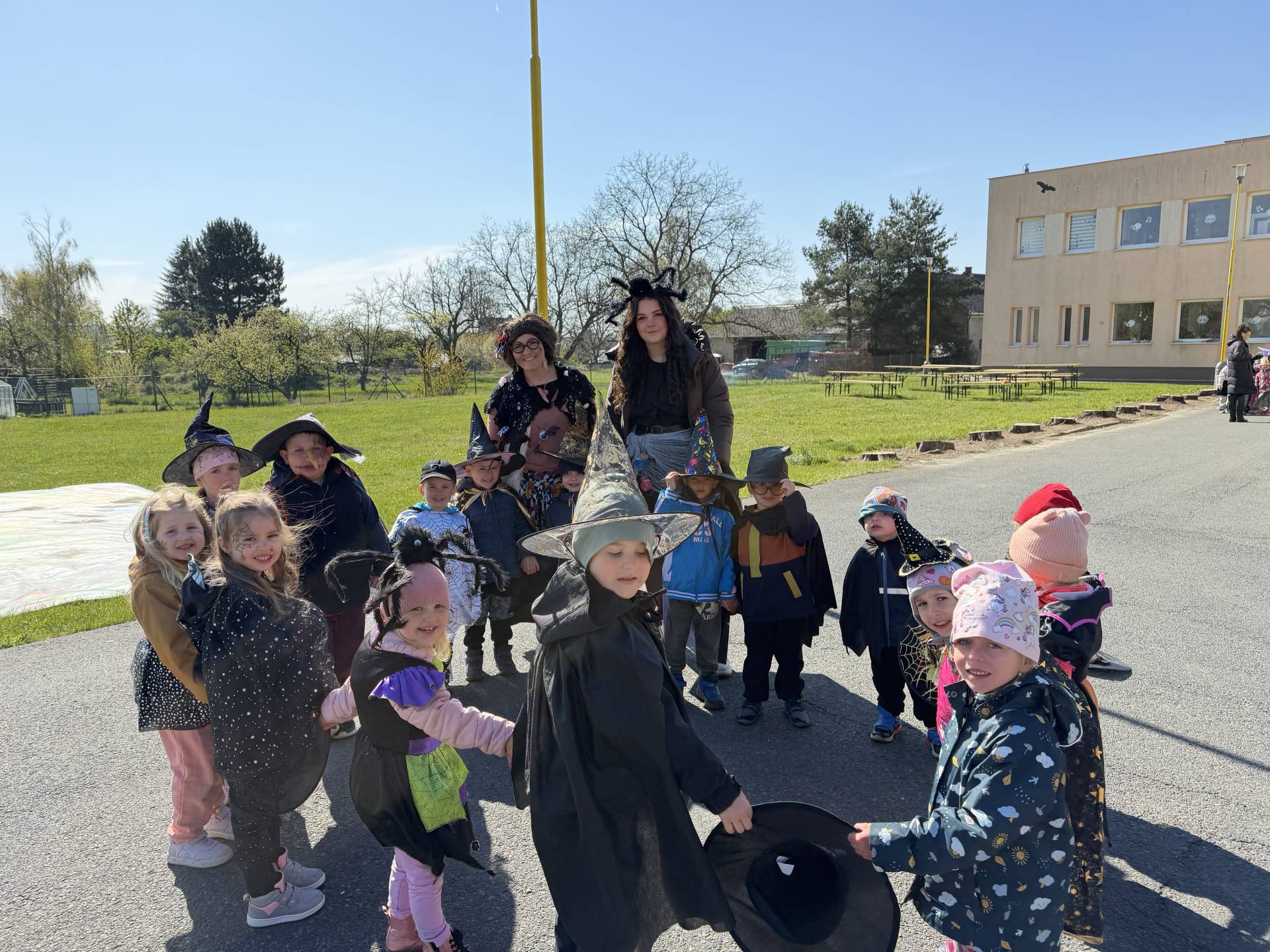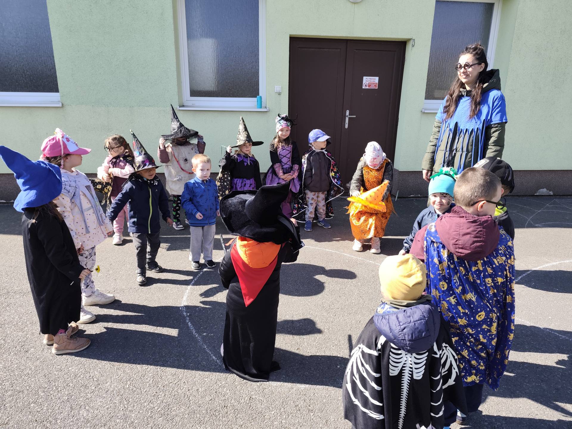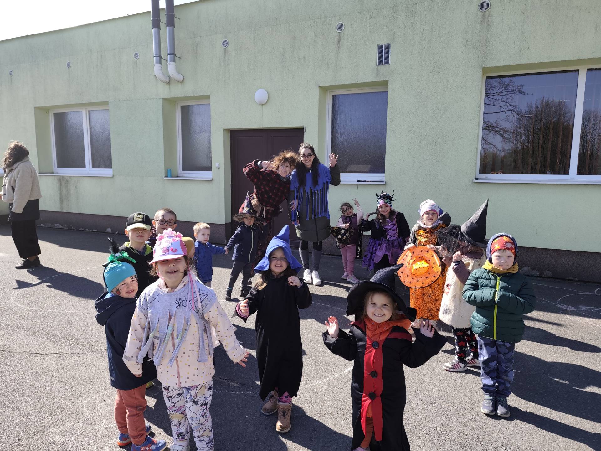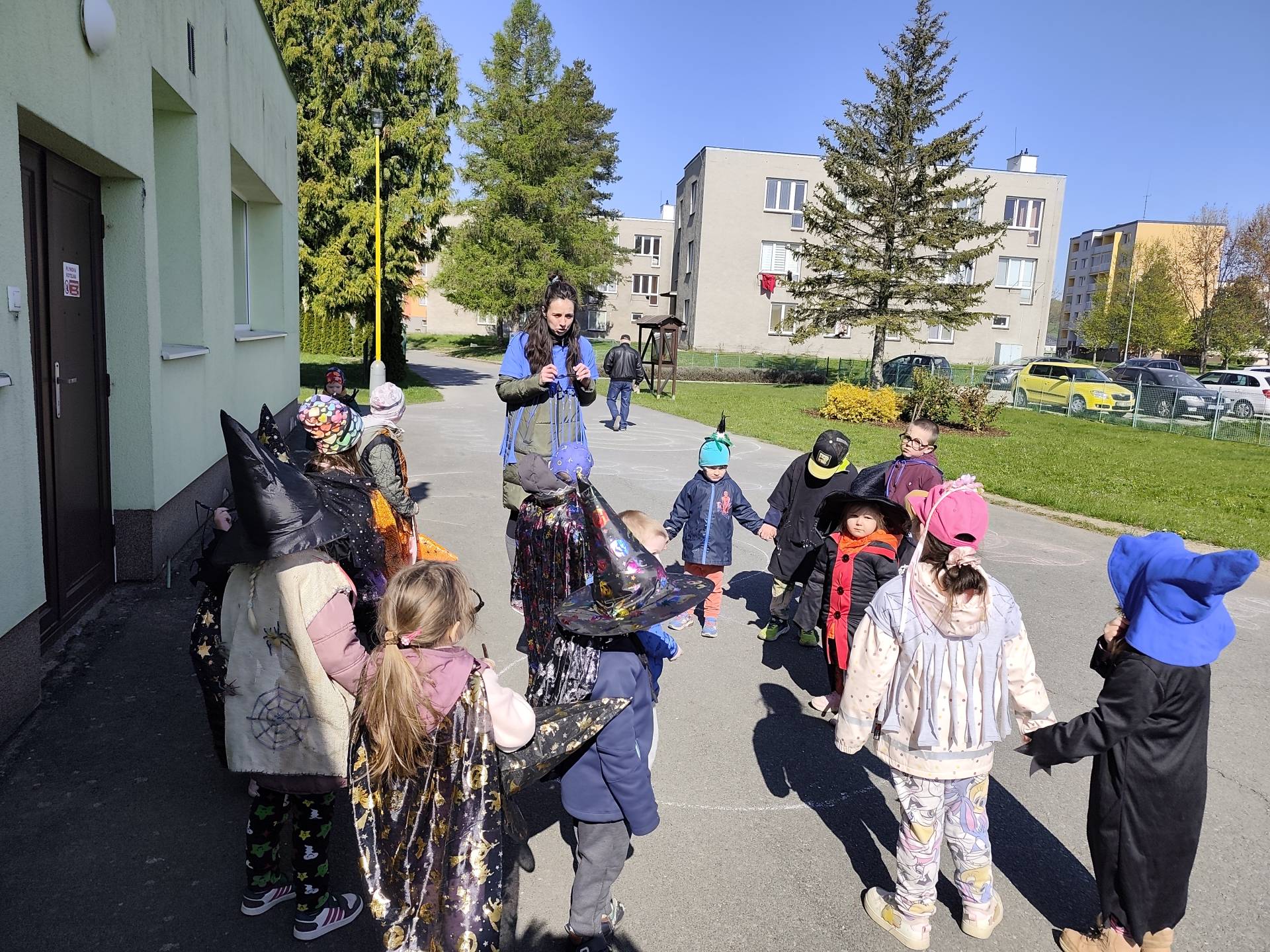 Po občerstvení jsme se přesunuli před školku, kde jsme si společně zatancovali a užili si čarodějnickou atmosféru. Následně jsme se vydali na průvod městem, během kterého děti v kostýmech rozdávaly radost a úsměvy všem kolemjdoucím.