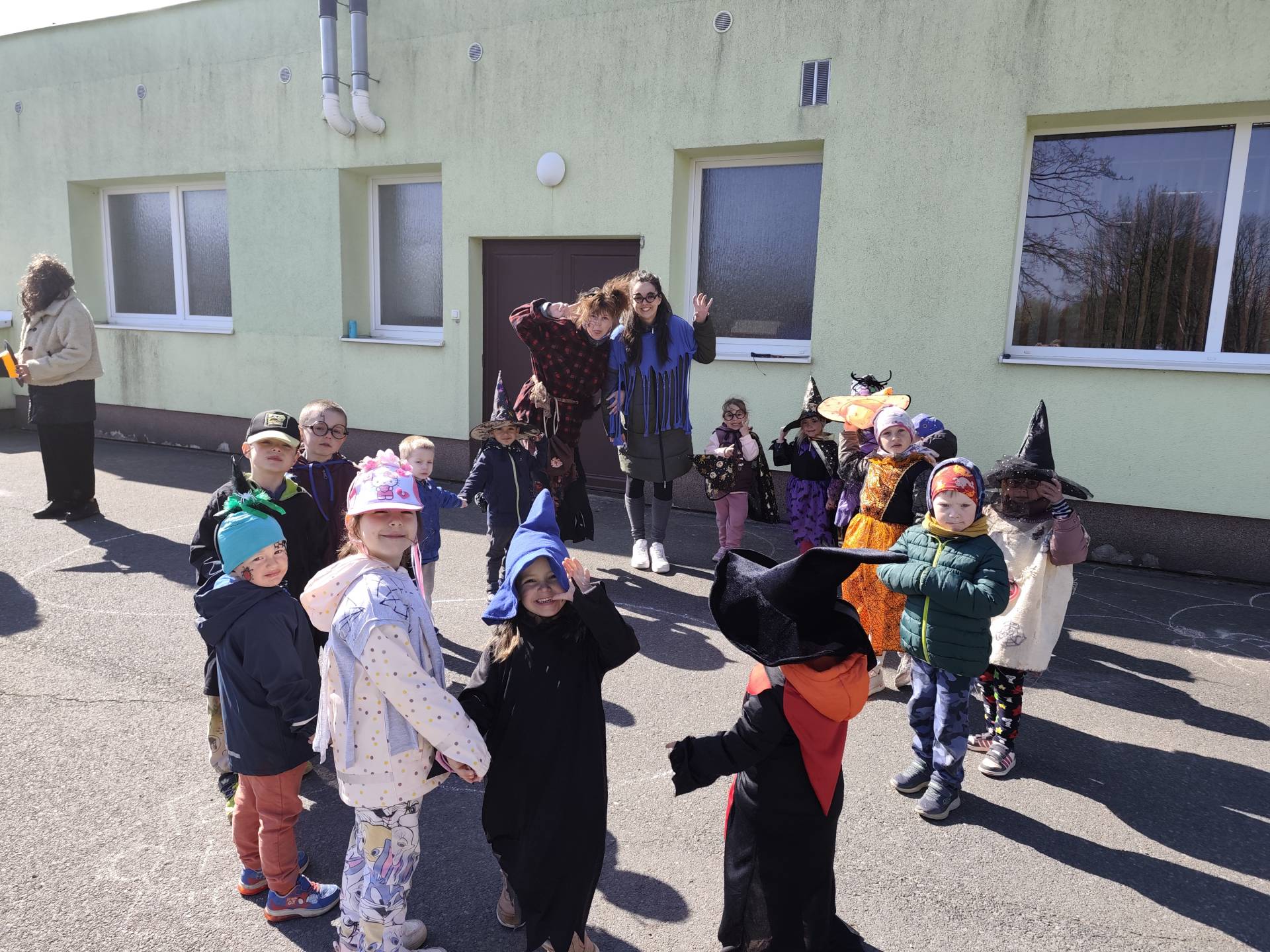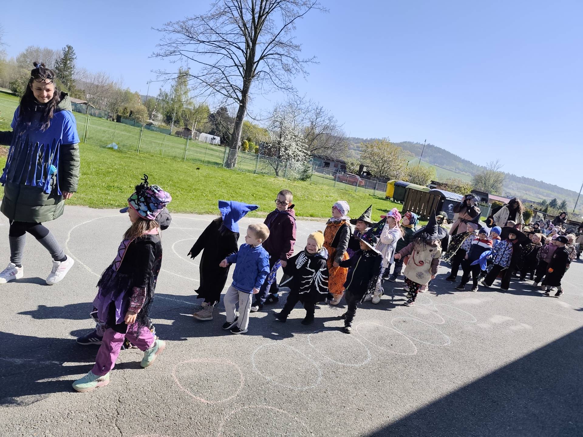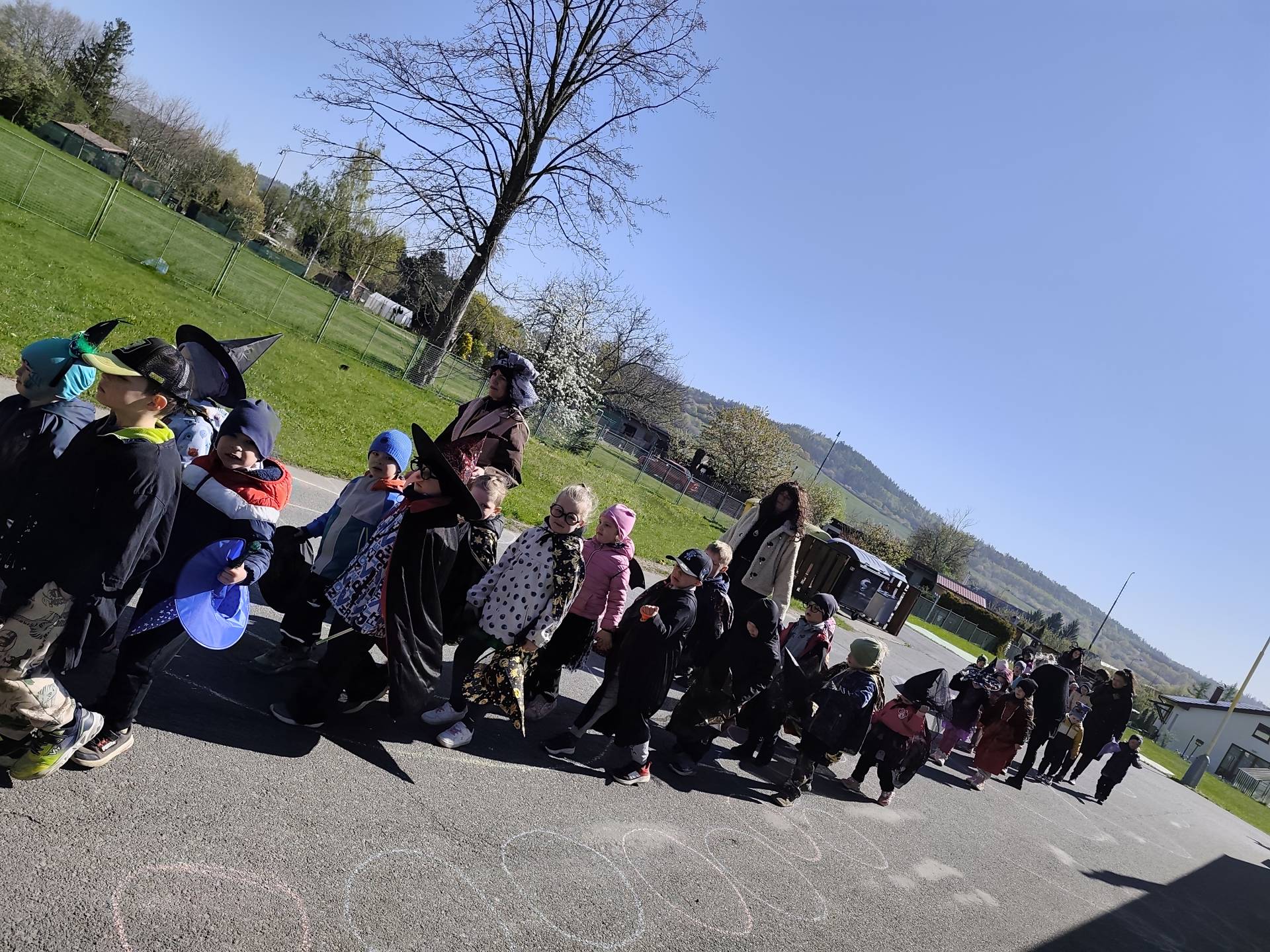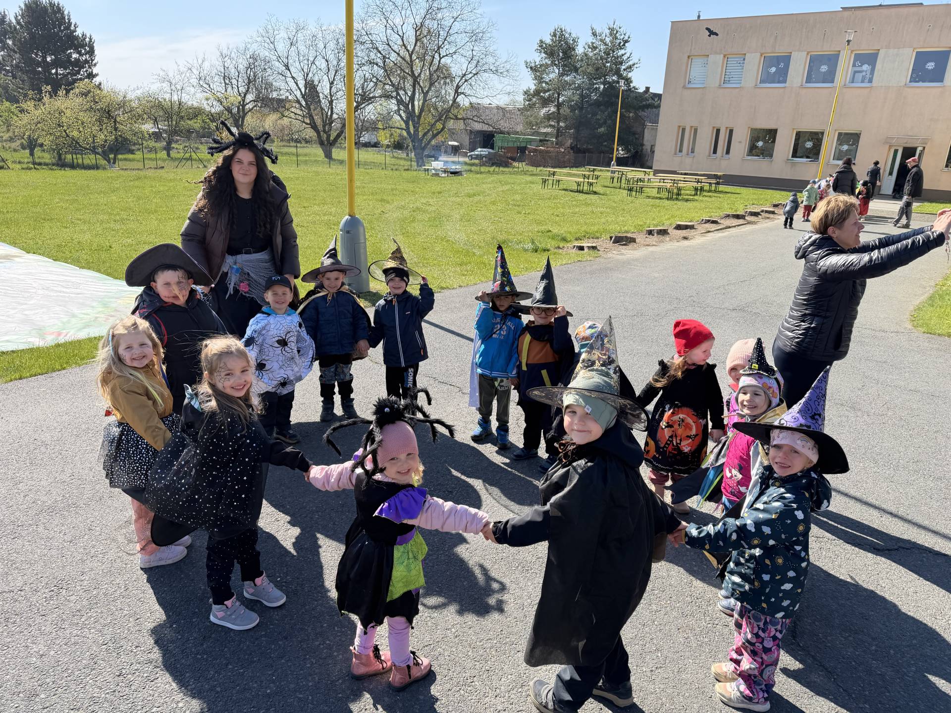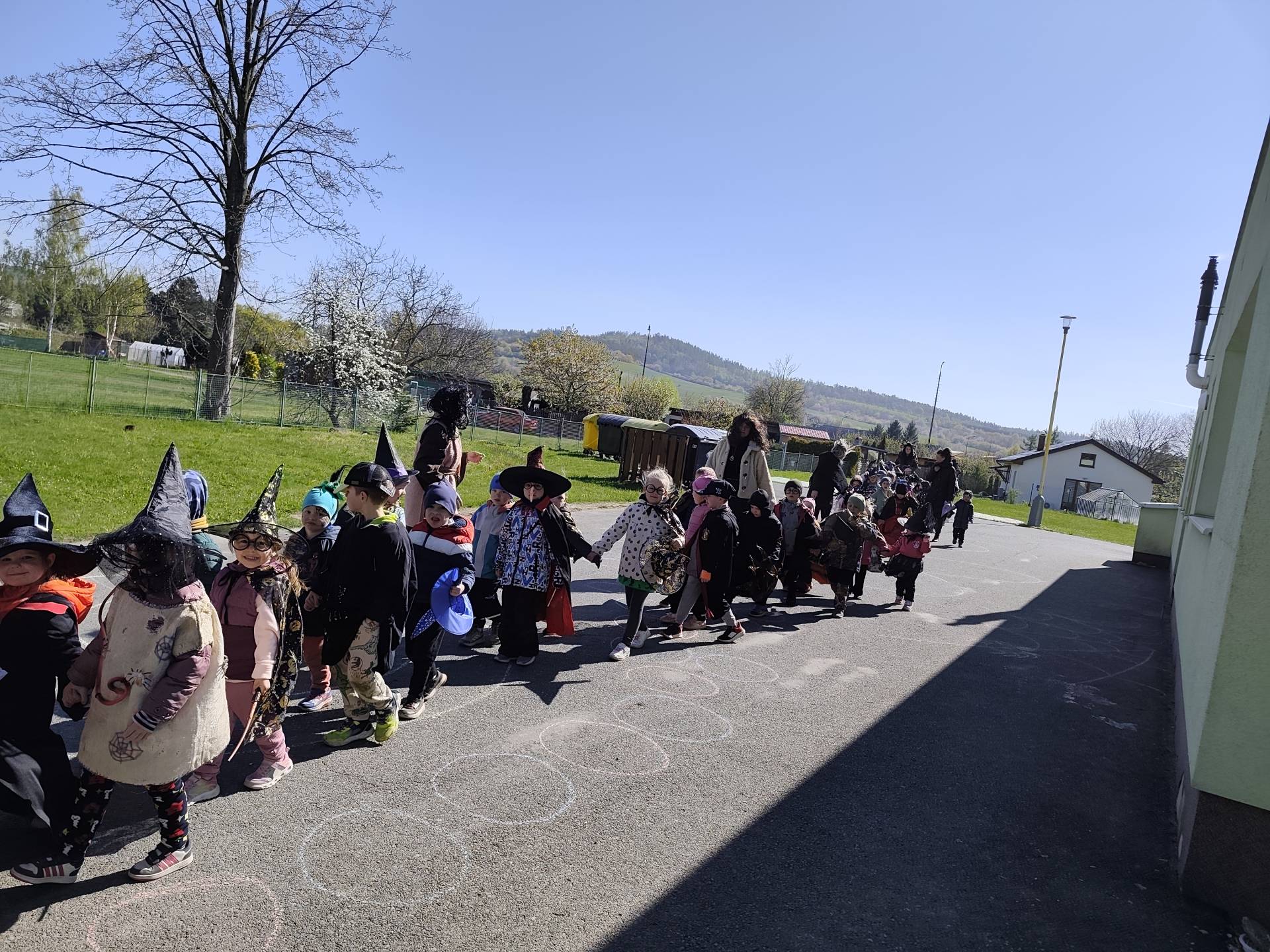 Po občerstvení jsme se přesunuli před školku, kde jsme si společně zatancovali a užili si čarodějnickou atmosféru. Následně jsme se vydali na průvod městem, během kterého děti v kostýmech rozdávaly radost a úsměvy všem kolemjdoucím.