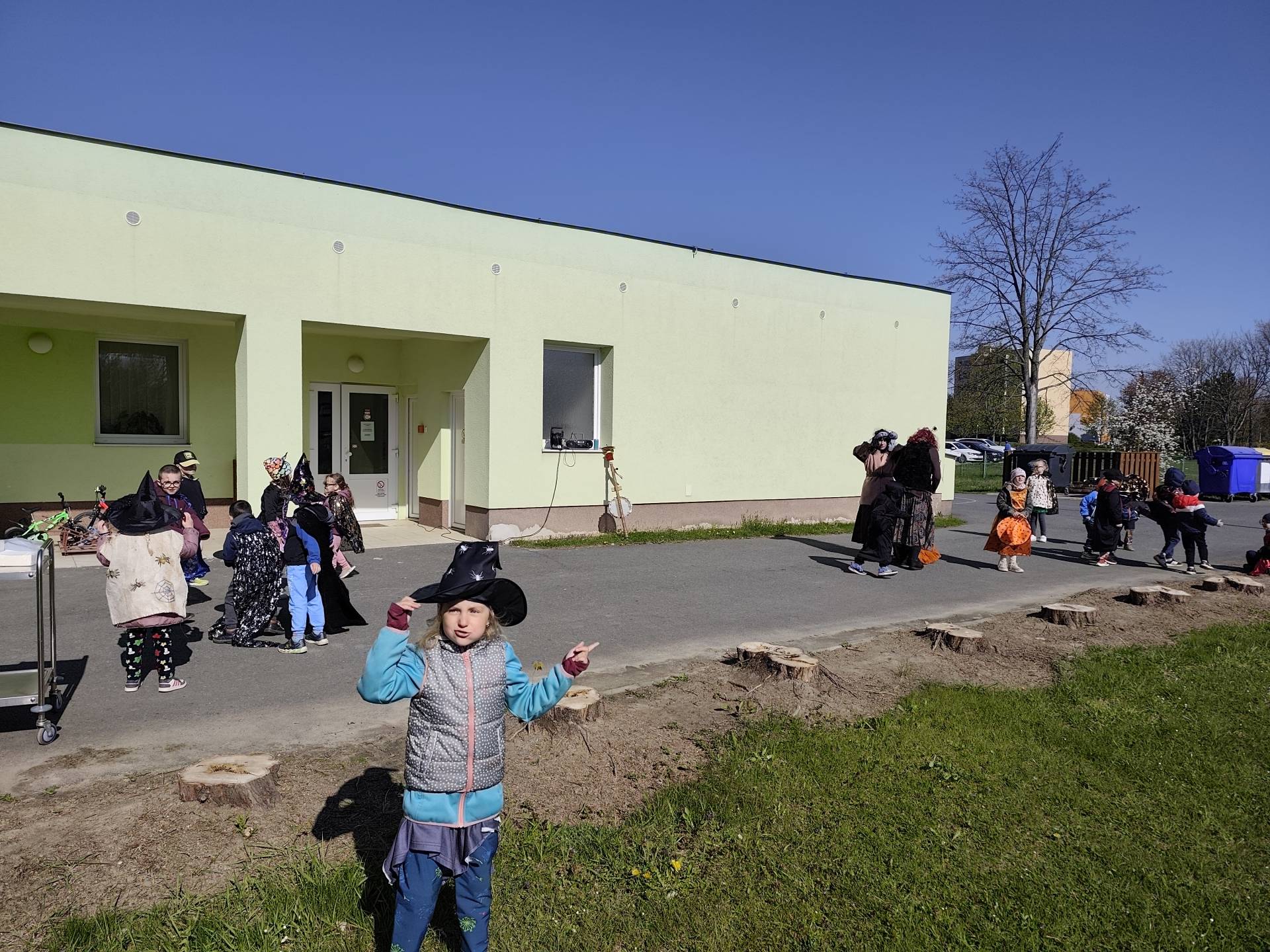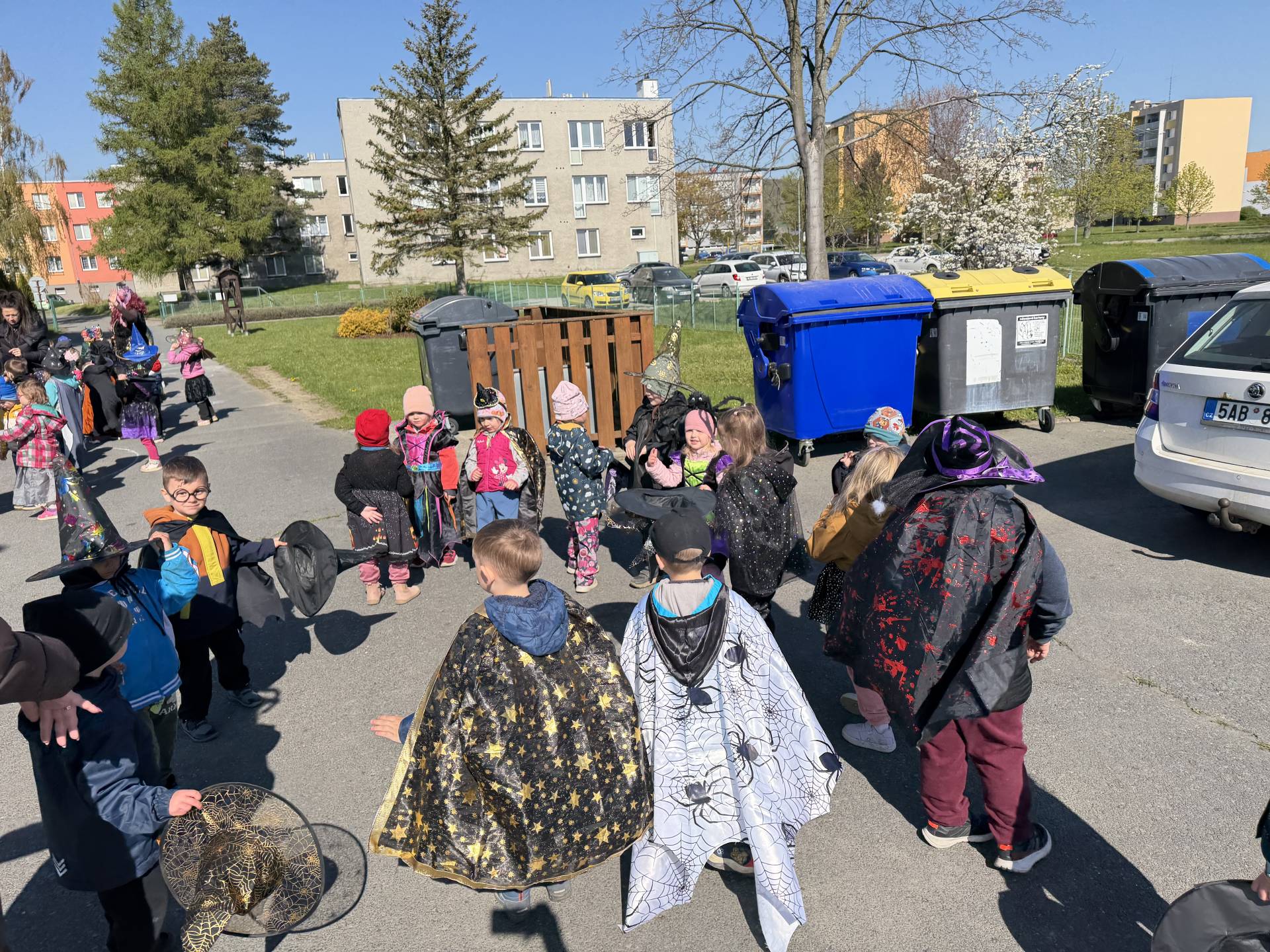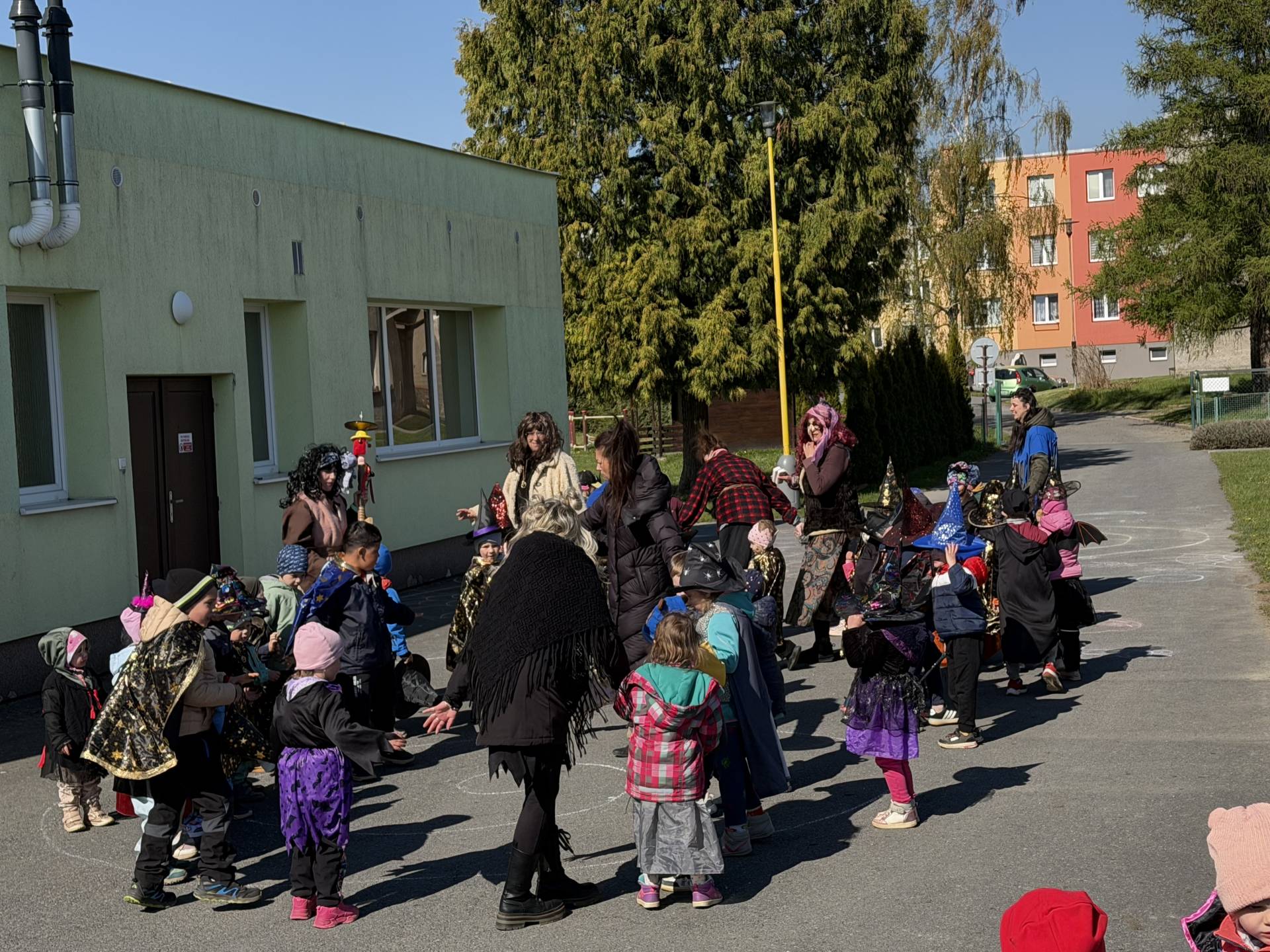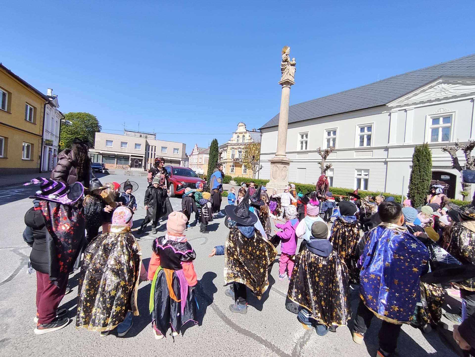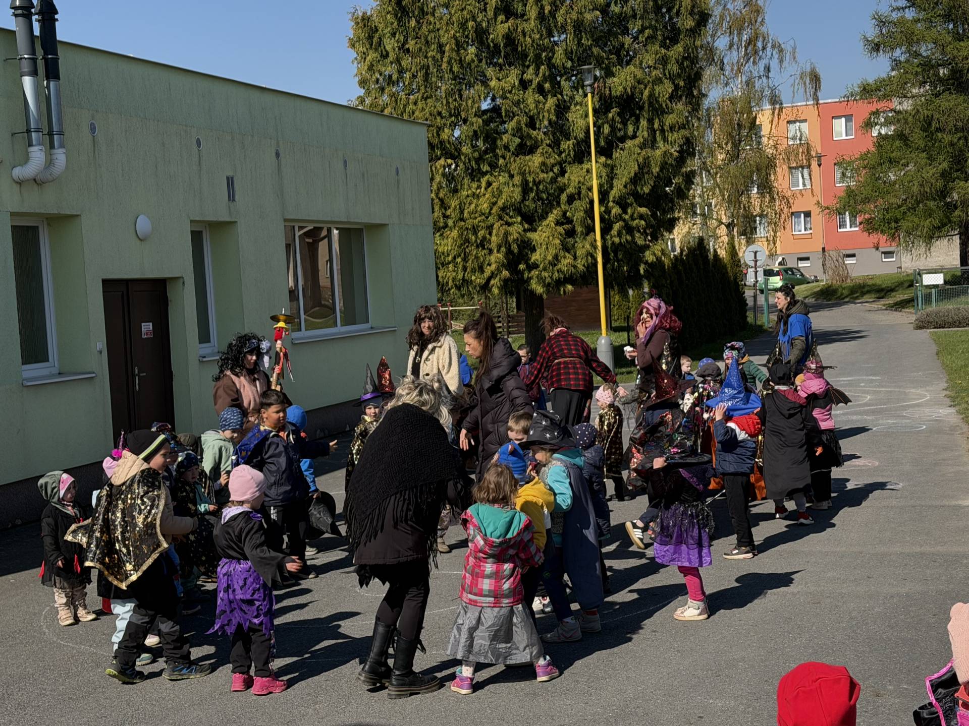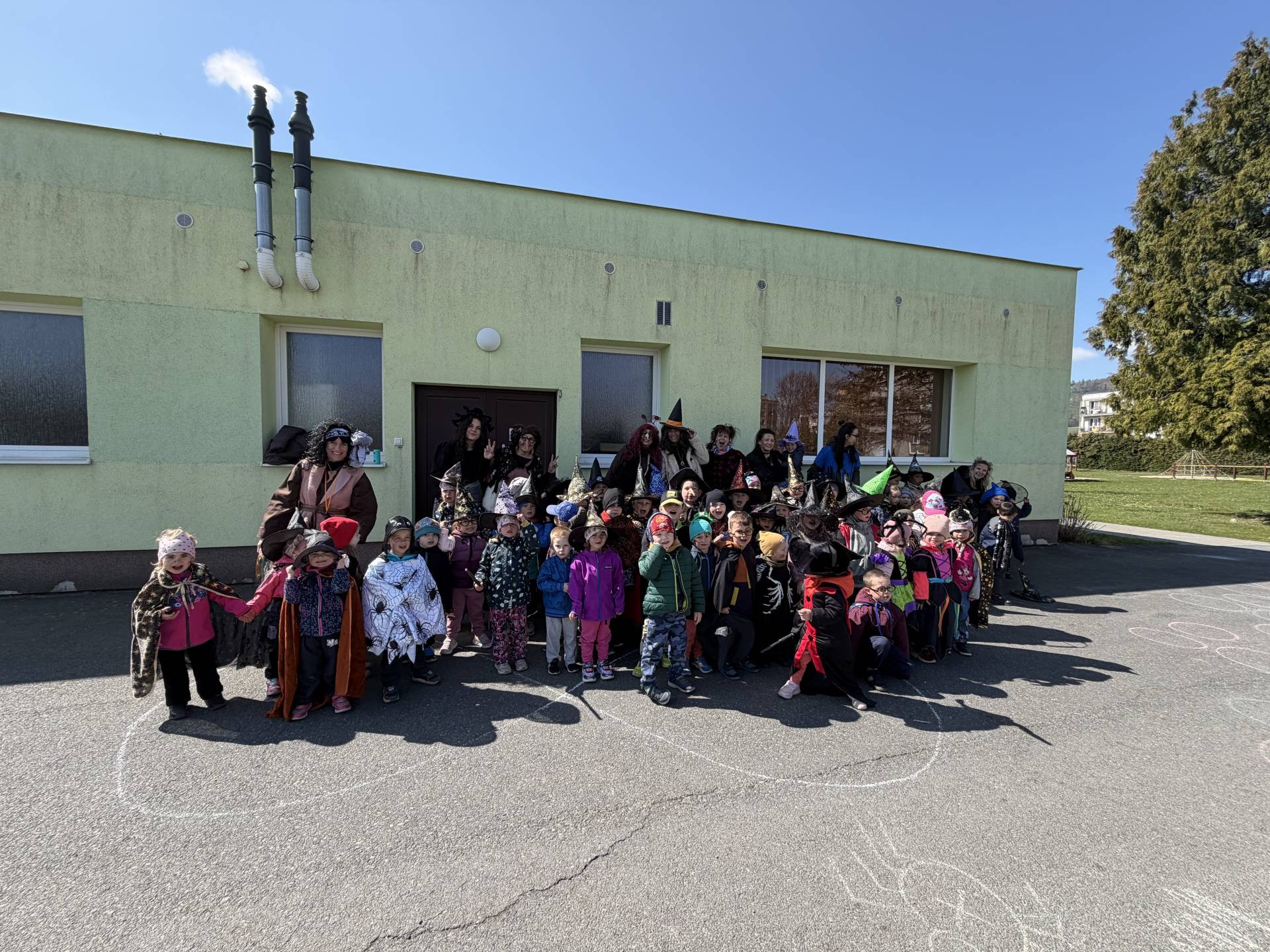 Po občerstvení jsme se přesunuli před školku, kde jsme si společně zatancovali a užili si čarodějnickou atmosféru. Následně jsme se vydali na průvod městem, během kterého děti v kostýmech rozdávaly radost a úsměvy všem kolemjdoucím.