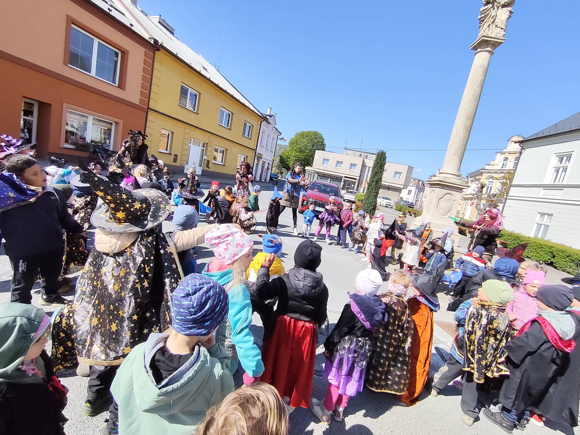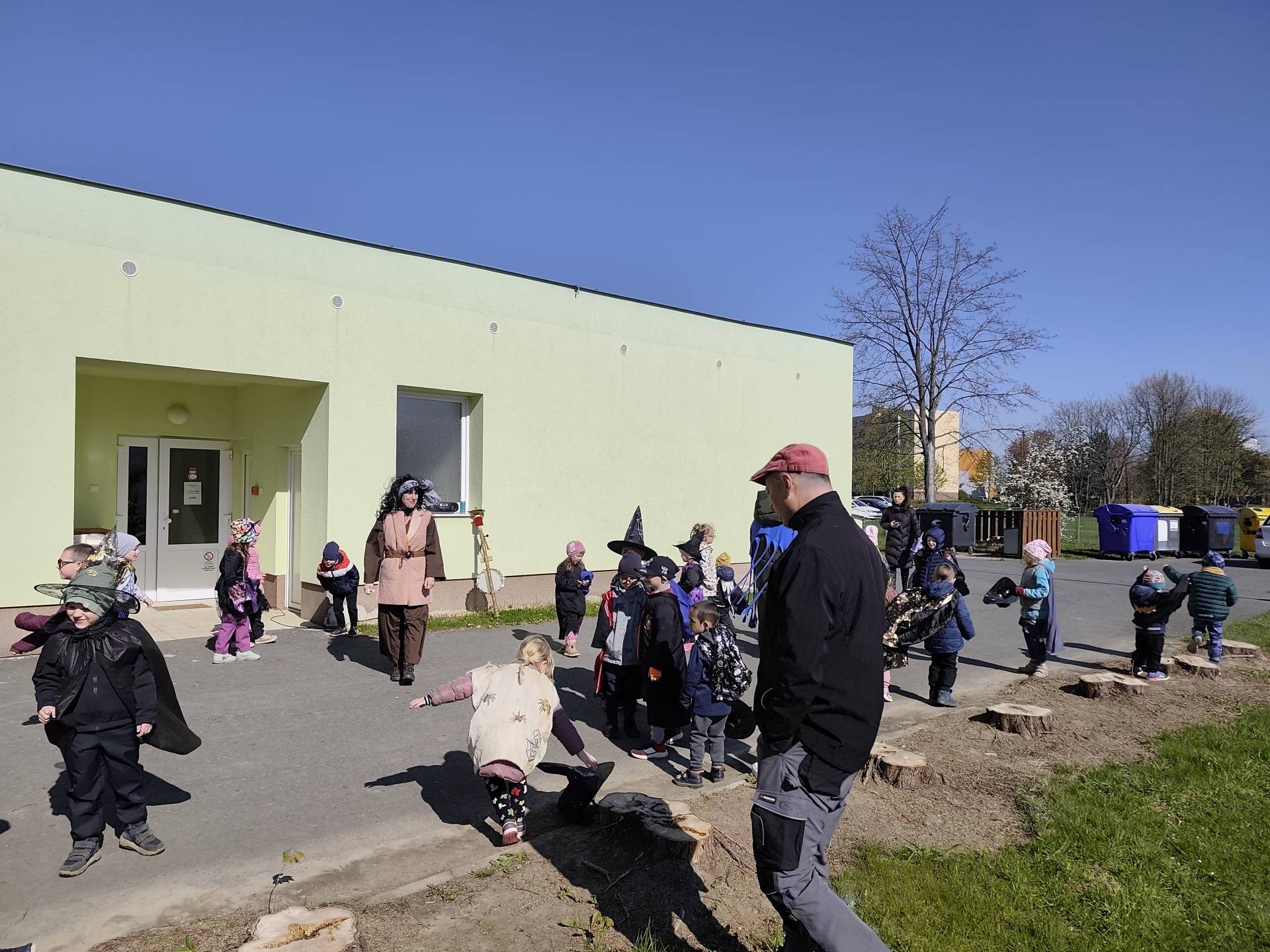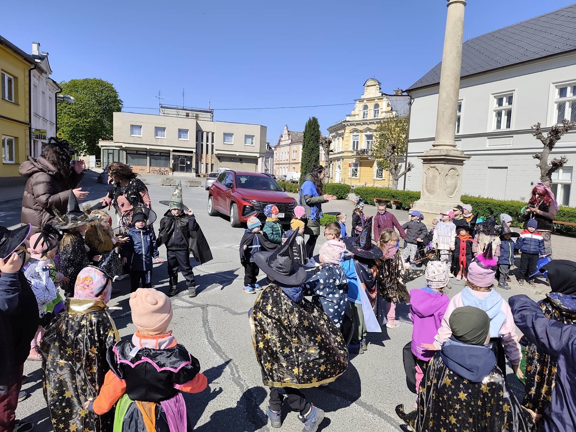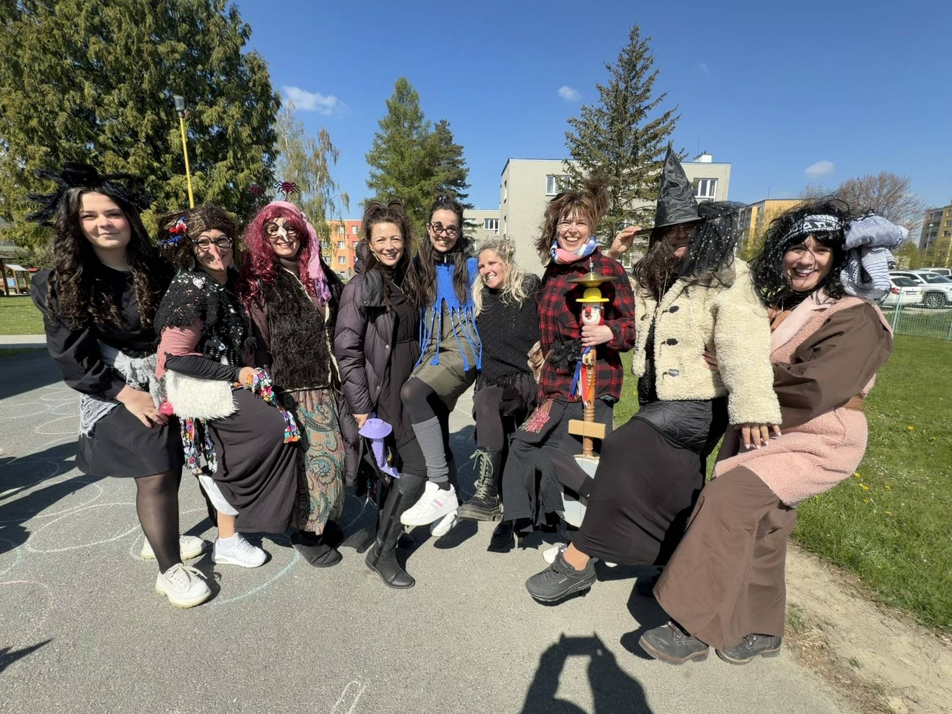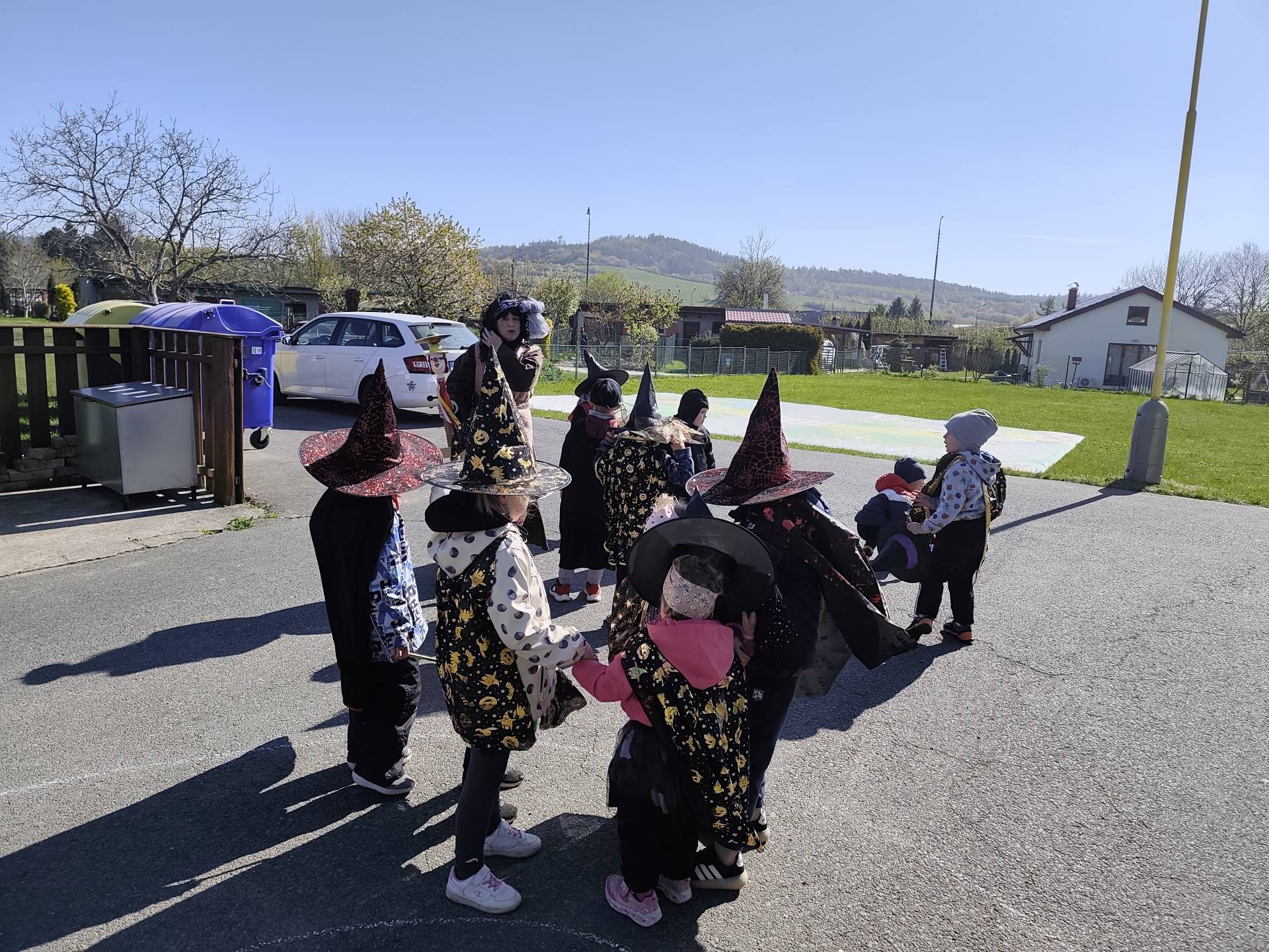 Po občerstvení jsme se přesunuli před školku, kde jsme si společně zatancovali a užili si čarodějnickou atmosféru. Následně jsme se vydali na průvod městem, během kterého děti v kostýmech rozdávaly radost a úsměvy všem kolemjdoucím.